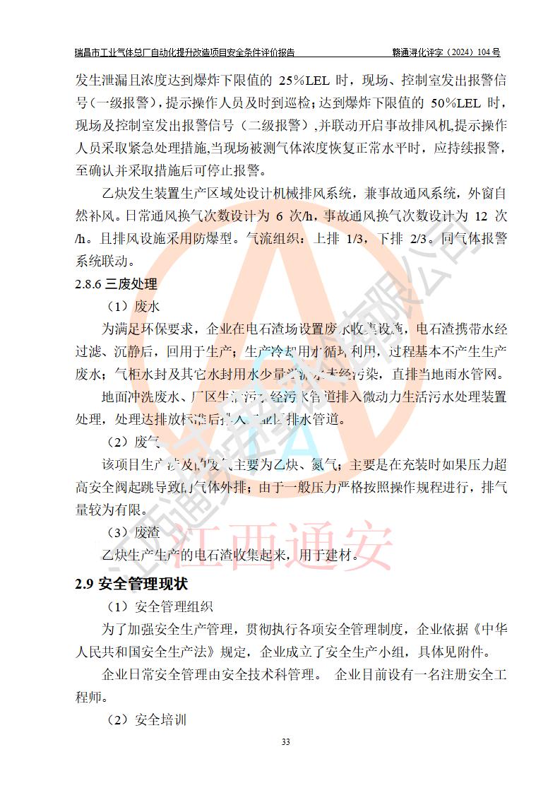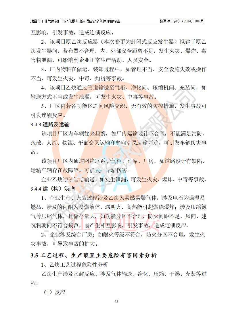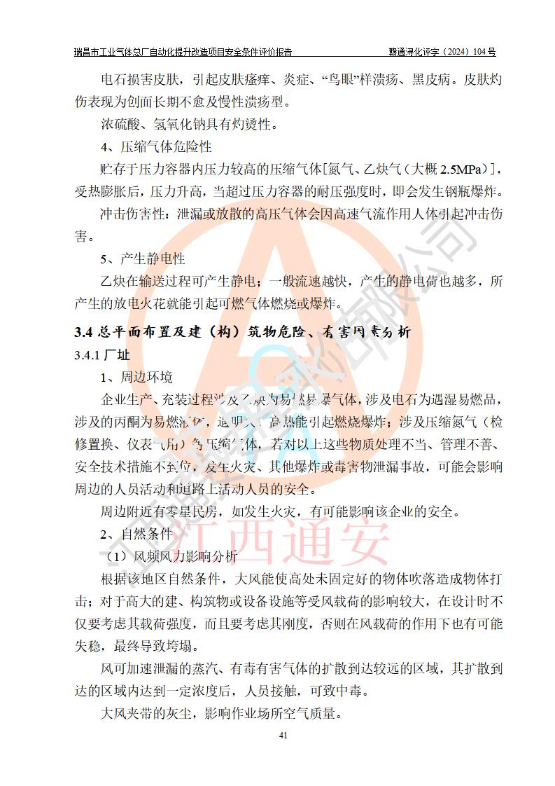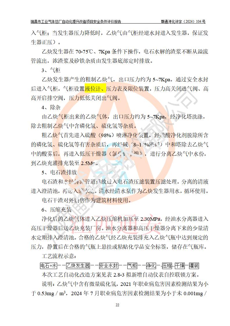 項目簡介 | 瑞昌市工業(yè)氣體總廠地址位于九江市瑞昌市桂林化工園區(qū)桂林村毛家墩,注冊資本101.5萬元,占地面積約22.71畝,該企業(yè)于2016年4月取得安全生產許可證(生產許可范圍為乙炔);同時設有氧氣、氬氣儲存、充 裝裝置等(不在本次評價范圍)。 該企業(yè)在役乙炔生產裝置采用電石、水為原料,經水解生成乙炔;生產(含充裝)過程中涉及的電石、乙炔、硫酸、氫氧化鈉、**等屬于危險化學品;其中硫酸、**屬于易制毒化學品,乙炔、硫化氫(乙炔氣中含有微量)屬于重點監(jiān)管的危險化學品;不涉及重點監(jiān)管的危險工藝; 本次項目涉及的生產單元、評價不構成危險化學品重大危險源。為了貫徹江西省應急管理廳關于印發(fā)《江西省化工企業(yè)自動化提升實施方案》(試行)的通知(贛 應急字〔2021〕190 號),企業(yè)擬進行自動化提升改造項目。 | ||||