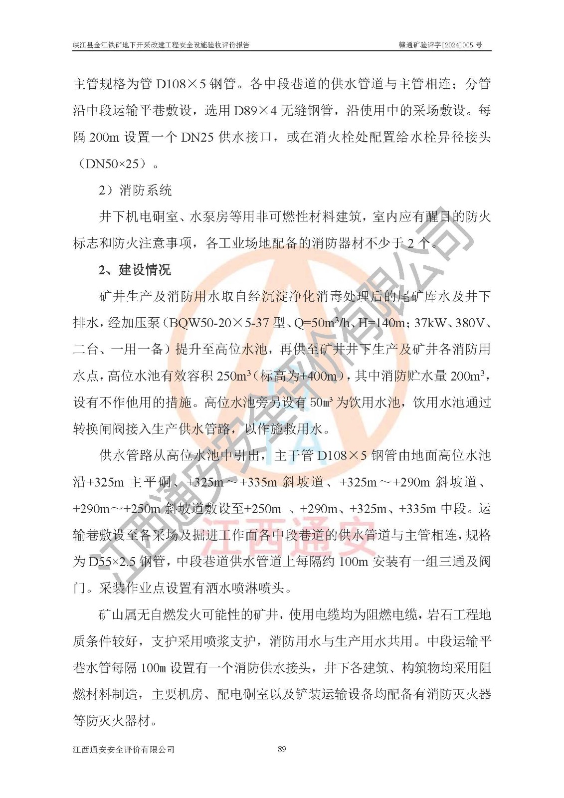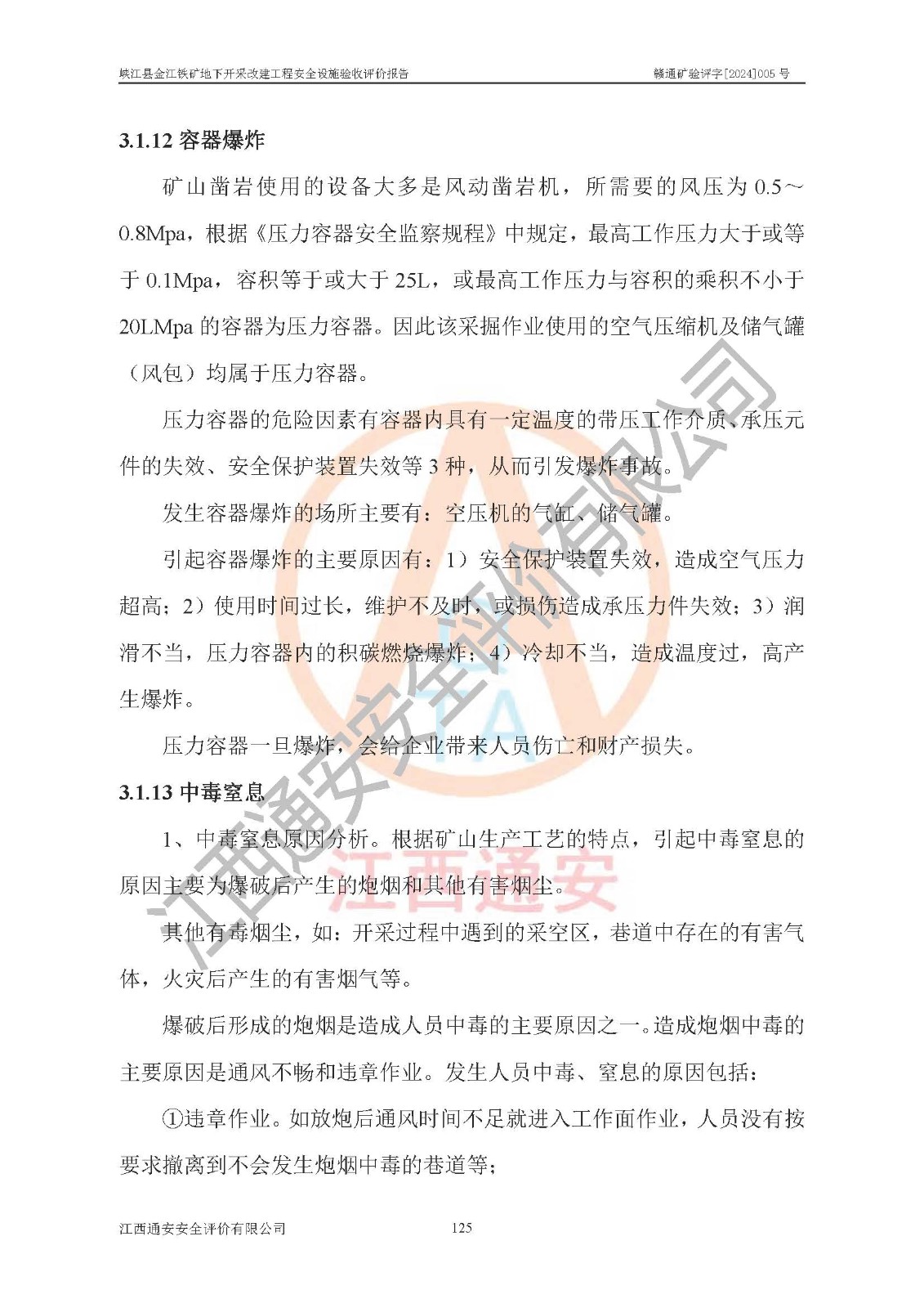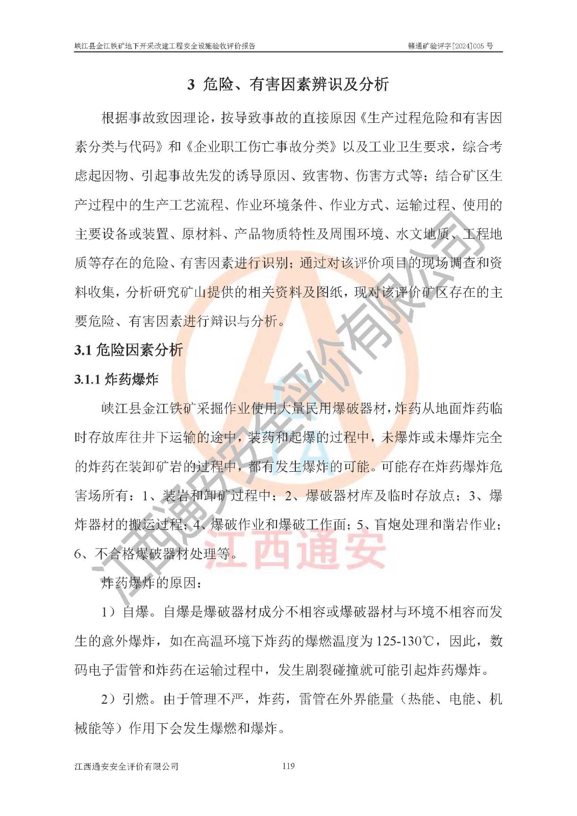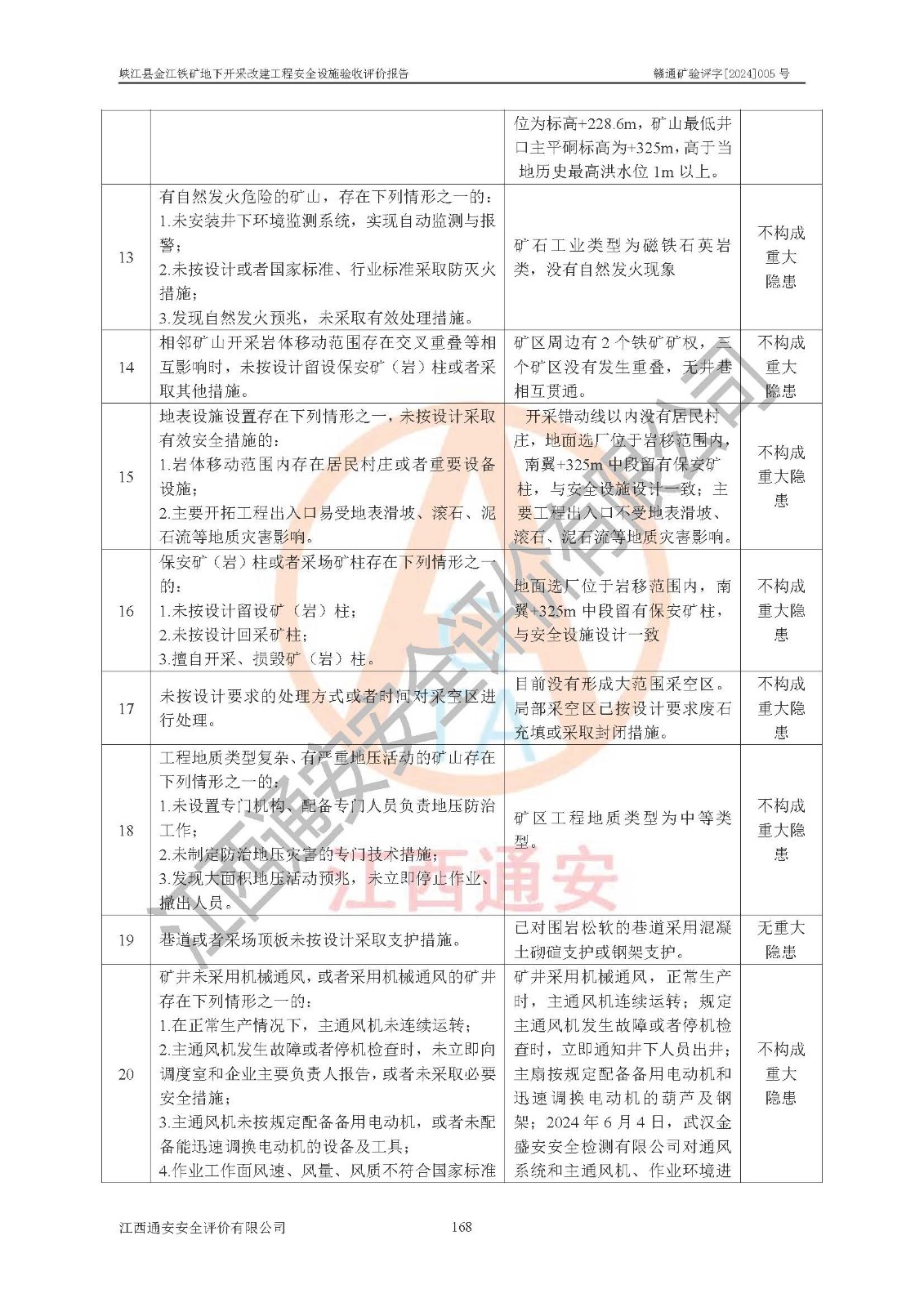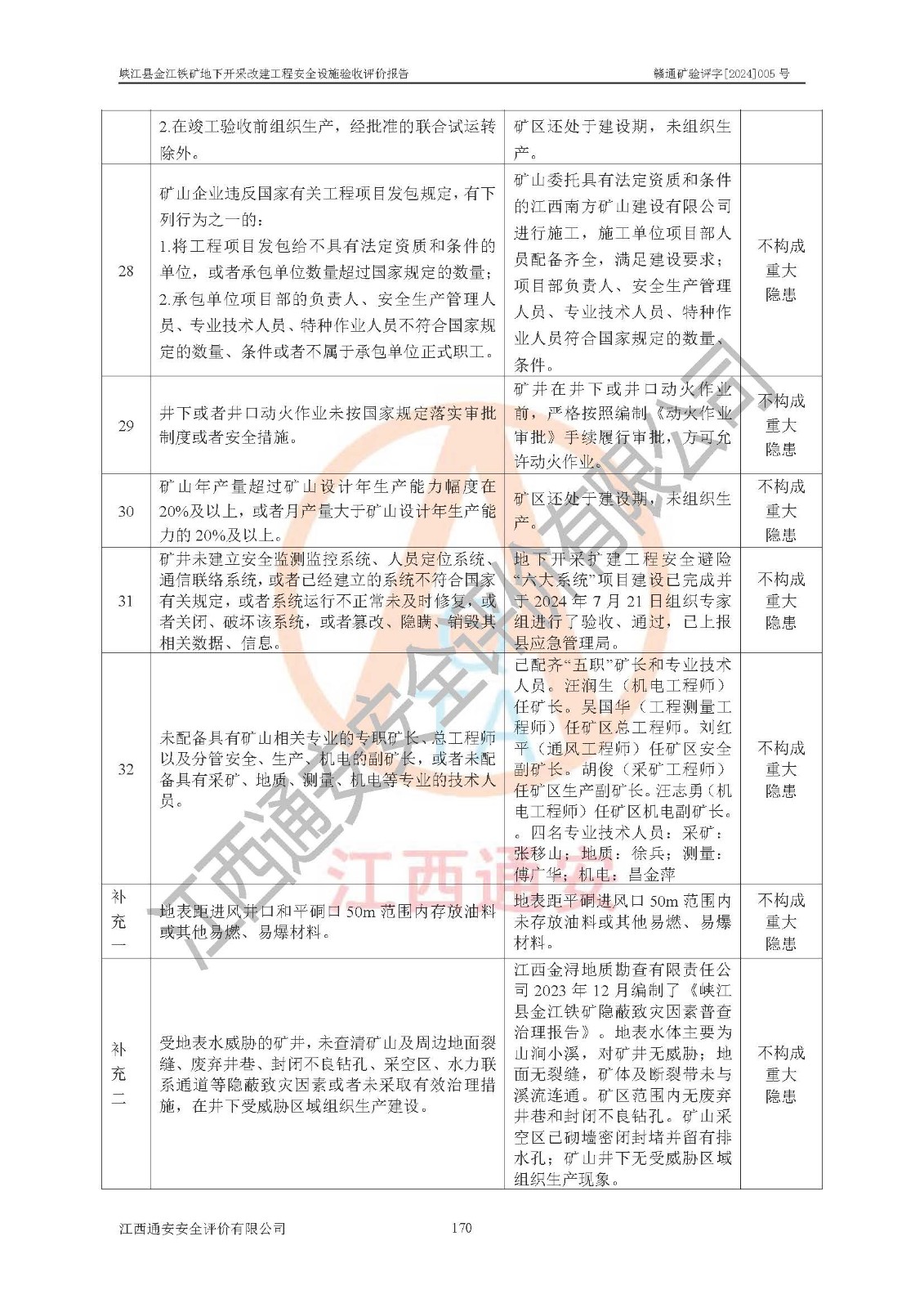 其它 | 建設(shè)項(xiàng)目中存在的主要危險(xiǎn)、有害因素為:炸藥爆炸,放炮,冒頂片幫,機(jī)械傷害,觸電,坍塌,**傷害,高處墜落,火災(zāi),起重傷害,容器爆炸,中毒窒息,物體打擊,淹溺、透水等15類(lèi)危險(xiǎn)因素;粉塵、噪聲與振動(dòng)等2類(lèi)有害因素;雷擊危險(xiǎn),地震危險(xiǎn),不良地質(zhì)危險(xiǎn),山體滑坡4類(lèi)自然危險(xiǎn)因素;其它危險(xiǎn)有害因素;共有21類(lèi)危險(xiǎn)、有害因素。屬危險(xiǎn)、有害因素較多的建設(shè)項(xiàng)目。掘進(jìn)和采礦作業(yè)中冒頂片幫、高處墜落、爆破傷害、火藥爆炸,運(yùn)輸過(guò)程中的**傷害,觸電等傷害為顯著危險(xiǎn),需要做好防范措施,為今后生產(chǎn)過(guò)程中重點(diǎn)防范的危險(xiǎn)有害因素。其它危險(xiǎn)有害因素為一般危險(xiǎn),在工作中需注意。 建設(shè)項(xiàng)目中存在的主要危險(xiǎn)、有害因素,在今后生產(chǎn)過(guò)程只要采取相應(yīng)的安全技術(shù)預(yù)防措施和安全管理措施,真正做到安全設(shè)施與主體工程同時(shí)設(shè)計(jì)、同時(shí)施工、同時(shí)投入生產(chǎn)和使用的“三同時(shí)”,其建設(shè)項(xiàng)目潛在的危險(xiǎn)、有害因素就可以得到控制,風(fēng)險(xiǎn)是可以接受的。 該建設(shè)項(xiàng)目現(xiàn)有安全設(shè)施在試生產(chǎn)運(yùn)行期間正常**,系統(tǒng)安全設(shè)施和安全保護(hù)裝置,以及作業(yè)環(huán)境條件經(jīng)武漢金盛安安全檢測(cè)有限公司和河北匡正檢測(cè)技術(shù)服務(wù)有限公司檢測(cè)檢驗(yàn),其檢測(cè)結(jié)果合格。礦山營(yíng)業(yè)執(zhí)照、采礦許可證、“五職礦長(zhǎng)”、主要負(fù)責(zé)人、安全生產(chǎn)管理人員、特種作業(yè)人員資格證齊全**。 該礦山地下開(kāi)采改建工程建設(shè)項(xiàng)目由江西南方礦山建設(shè)有限公司施工建設(shè),(礦山工程施工總承包貳級(jí),安全生產(chǎn)許可證編號(hào):(贛)FM安許證字[2005]M0041號(hào)),2024年8月提交了《峽江縣金江鐵礦地下開(kāi)采改建工程施工總結(jié)報(bào)告》。項(xiàng)目建設(shè)由江西省新大地項(xiàng)目管理有限公司監(jiān)理(礦山工程監(jiān)理**,工程監(jiān)理資質(zhì)證書(shū)編號(hào):E136000634-4/1),2024年8月提交了《峽江縣金江鐵礦地下開(kāi)采改建工程監(jiān)理工作總結(jié)報(bào)告》。 礦山建設(shè)、施工、試生產(chǎn)運(yùn)行以來(lái),能夠按照地下礦山安全設(shè)施“三同時(shí)”的要求開(kāi)展各項(xiàng)工作,對(duì)試運(yùn)行過(guò)程中存在的安全管理問(wèn)題,安全技術(shù)問(wèn)題進(jìn)行整改,符合安全設(shè)施與主體工程同時(shí)設(shè)計(jì)、同時(shí)施工、同時(shí)投入生產(chǎn)和使用的要求;其安全設(shè)施檢測(cè)檢驗(yàn)結(jié)果合格,已建項(xiàng)目的安全設(shè)施總體運(yùn)行**、技術(shù)措施得當(dāng);安全生產(chǎn)管理體系、組織機(jī)構(gòu)健全,制訂的各項(xiàng)安全生產(chǎn)管理制度和安全技術(shù)規(guī)程,能在生產(chǎn)過(guò)程中得到**遵守和實(shí)施。 峽江縣金江鐵礦地下開(kāi)采改建工程建設(shè)項(xiàng)目安全設(shè)施符合《峽江縣金江鐵礦地下開(kāi)采改建工程安全設(shè)施設(shè)計(jì)》和《峽江縣金江鐵礦地下開(kāi)采改建工程安全設(shè)施設(shè)計(jì)變更》及**有關(guān)法律法規(guī)、標(biāo)準(zhǔn)、規(guī)章、規(guī)范的規(guī)定要求,具備安全設(shè)施驗(yàn)收的條件。 | ||||