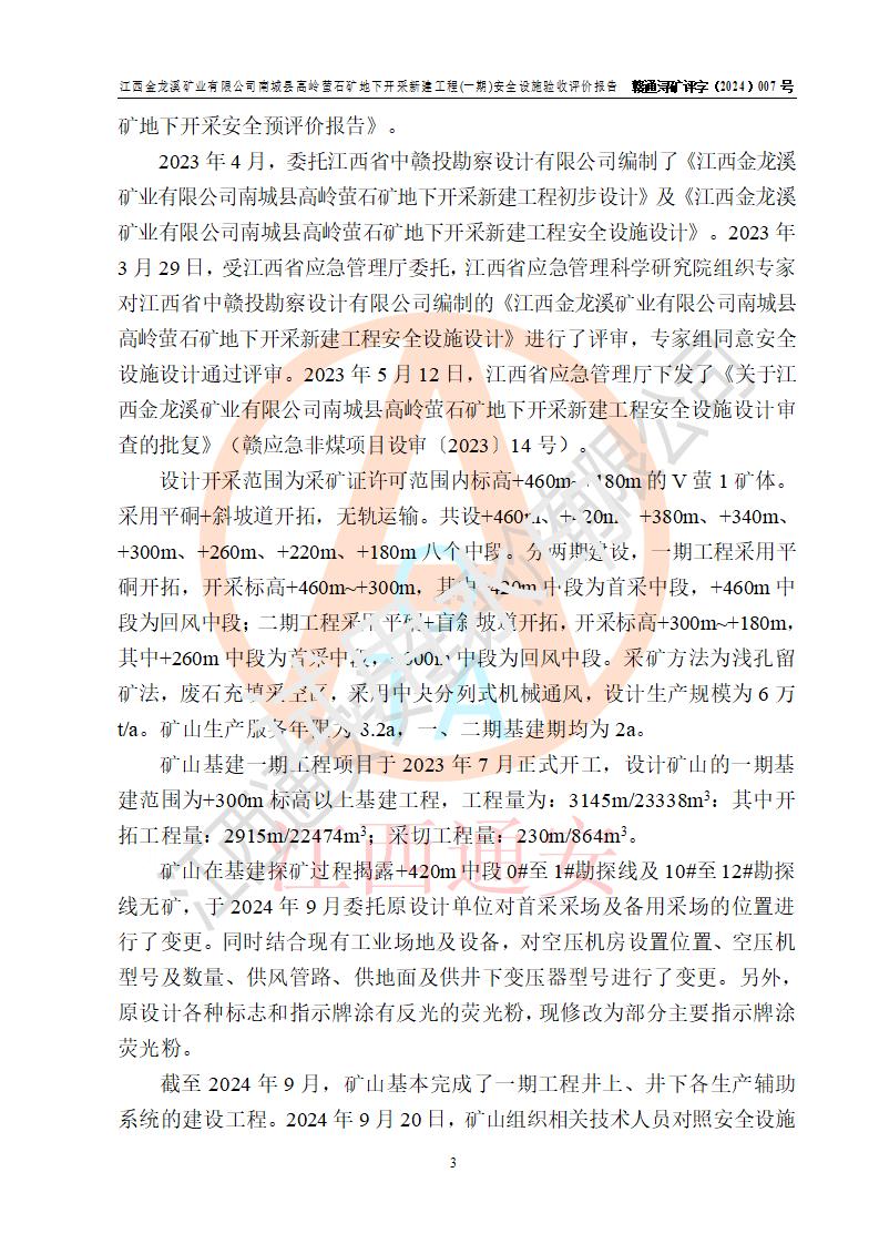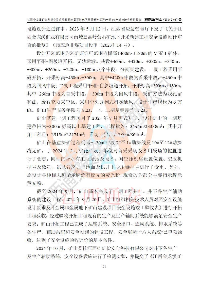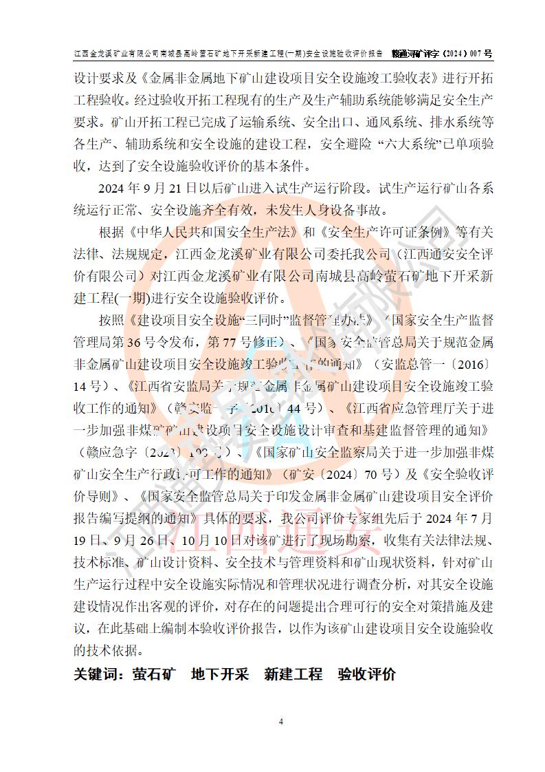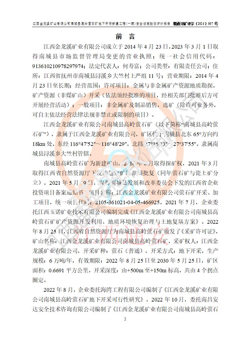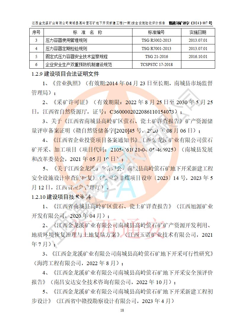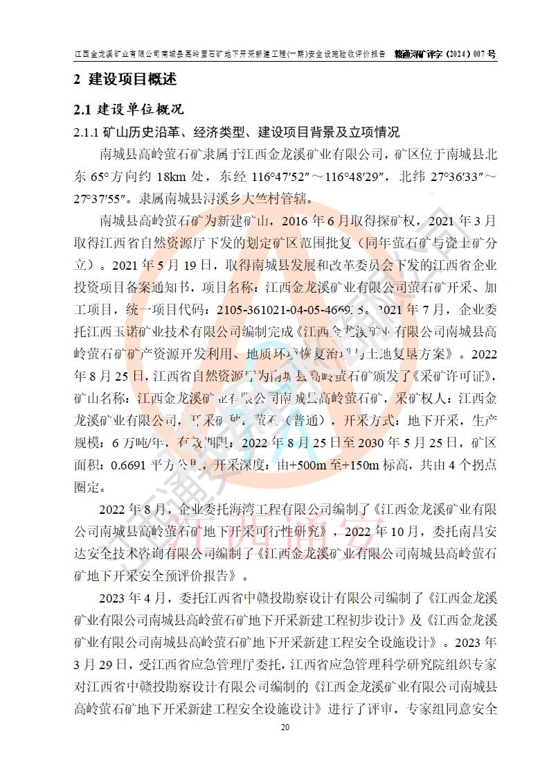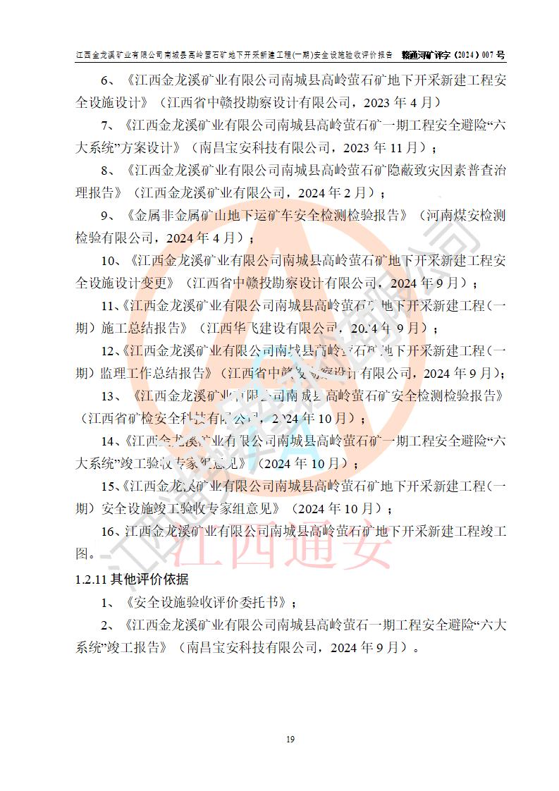 報告名稱 | 江西金龍溪礦業(yè)有限公司南城縣高嶺螢石礦地下開采新建工程(一期)安全設(shè)施驗收評價報告 | |||||