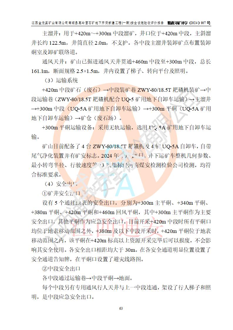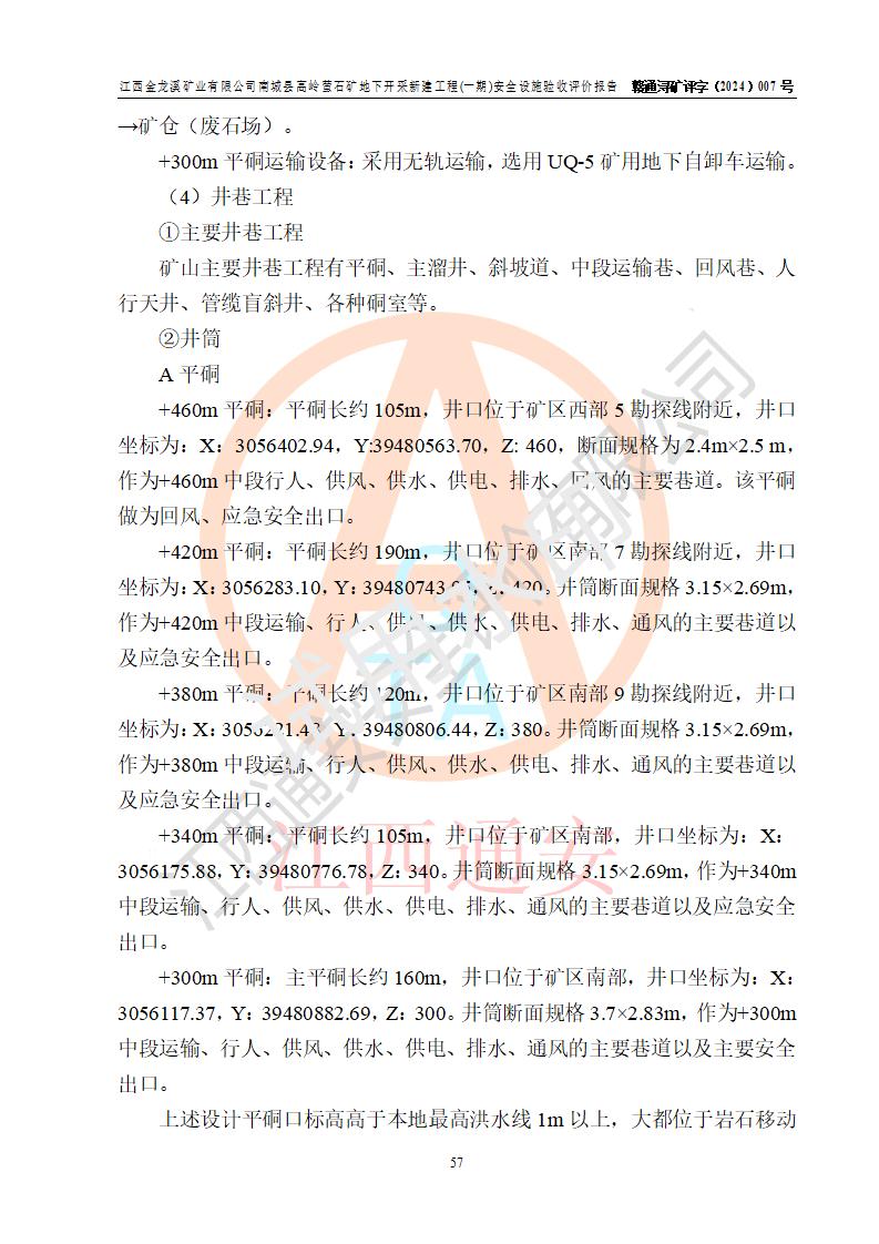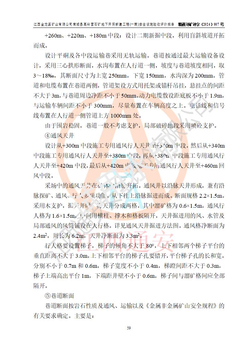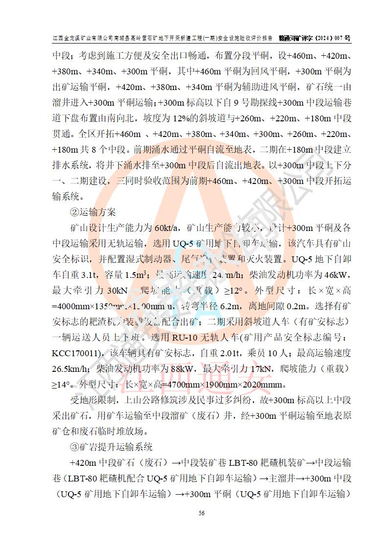 項目簡介 | 江西金龍溪礦業(yè)有限公司成立于2014年4月23日,2023年3月1日取得南城縣市場監(jiān)督管理局變更的營業(yè)執(zhí)照;統(tǒng)一社會信用代碼:913610210978297974;法定**人:何壽富;公司類型:有限責(zé)任公司;住所:江西省撫州市南城縣潯溪鄉(xiāng)大竺村上嚴(yán)組11號;營業(yè)期限:2014年4月23日至長期;經(jīng)營范圍:許可項目:金屬與非金屬礦產(chǎn)資源地質(zhì)勘探,礦產(chǎn)資源(非煤礦山)開采(依法須經(jīng)批準(zhǔn)的項目,經(jīng)相關(guān)部門批準(zhǔn)后方可開展經(jīng)營活動);一般項目:非金屬礦及制品銷售,選礦(除許可業(yè)務(wù)外,可自主依法經(jīng)營法律法規(guī)非禁止或限制的項目)。 江西金龍溪礦業(yè)有限公司南城縣高嶺螢石礦(以下簡稱“南城縣高嶺螢石礦”),隸屬于江西金龍溪礦業(yè)有限公司,礦區(qū)位于南城縣北東65°方向約18km處,東經(jīng)116°47′52″~116°48′29″,北緯27°36′33″~27°37′55″。隸屬南城縣潯溪鄉(xiāng)大竺村管轄。 南城縣高嶺螢石礦為新建礦山,2016年6月取得探礦權(quán),2021年3月取得江西省自然資源廳下發(fā)的劃定礦區(qū)范圍批復(fù)(同年螢石礦與瓷土礦分立)。2021年5月19日,取得南城縣發(fā)展和改革委員會下發(fā)的江西省企業(yè)投資項目備案通知書,項目名稱:江西金龍溪礦業(yè)有限公司螢石礦開采、加工項目,統(tǒng)一項目代碼:2105-361021-04-05-466925。2021年7月,企業(yè)委托江西玉諾礦業(yè)技術(shù)有限公司編制完成《江西金龍溪礦業(yè)有限公司南城縣高嶺螢石礦礦產(chǎn)資源開發(fā)利用、地質(zhì)環(huán)境恢復(fù)治理與土地復(fù)墾方案》。2022年8月25日,江西省自然資源廳為南城縣高嶺螢石礦頒發(fā)了《采礦許可證》,礦山名稱:江西金龍溪礦業(yè)有限公司南城縣高嶺螢石礦,采礦權(quán)人:江西金龍溪礦業(yè)有限公司,開采礦種:螢石(普通),開采方式:地下開采,生產(chǎn)規(guī)模:6萬噸/年,**期限:2022年8月25日至2030年5月25日,礦區(qū)面積:0.6691平方**,開采深度:由+500m至+150m標(biāo)高,共由4個拐點圈定。 2022年8月,企業(yè)委托海灣工程有限公司編制了《江西金龍溪礦業(yè)有限公司南城縣高嶺螢石礦地下開采可行性研究》,2022年10月,委托南昌安達(dá)安全技術(shù)咨詢有限公司編制了《江西金龍溪礦業(yè)有限公司南城縣高嶺螢石礦地下開采安全預(yù)評價報告》。 2023年4月,委托江西省中贛投勘察設(shè)計有限公司編制了《江西金龍溪礦業(yè)有限公司南城縣高嶺螢石礦地下開采新建工程初步設(shè)計》及《江西金龍溪礦業(yè)有限公司南城縣高嶺螢石礦地下開采新建工程安全設(shè)施設(shè)計》。2023年3月29日,受江西省應(yīng)急管理廳委托,江西省應(yīng)急管理科學(xué)研究院組織專家對江西省中贛投勘察設(shè)計有限公司編制的《江西金龍溪礦業(yè)有限公司南城縣高嶺螢石礦地下開采新建工程安全設(shè)施設(shè)計》進(jìn)行了評審,專家組同意安全設(shè)施設(shè)計通過評審。2023年5月12日,江西省應(yīng)急管理廳下發(fā)了《關(guān)于江西金龍溪礦業(yè)有限公司南城縣高嶺螢石礦地下開采新建工程安全設(shè)施設(shè)計審查的批復(fù)》(贛應(yīng)急非煤項目設(shè)審〔2023〕14號)。 設(shè)計開采范圍為采礦證許可范圍內(nèi)標(biāo)高+460m~+180m的V螢1礦體。采用平硐+斜坡道開拓,無軌運輸。共設(shè)+460m、+420m、+380m、+340m、+300m、+260m、+220m、+180m八個中段。分兩期建設(shè),一期工程采用平硐開拓,開采標(biāo)高+460m~+300m,其中+420m中段為首采中段,+460m中段為回風(fēng)中段;二期工程采用平硐+盲斜坡道開拓,開采標(biāo)高+300m~+180m,其中+260m中段為首采中段,+300m中段為回風(fēng)中段。采礦方法為淺孔留礦法,廢石充填采空區(qū),采用中央分列式機(jī)械通風(fēng),設(shè)計生產(chǎn)規(guī)模為6萬t/a。礦山生產(chǎn)服務(wù)年限為8.2a,一、二期基建期均為2a。 礦山基建一期工程項目于2023年7月正式開工,設(shè)計礦山的一期基建范圍為+300m標(biāo)高以上基建工程,工程量為:3145m/23338m3:其中開拓工程量:2915m/22474m3;采切工程量:230m/864m3。 截至2024年9月,礦山基本完成了一期工程井上、井下各生產(chǎn)輔助系統(tǒng)的建設(shè)工程。2024年9月20日,礦山組織相關(guān)技術(shù)人員對照安全設(shè)施設(shè)計要求及《金屬非金屬地下礦山建設(shè)項目安全設(shè)施竣工驗收表》進(jìn)行開拓工程驗收。經(jīng)過驗收開拓工程現(xiàn)有的生產(chǎn)及生產(chǎn)輔助系統(tǒng)能夠滿足安全生產(chǎn)要求。礦山開拓工程已完成了運輸系統(tǒng)、安全出口、通風(fēng)系統(tǒng)、排水系統(tǒng)等各生產(chǎn)、輔助系統(tǒng)和安全設(shè)施的建設(shè)工程,安全避險 “六大系統(tǒng)”已單項驗收,達(dá)到了安全設(shè)施驗收評價的基本條件。 2024年9月21日以后礦山進(jìn)入試生產(chǎn)運行階段。試生產(chǎn)運行礦山各系統(tǒng)運行正常、安全設(shè)施齊全**,未發(fā)生人身設(shè)備事故。 | |||||