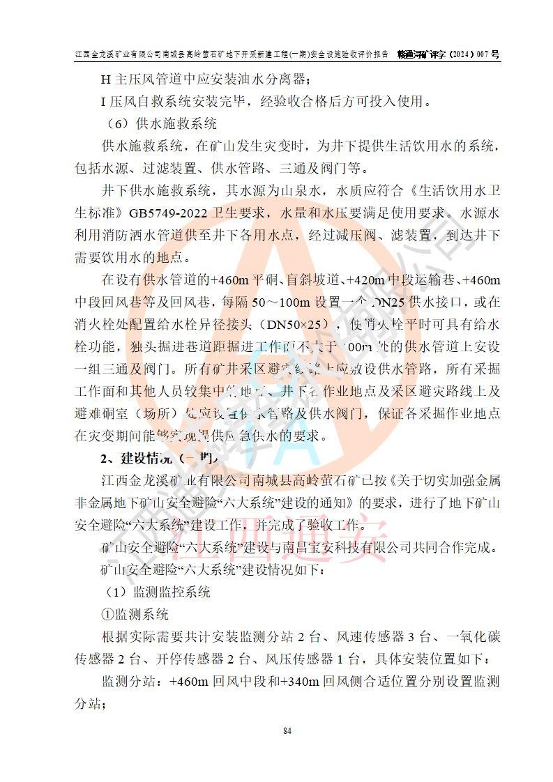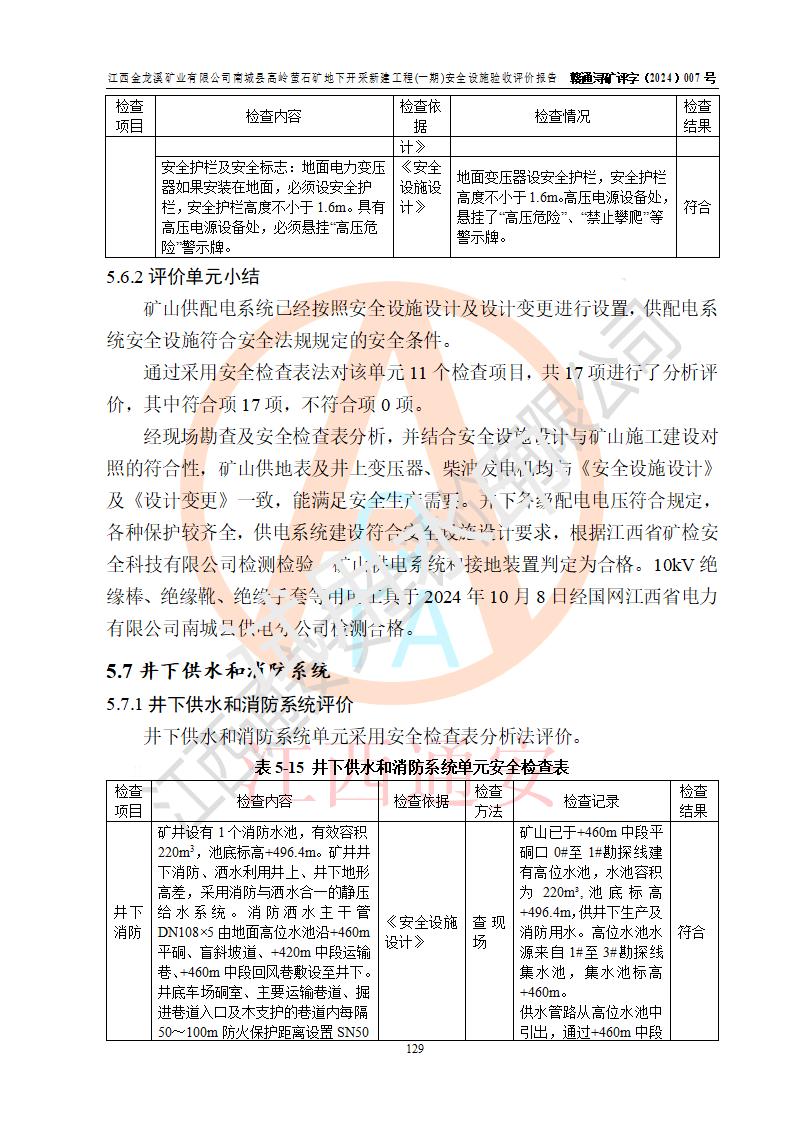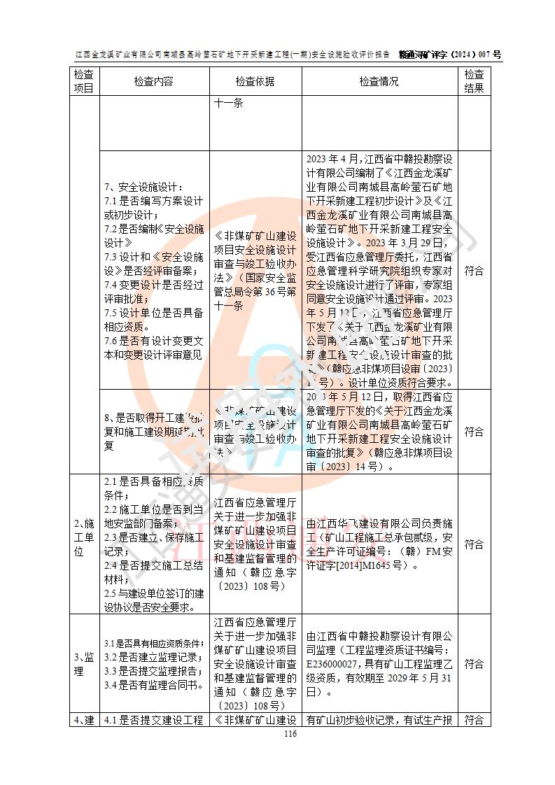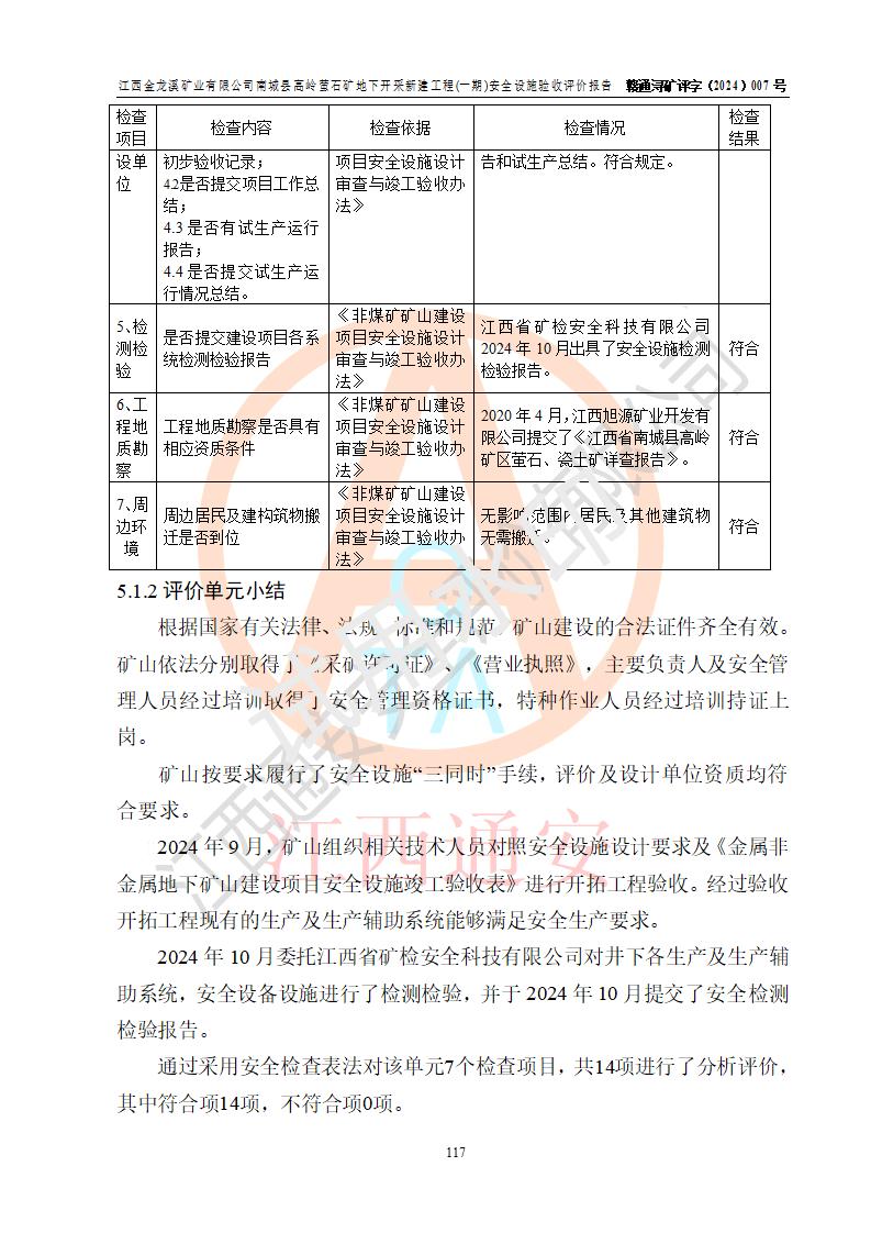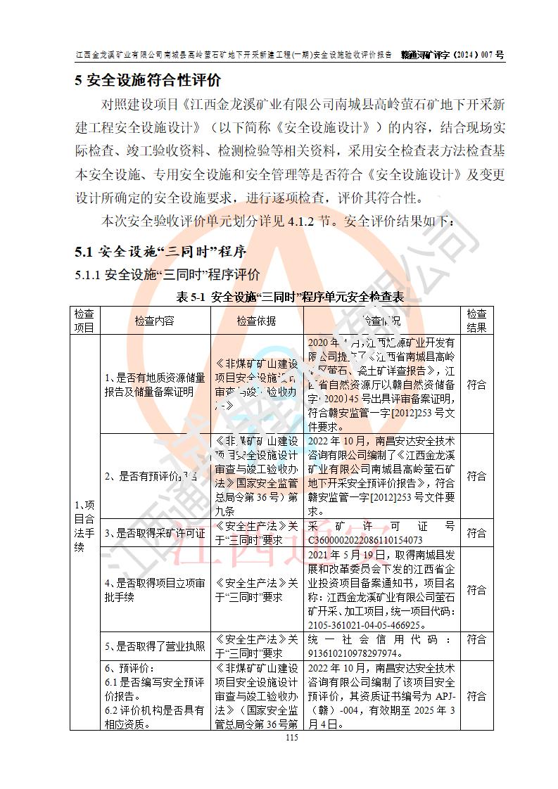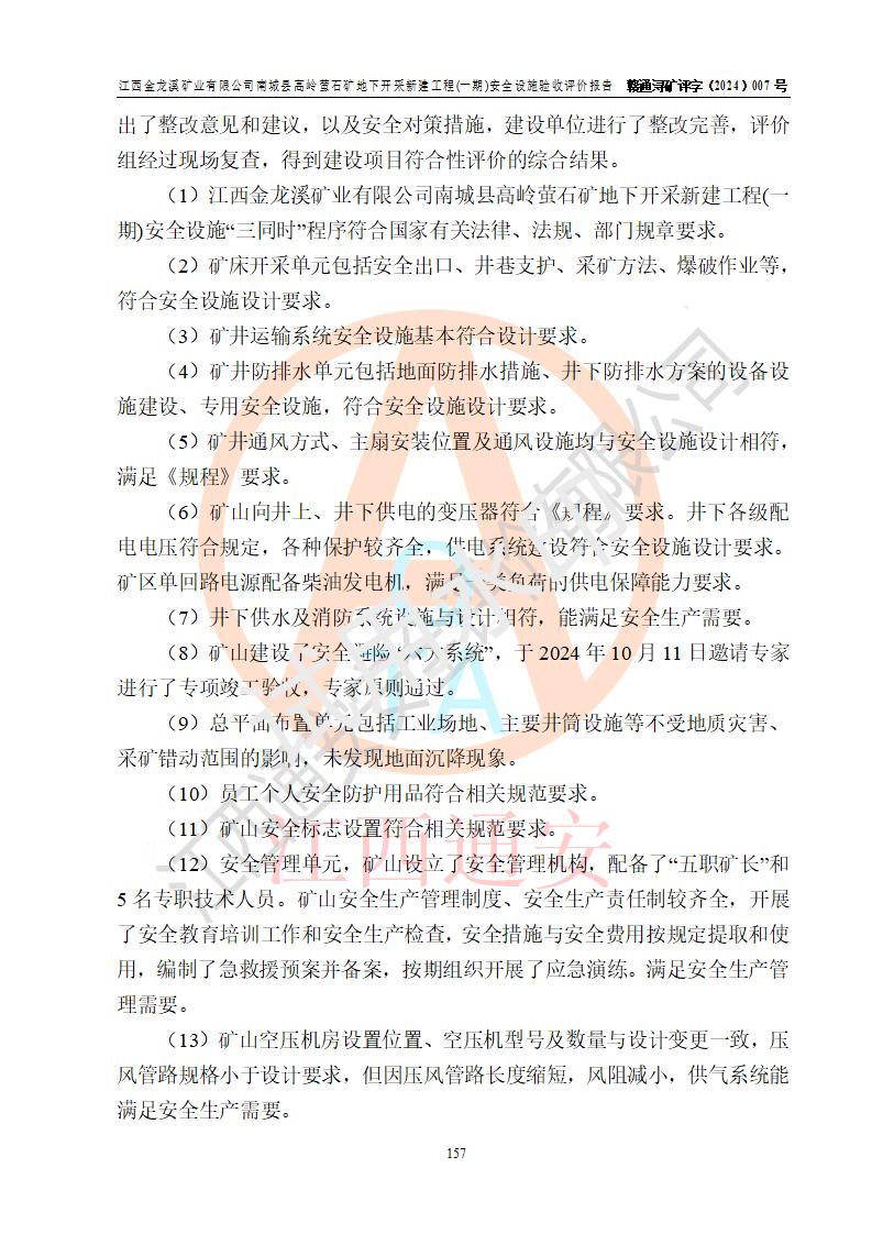 評價結(jié)論 | 江西金龍溪礦業(yè)有限公司南城縣高嶺螢石礦地下開采新建工程(一期)安全設(shè)施符合《江西金龍溪礦業(yè)有限公司南城縣高嶺螢石礦地下開采新建工程安全設(shè)施設(shè)計》及**有關(guān)法律法規(guī)、標(biāo)準(zhǔn)、規(guī)章、規(guī)范的規(guī)定要求,具備安全設(shè)施驗收的條件。 | |||||