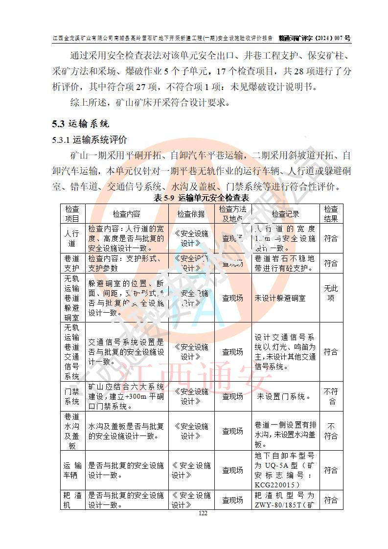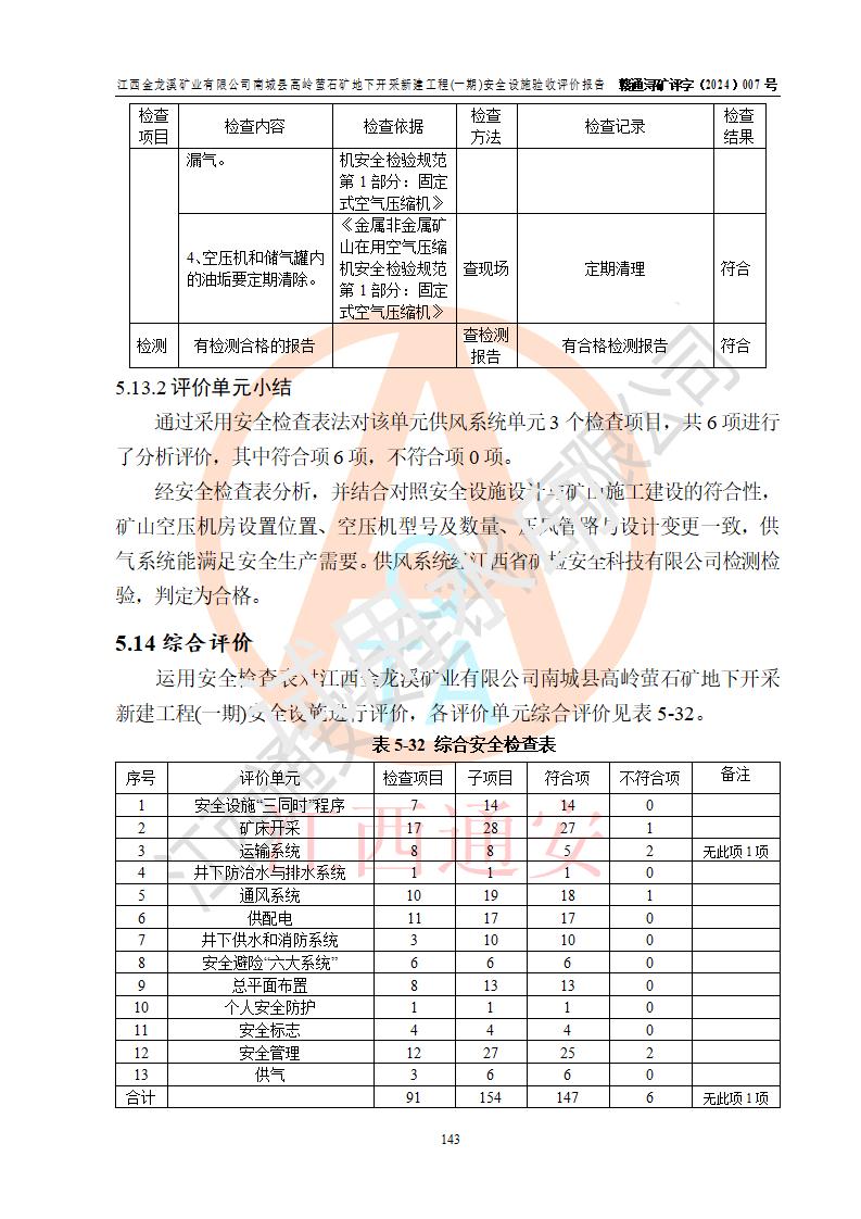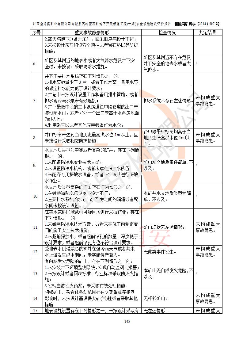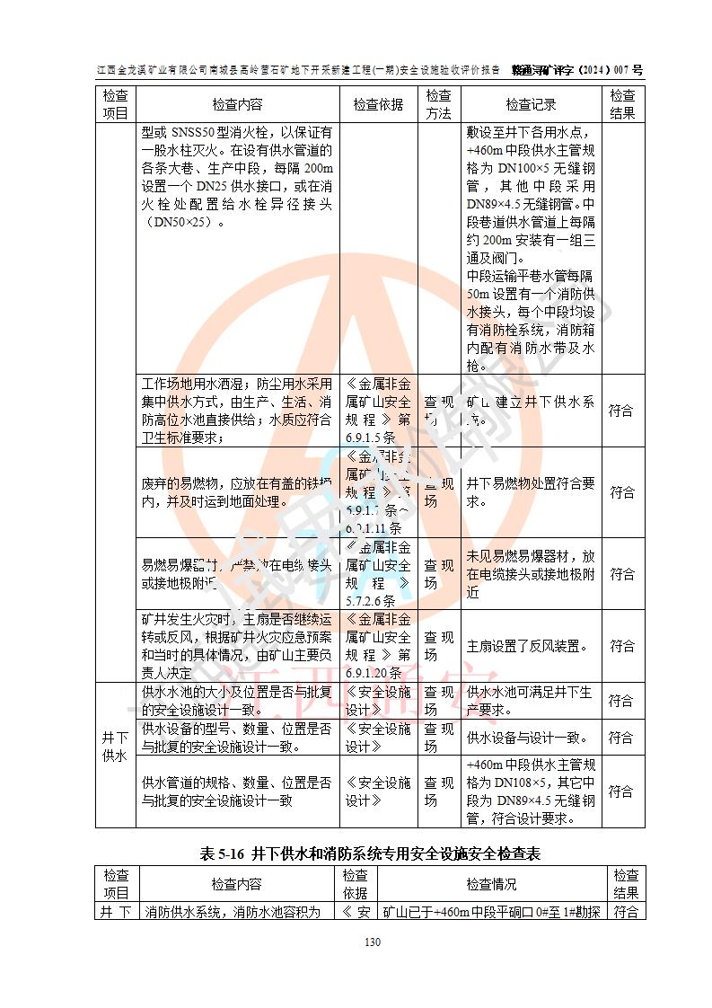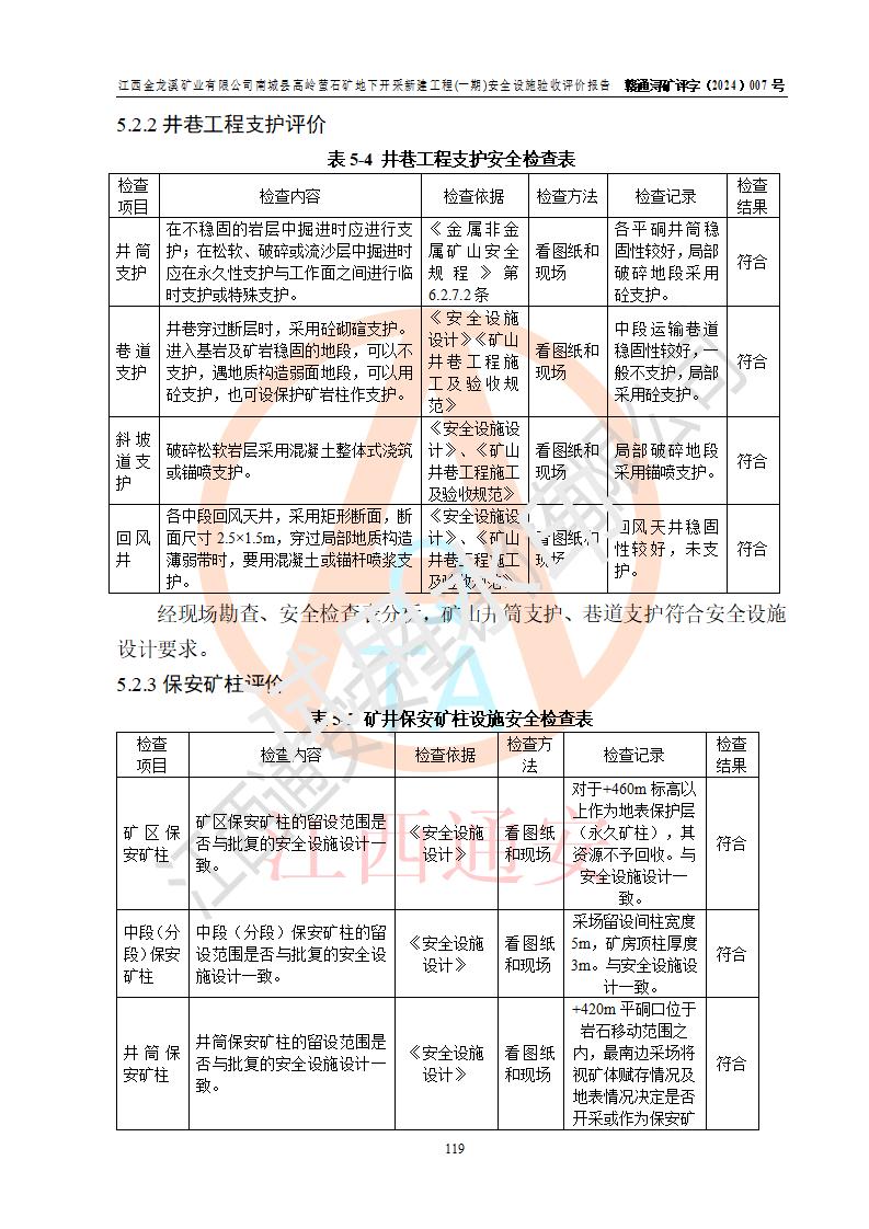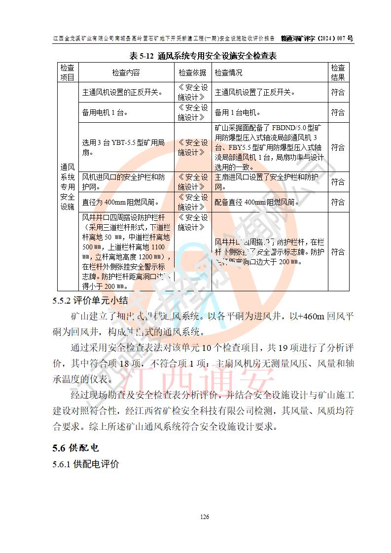 評價結(jié)論 | 江西金龍溪礦業(yè)有限公司南城縣高嶺螢石礦地下開采新建工程(一期)安全設(shè)施符合《江西金龍溪礦業(yè)有限公司南城縣高嶺螢石礦地下開采新建工程安全設(shè)施設(shè)計》及**有關(guān)法律法規(guī)、標(biāo)準(zhǔn)、規(guī)章、規(guī)范的規(guī)定要求,具備安全設(shè)施驗收的條件。 | |||||