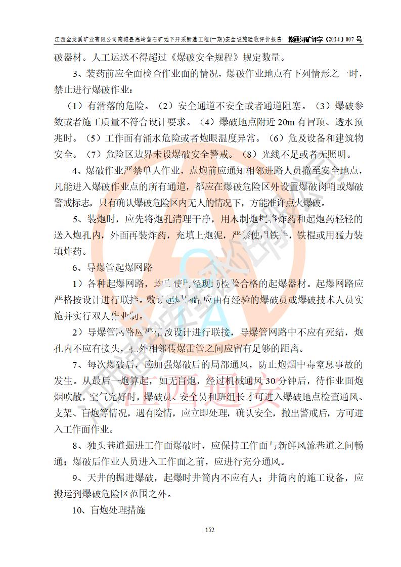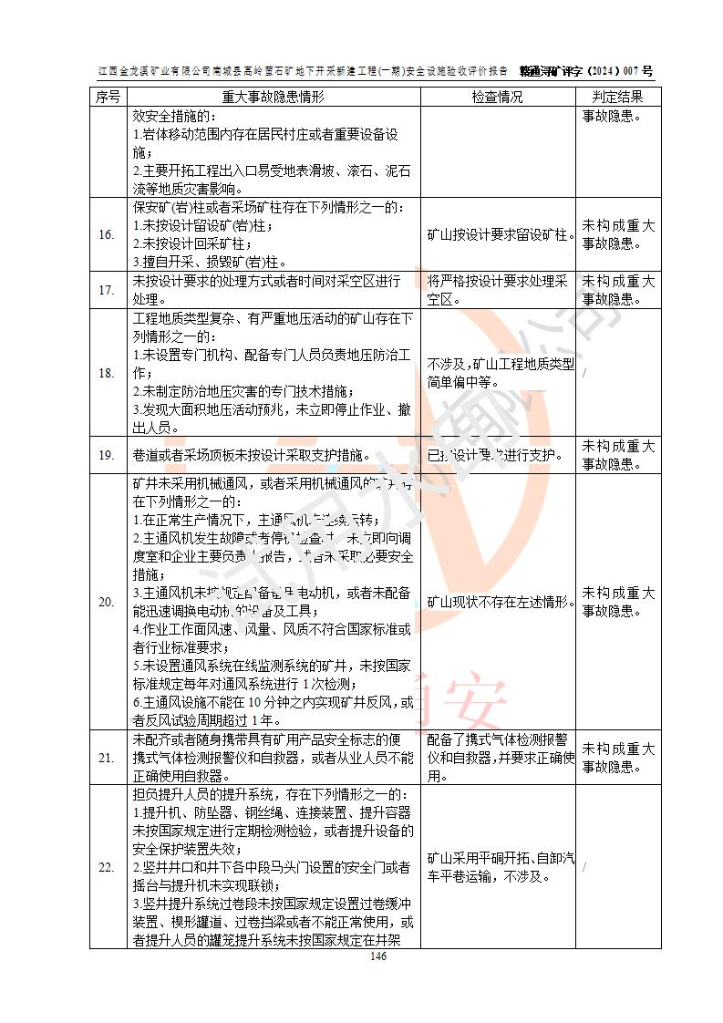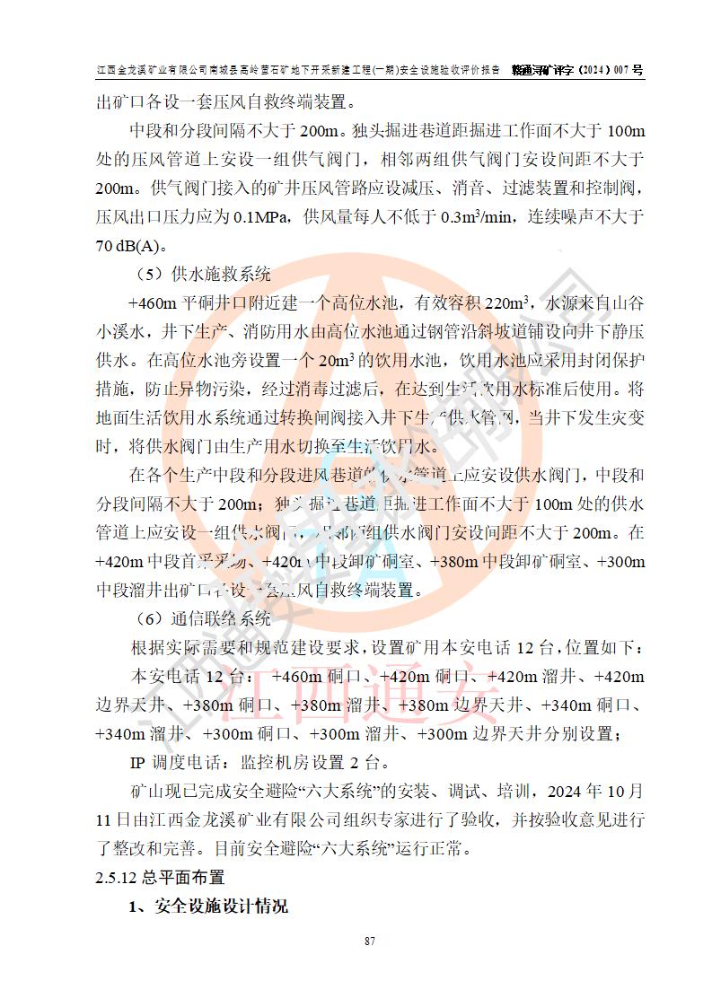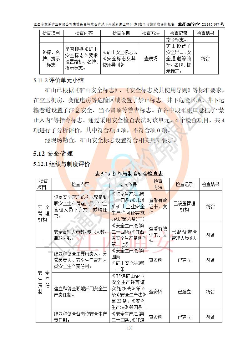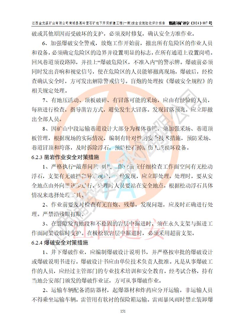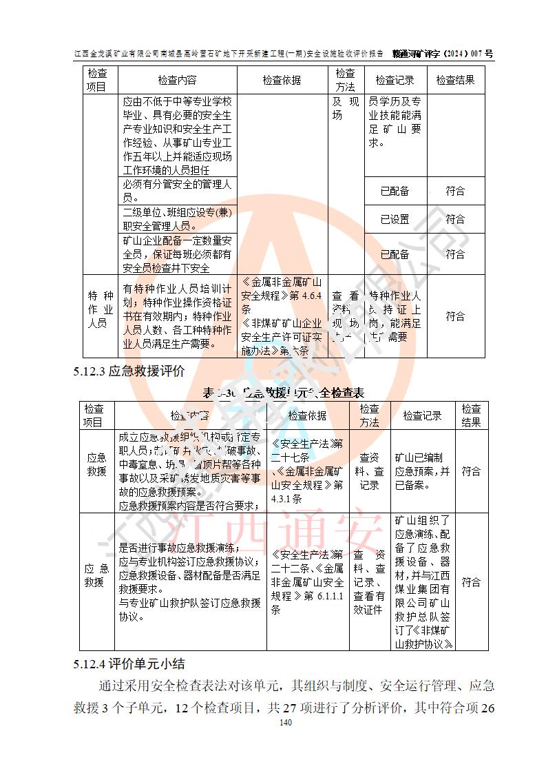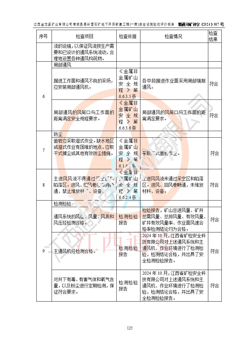 評價結(jié)論 | 江西金龍溪礦業(yè)有限公司南城縣高嶺螢石礦地下開采新建工程(一期)安全設(shè)施符合《江西金龍溪礦業(yè)有限公司南城縣高嶺螢石礦地下開采新建工程安全設(shè)施設(shè)計》及**有關(guān)法律法規(guī)、標(biāo)準(zhǔn)、規(guī)章、規(guī)范的規(guī)定要求,具備安全設(shè)施驗收的條件。 | |||||