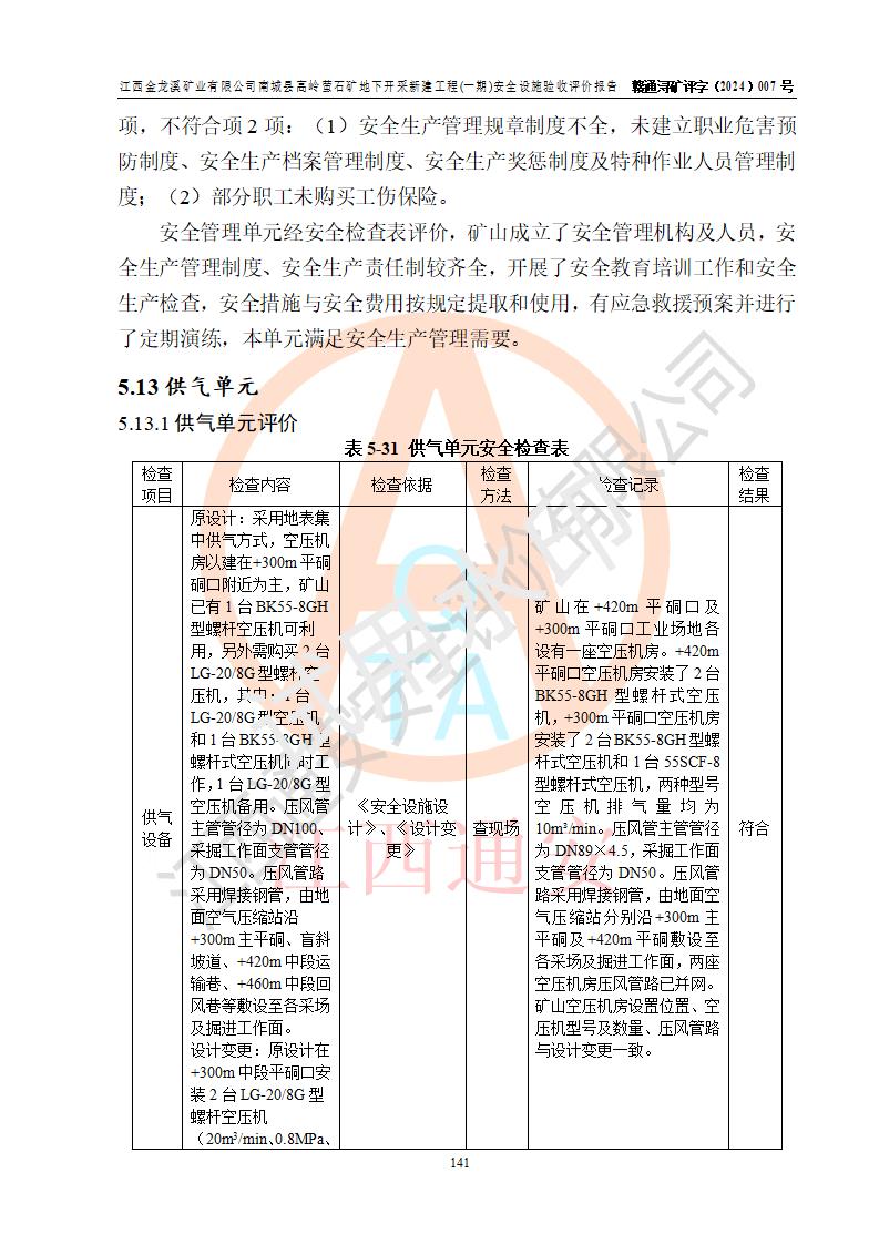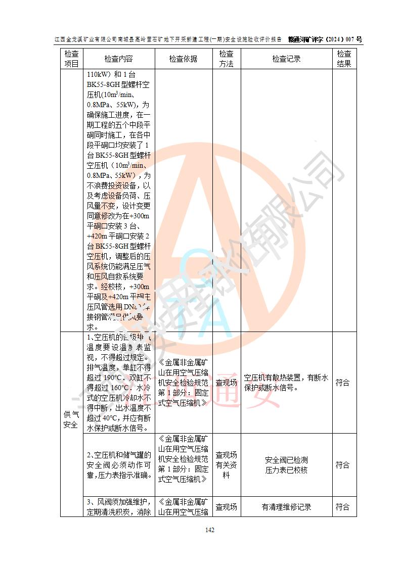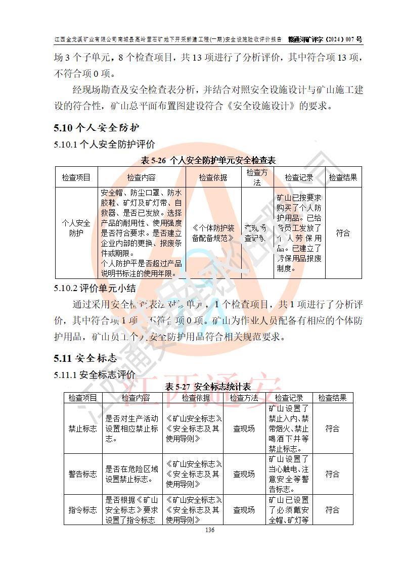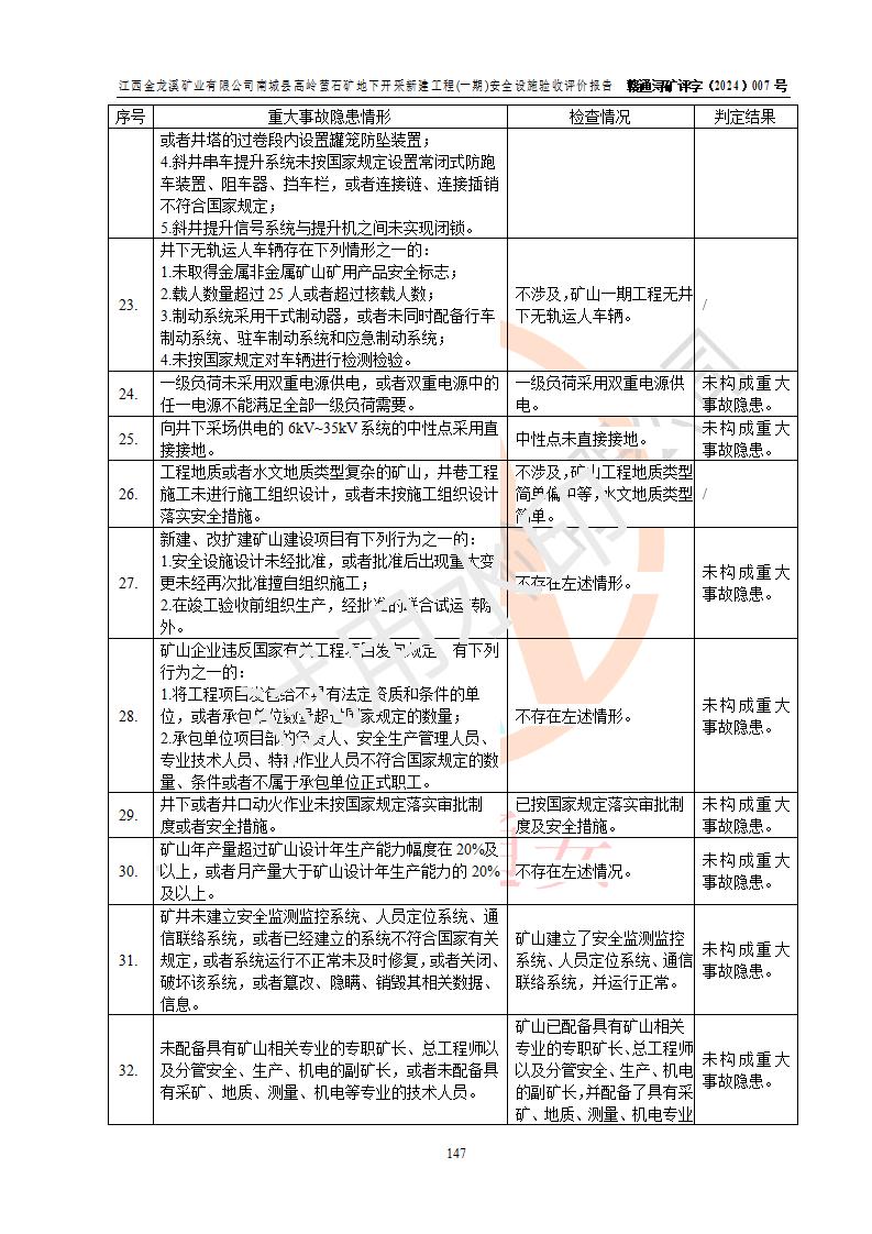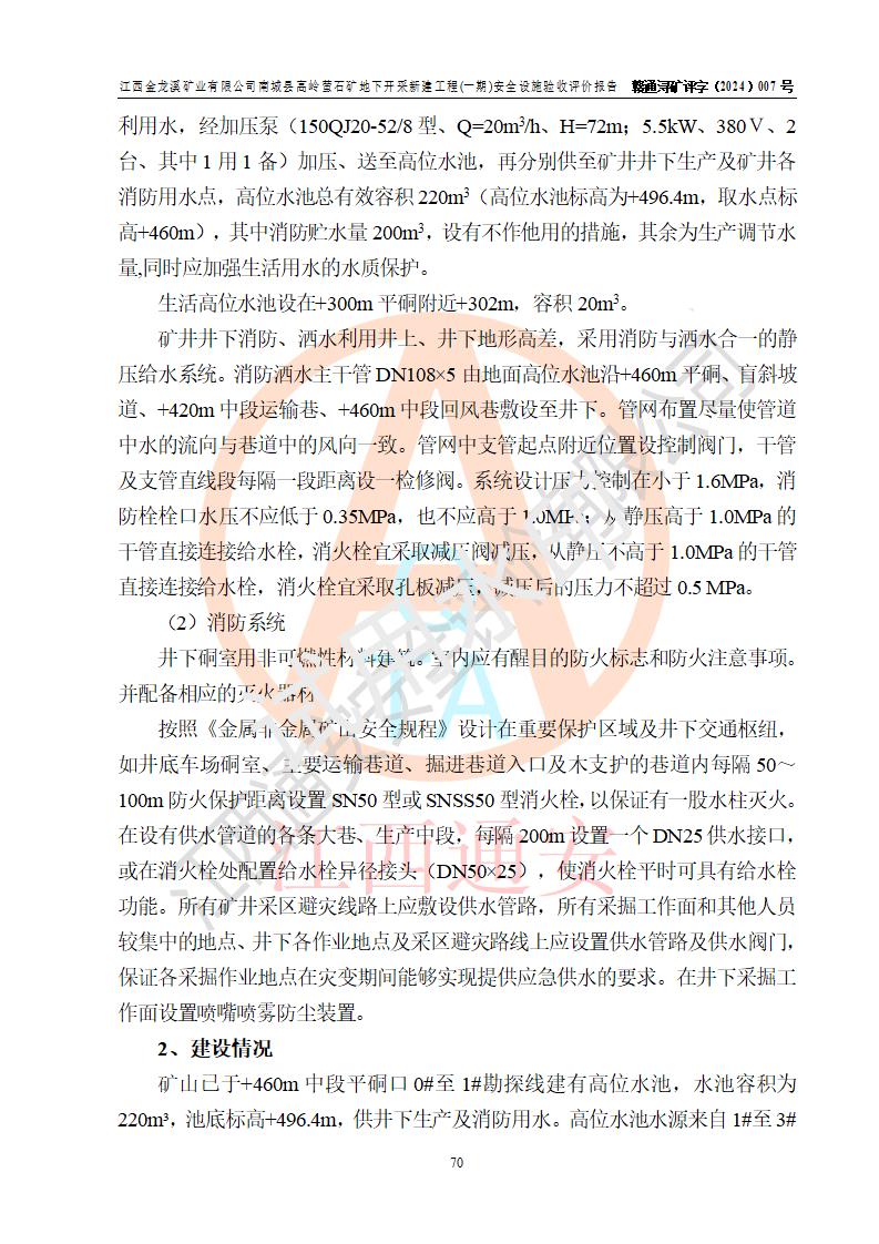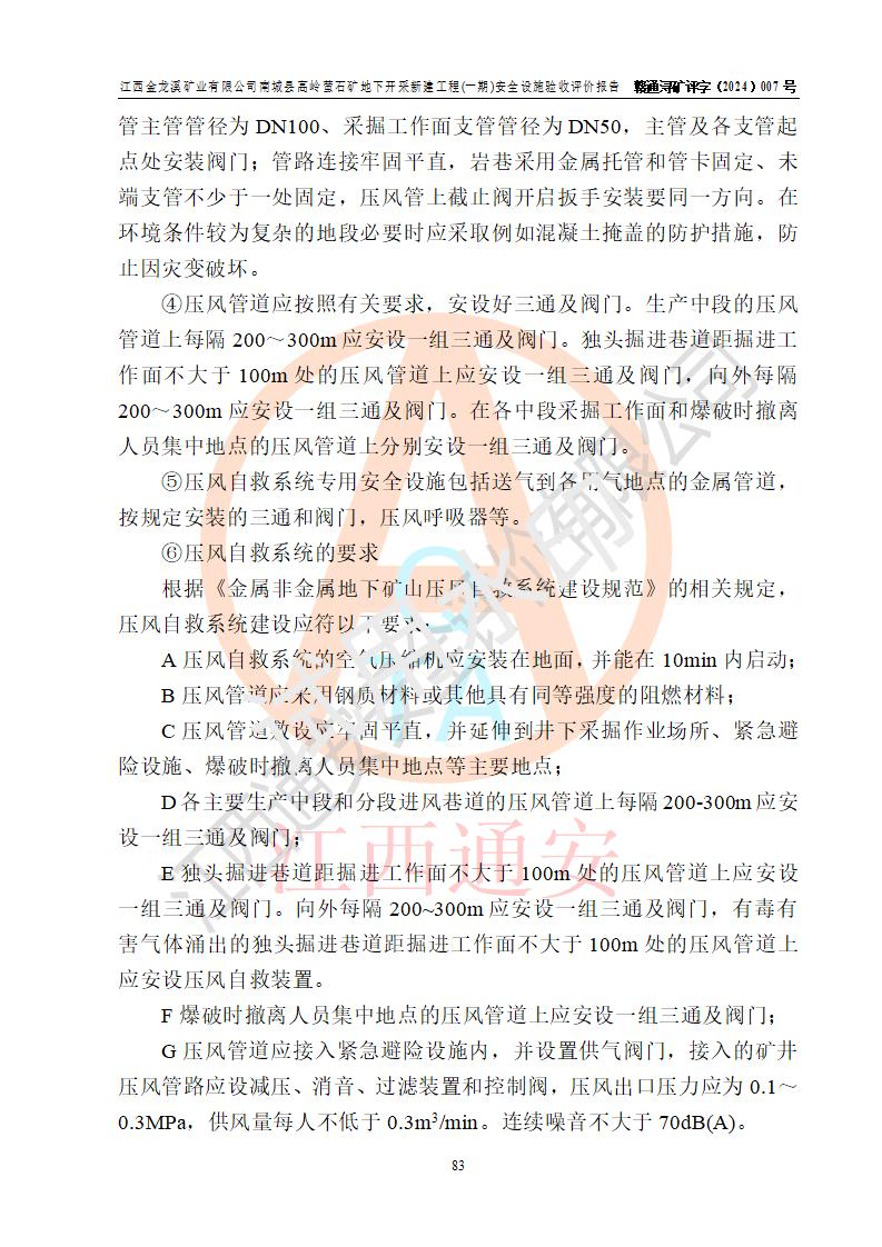 評價結(jié)論 | 江西金龍溪礦業(yè)有限公司南城縣高嶺螢石礦地下開采新建工程(一期)安全設(shè)施符合《江西金龍溪礦業(yè)有限公司南城縣高嶺螢石礦地下開采新建工程安全設(shè)施設(shè)計》及**有關(guān)法律法規(guī)、標(biāo)準(zhǔn)、規(guī)章、規(guī)范的規(guī)定要求,具備安全設(shè)施驗收的條件。 | |||||