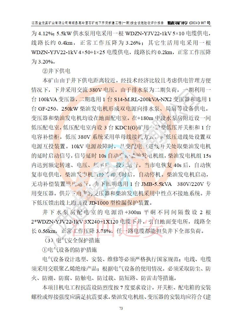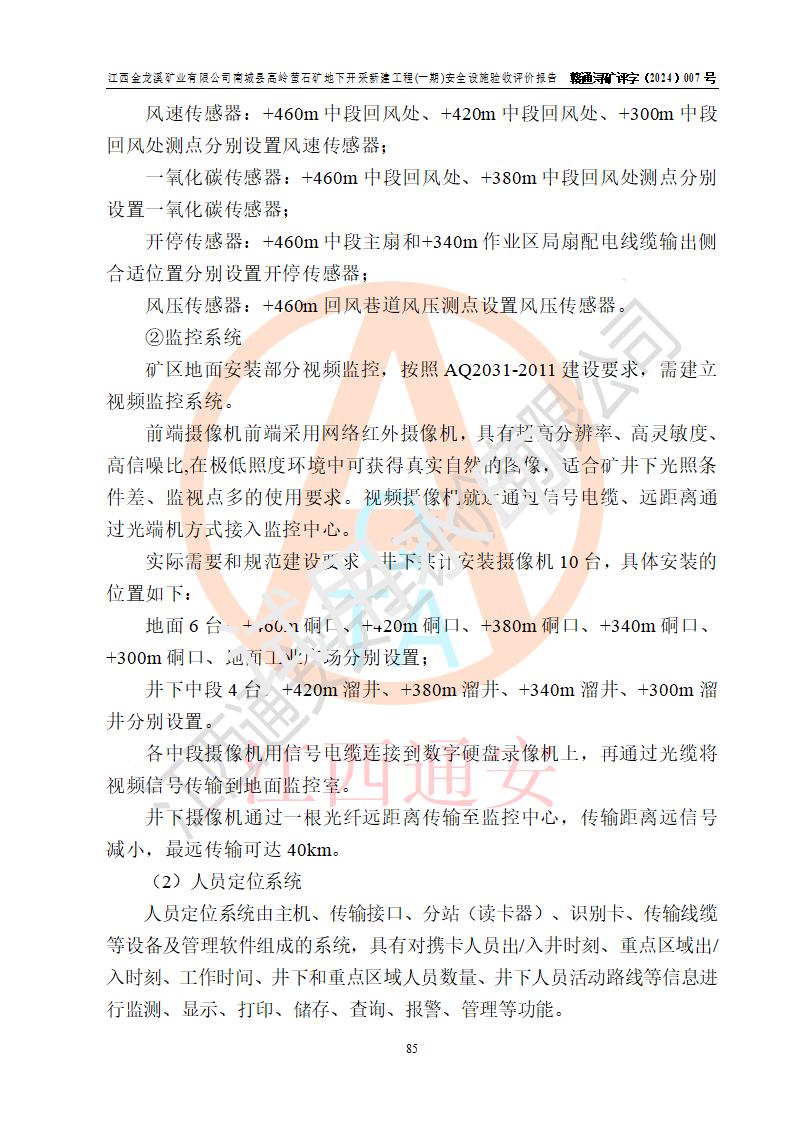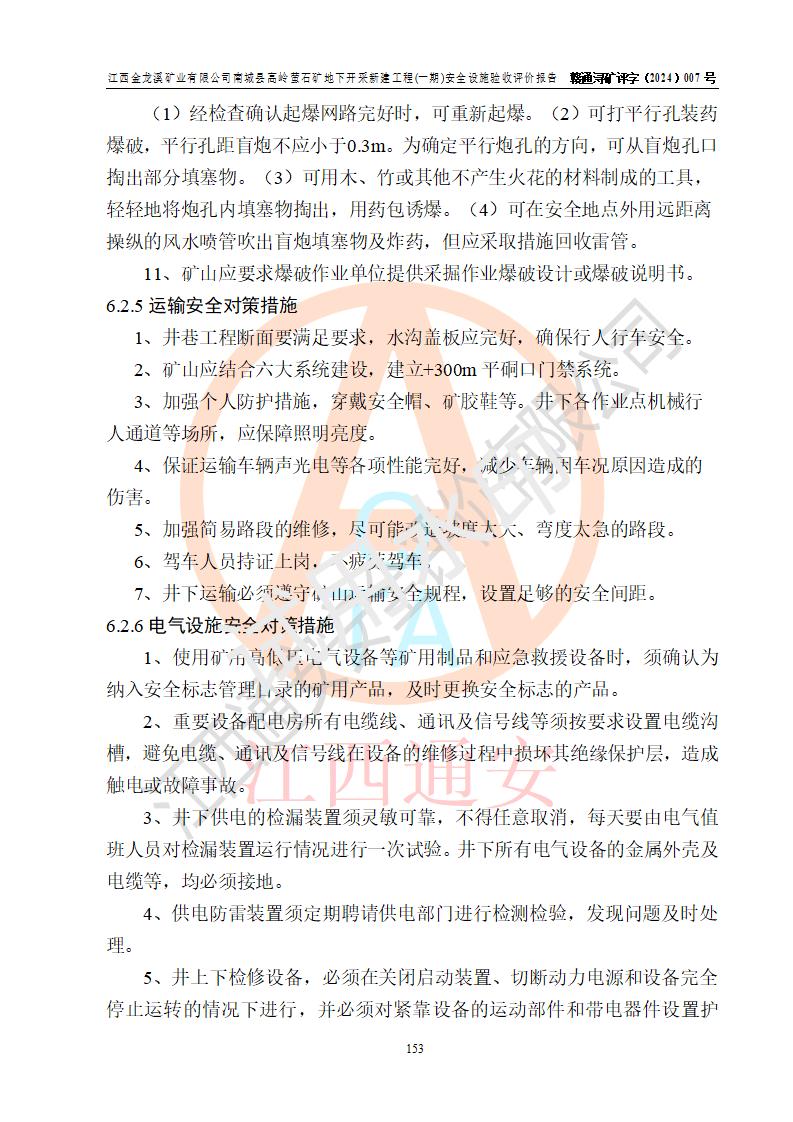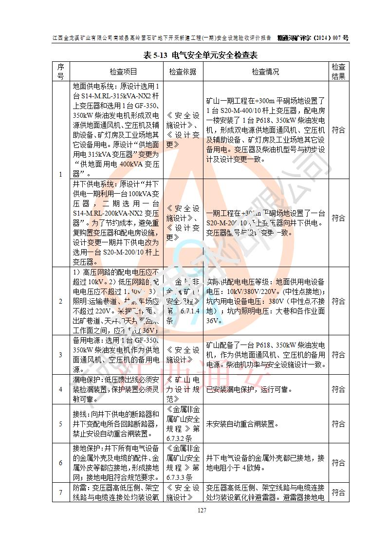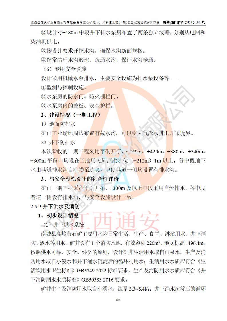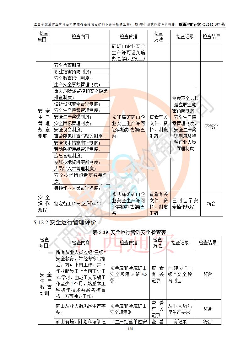 評價結(jié)論 | 江西金龍溪礦業(yè)有限公司南城縣高嶺螢石礦地下開采新建工程(一期)安全設(shè)施符合《江西金龍溪礦業(yè)有限公司南城縣高嶺螢石礦地下開采新建工程安全設(shè)施設(shè)計》及**有關(guān)法律法規(guī)、標(biāo)準(zhǔn)、規(guī)章、規(guī)范的規(guī)定要求,具備安全設(shè)施驗收的條件。 | |||||