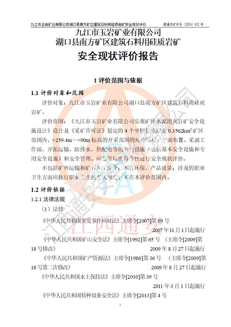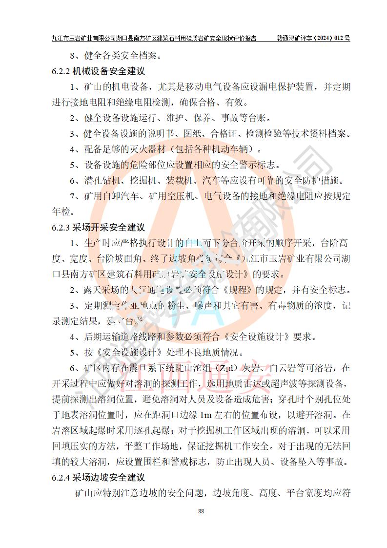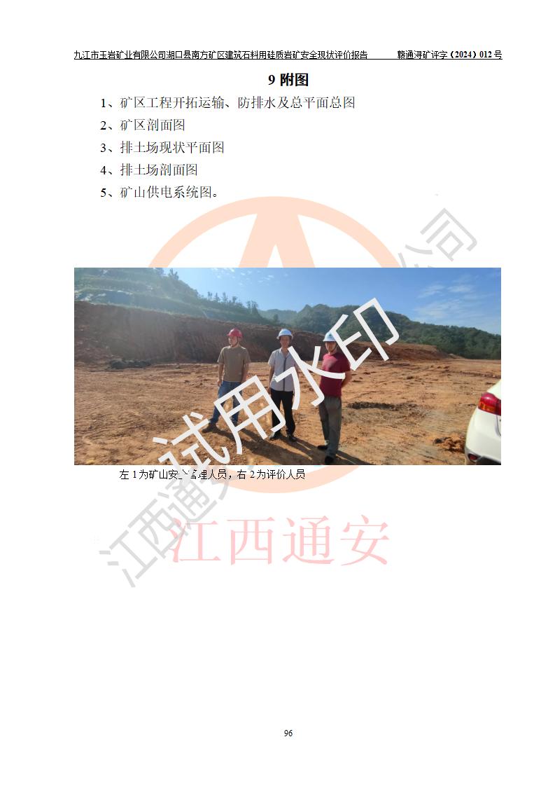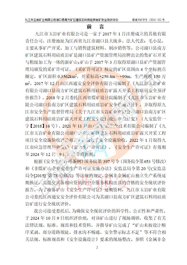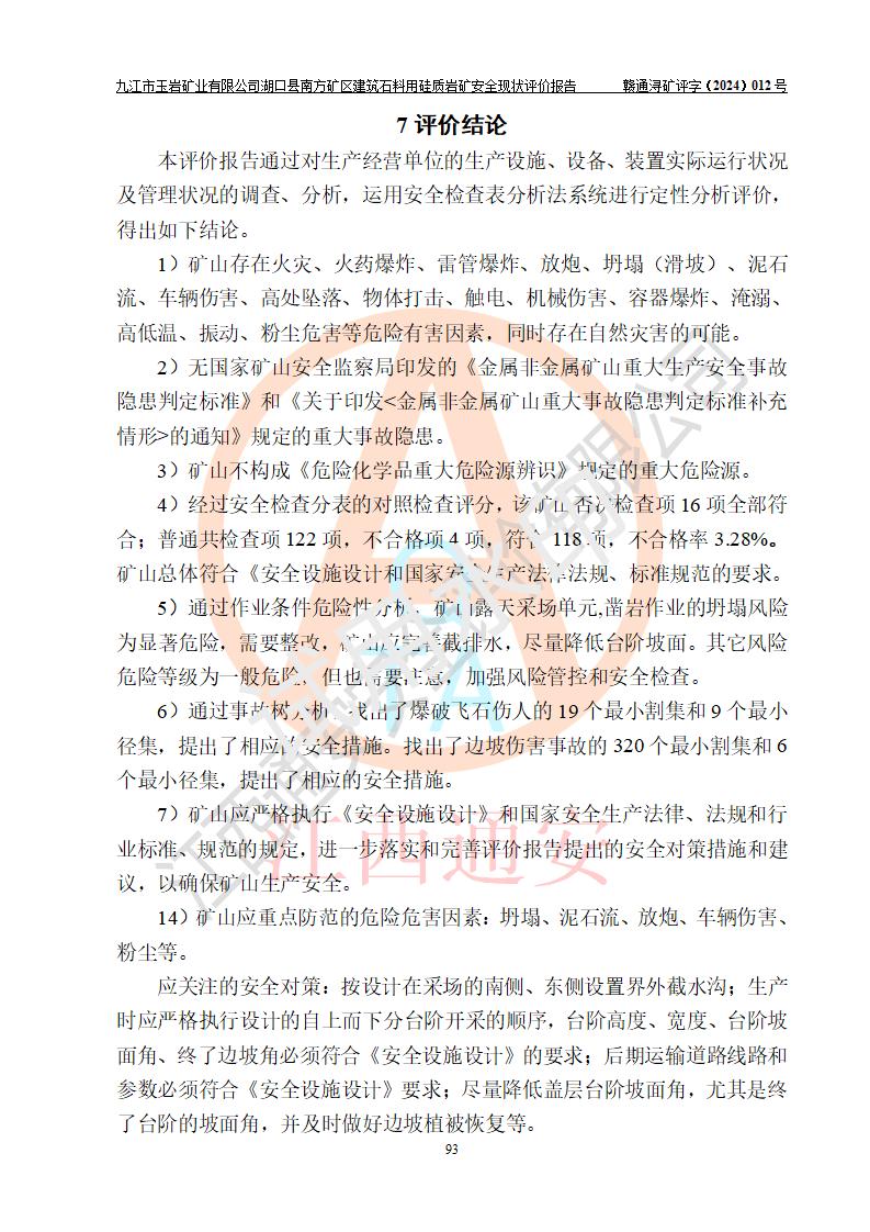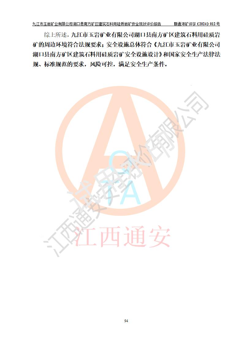 評價(jià)報(bào)告名稱 | 九江市玉巖礦業(yè)有限公司湖口縣南方礦區(qū)建筑石料用硅質(zhì)巖礦安全現(xiàn)狀評價(jià) | |||||