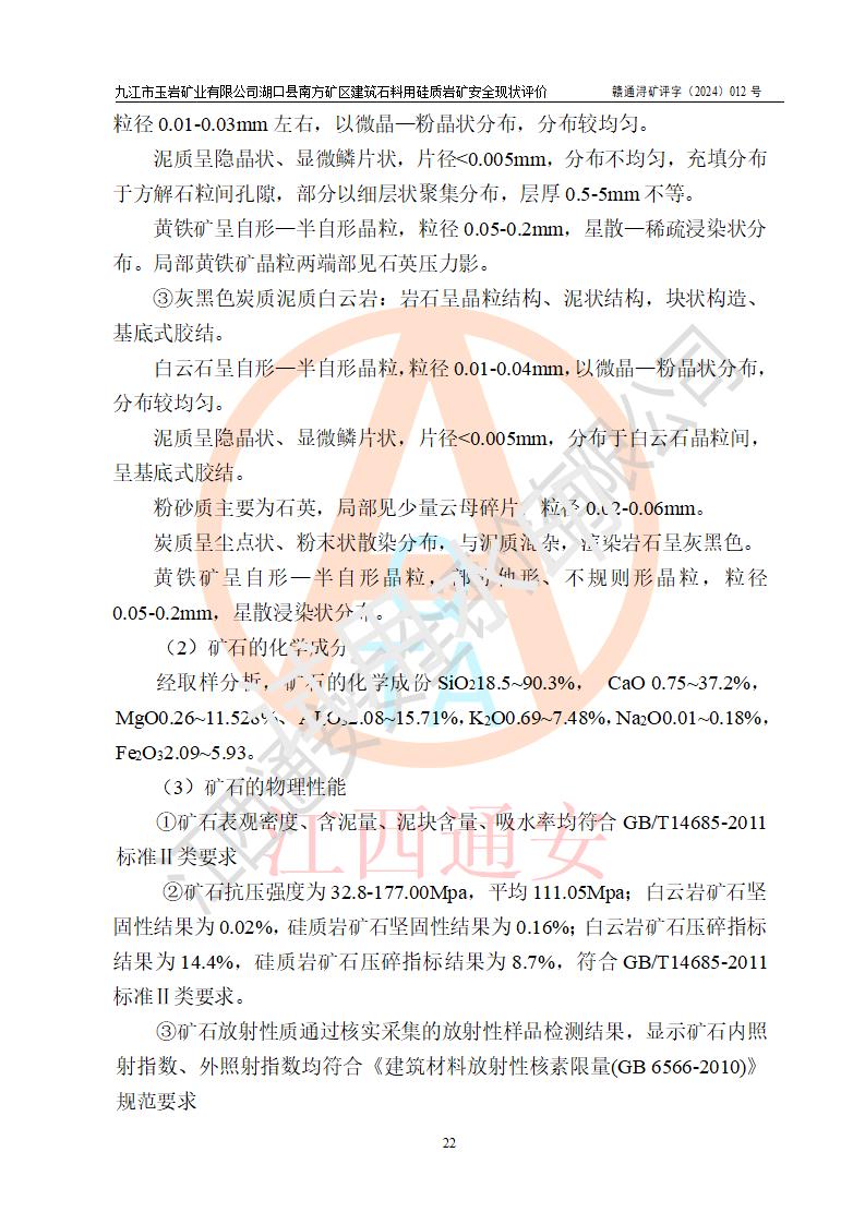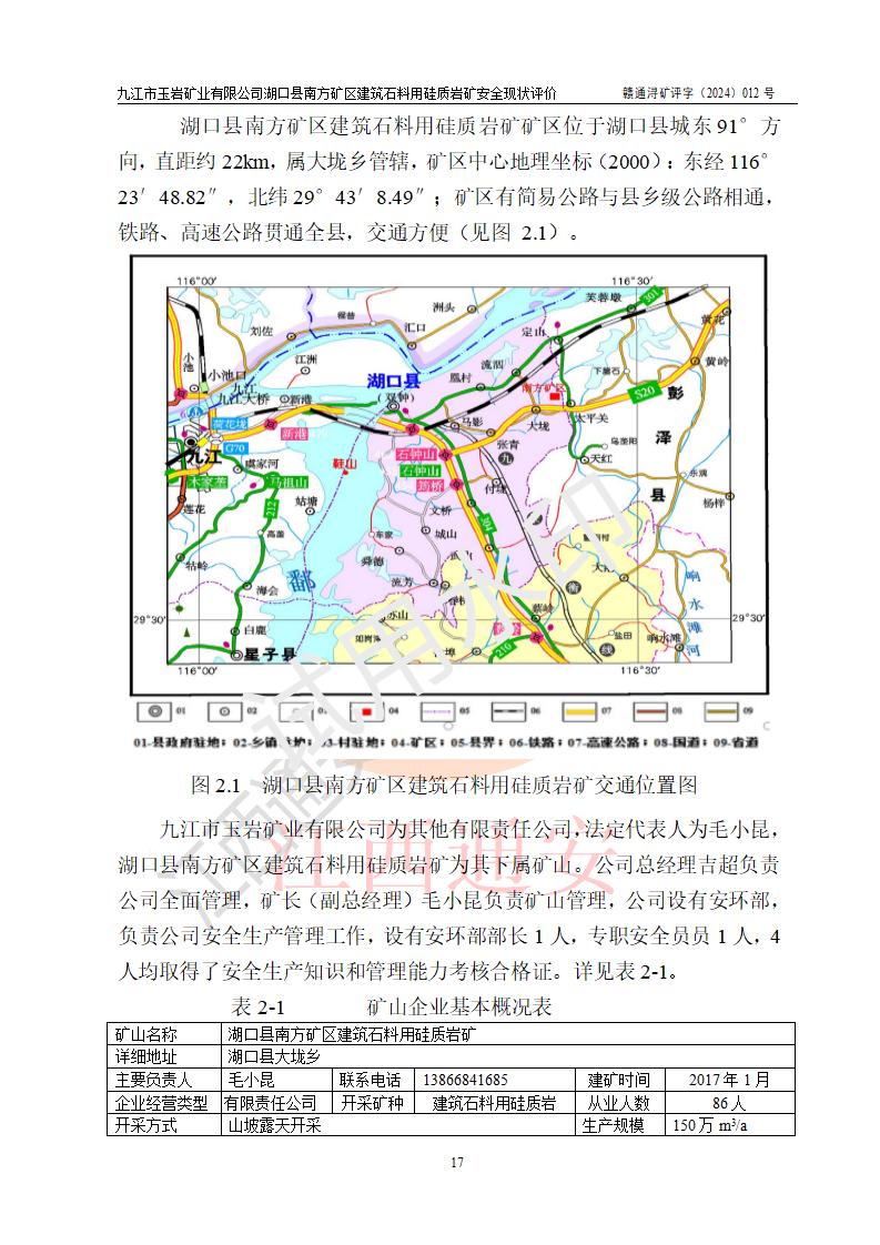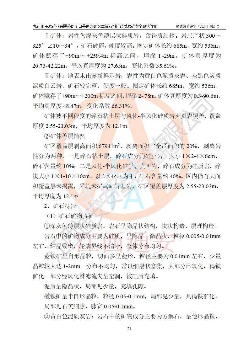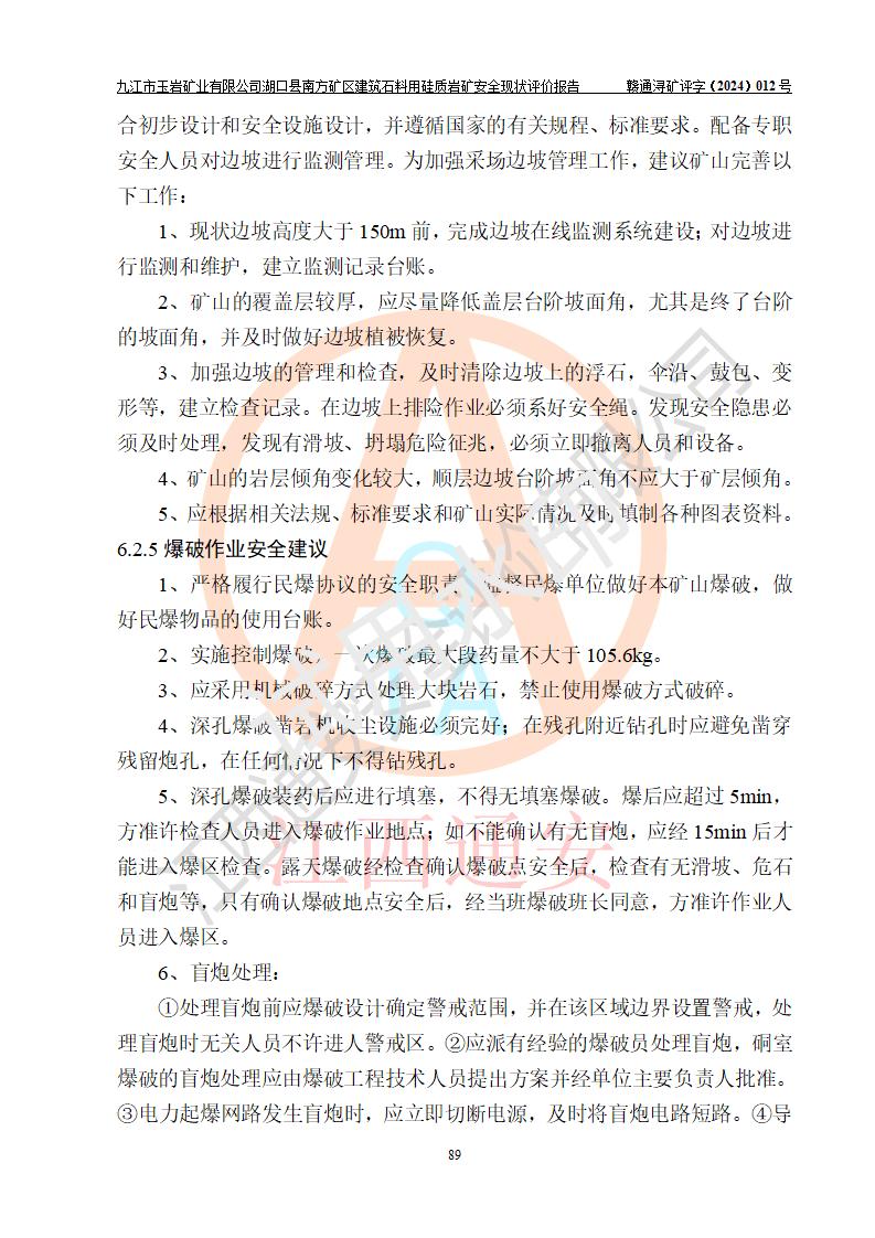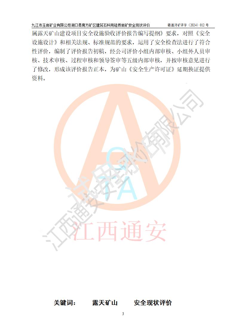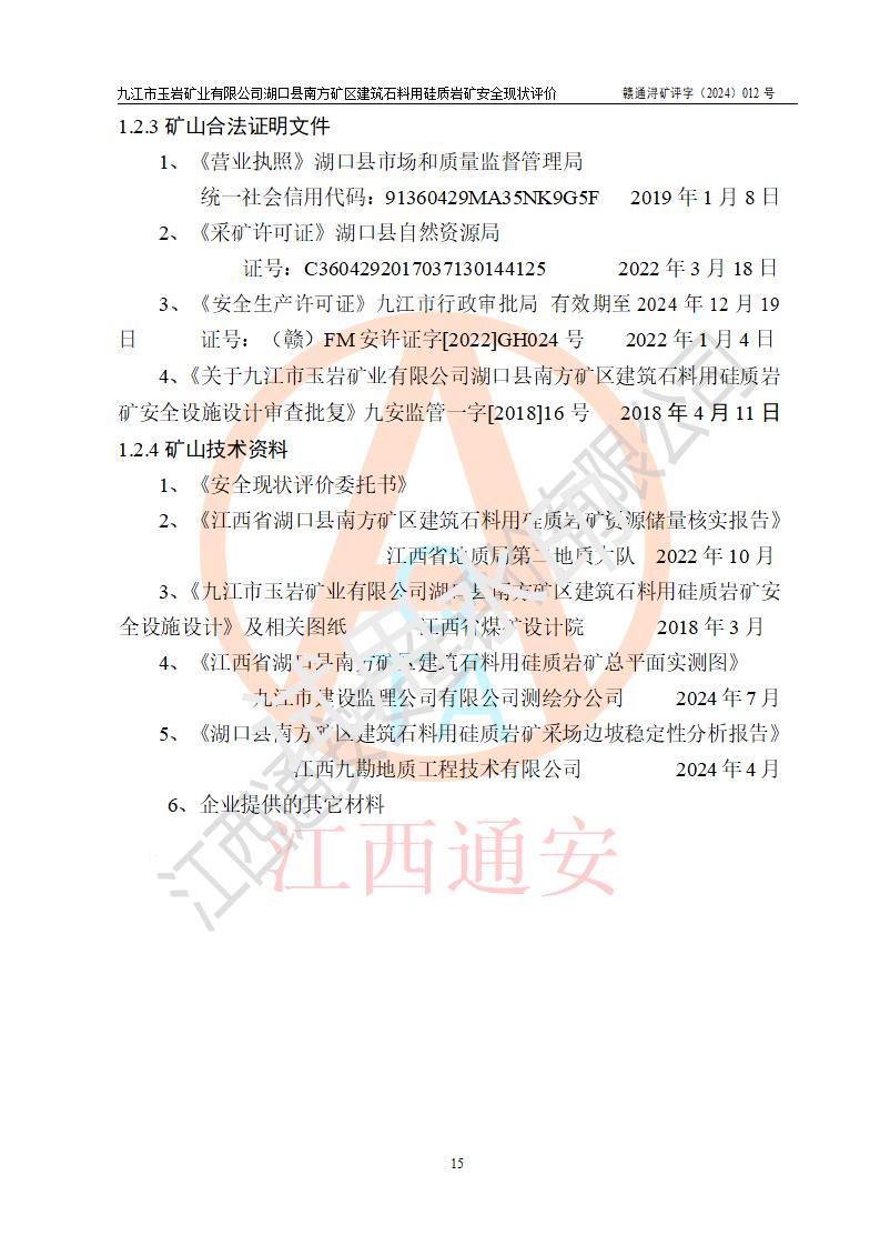 評價(jià)報(bào)告名稱 | 九江市玉巖礦業(yè)有限公司湖口縣南方礦區(qū)建筑石料用硅質(zhì)巖礦安全現(xiàn)狀評價(jià) | |||||