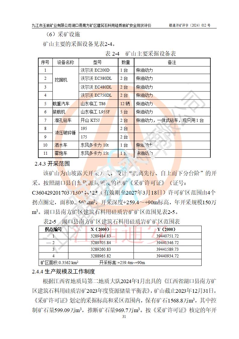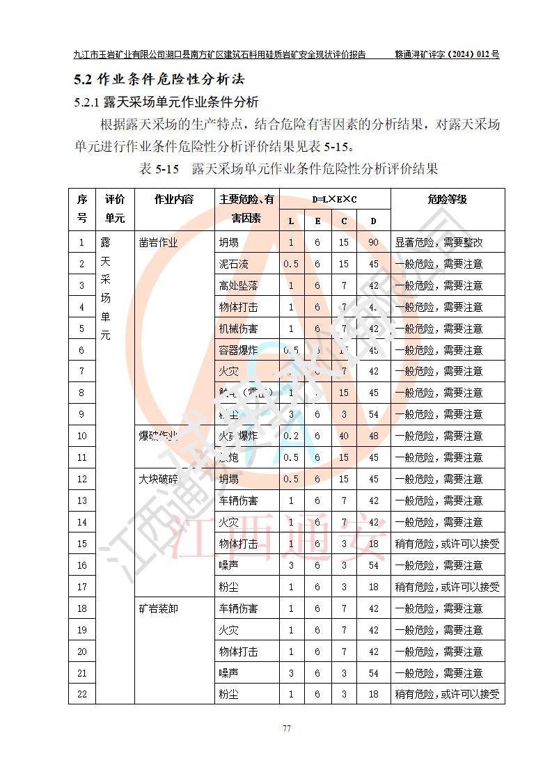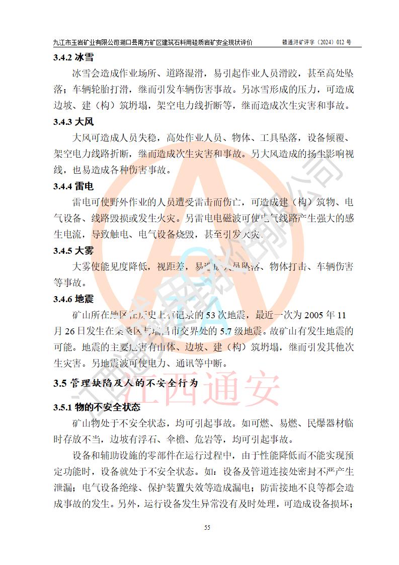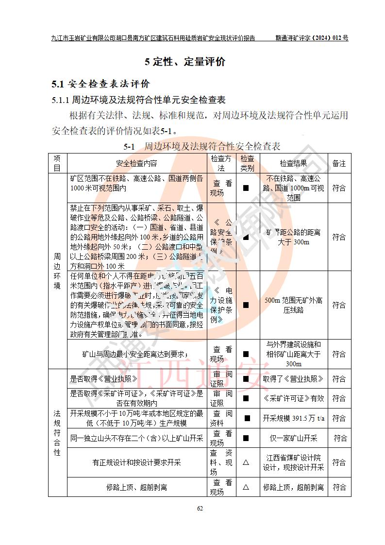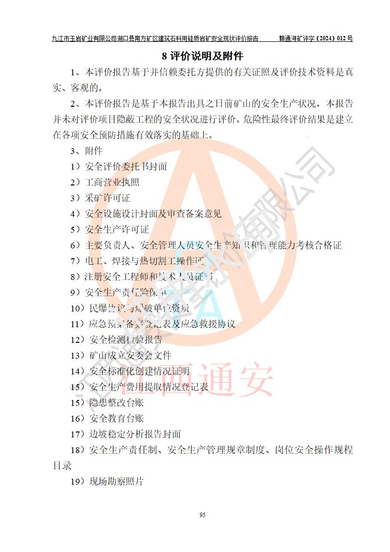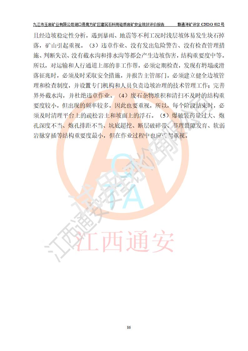 評價(jià)報(bào)告名稱 | 九江市玉巖礦業(yè)有限公司湖口縣南方礦區(qū)建筑石料用硅質(zhì)巖礦安全現(xiàn)狀評價(jià) | |||||