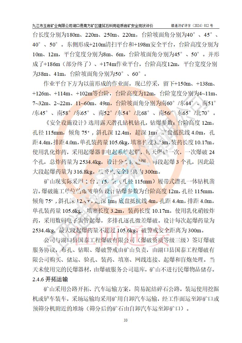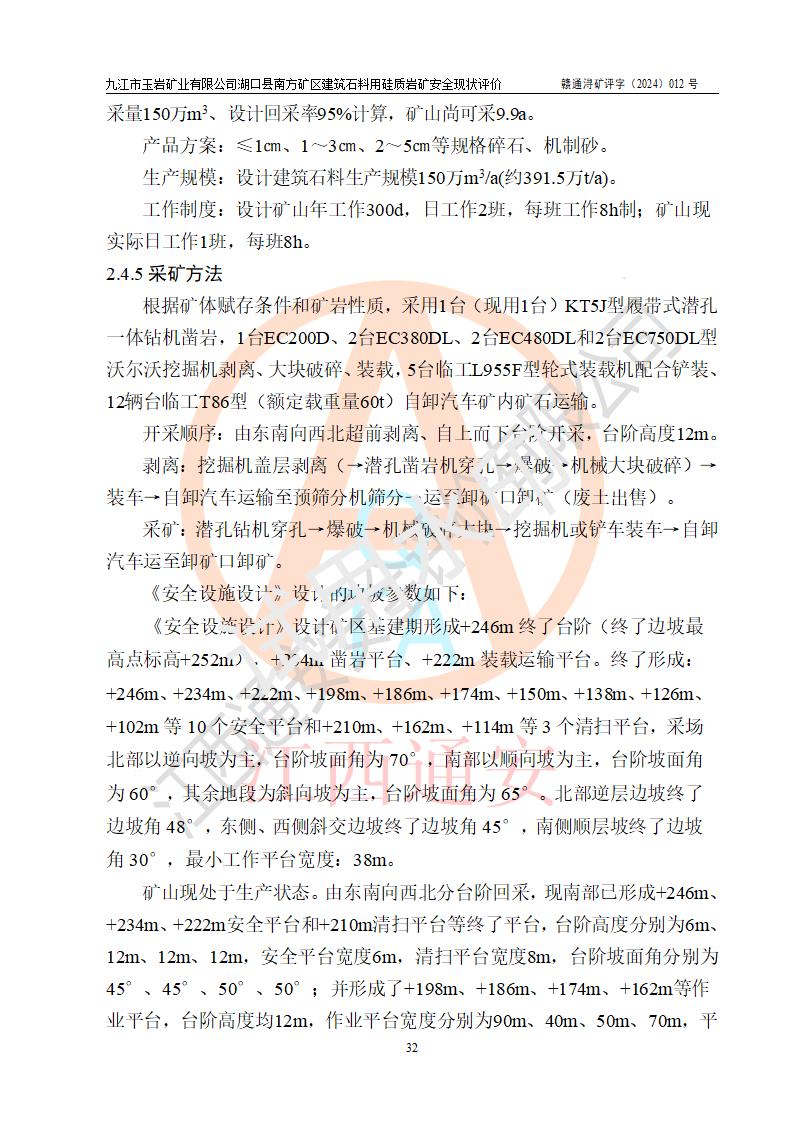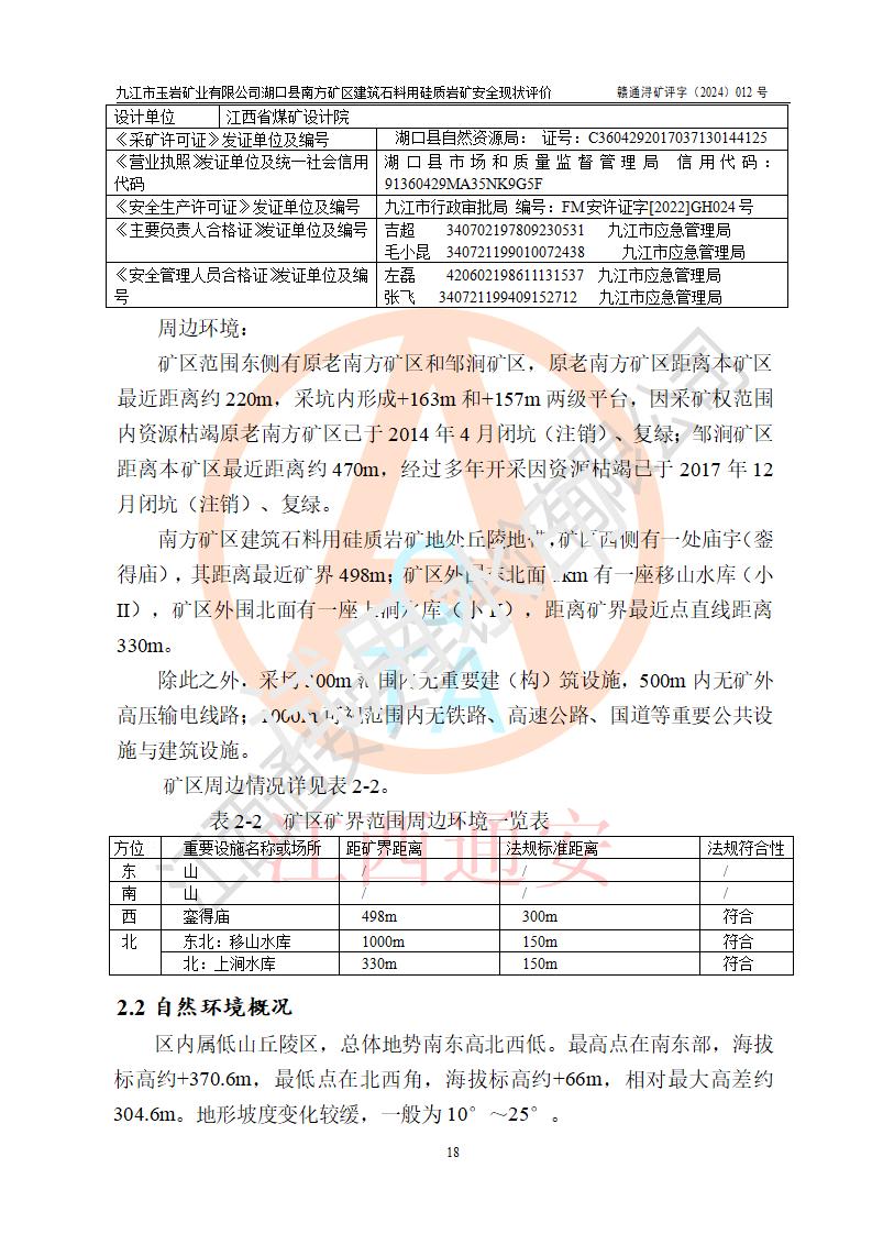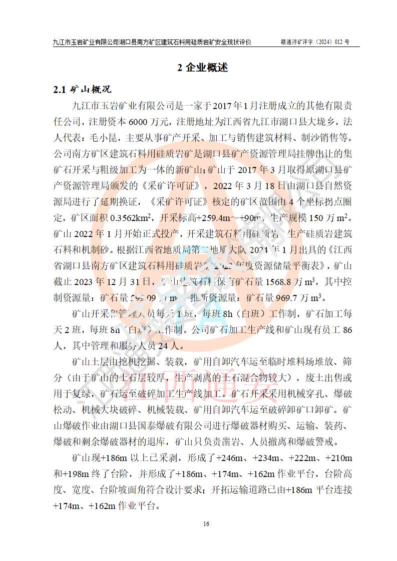 項(xiàng)目簡介 | 九江市玉巖礦業(yè)有限公司是一家于2017年1月注冊成立的其他有限責(zé)任公司,注冊地址為江西省九江市湖口縣大垅鄉(xiāng),法人**:毛小昆,主要從事礦產(chǎn)開采、加工與銷售建筑材料、制沙銷售等。公司湖口縣南方礦區(qū)建筑石料用硅質(zhì)巖礦是湖口縣礦產(chǎn)資源管理局掛牌出讓的集礦石開采與粗級加工為一體的新礦山;礦山于2017年3月取得原湖口縣礦產(chǎn)資源管理局頒發(fā)的采礦許可證,《采礦許可證》核定的礦區(qū)范圍由4個(gè)坐標(biāo)拐點(diǎn)圈定,礦區(qū)面積0.3562km2,開采標(biāo)高+259.4m~+90m,生產(chǎn)規(guī)模150萬m2。2017年12月由江西通安安全評價(jià)有限公司編制了《九江市玉巖礦業(yè)有限公司湖口縣南方礦區(qū)建筑石料用硅質(zhì)巖礦露天開采工程項(xiàng)目安全預(yù)評價(jià)報(bào)告》,2018年2月委托江西省煤礦設(shè)計(jì)院編制了《九江市玉巖礦業(yè)有限公司湖口縣南方礦區(qū)建筑石料用硅質(zhì)巖礦安全設(shè)施設(shè)計(jì)》,并取得原九江市安全生產(chǎn)監(jiān)督管理局《關(guān)于九江市玉巖礦業(yè)有限公司湖口縣南方礦區(qū)建筑石料用硅質(zhì)巖礦露天開采工程安全設(shè)施設(shè)計(jì)審查批復(fù)》(九安監(jiān)管一字【2018】16號),2021年11月由云南恒然安全技術(shù)有限公司編制了《九江市玉巖礦業(yè)有限公司湖口縣南方礦區(qū)建筑石料用硅質(zhì)巖礦露天開采工程項(xiàng)目安全設(shè)施驗(yàn)收評價(jià)報(bào)告》,通過了安全設(shè)施驗(yàn)收,2022年1月取得九江市應(yīng)急管理局頒發(fā)的《安全生產(chǎn)許可證》,《安全生產(chǎn)許可證》**期至2024年12月19日,現(xiàn)即將到期。 | |||||