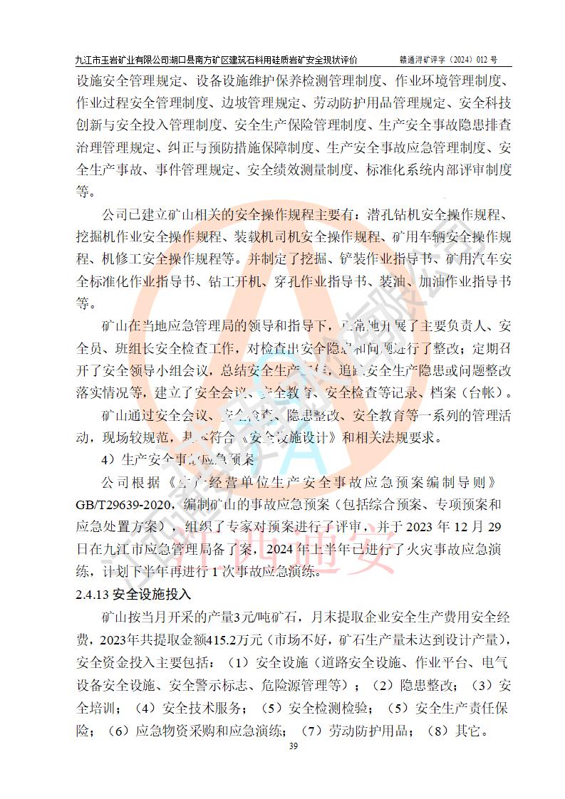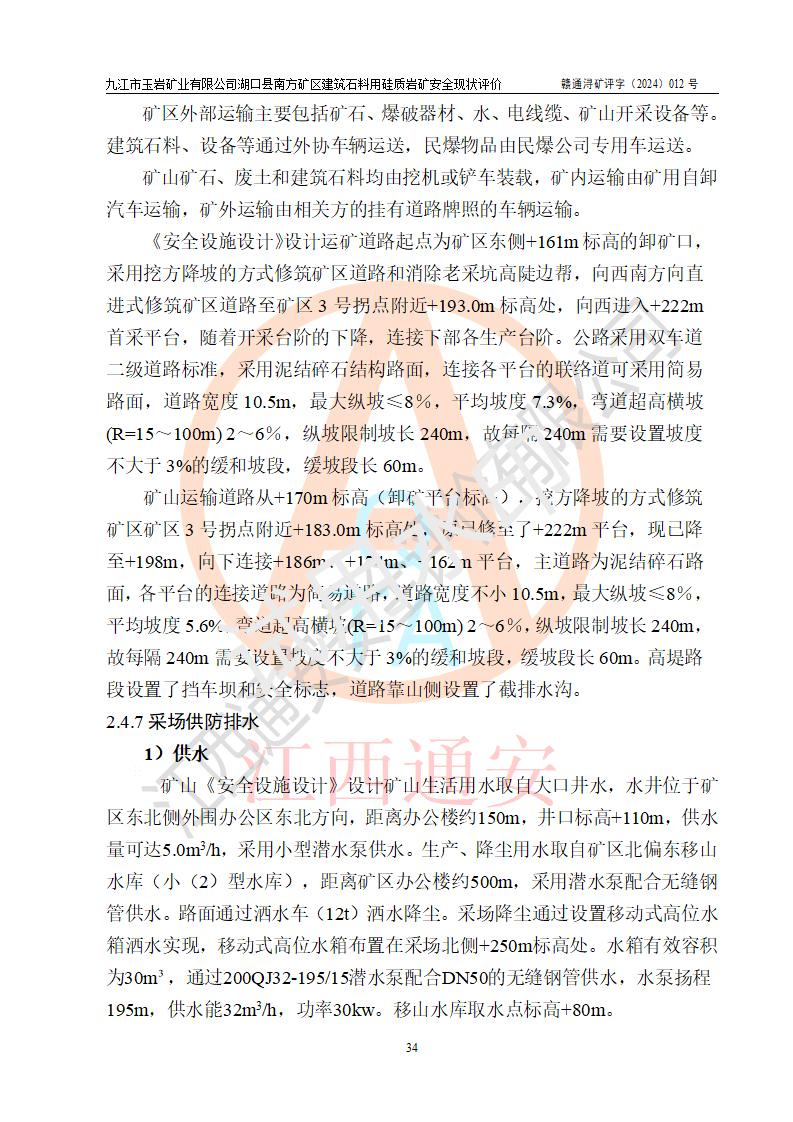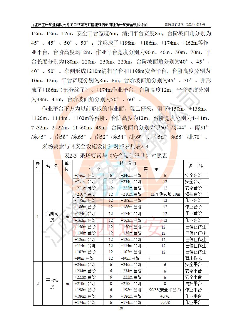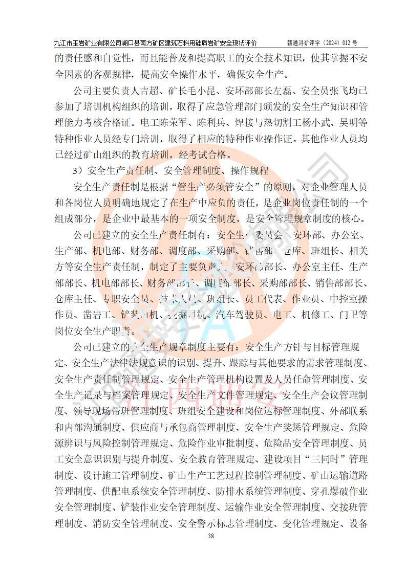 項(xiàng)目簡介 | 九江市玉巖礦業(yè)有限公司是一家于2017年1月注冊成立的其他有限責(zé)任公司,注冊地址為江西省九江市湖口縣大垅鄉(xiāng),法人**:毛小昆,主要從事礦產(chǎn)開采、加工與銷售建筑材料、制沙銷售等。公司湖口縣南方礦區(qū)建筑石料用硅質(zhì)巖礦是湖口縣礦產(chǎn)資源管理局掛牌出讓的集礦石開采與粗級加工為一體的新礦山;礦山于2017年3月取得原湖口縣礦產(chǎn)資源管理局頒發(fā)的采礦許可證,《采礦許可證》核定的礦區(qū)范圍由4個(gè)坐標(biāo)拐點(diǎn)圈定,礦區(qū)面積0.3562km2,開采標(biāo)高+259.4m~+90m,生產(chǎn)規(guī)模150萬m2。2017年12月由江西通安安全評價(jià)有限公司編制了《九江市玉巖礦業(yè)有限公司湖口縣南方礦區(qū)建筑石料用硅質(zhì)巖礦露天開采工程項(xiàng)目安全預(yù)評價(jià)報(bào)告》,2018年2月委托江西省煤礦設(shè)計(jì)院編制了《九江市玉巖礦業(yè)有限公司湖口縣南方礦區(qū)建筑石料用硅質(zhì)巖礦安全設(shè)施設(shè)計(jì)》,并取得原九江市安全生產(chǎn)監(jiān)督管理局《關(guān)于九江市玉巖礦業(yè)有限公司湖口縣南方礦區(qū)建筑石料用硅質(zhì)巖礦露天開采工程安全設(shè)施設(shè)計(jì)審查批復(fù)》(九安監(jiān)管一字【2018】16號),2021年11月由云南恒然安全技術(shù)有限公司編制了《九江市玉巖礦業(yè)有限公司湖口縣南方礦區(qū)建筑石料用硅質(zhì)巖礦露天開采工程項(xiàng)目安全設(shè)施驗(yàn)收評價(jià)報(bào)告》,通過了安全設(shè)施驗(yàn)收,2022年1月取得九江市應(yīng)急管理局頒發(fā)的《安全生產(chǎn)許可證》,《安全生產(chǎn)許可證》**期至2024年12月19日,現(xiàn)即將到期。 | |||||