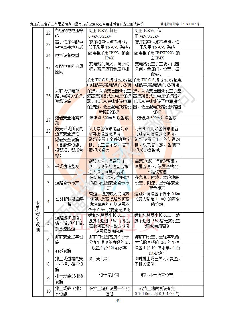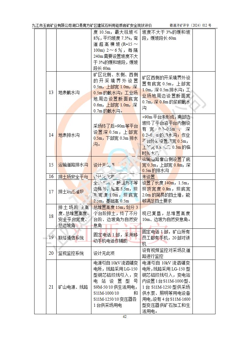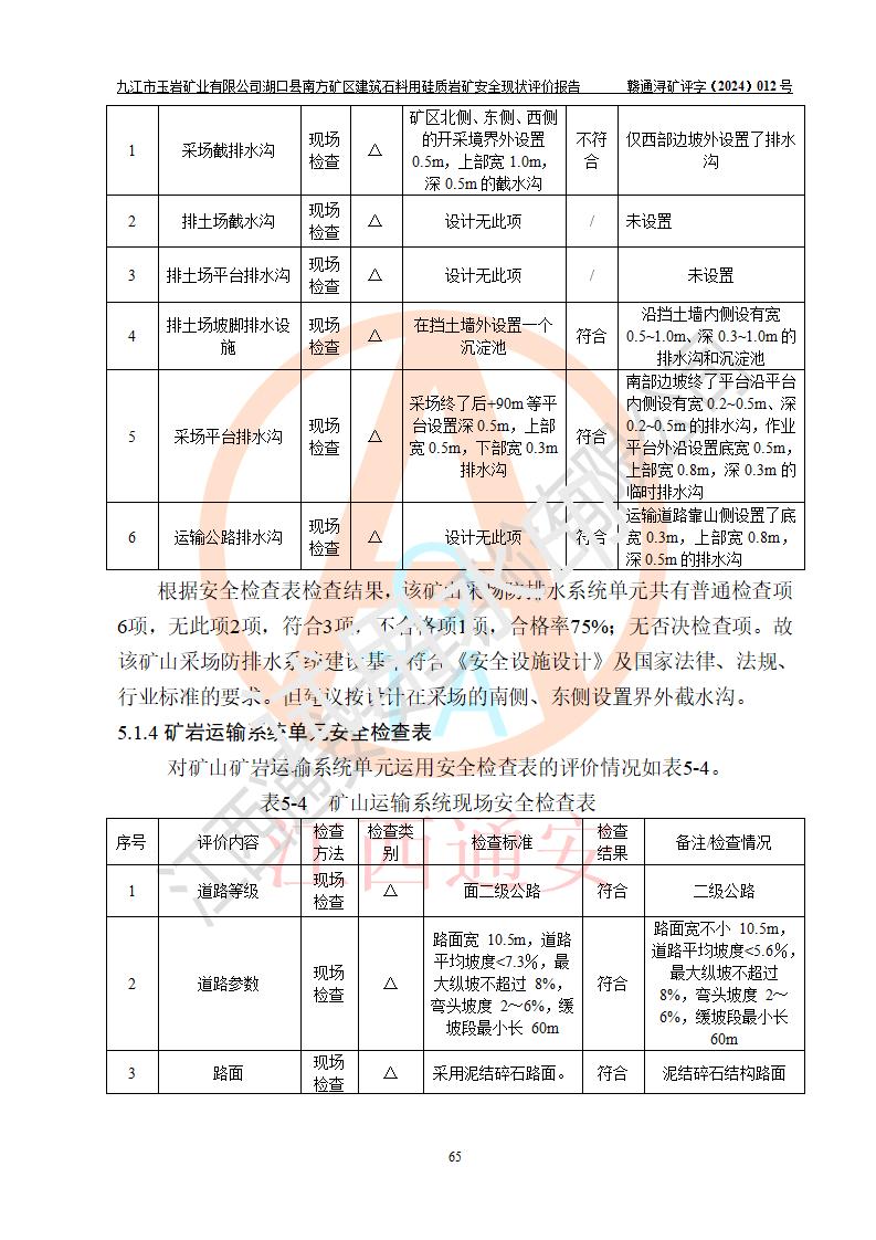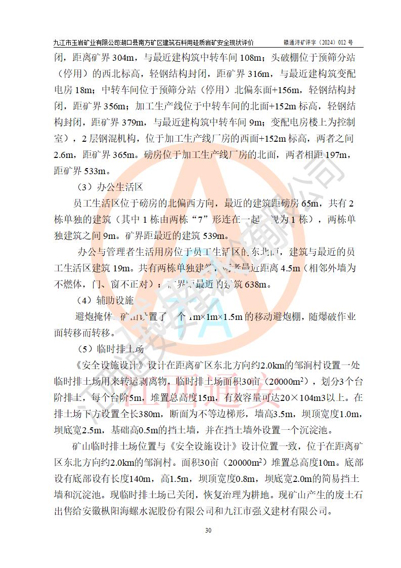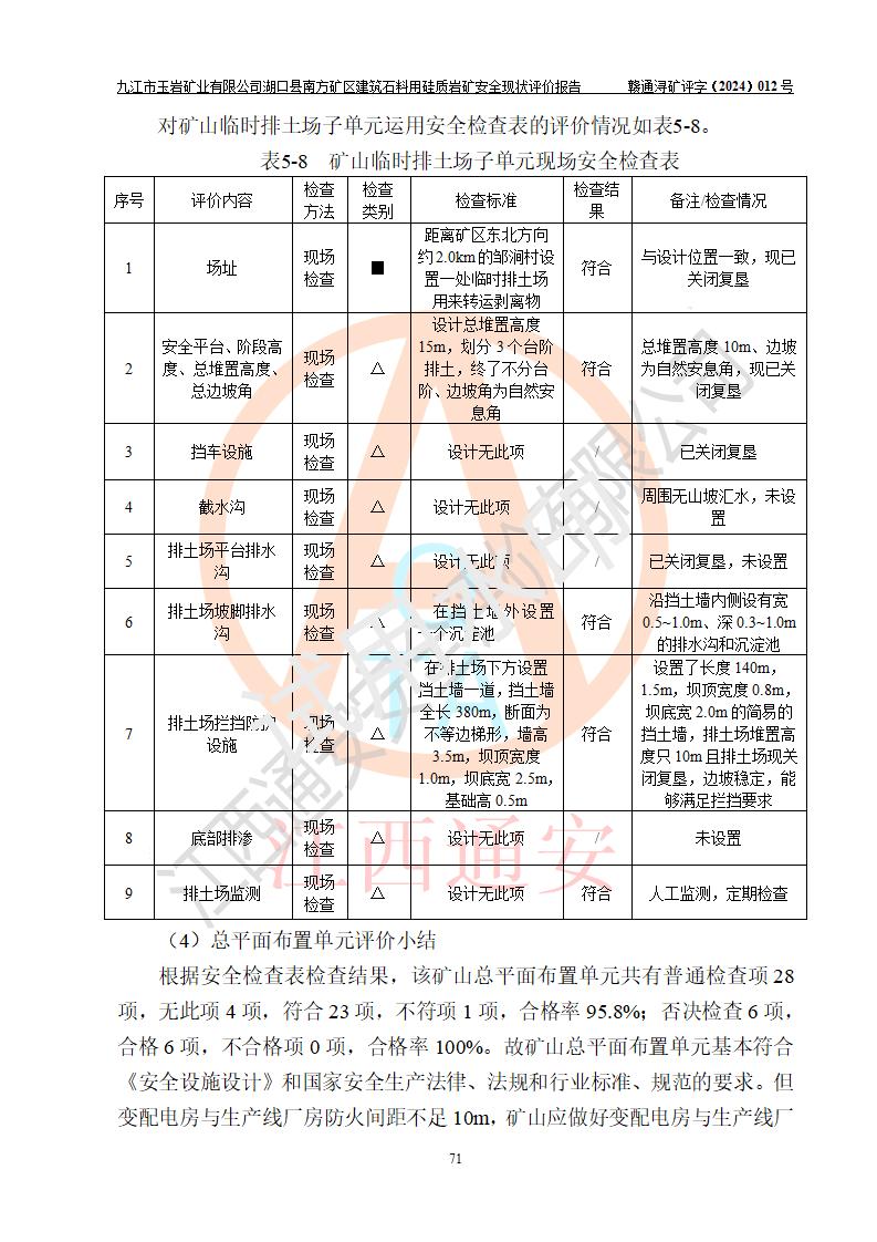 評價(jià)結(jié)論 | 總體結(jié)論:九江市玉巖礦業(yè)有限公司湖口縣南方礦區(qū)建筑石料用硅質(zhì)巖礦的周邊環(huán)境符合法規(guī)要求;安全設(shè)施總體符合《九江市玉巖礦業(yè)有限公司湖口縣南方礦區(qū)建筑石料用硅質(zhì)巖礦安全設(shè)施設(shè)計(jì)》和**安全生產(chǎn)法律法規(guī)、標(biāo)準(zhǔn)規(guī)范的要求,風(fēng)險(xiǎn)可控,滿足安全生產(chǎn)條件。 | |||||