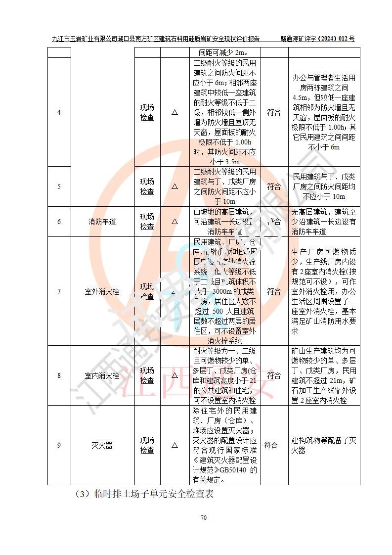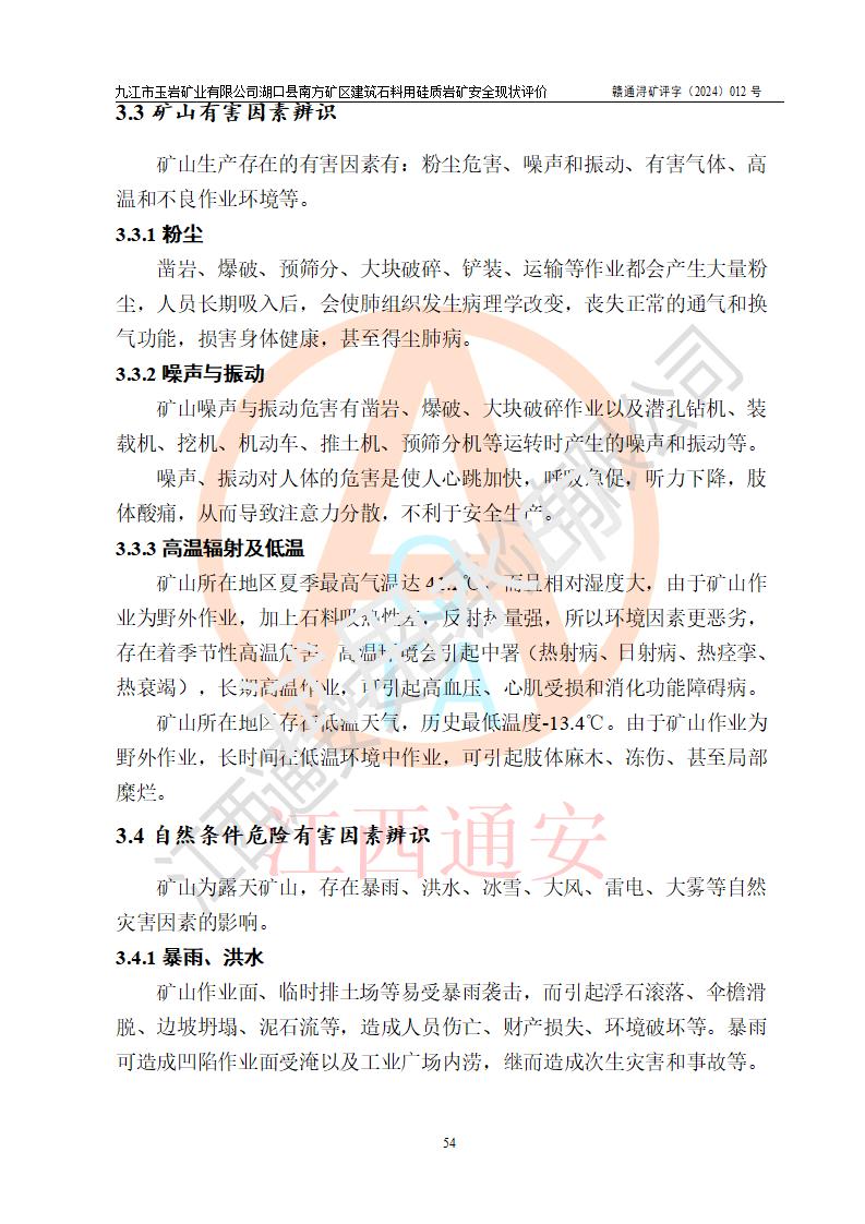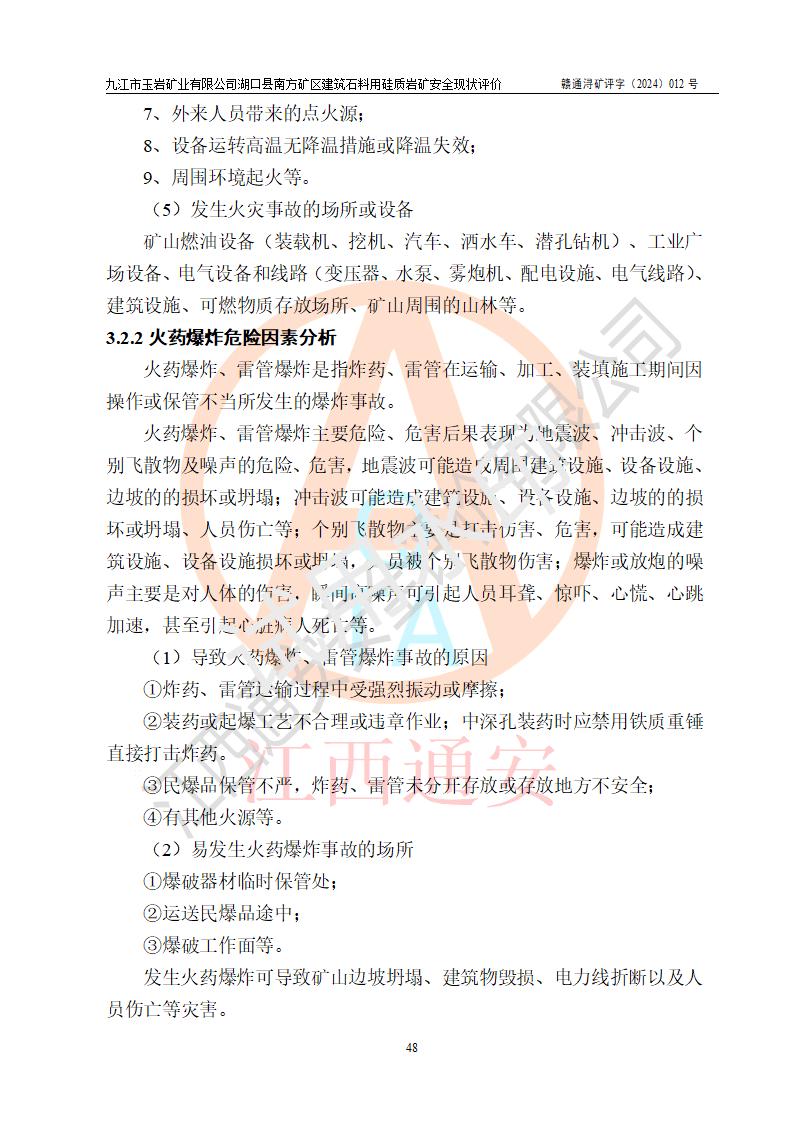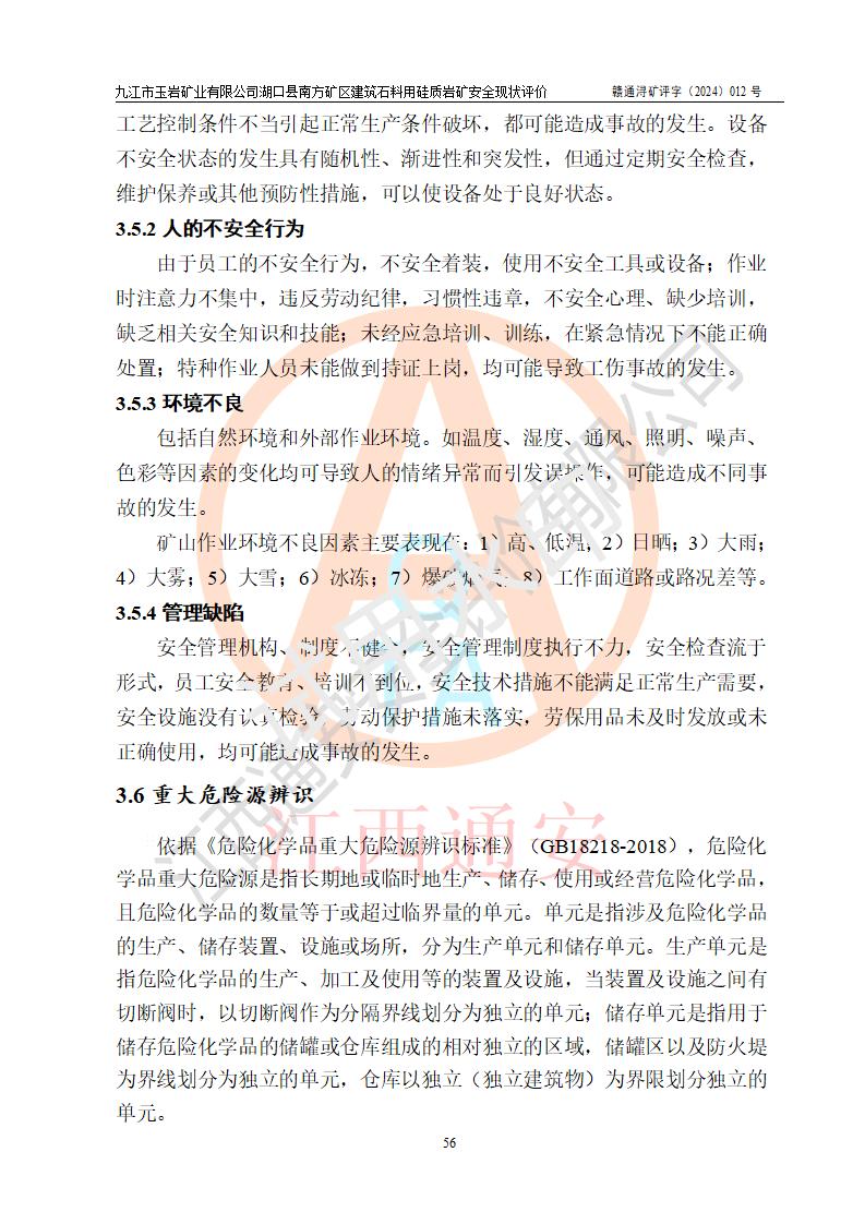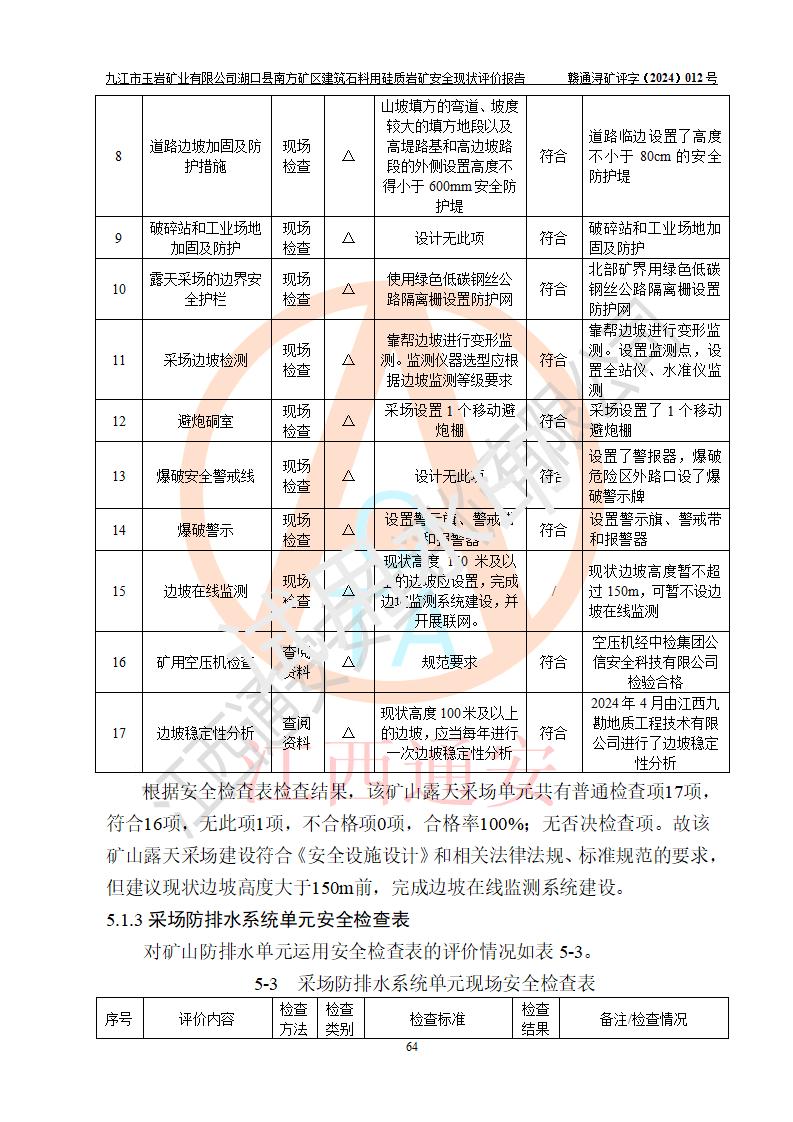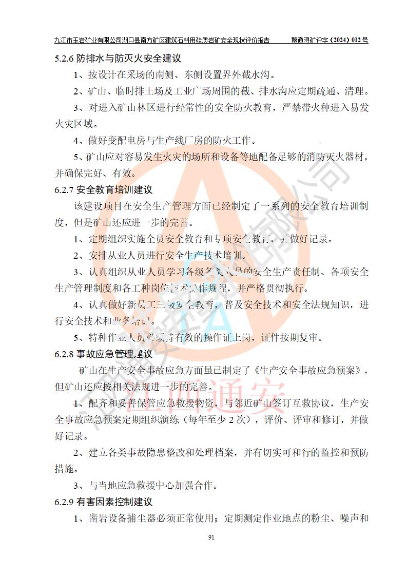 評價(jià)結(jié)論 | 總體結(jié)論:九江市玉巖礦業(yè)有限公司湖口縣南方礦區(qū)建筑石料用硅質(zhì)巖礦的周邊環(huán)境符合法規(guī)要求;安全設(shè)施總體符合《九江市玉巖礦業(yè)有限公司湖口縣南方礦區(qū)建筑石料用硅質(zhì)巖礦安全設(shè)施設(shè)計(jì)》和**安全生產(chǎn)法律法規(guī)、標(biāo)準(zhǔn)規(guī)范的要求,風(fēng)險(xiǎn)可控,滿足安全生產(chǎn)條件。 | |||||