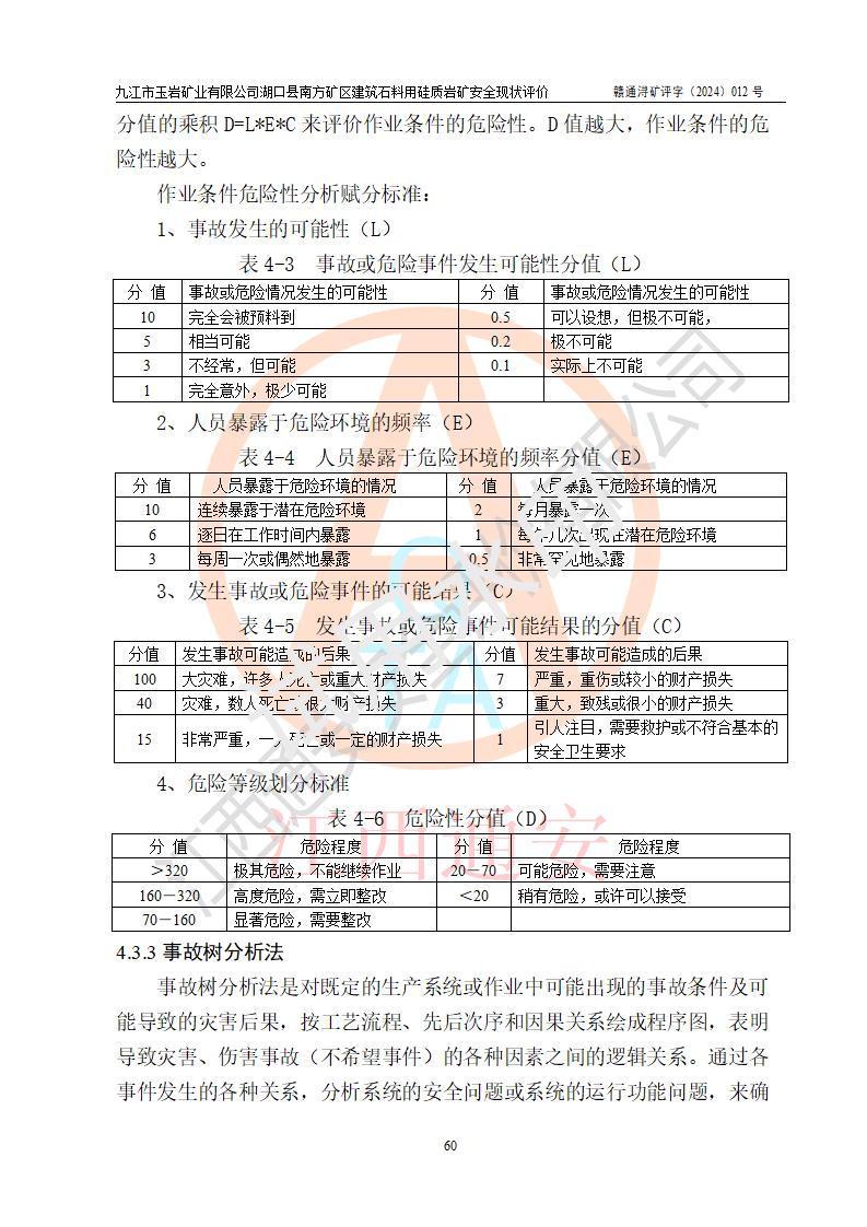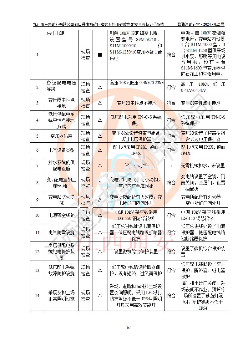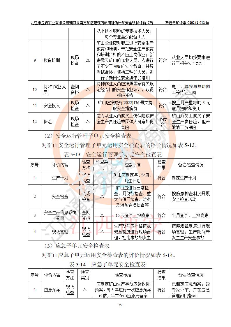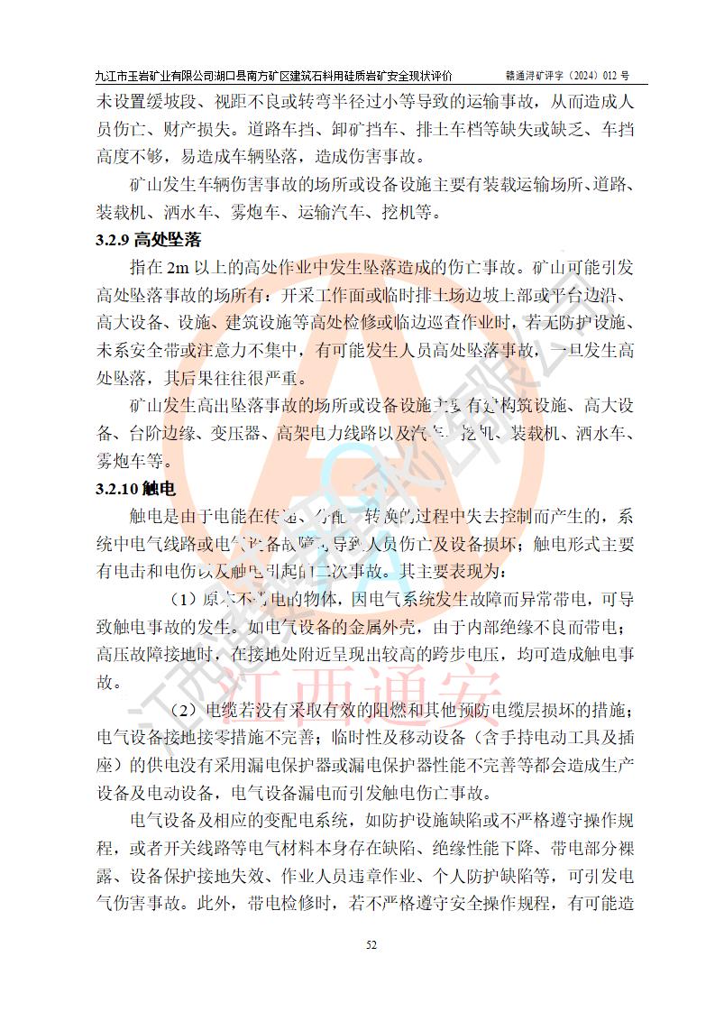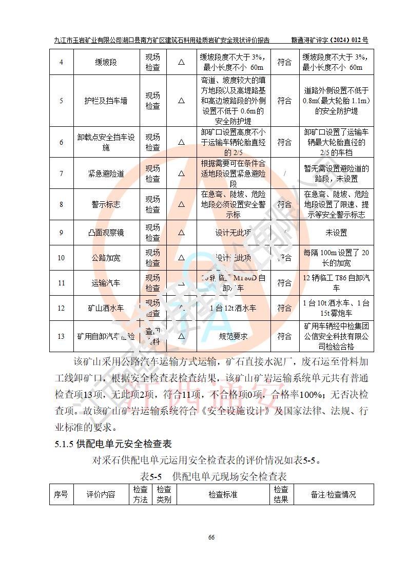 評價(jià)結(jié)論 | 總體結(jié)論:九江市玉巖礦業(yè)有限公司湖口縣南方礦區(qū)建筑石料用硅質(zhì)巖礦的周邊環(huán)境符合法規(guī)要求;安全設(shè)施總體符合《九江市玉巖礦業(yè)有限公司湖口縣南方礦區(qū)建筑石料用硅質(zhì)巖礦安全設(shè)施設(shè)計(jì)》和**安全生產(chǎn)法律法規(guī)、標(biāo)準(zhǔn)規(guī)范的要求,風(fēng)險(xiǎn)可控,滿足安全生產(chǎn)條件。 | |||||