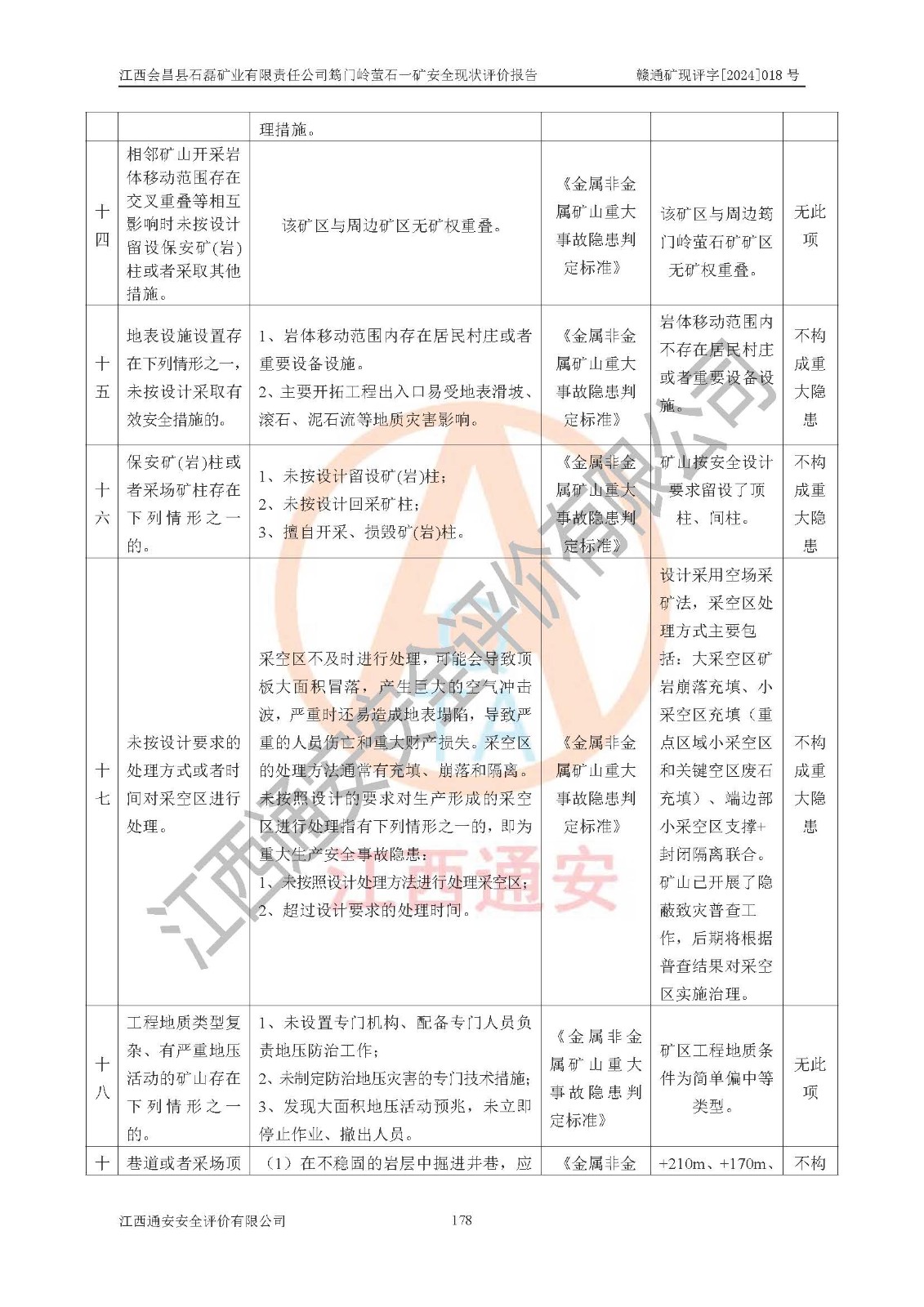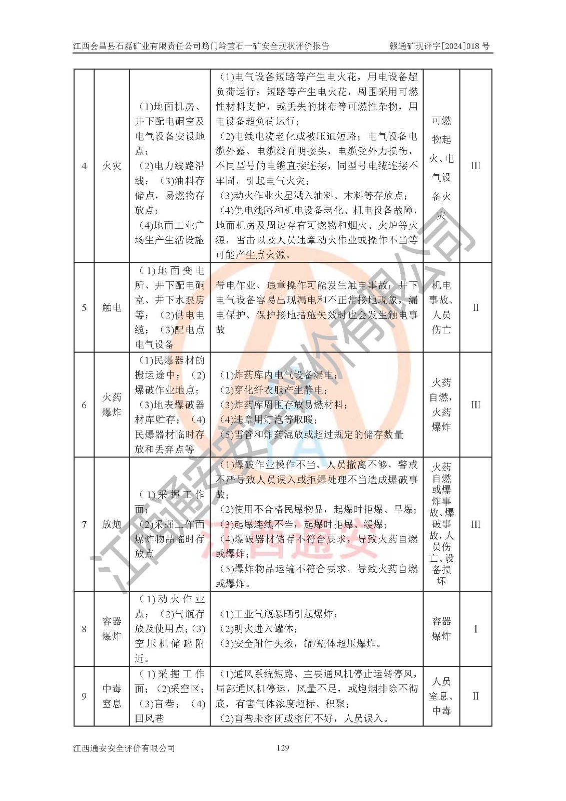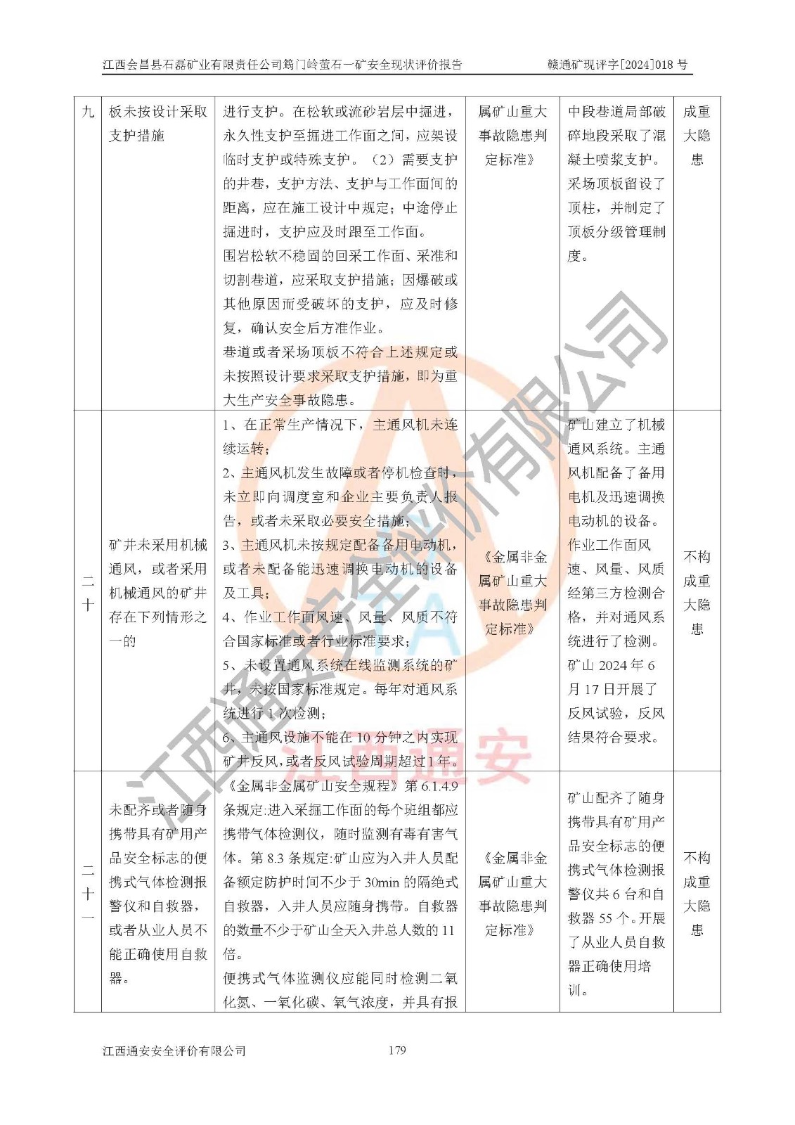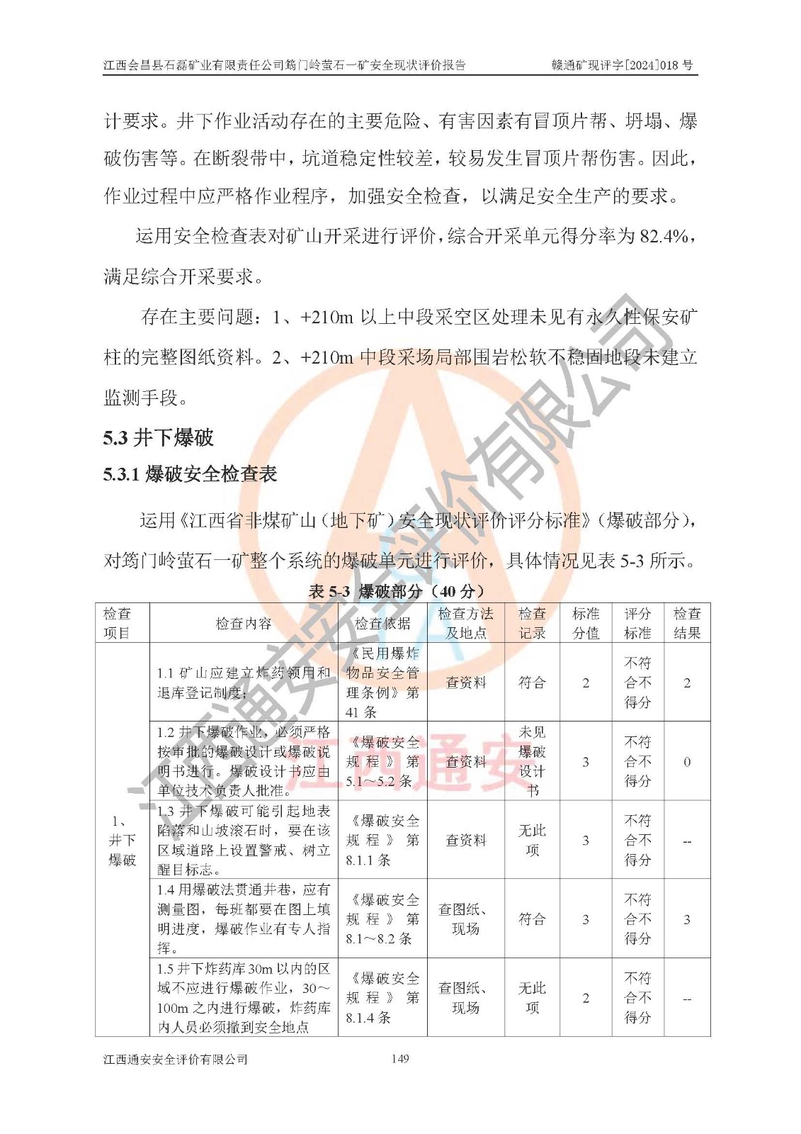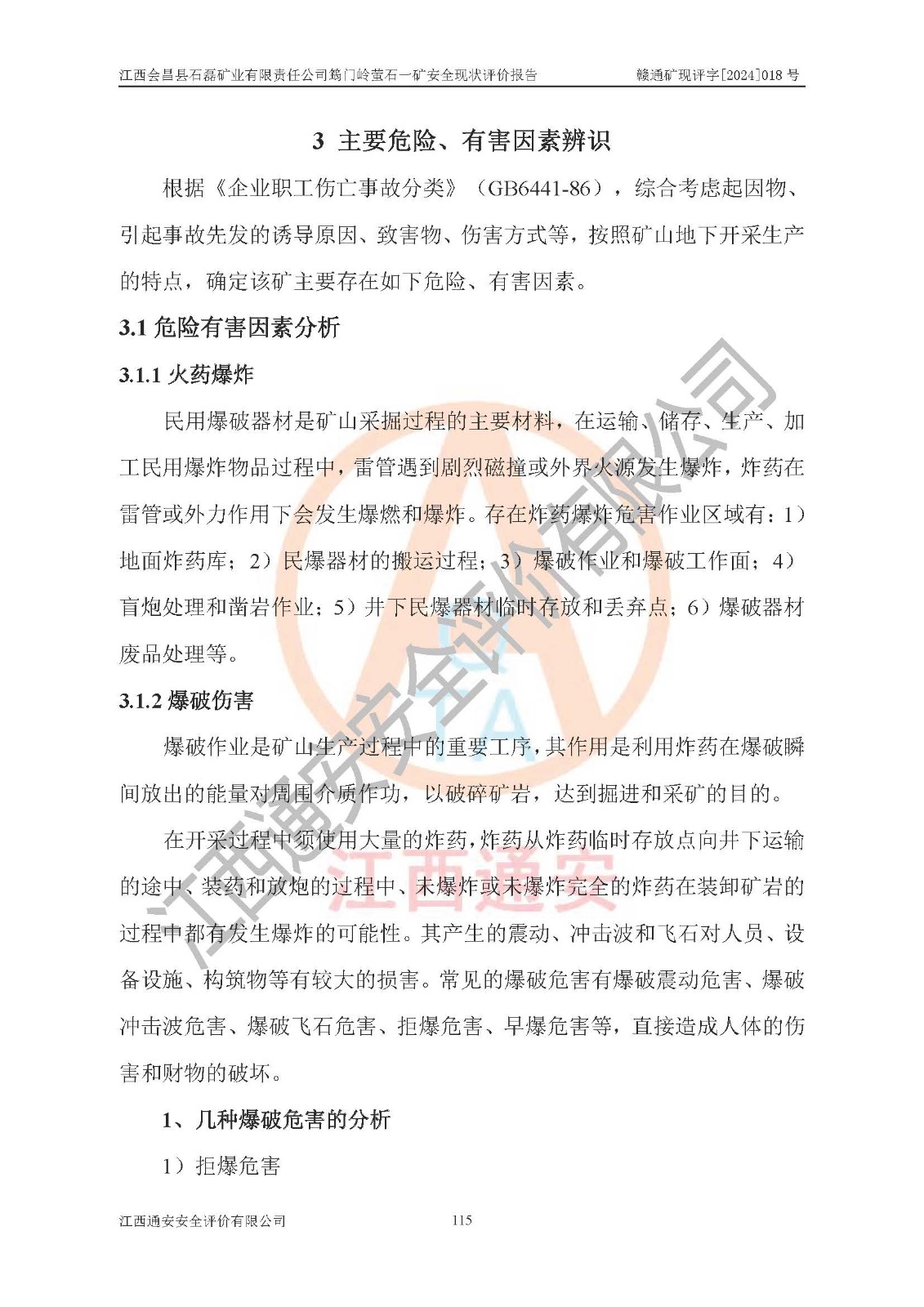 其它 | 該評價項目中存在的主要危險有害因素有火藥爆炸、爆破傷害、觸電、冒頂片幫、坍塌、機械傷害、高處墜落、物體打擊、火災、透水、中毒和窒息等16類危險有害因素,其中火藥爆炸、爆破傷害、冒頂片幫、中毒和窒息等成為可能導致重大事故發(fā)生的重大危險、有害因素;觸電、高處墜落、機械傷害等有引事故的可能性。 江西會昌縣石磊礦業(yè)有限責任公司筠門嶺螢石一礦設(shè)備、設(shè)施和場所符合**安全生產(chǎn)有關(guān)法律、法規(guī)、標準及規(guī)范的規(guī)定。礦山采用斜坡道開拓方式,安全生產(chǎn)條件較好;安全管理能滿足法規(guī)要求,礦山地下開采符合**規(guī)定的安全生產(chǎn)條件。 | ||||