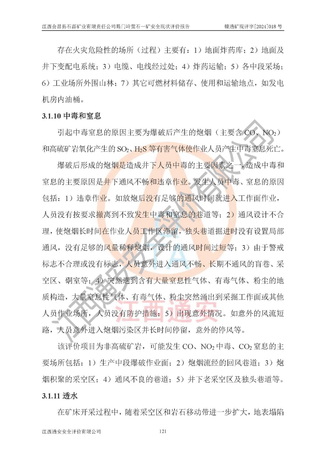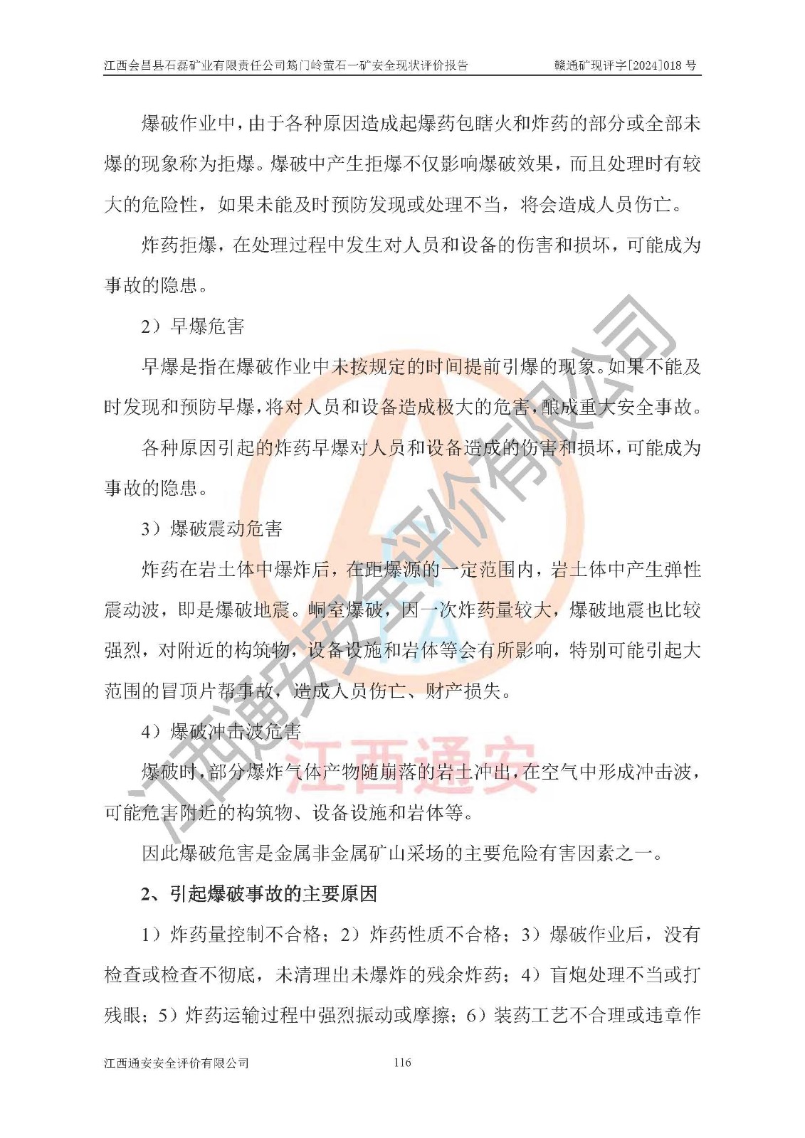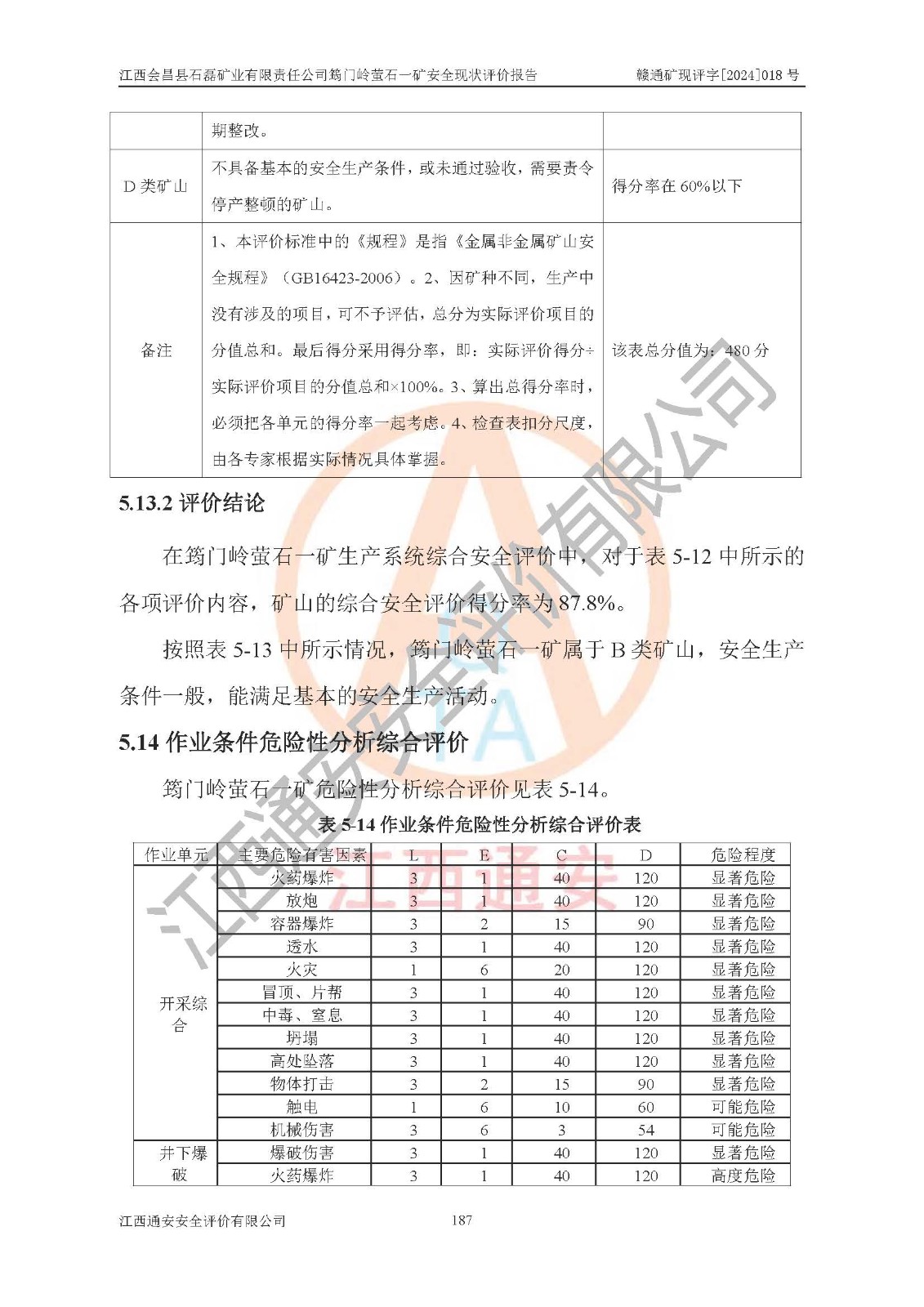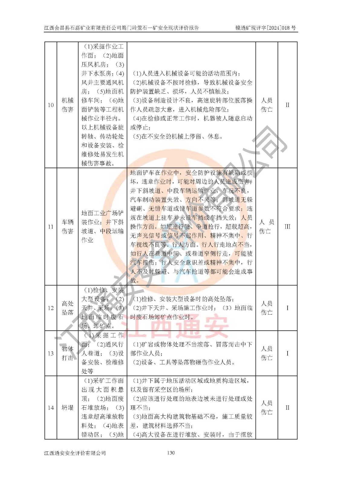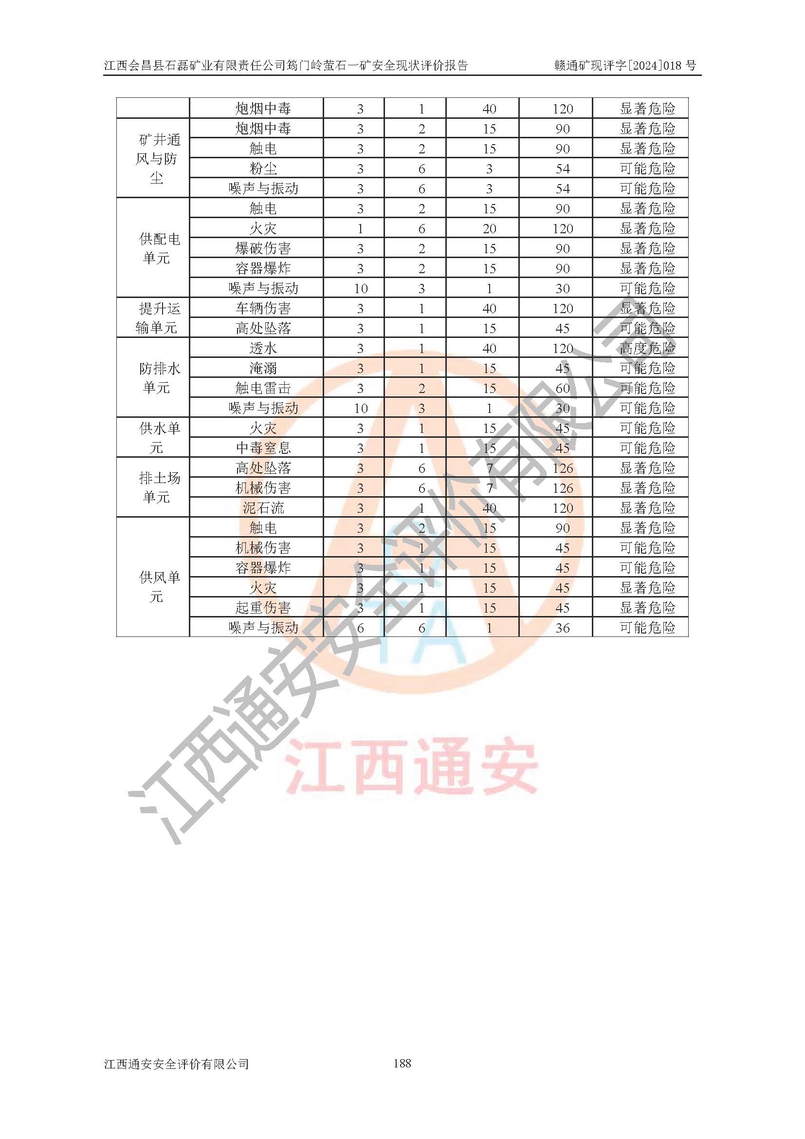 其它 | 該評價項目中存在的主要危險有害因素有火藥爆炸、爆破傷害、觸電、冒頂片幫、坍塌、機械傷害、高處墜落、物體打擊、火災、透水、中毒和窒息等16類危險有害因素,其中火藥爆炸、爆破傷害、冒頂片幫、中毒和窒息等成為可能導致重大事故發(fā)生的重大危險、有害因素;觸電、高處墜落、機械傷害等有引事故的可能性。 江西會昌縣石磊礦業(yè)有限責任公司筠門嶺螢石一礦設(shè)備、設(shè)施和場所符合**安全生產(chǎn)有關(guān)法律、法規(guī)、標準及規(guī)范的規(guī)定。礦山采用斜坡道開拓方式,安全生產(chǎn)條件較好;安全管理能滿足法規(guī)要求,礦山地下開采符合**規(guī)定的安全生產(chǎn)條件。 | ||||