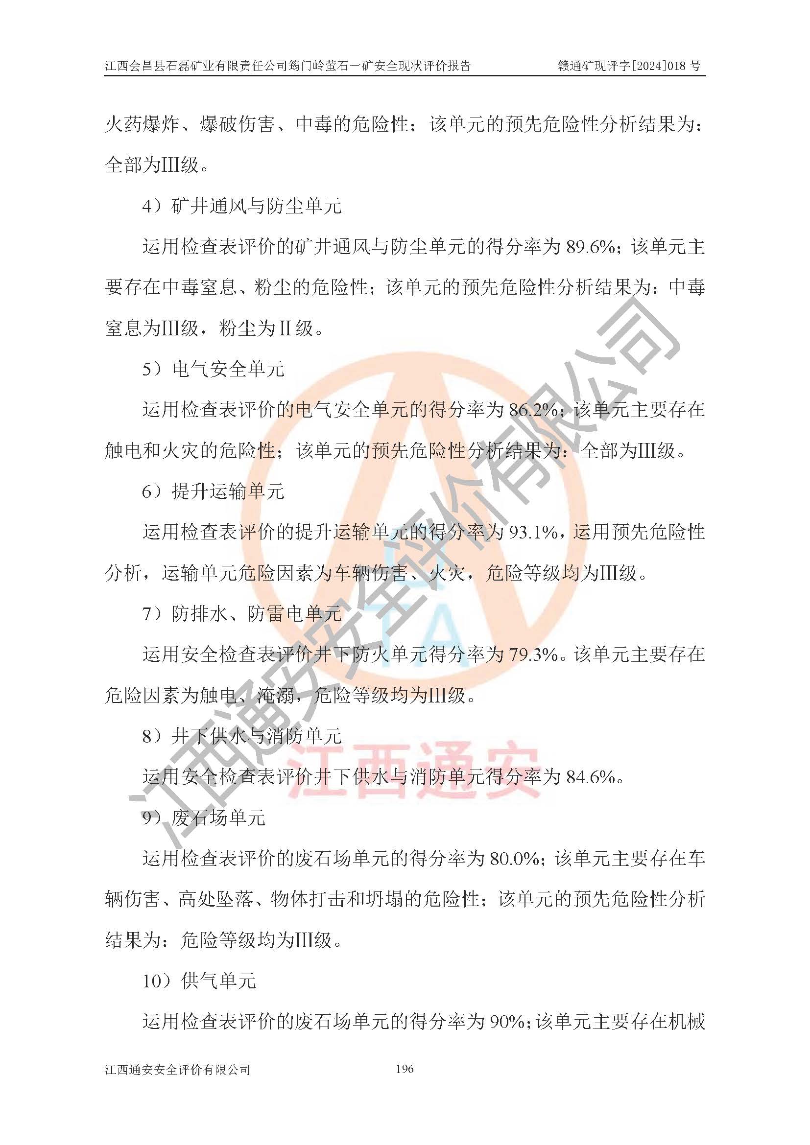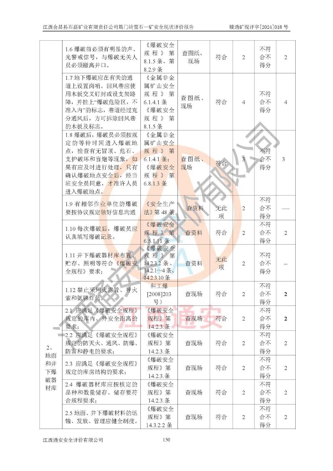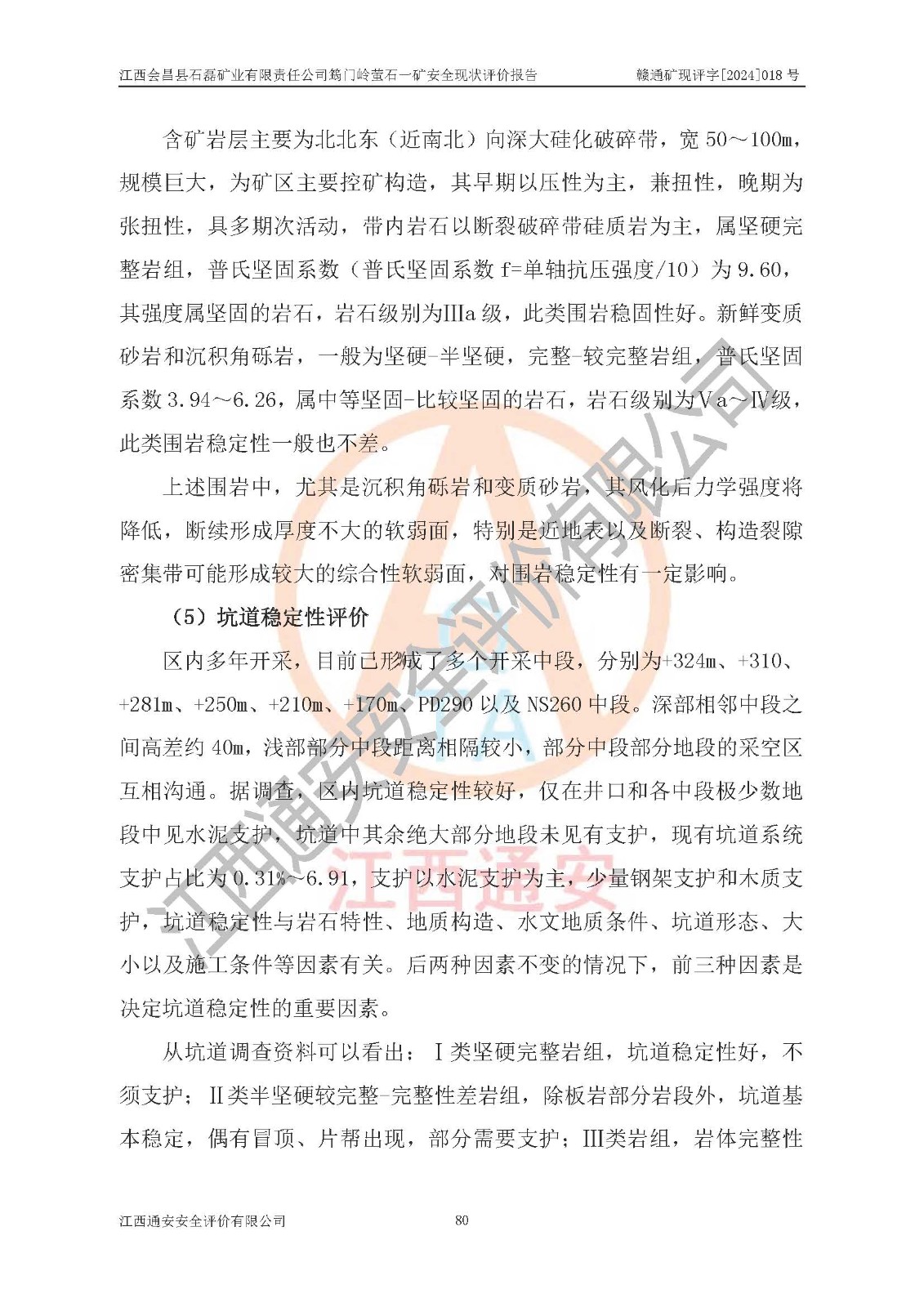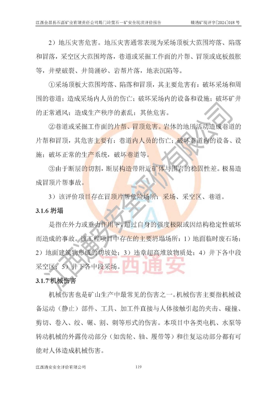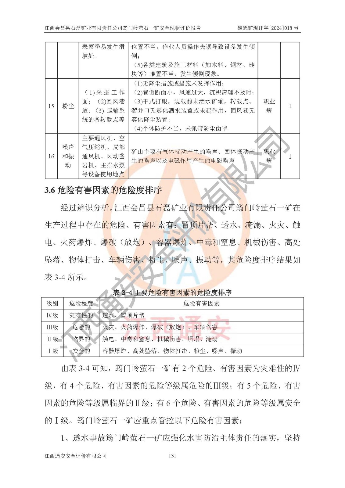 其它 | 該評價項目中存在的主要危險有害因素有火藥爆炸、爆破傷害、觸電、冒頂片幫、坍塌、機械傷害、高處墜落、物體打擊、火災、透水、中毒和窒息等16類危險有害因素,其中火藥爆炸、爆破傷害、冒頂片幫、中毒和窒息等成為可能導致重大事故發(fā)生的重大危險、有害因素;觸電、高處墜落、機械傷害等有引事故的可能性。 江西會昌縣石磊礦業(yè)有限責任公司筠門嶺螢石一礦設(shè)備、設(shè)施和場所符合**安全生產(chǎn)有關(guān)法律、法規(guī)、標準及規(guī)范的規(guī)定。礦山采用斜坡道開拓方式,安全生產(chǎn)條件較好;安全管理能滿足法規(guī)要求,礦山地下開采符合**規(guī)定的安全生產(chǎn)條件。 | ||||