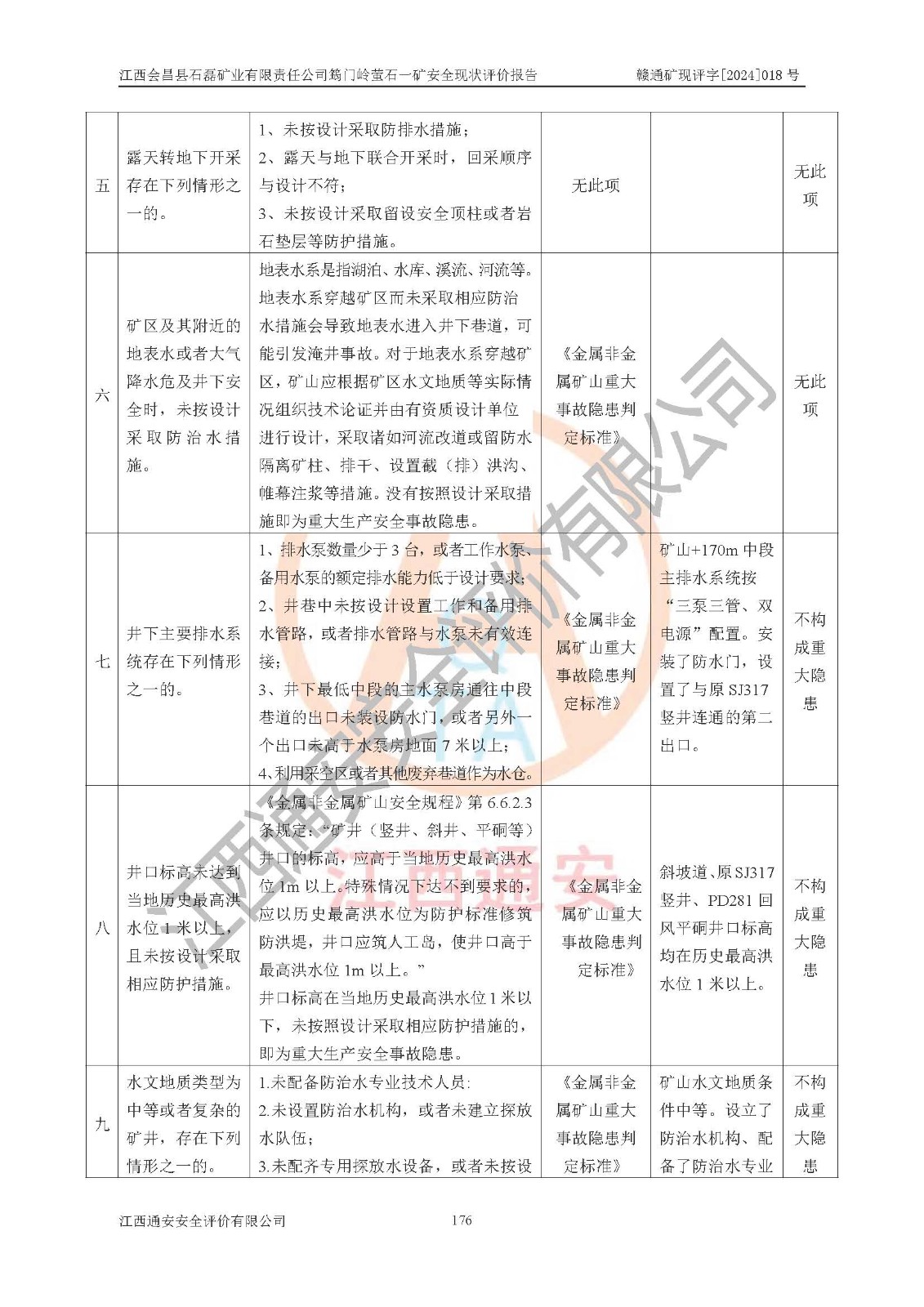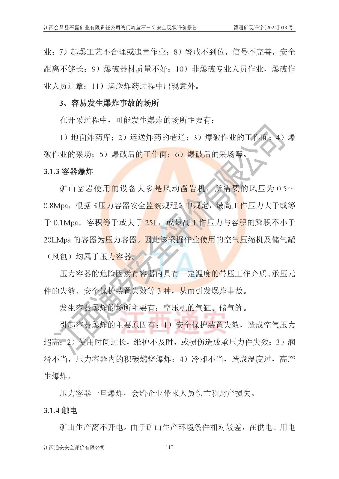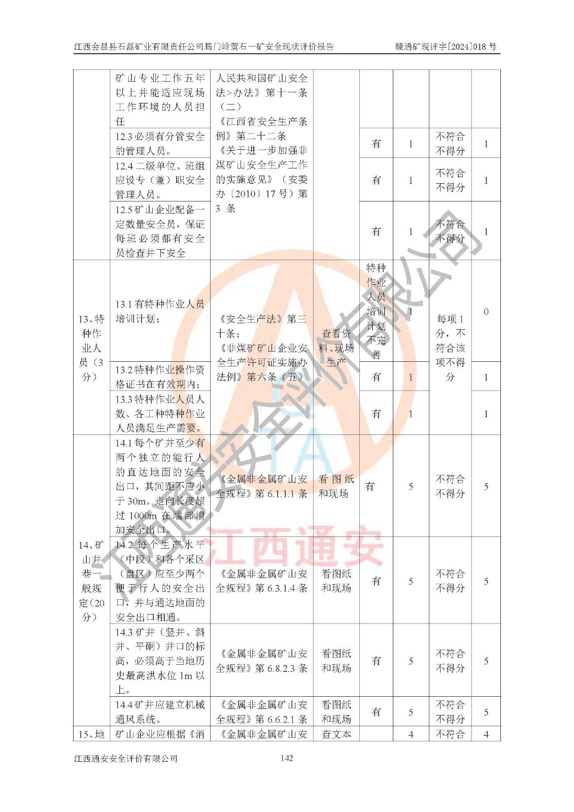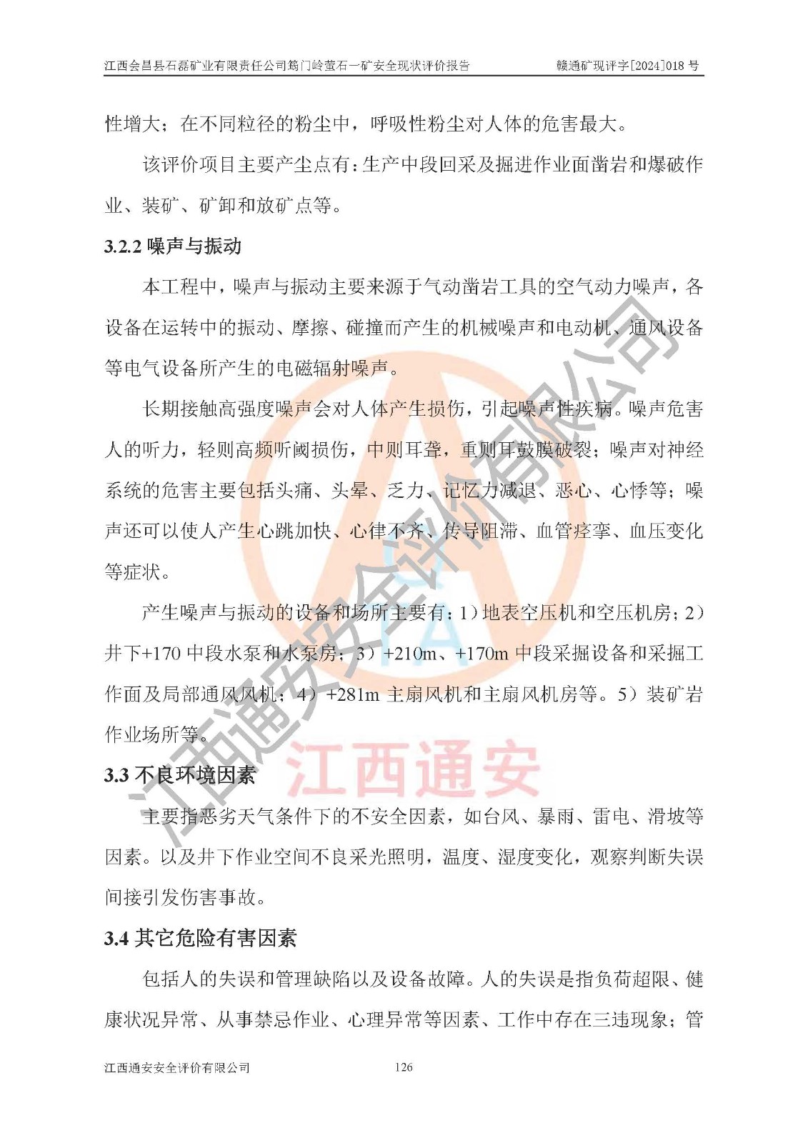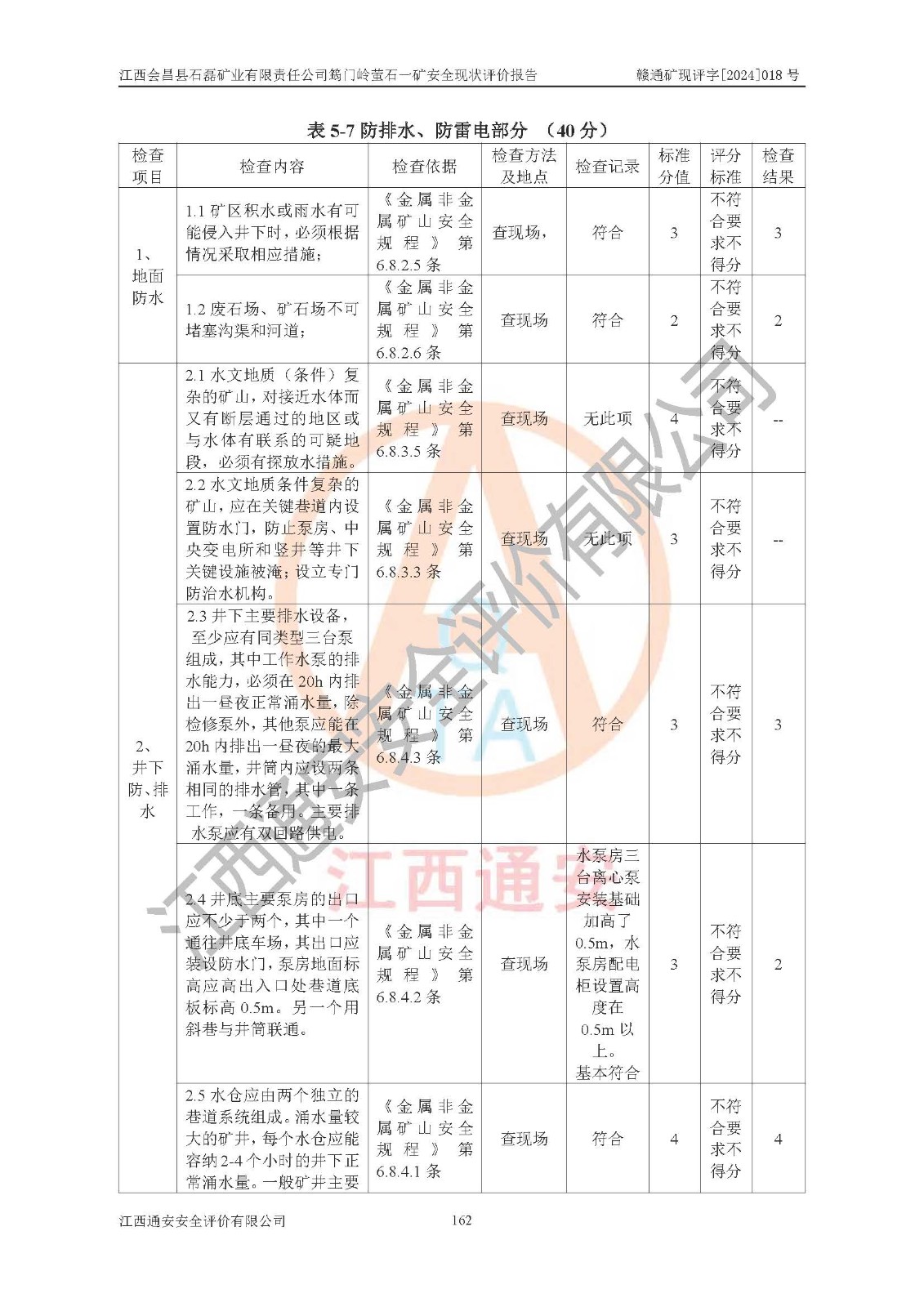 其它 | 該評價項目中存在的主要危險有害因素有火藥爆炸、爆破傷害、觸電、冒頂片幫、坍塌、機械傷害、高處墜落、物體打擊、火災、透水、中毒和窒息等16類危險有害因素,其中火藥爆炸、爆破傷害、冒頂片幫、中毒和窒息等成為可能導致重大事故發(fā)生的重大危險、有害因素;觸電、高處墜落、機械傷害等有引事故的可能性。 江西會昌縣石磊礦業(yè)有限責任公司筠門嶺螢石一礦設(shè)備、設(shè)施和場所符合**安全生產(chǎn)有關(guān)法律、法規(guī)、標準及規(guī)范的規(guī)定。礦山采用斜坡道開拓方式,安全生產(chǎn)條件較好;安全管理能滿足法規(guī)要求,礦山地下開采符合**規(guī)定的安全生產(chǎn)條件。 | ||||