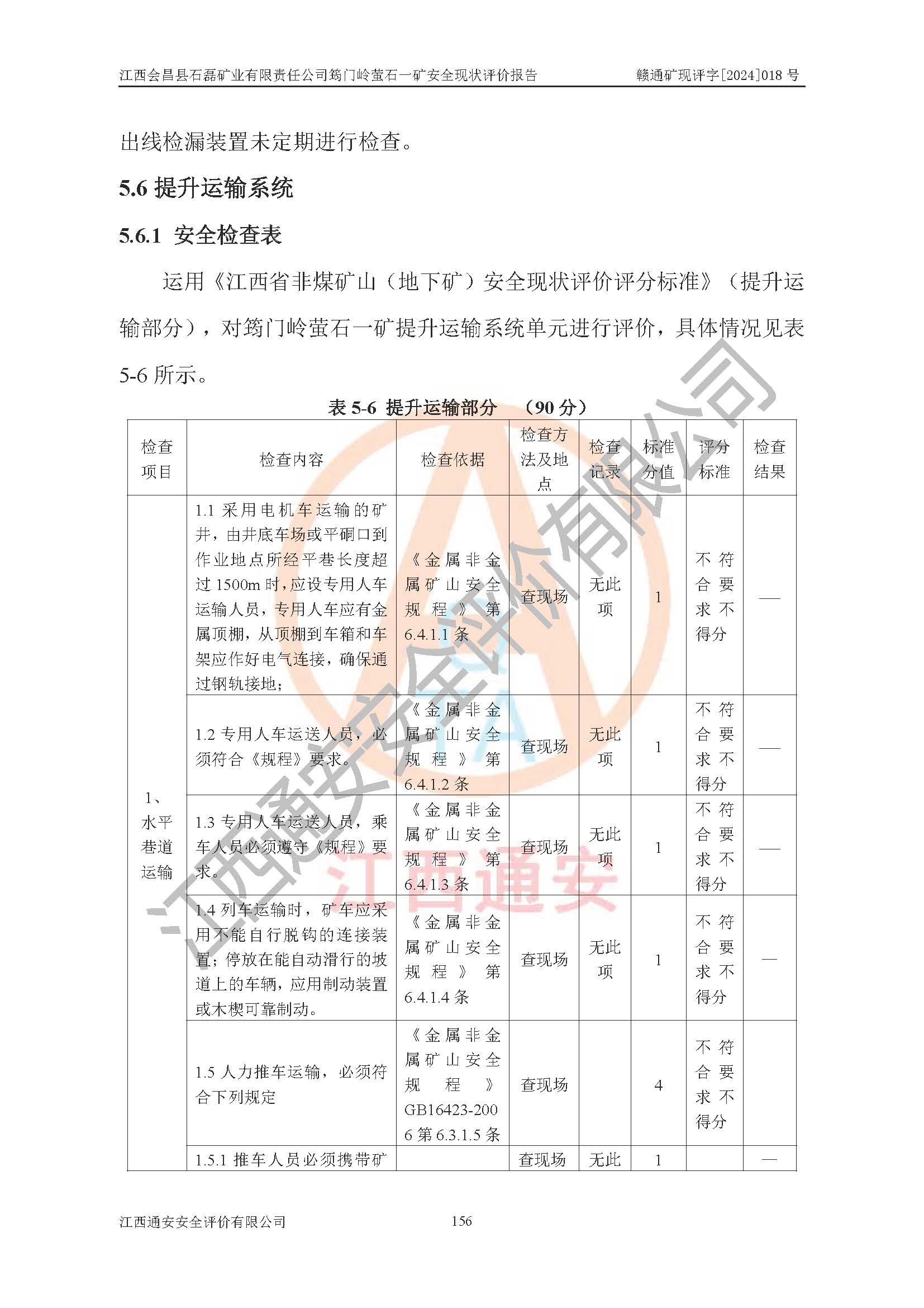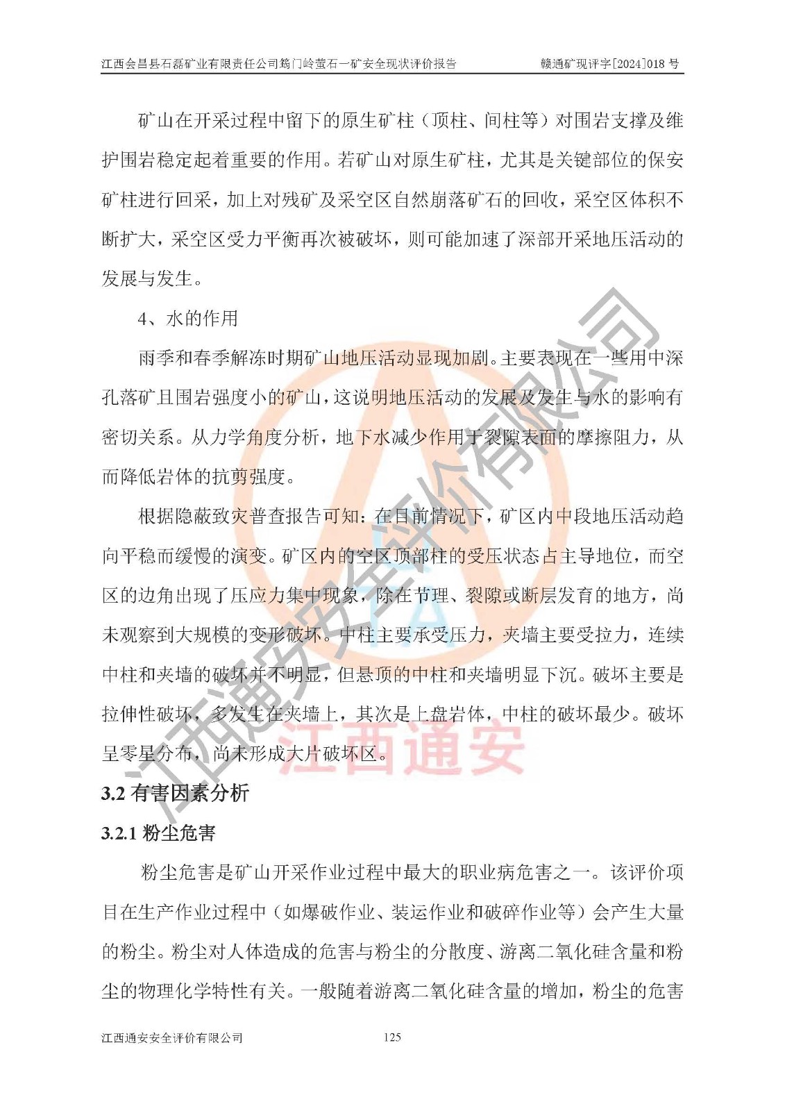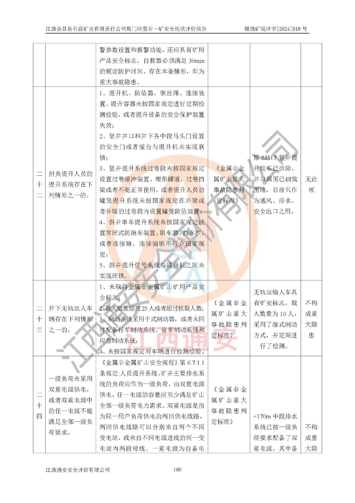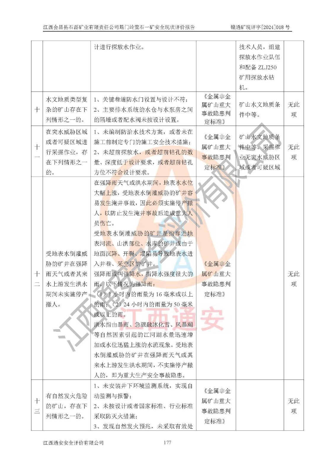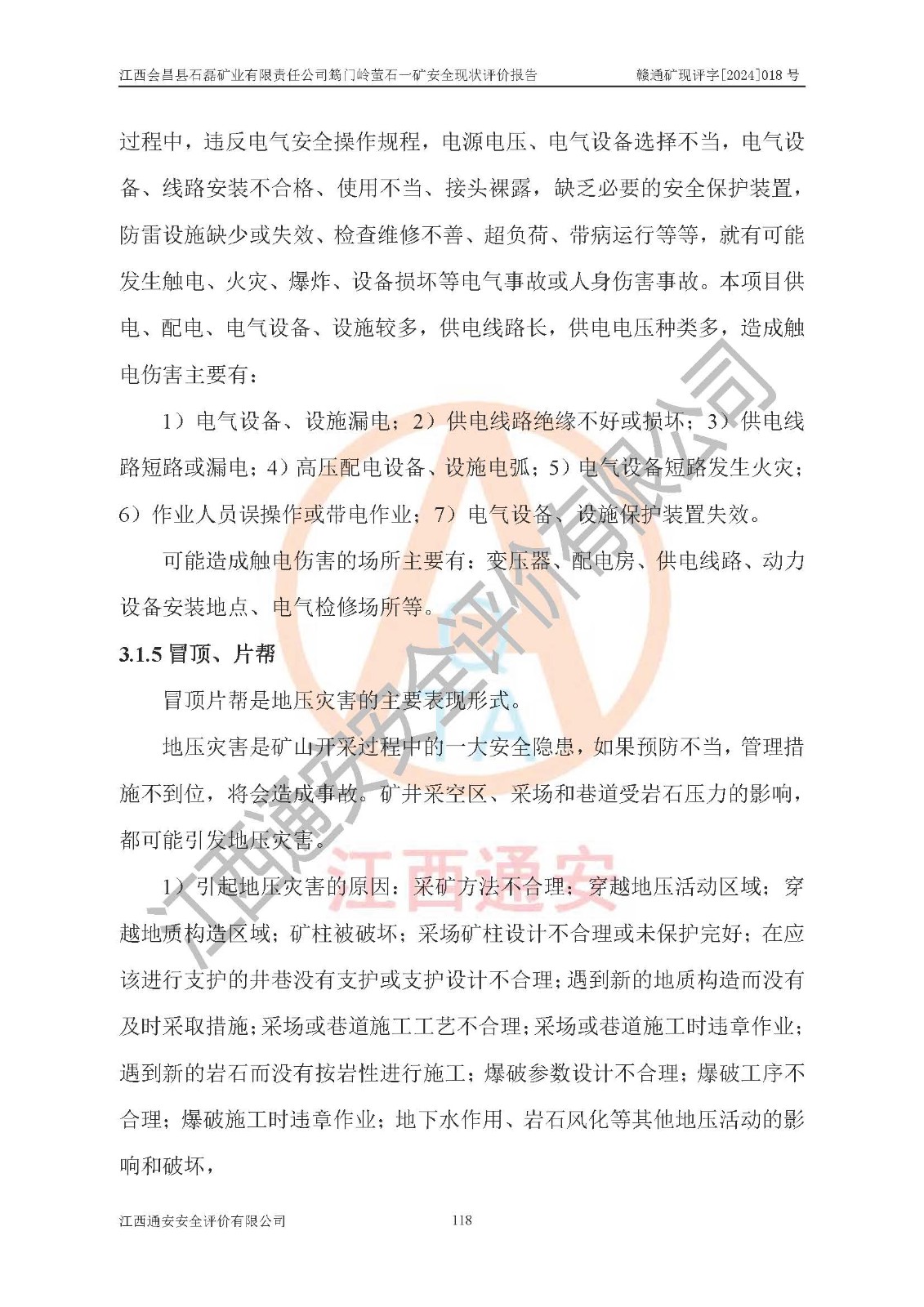 其它 | 該評價項目中存在的主要危險有害因素有火藥爆炸、爆破傷害、觸電、冒頂片幫、坍塌、機械傷害、高處墜落、物體打擊、火災、透水、中毒和窒息等16類危險有害因素,其中火藥爆炸、爆破傷害、冒頂片幫、中毒和窒息等成為可能導致重大事故發(fā)生的重大危險、有害因素;觸電、高處墜落、機械傷害等有引事故的可能性。 江西會昌縣石磊礦業(yè)有限責任公司筠門嶺螢石一礦設(shè)備、設(shè)施和場所符合**安全生產(chǎn)有關(guān)法律、法規(guī)、標準及規(guī)范的規(guī)定。礦山采用斜坡道開拓方式,安全生產(chǎn)條件較好;安全管理能滿足法規(guī)要求,礦山地下開采符合**規(guī)定的安全生產(chǎn)條件。 | ||||