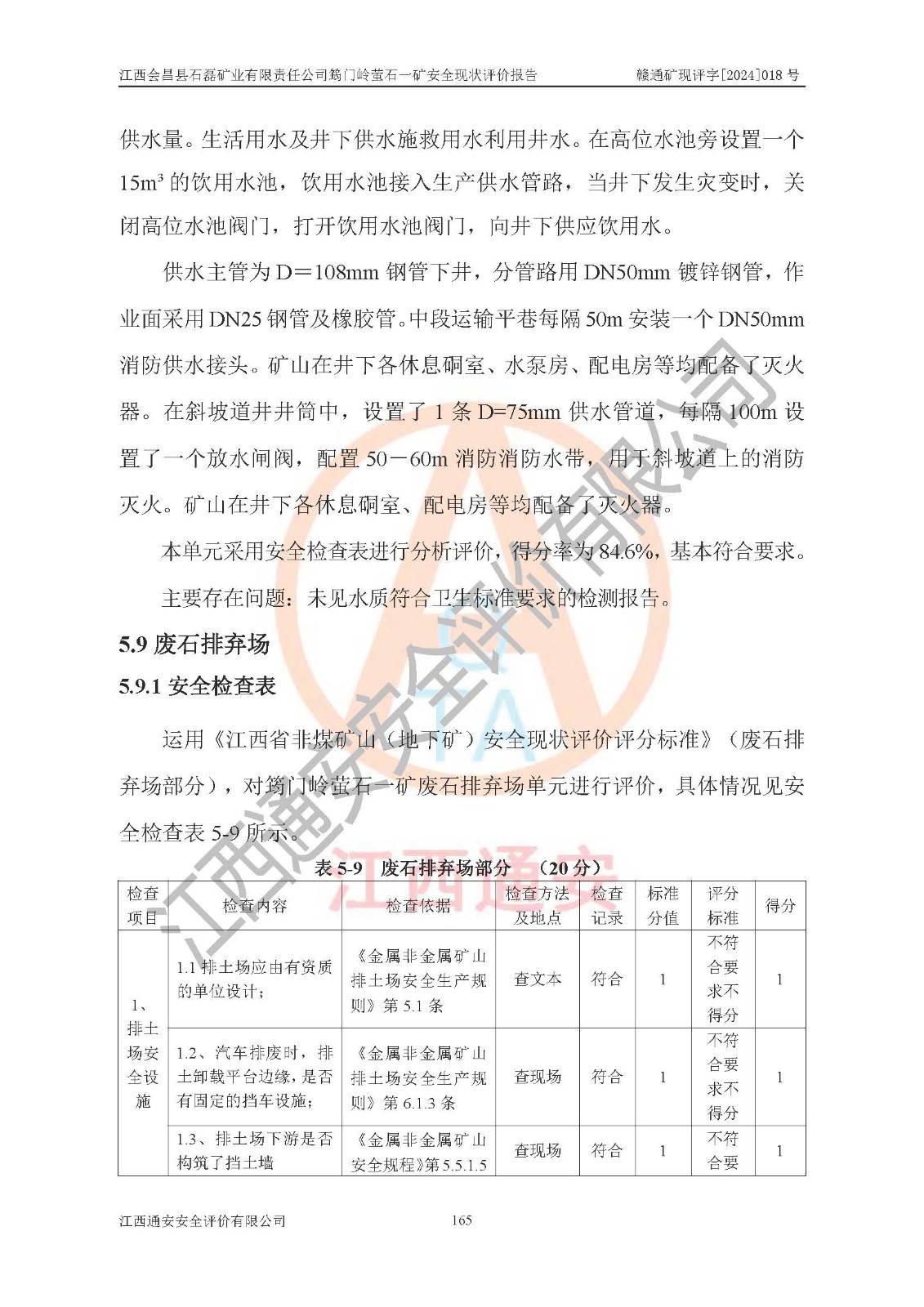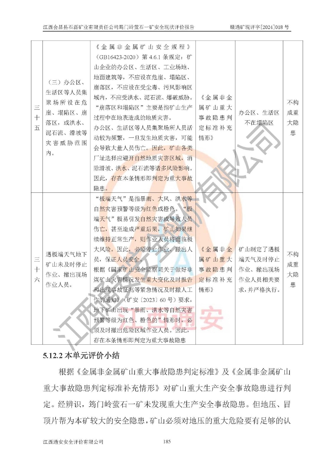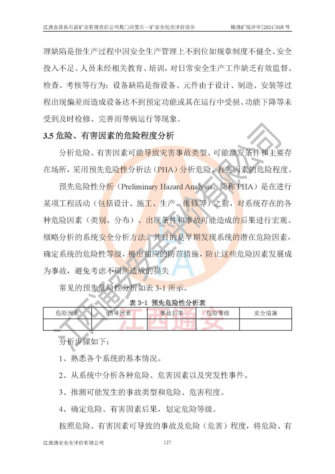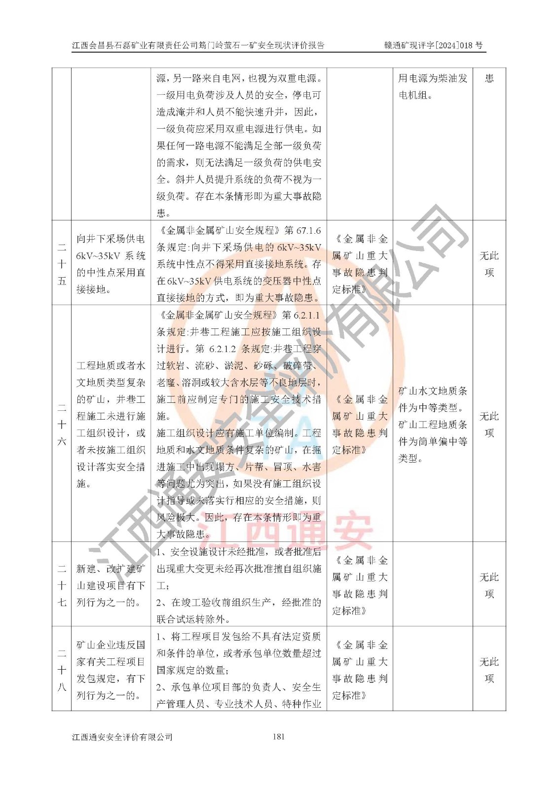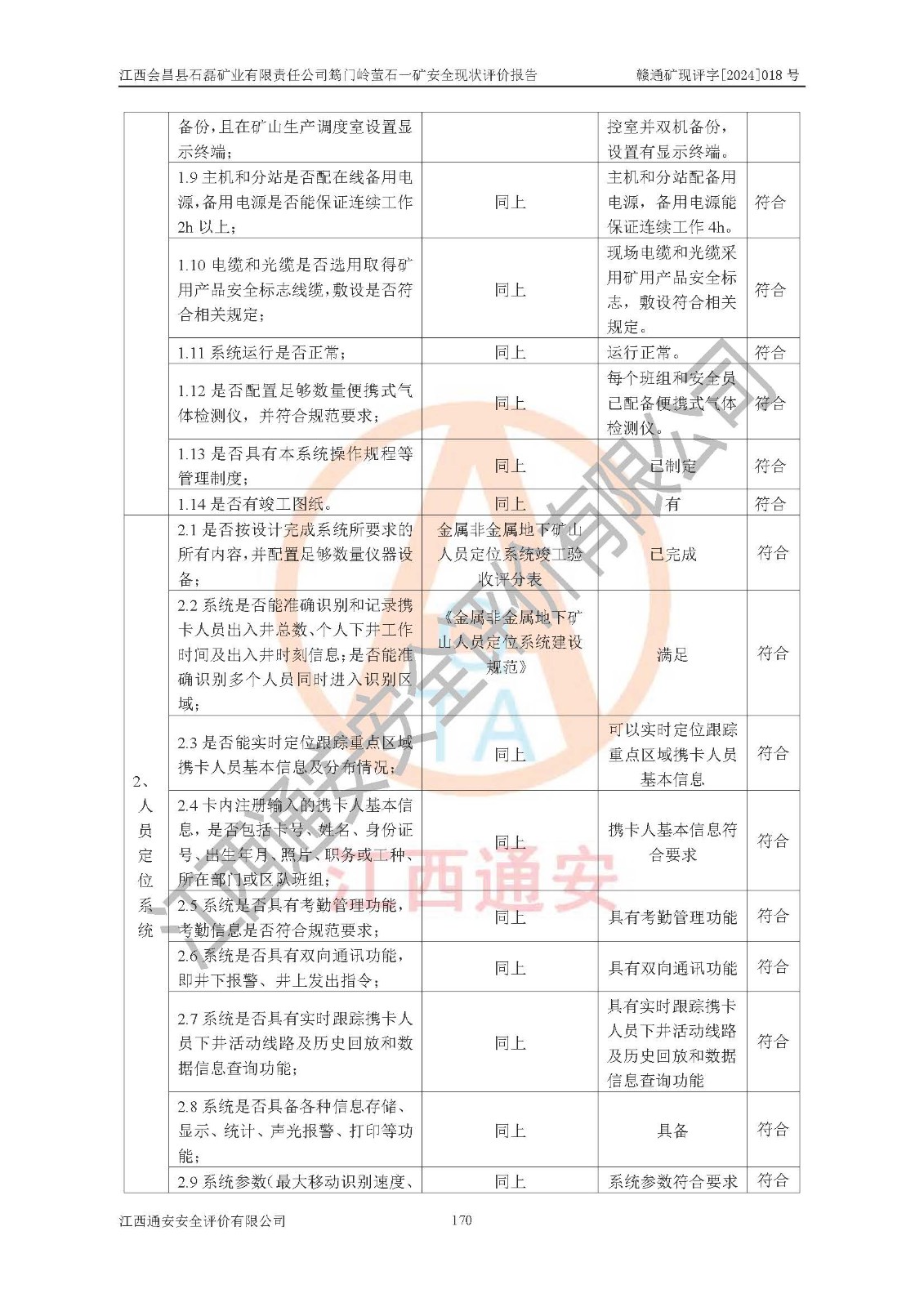 其它 | 該評價項目中存在的主要危險有害因素有火藥爆炸、爆破傷害、觸電、冒頂片幫、坍塌、機械傷害、高處墜落、物體打擊、火災、透水、中毒和窒息等16類危險有害因素,其中火藥爆炸、爆破傷害、冒頂片幫、中毒和窒息等成為可能導致重大事故發(fā)生的重大危險、有害因素;觸電、高處墜落、機械傷害等有引事故的可能性。 江西會昌縣石磊礦業(yè)有限責任公司筠門嶺螢石一礦設(shè)備、設(shè)施和場所符合**安全生產(chǎn)有關(guān)法律、法規(guī)、標準及規(guī)范的規(guī)定。礦山采用斜坡道開拓方式,安全生產(chǎn)條件較好;安全管理能滿足法規(guī)要求,礦山地下開采符合**規(guī)定的安全生產(chǎn)條件。 | ||||