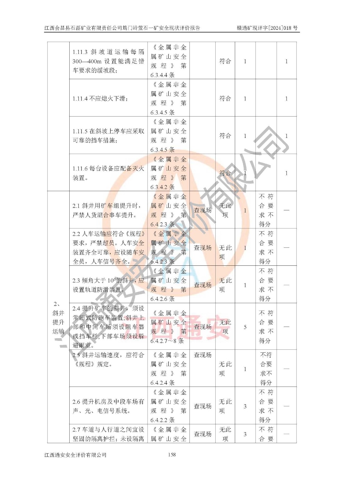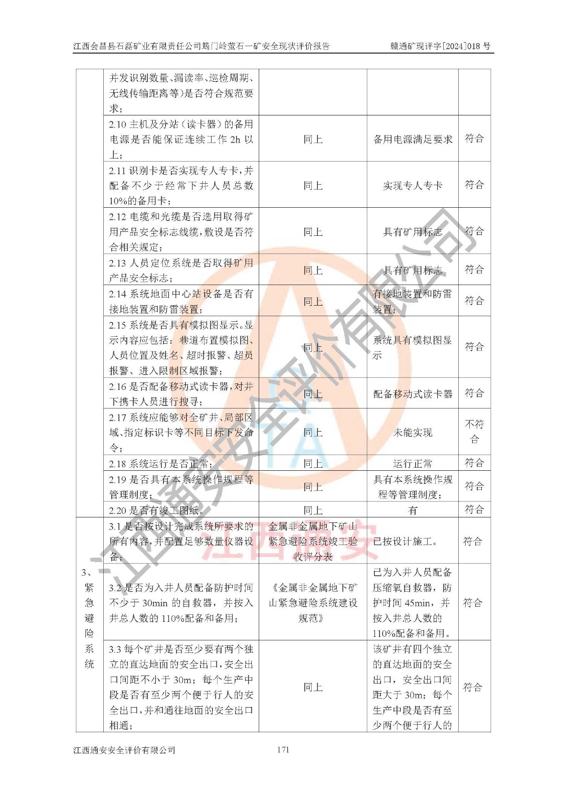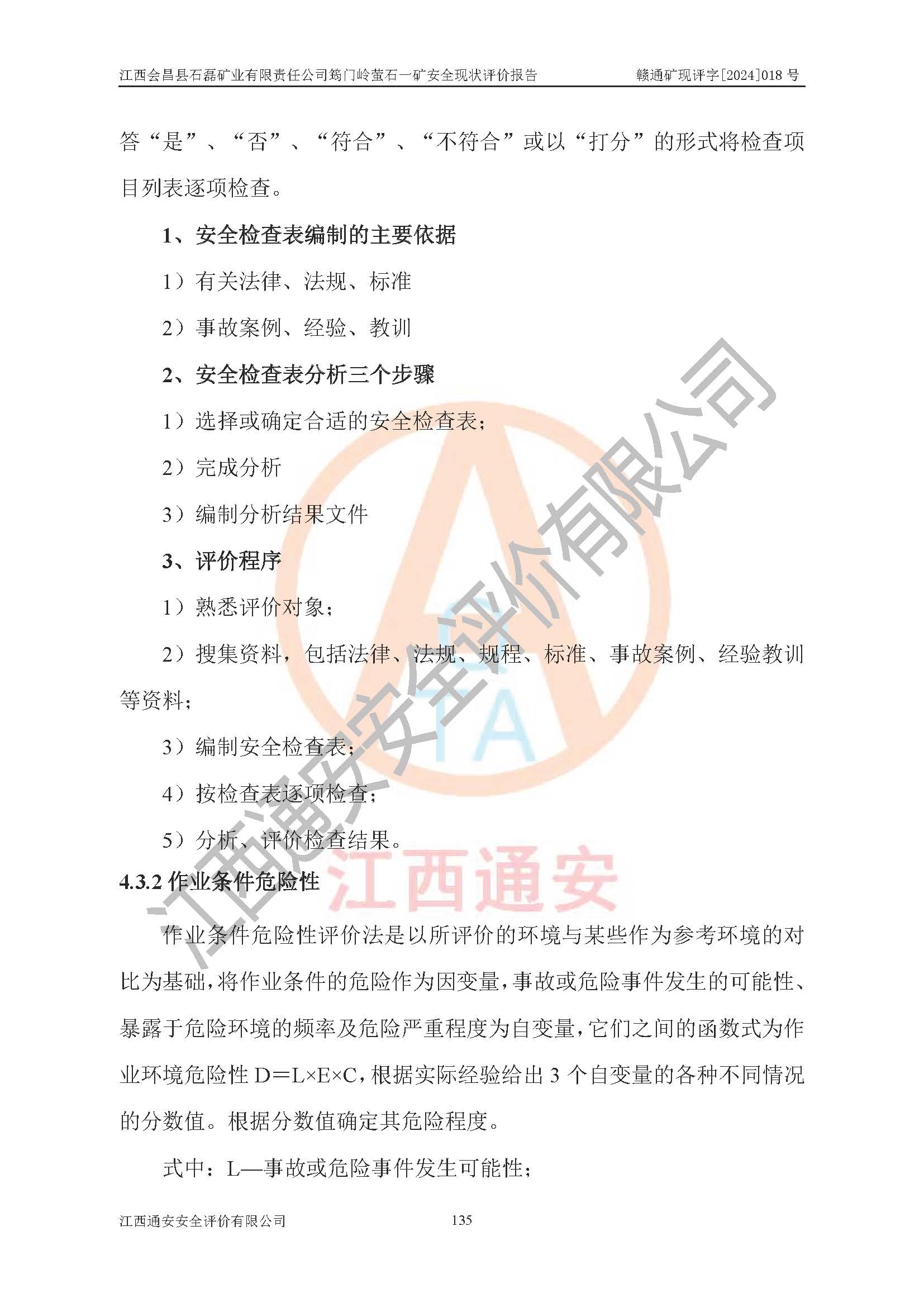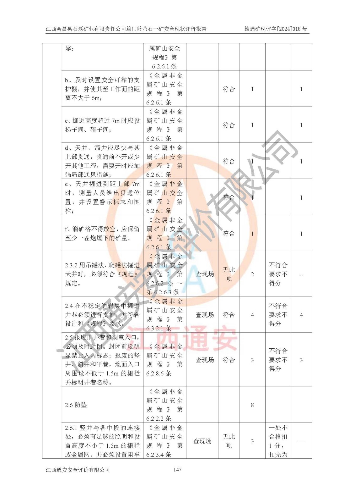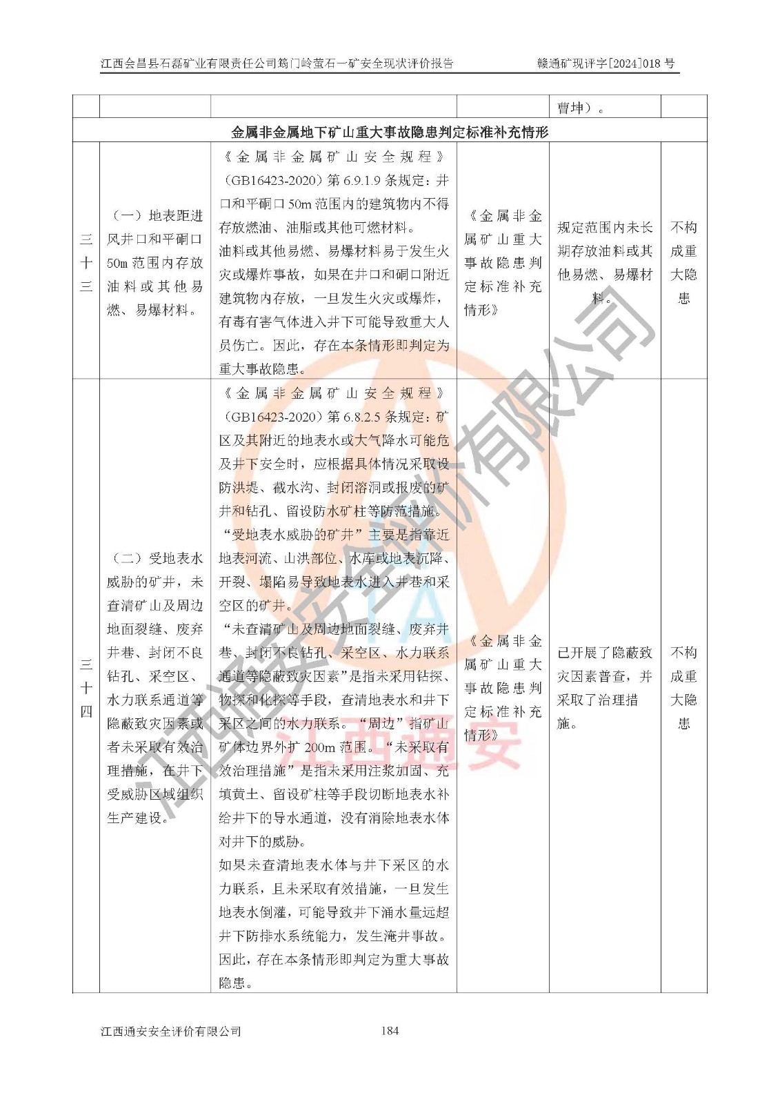 其它 | 該評價項目中存在的主要危險有害因素有火藥爆炸、爆破傷害、觸電、冒頂片幫、坍塌、機械傷害、高處墜落、物體打擊、火災、透水、中毒和窒息等16類危險有害因素,其中火藥爆炸、爆破傷害、冒頂片幫、中毒和窒息等成為可能導致重大事故發(fā)生的重大危險、有害因素;觸電、高處墜落、機械傷害等有引事故的可能性。 江西會昌縣石磊礦業(yè)有限責任公司筠門嶺螢石一礦設(shè)備、設(shè)施和場所符合**安全生產(chǎn)有關(guān)法律、法規(guī)、標準及規(guī)范的規(guī)定。礦山采用斜坡道開拓方式,安全生產(chǎn)條件較好;安全管理能滿足法規(guī)要求,礦山地下開采符合**規(guī)定的安全生產(chǎn)條件。 | ||||