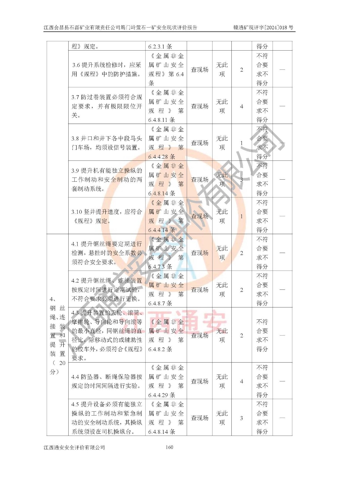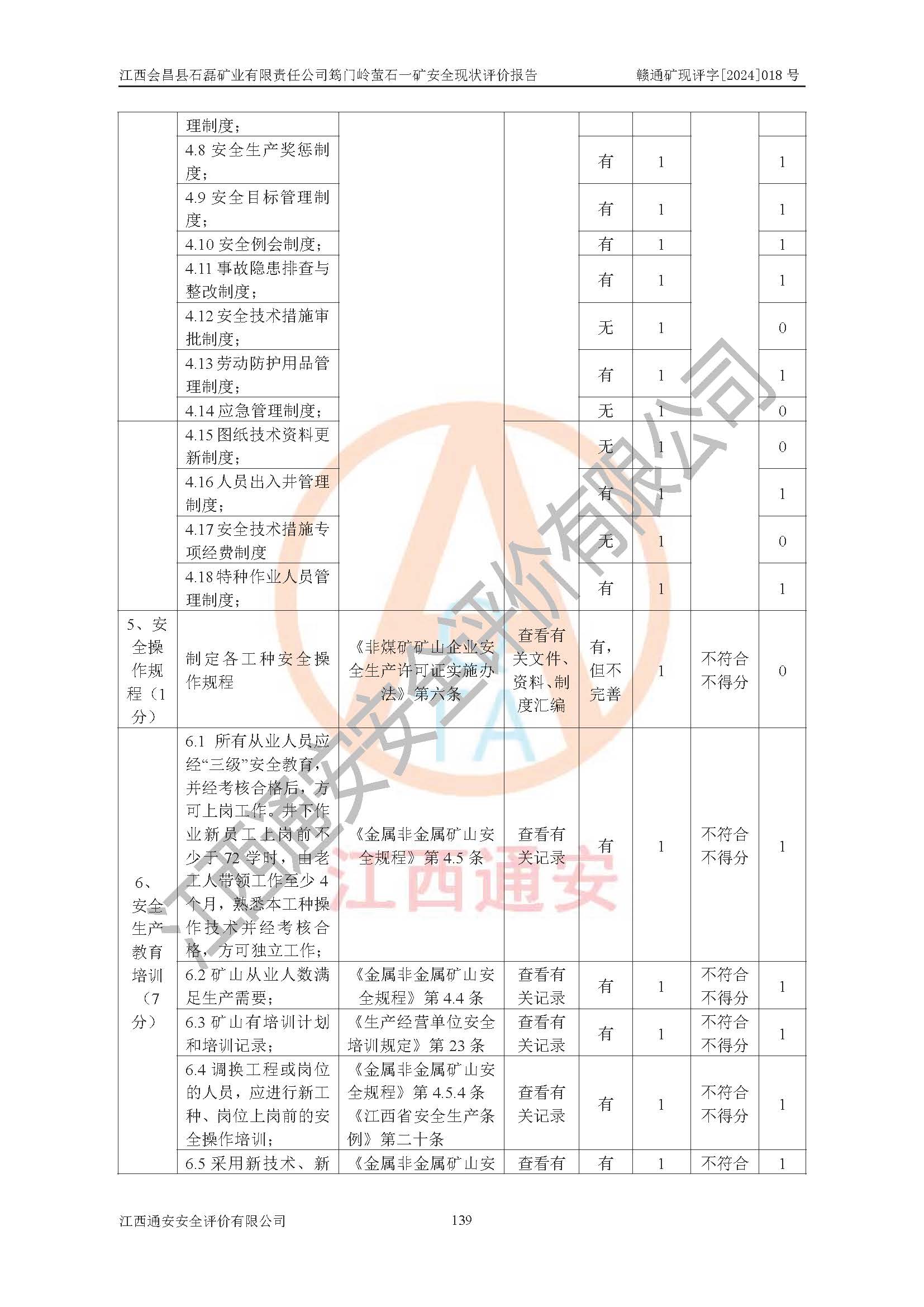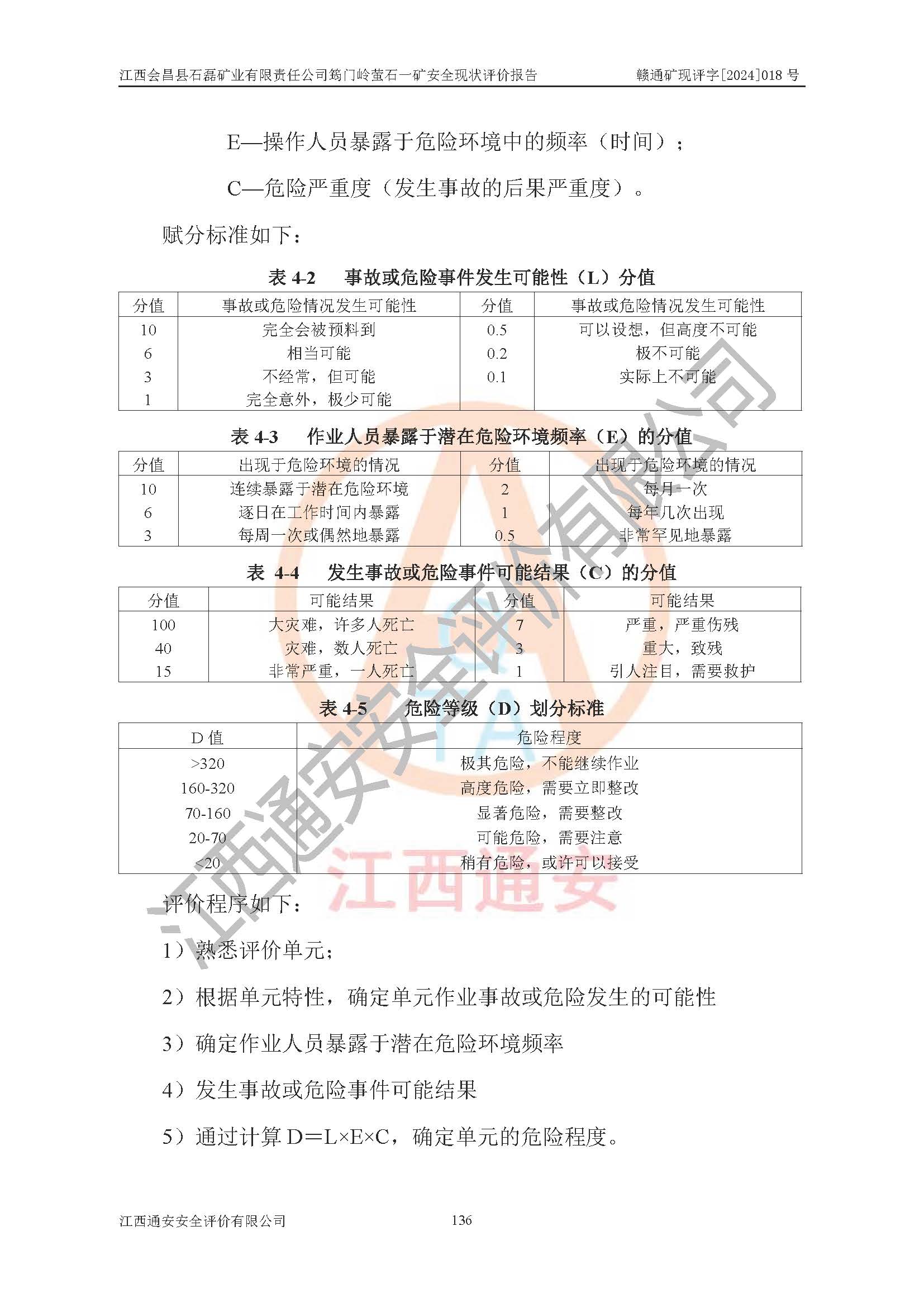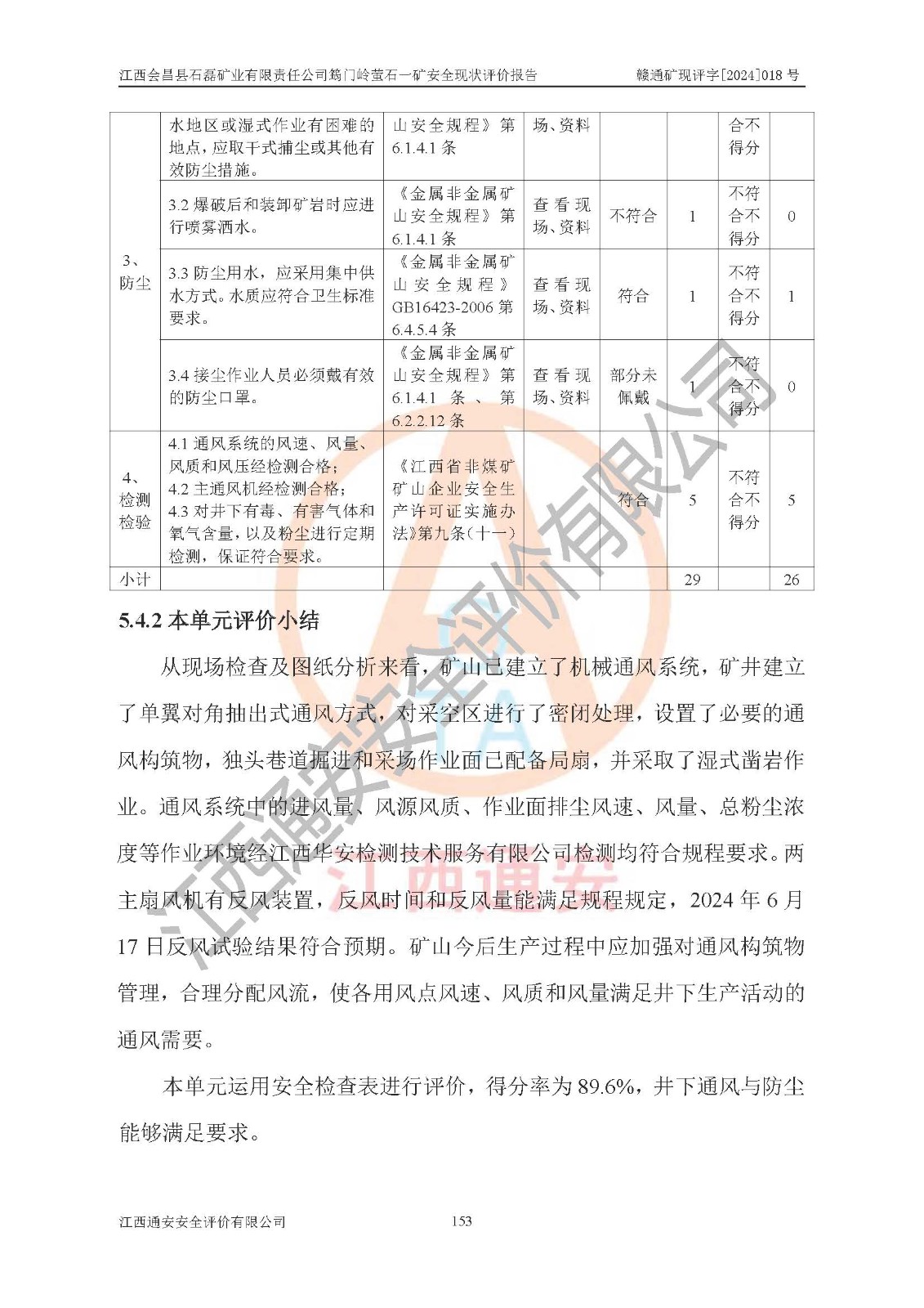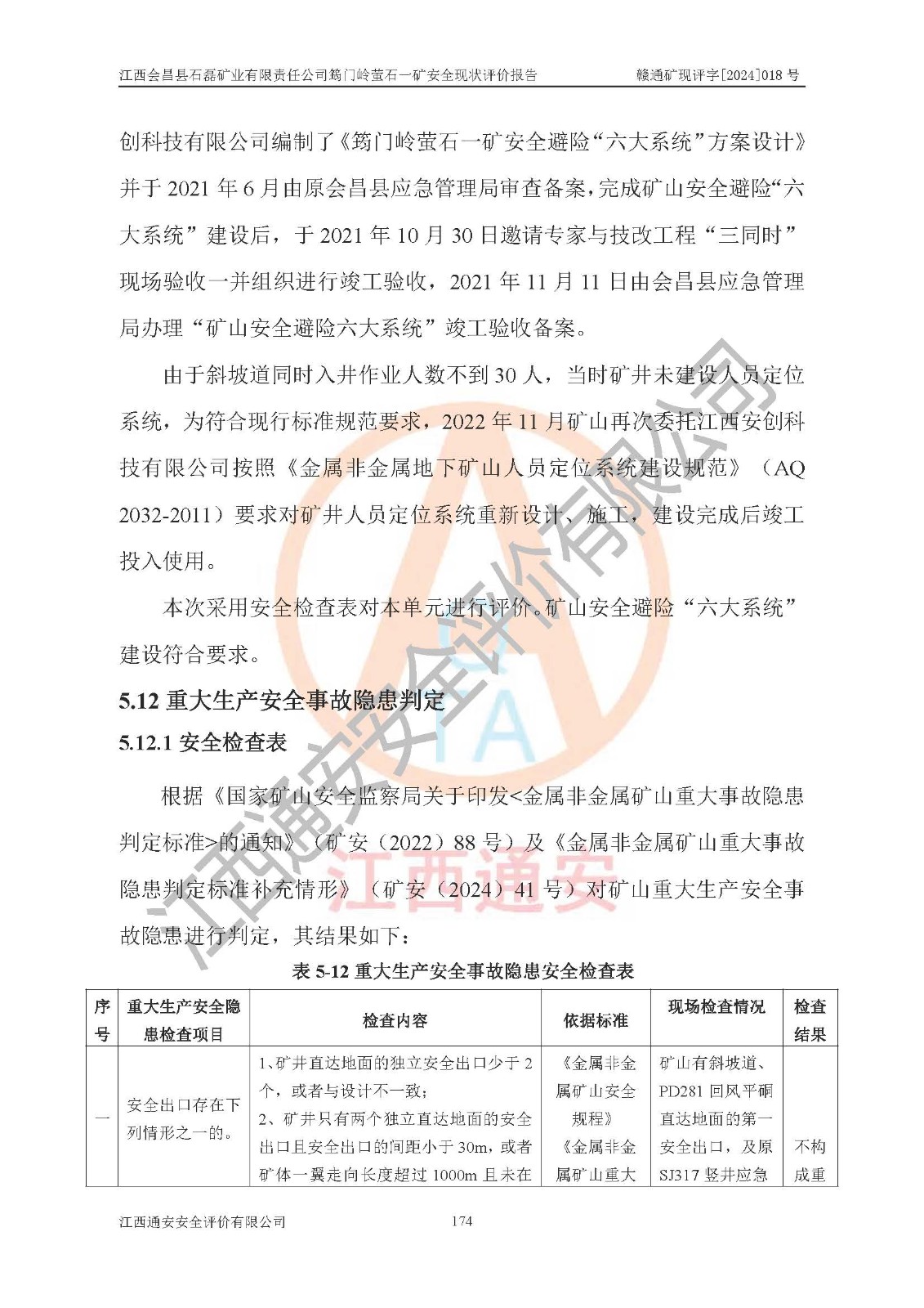 其它 | 該評價項目中存在的主要危險有害因素有火藥爆炸、爆破傷害、觸電、冒頂片幫、坍塌、機械傷害、高處墜落、物體打擊、火災、透水、中毒和窒息等16類危險有害因素,其中火藥爆炸、爆破傷害、冒頂片幫、中毒和窒息等成為可能導致重大事故發(fā)生的重大危險、有害因素;觸電、高處墜落、機械傷害等有引事故的可能性。 江西會昌縣石磊礦業(yè)有限責任公司筠門嶺螢石一礦設(shè)備、設(shè)施和場所符合**安全生產(chǎn)有關(guān)法律、法規(guī)、標準及規(guī)范的規(guī)定。礦山采用斜坡道開拓方式,安全生產(chǎn)條件較好;安全管理能滿足法規(guī)要求,礦山地下開采符合**規(guī)定的安全生產(chǎn)條件。 | ||||