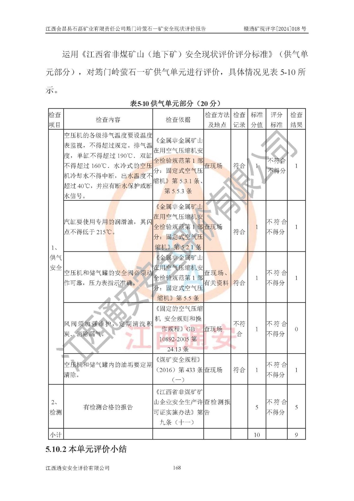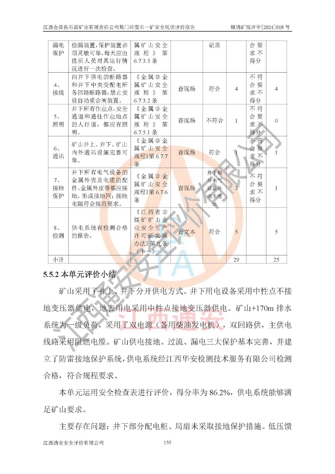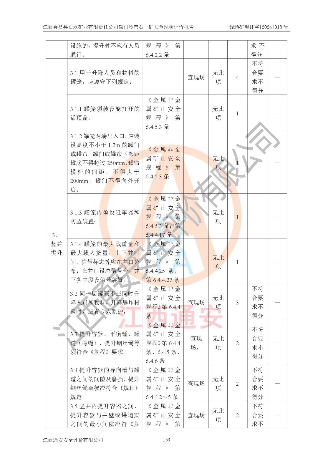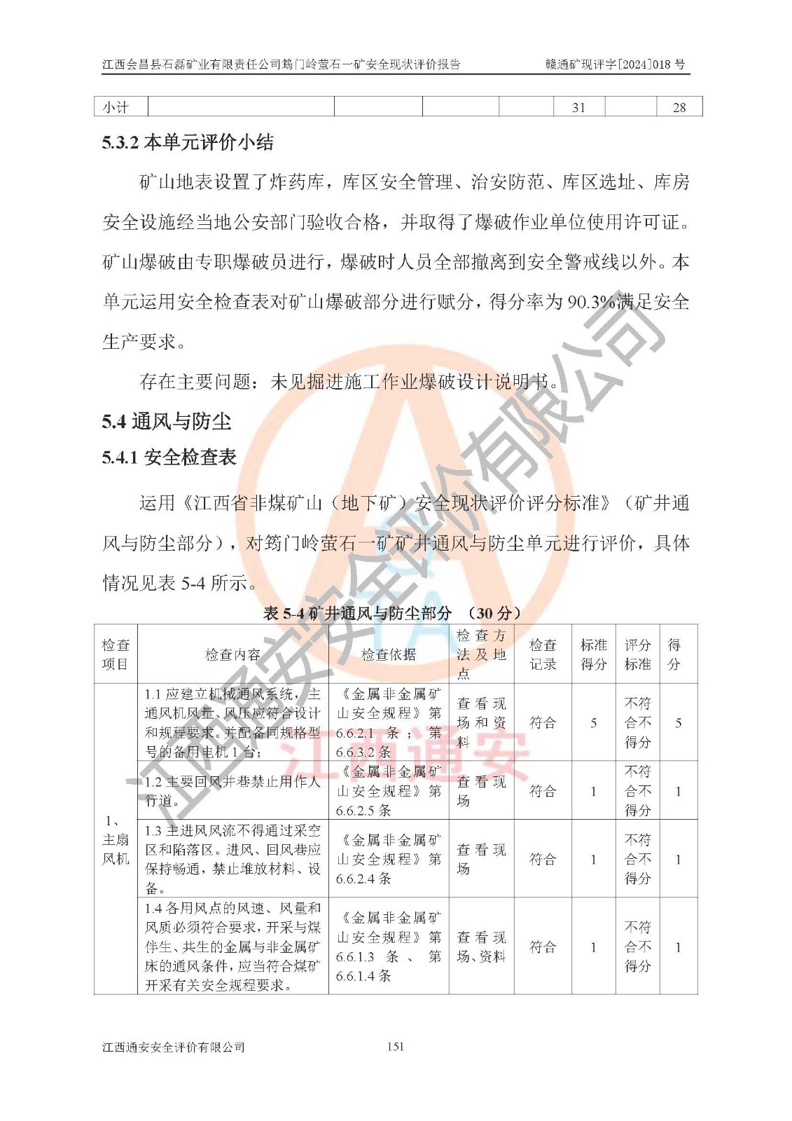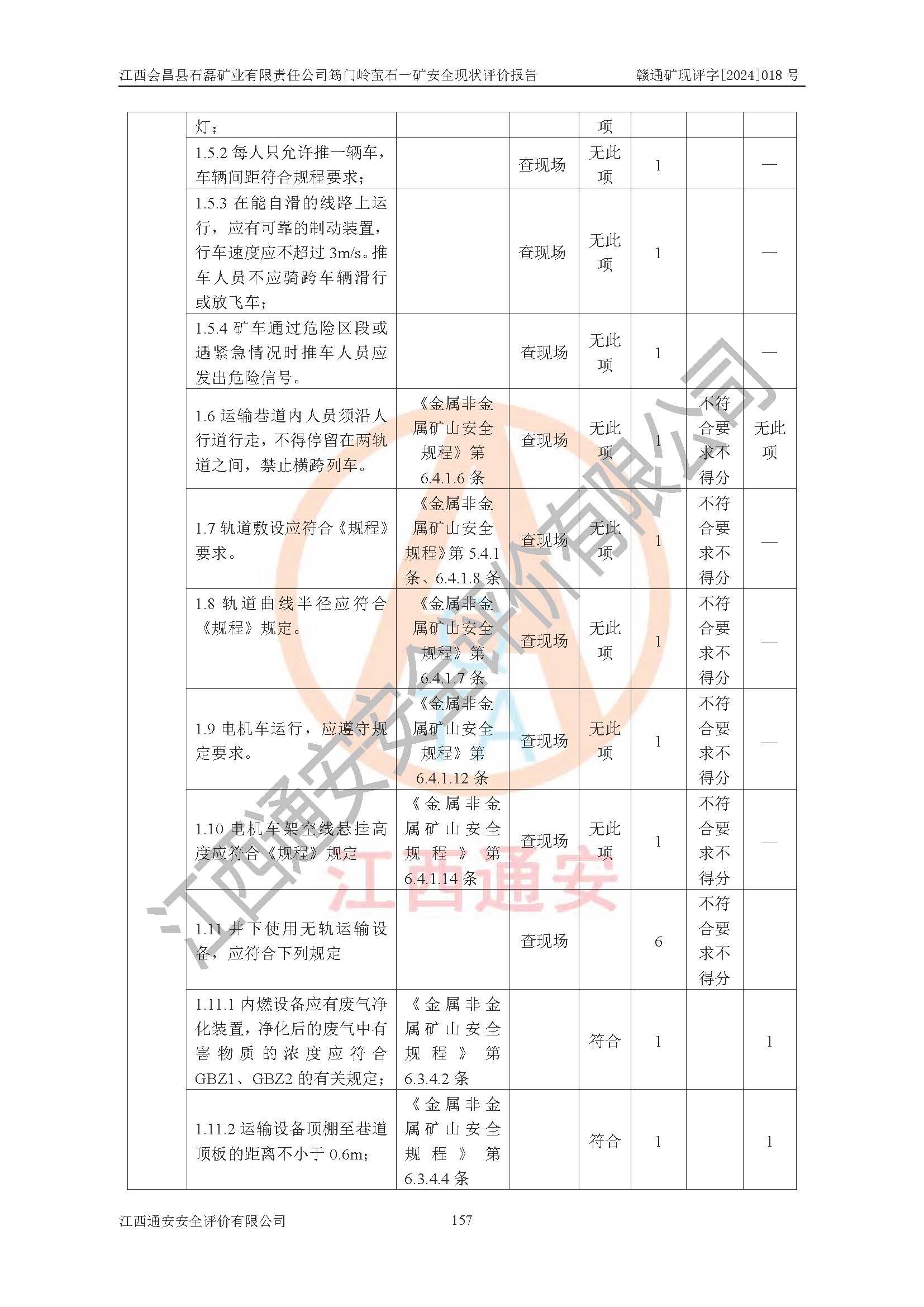 其它 | 該評價項目中存在的主要危險有害因素有火藥爆炸、爆破傷害、觸電、冒頂片幫、坍塌、機械傷害、高處墜落、物體打擊、火災、透水、中毒和窒息等16類危險有害因素,其中火藥爆炸、爆破傷害、冒頂片幫、中毒和窒息等成為可能導致重大事故發(fā)生的重大危險、有害因素;觸電、高處墜落、機械傷害等有引事故的可能性。 江西會昌縣石磊礦業(yè)有限責任公司筠門嶺螢石一礦設(shè)備、設(shè)施和場所符合**安全生產(chǎn)有關(guān)法律、法規(guī)、標準及規(guī)范的規(guī)定。礦山采用斜坡道開拓方式,安全生產(chǎn)條件較好;安全管理能滿足法規(guī)要求,礦山地下開采符合**規(guī)定的安全生產(chǎn)條件。 | ||||