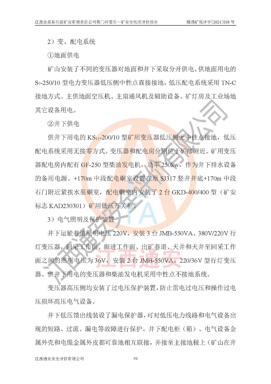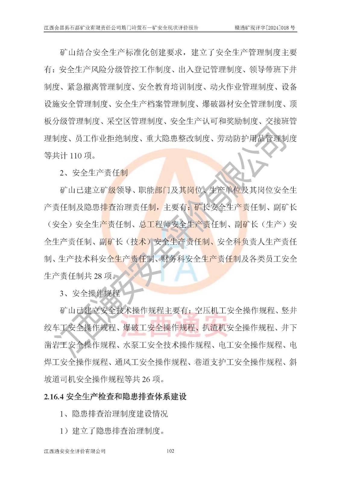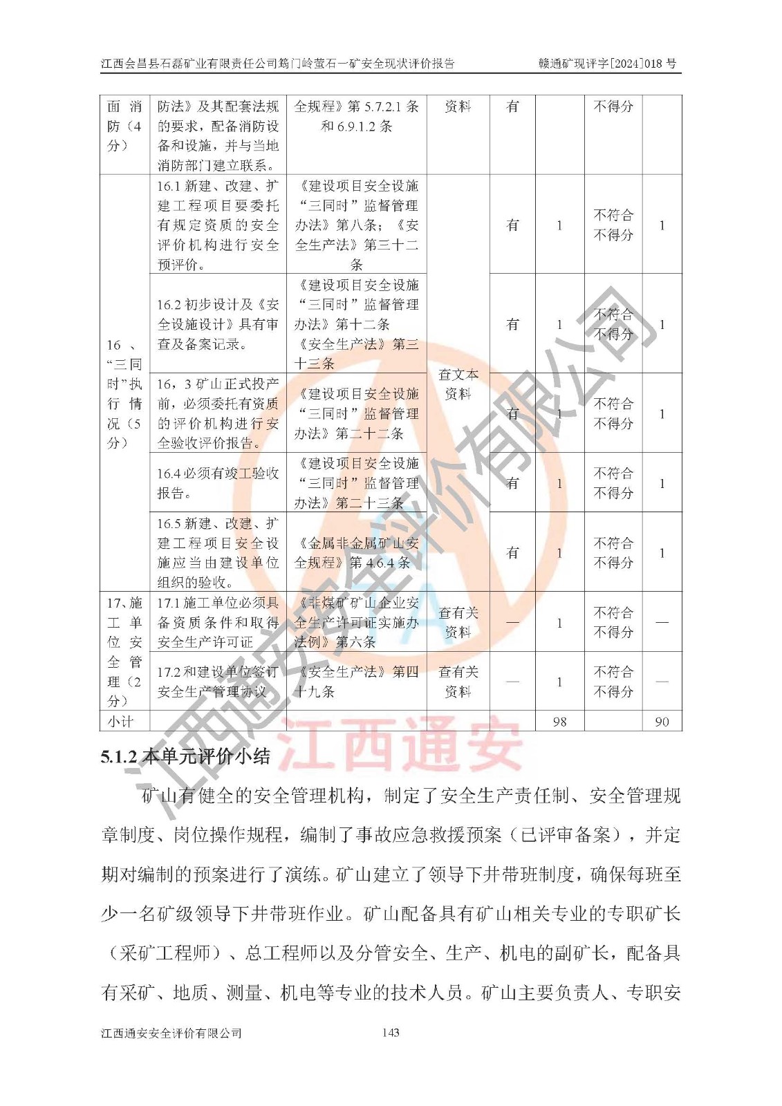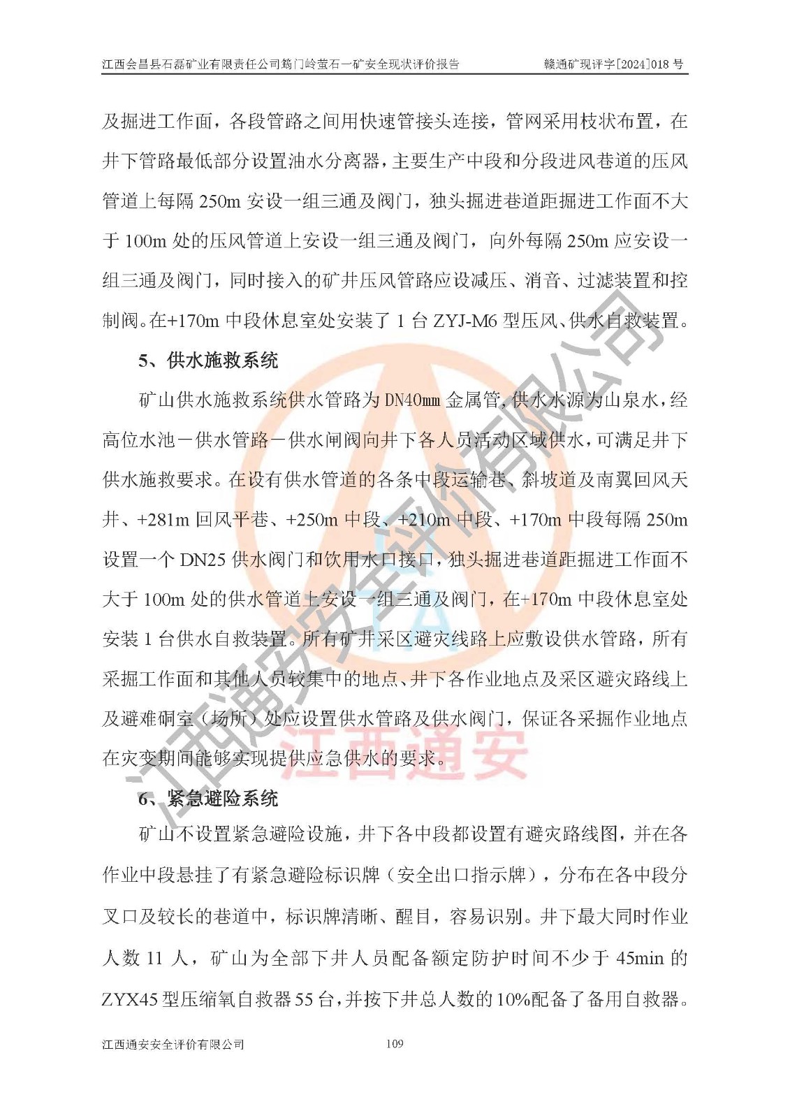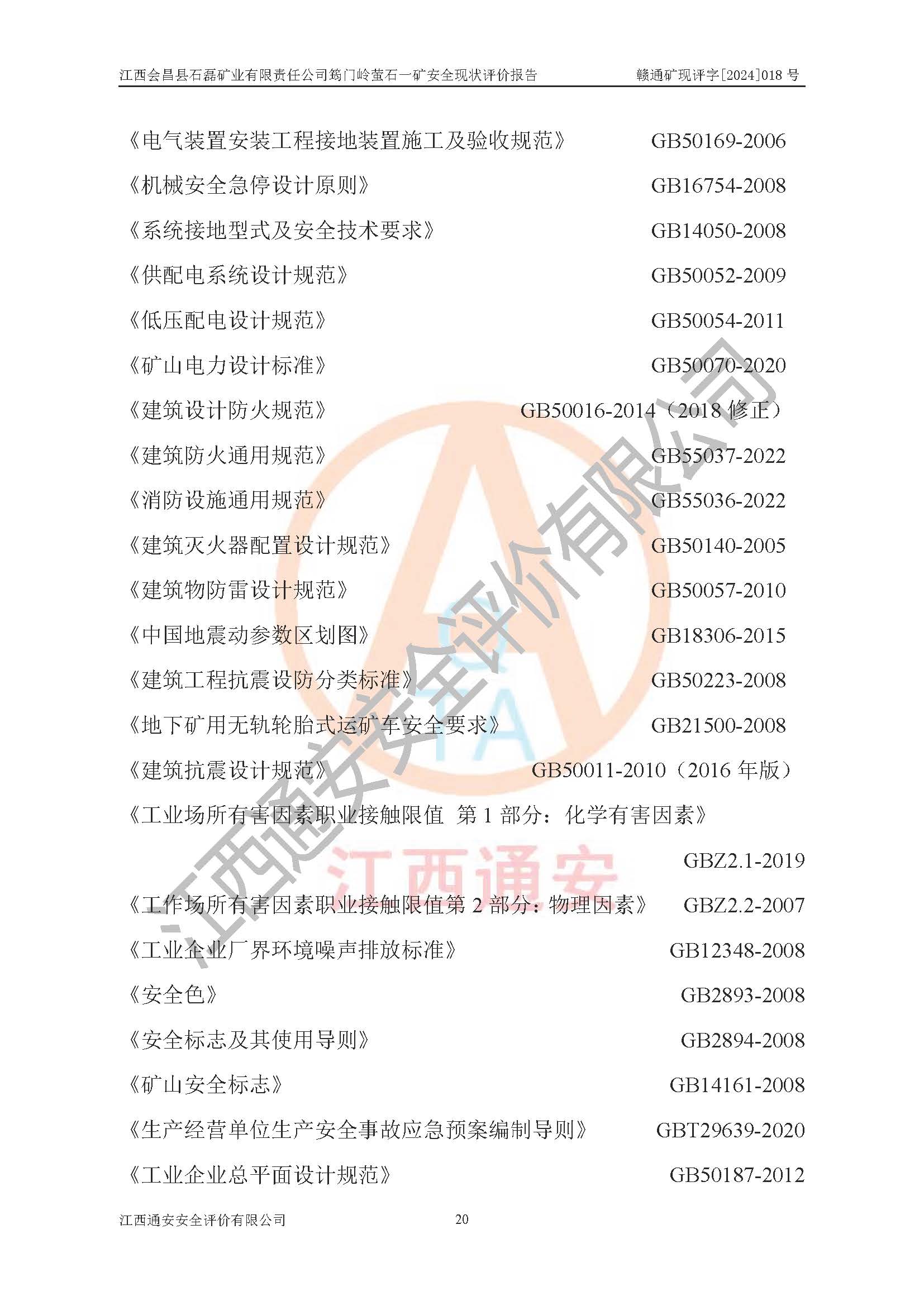 其它 | 該評價項目中存在的主要危險有害因素有火藥爆炸、爆破傷害、觸電、冒頂片幫、坍塌、機械傷害、高處墜落、物體打擊、火災、透水、中毒和窒息等16類危險有害因素,其中火藥爆炸、爆破傷害、冒頂片幫、中毒和窒息等成為可能導致重大事故發(fā)生的重大危險、有害因素;觸電、高處墜落、機械傷害等有引事故的可能性。 江西會昌縣石磊礦業(yè)有限責任公司筠門嶺螢石一礦設(shè)備、設(shè)施和場所符合**安全生產(chǎn)有關(guān)法律、法規(guī)、標準及規(guī)范的規(guī)定。礦山采用斜坡道開拓方式,安全生產(chǎn)條件較好;安全管理能滿足法規(guī)要求,礦山地下開采符合**規(guī)定的安全生產(chǎn)條件。 | ||||