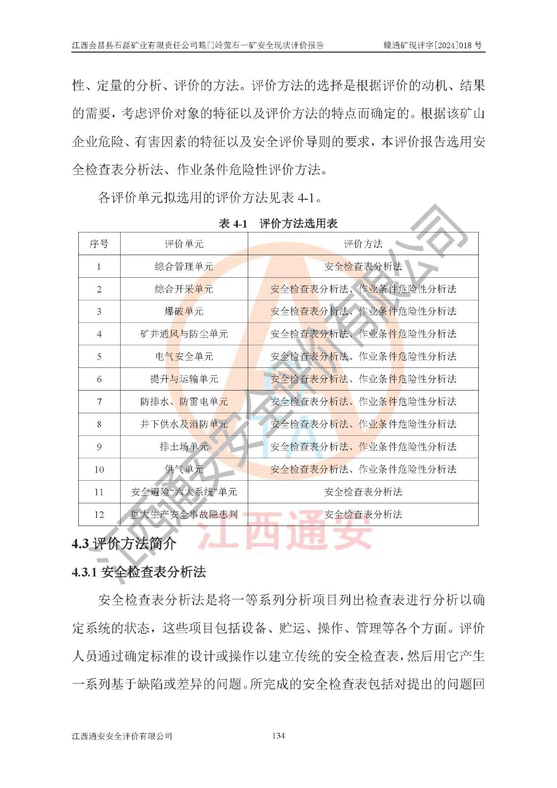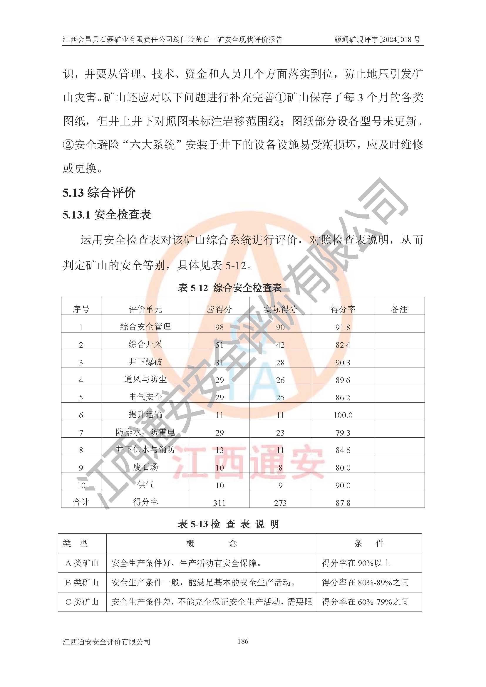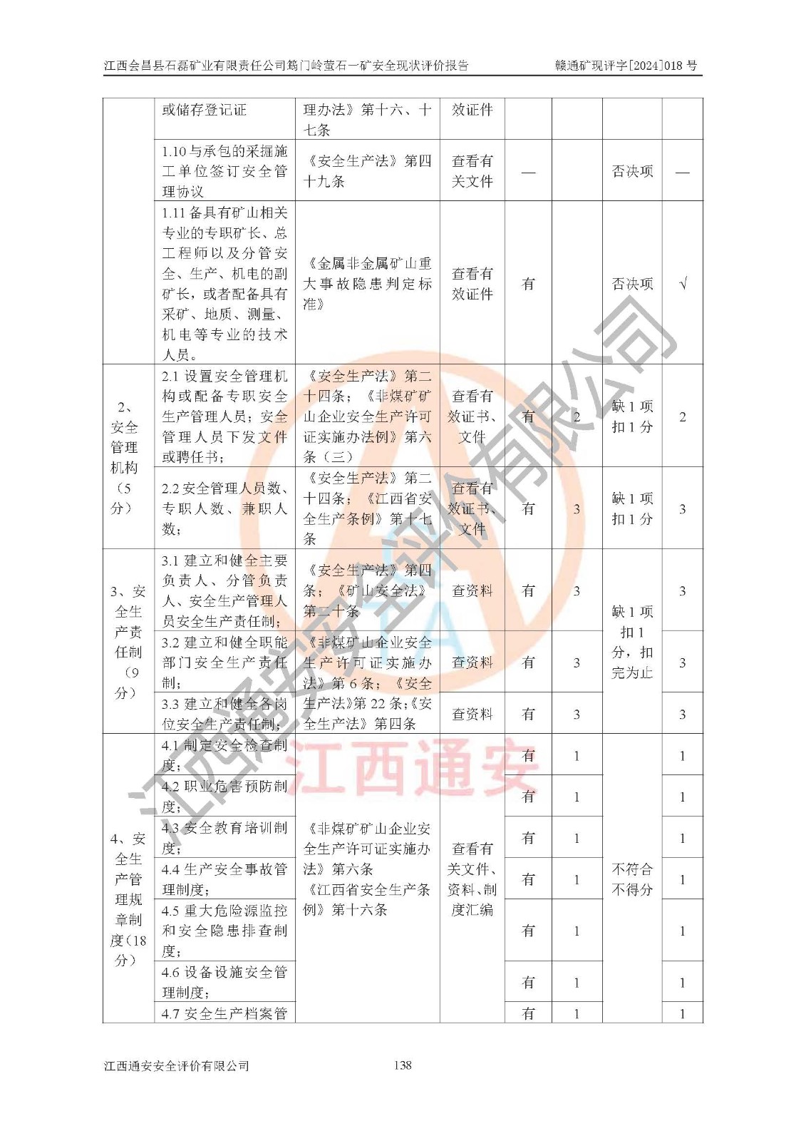 主要任務(wù) | 對該礦進行了現(xiàn)場勘察和整改復查,收集有關(guān)法律法規(guī)、技術(shù)標準和建設(shè)項目資料,分析了該建設(shè)工程項目中可能存在的主要危險、有害因素,對劃分的評價單元及單元內(nèi)的因素逐項進行分析、評判,提出了相應(yīng)的預防對策措施,在此基礎(chǔ)上編制評價報告,以作為上江西會昌縣石磊礦業(yè)有限責任公司筠門嶺螢石一礦獲得安全許可延期換證的依據(jù)。 | ||||