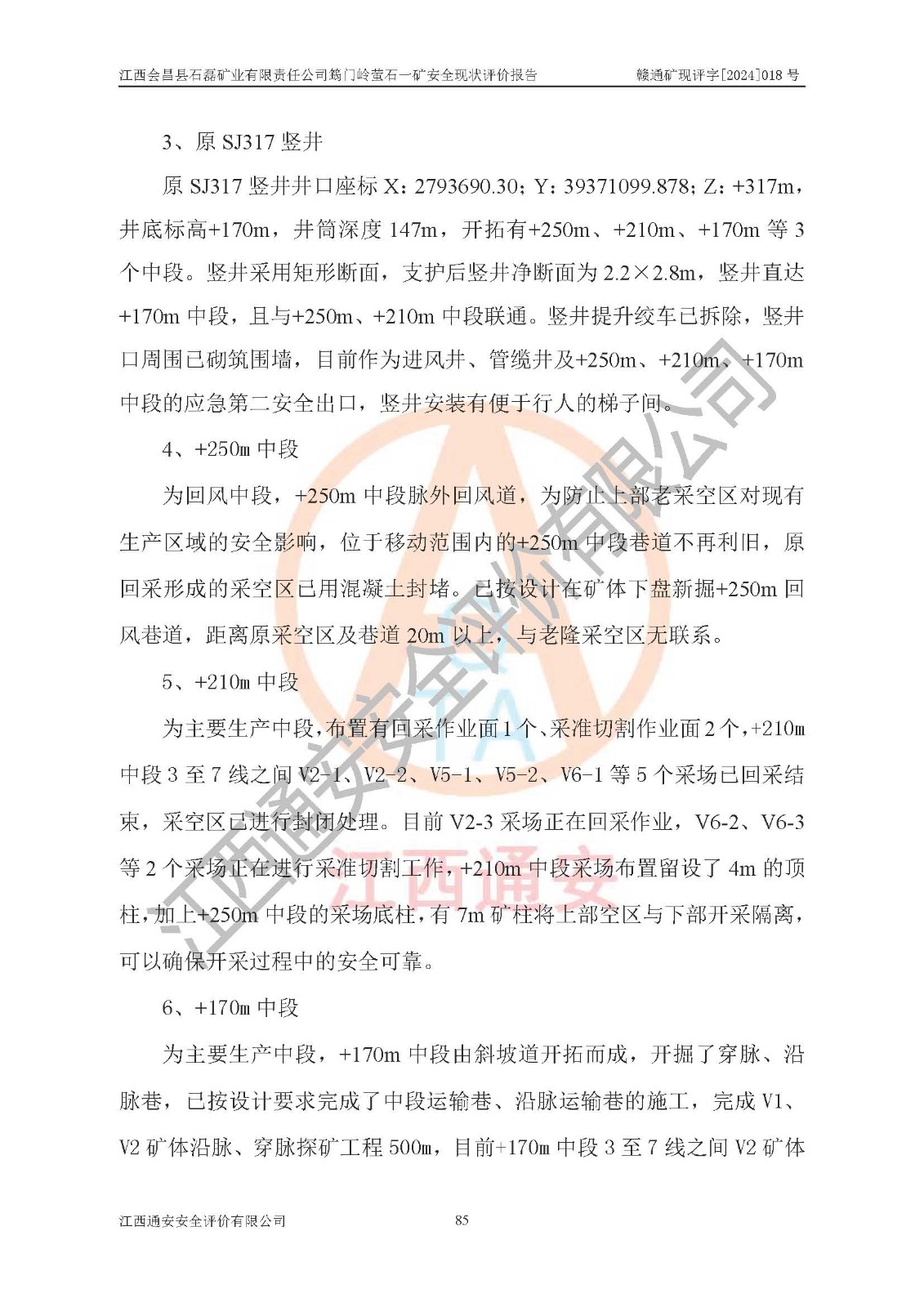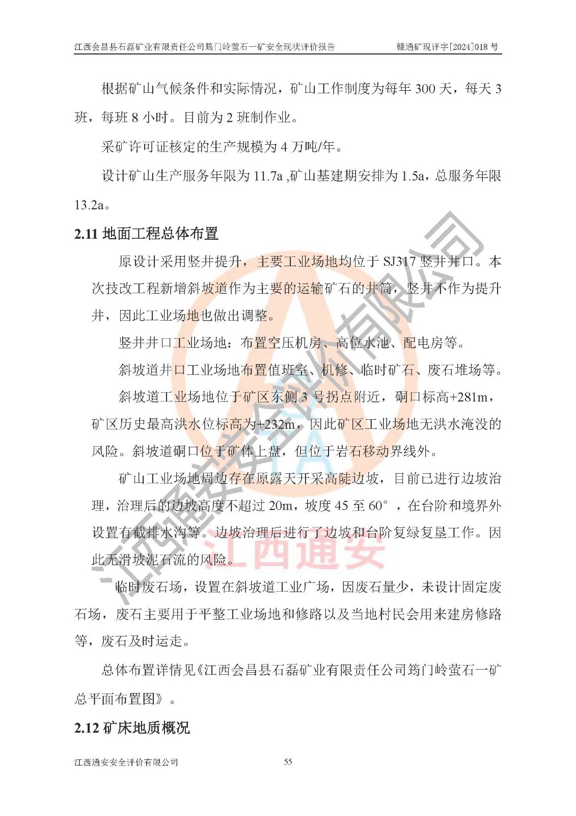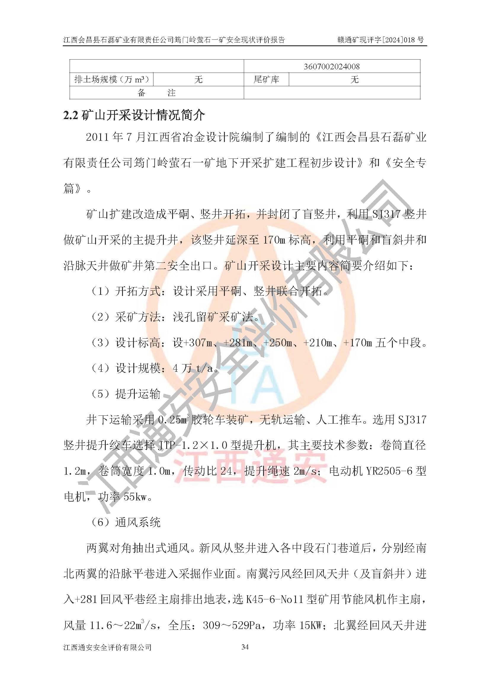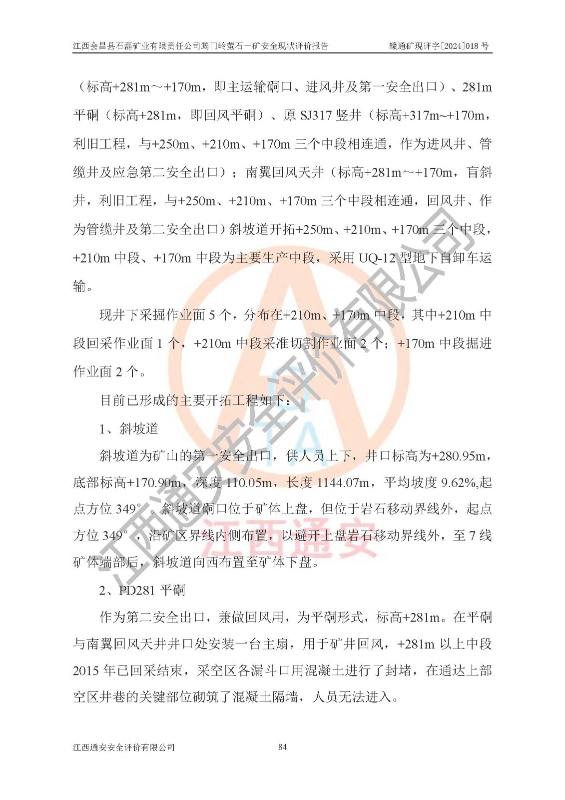 項目簡介 | 江西會昌縣石磊礦業(yè)有限責任公司筠門嶺螢石一礦位于會昌縣城南56km處,行政區(qū)域隸屬會昌縣筠門嶺鎮(zhèn)管轄,礦區(qū)地理位置座標:東經(jīng)115°42′59″~115°43′20″,北緯25°14′16″~25°15′02″,礦區(qū)有簡易公路與清筠線連接,東至筠門嶺鎮(zhèn)2.5km并與206國道相通,北東至贛龍鐵路瑞金站77km,交通較為便利。 2021年12月3日礦山取得江西省應(yīng)急管理廳頒發(fā)的安全生產(chǎn)許可證,證號(贛)FM安許證字[2005]M0091號),企業(yè)名稱:江西會昌縣石磊礦業(yè)有限責任公司,主要負責人:周強,單位地址:會昌縣筠門嶺鎮(zhèn),經(jīng)濟類型:有限責任公司,許可范圍:螢石礦4萬噸/年,斜坡道開拓,+210m、+170m等2個中段地下開采,**期:2021年12月03日至2024年12月02日。 江西會昌縣石磊礦業(yè)有限責任公司于2022年7月20日由江西省自然資源廳延期換發(fā)了《采礦許可證》,證號為:C3607002010026120056649,采礦權(quán)人:江西會昌縣石磊礦業(yè)有限責任公司,企業(yè)類型:有限責任公司;礦山名稱為江西會昌縣石磊礦業(yè)有限責任公司筠門嶺螢石一礦;**期限為2021年12月1日至2025年8月1日,生產(chǎn)規(guī)模4.0萬噸/年,礦區(qū)面積0.4251平方**,開采深度+440m~+100m標高,礦區(qū)范圍由7個拐點圈定。 礦山設(shè)計范圍與2011年編制的《會昌縣筠門嶺螢石一礦地下開采擴建工程初步設(shè)計和安全專篇》一致,即設(shè)計平面范圍礦區(qū)范圍內(nèi)0線至9線,垂直范圍為+281m至+170m標高間的螢石礦體。斜坡道開拓+250m、+210m、170m中段,設(shè)計礦山生產(chǎn)能力為: 4萬t/a,采用無底柱淺孔留礦法采礦,通風方式為單翼對角抽出式機械通風,風機型號為FKZ-****1的主扇,功率45kw,建設(shè)規(guī)模1.5萬噸/年,服務(wù)年限11.7年。 礦山現(xiàn)采用斜坡道開拓,斜坡道作為礦石、廢石、人員上下的主要通道,原SJ317豎井提升絞車已拆除,豎井口周圍已砌筑圍墻,目前作為管纜井及進風井,不再進行礦、廢石、人員提升。斜坡道共開拓了+250m、+210m、+170m等三個中段,其中+210m中段、+170m中段為主要生產(chǎn)中段,采用UQ-12型地下自卸車運輸。目前,+210m中段3至7線之間V2-1、V2-2、V5-1、V5-2、V6-1等5個采場已回采結(jié)束,采空區(qū)已進行封閉處理,V2-3采場正在回采作業(yè),V6-2、V6-3等2個采場正在進行采準切割作業(yè),+170m中段3至7線之間V2礦體南翼布置穿、沿脈探礦掘進作業(yè)面2個,已掘進80m。 | ||||