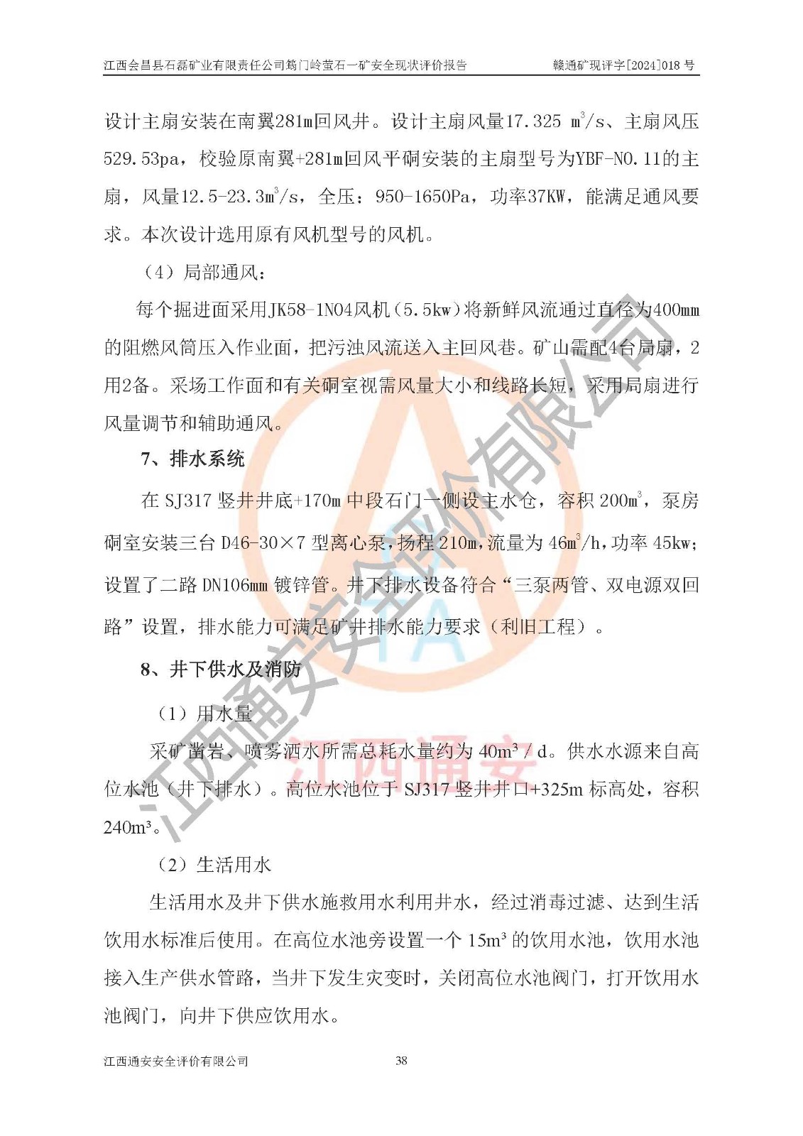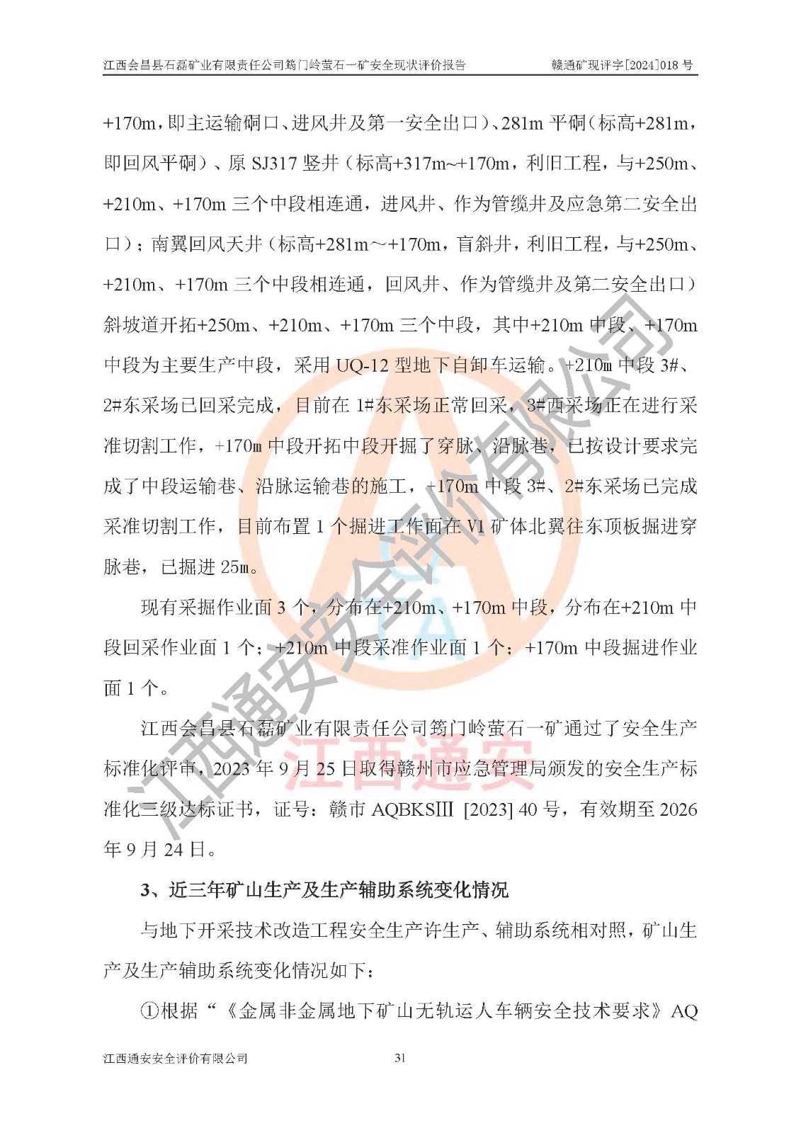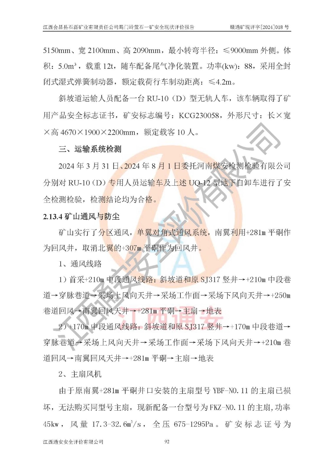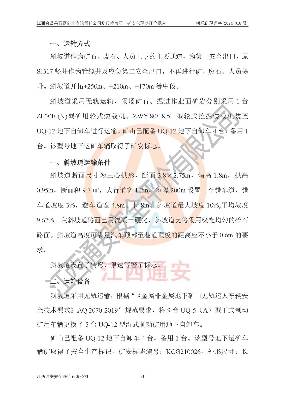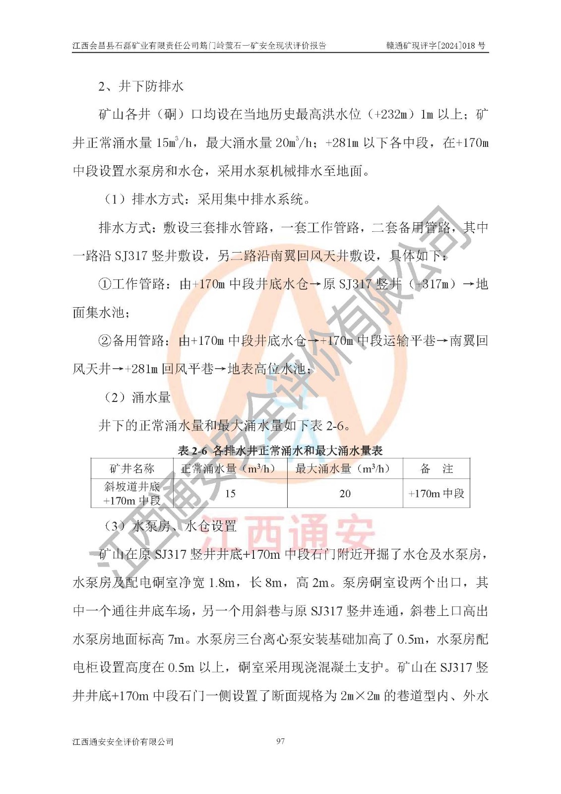 項目簡介 | 江西會昌縣石磊礦業(yè)有限責任公司筠門嶺螢石一礦位于會昌縣城南56km處,行政區(qū)域隸屬會昌縣筠門嶺鎮(zhèn)管轄,礦區(qū)地理位置座標:東經(jīng)115°42′59″~115°43′20″,北緯25°14′16″~25°15′02″,礦區(qū)有簡易公路與清筠線連接,東至筠門嶺鎮(zhèn)2.5km并與206國道相通,北東至贛龍鐵路瑞金站77km,交通較為便利。 2021年12月3日礦山取得江西省應(yīng)急管理廳頒發(fā)的安全生產(chǎn)許可證,證號(贛)FM安許證字[2005]M0091號),企業(yè)名稱:江西會昌縣石磊礦業(yè)有限責任公司,主要負責人:周強,單位地址:會昌縣筠門嶺鎮(zhèn),經(jīng)濟類型:有限責任公司,許可范圍:螢石礦4萬噸/年,斜坡道開拓,+210m、+170m等2個中段地下開采,**期:2021年12月03日至2024年12月02日。 江西會昌縣石磊礦業(yè)有限責任公司于2022年7月20日由江西省自然資源廳延期換發(fā)了《采礦許可證》,證號為:C3607002010026120056649,采礦權(quán)人:江西會昌縣石磊礦業(yè)有限責任公司,企業(yè)類型:有限責任公司;礦山名稱為江西會昌縣石磊礦業(yè)有限責任公司筠門嶺螢石一礦;**期限為2021年12月1日至2025年8月1日,生產(chǎn)規(guī)模4.0萬噸/年,礦區(qū)面積0.4251平方**,開采深度+440m~+100m標高,礦區(qū)范圍由7個拐點圈定。 礦山設(shè)計范圍與2011年編制的《會昌縣筠門嶺螢石一礦地下開采擴建工程初步設(shè)計和安全專篇》一致,即設(shè)計平面范圍礦區(qū)范圍內(nèi)0線至9線,垂直范圍為+281m至+170m標高間的螢石礦體。斜坡道開拓+250m、+210m、170m中段,設(shè)計礦山生產(chǎn)能力為: 4萬t/a,采用無底柱淺孔留礦法采礦,通風方式為單翼對角抽出式機械通風,風機型號為FKZ-****1的主扇,功率45kw,建設(shè)規(guī)模1.5萬噸/年,服務(wù)年限11.7年。 礦山現(xiàn)采用斜坡道開拓,斜坡道作為礦石、廢石、人員上下的主要通道,原SJ317豎井提升絞車已拆除,豎井口周圍已砌筑圍墻,目前作為管纜井及進風井,不再進行礦、廢石、人員提升。斜坡道共開拓了+250m、+210m、+170m等三個中段,其中+210m中段、+170m中段為主要生產(chǎn)中段,采用UQ-12型地下自卸車運輸。目前,+210m中段3至7線之間V2-1、V2-2、V5-1、V5-2、V6-1等5個采場已回采結(jié)束,采空區(qū)已進行封閉處理,V2-3采場正在回采作業(yè),V6-2、V6-3等2個采場正在進行采準切割作業(yè),+170m中段3至7線之間V2礦體南翼布置穿、沿脈探礦掘進作業(yè)面2個,已掘進80m。 | ||||