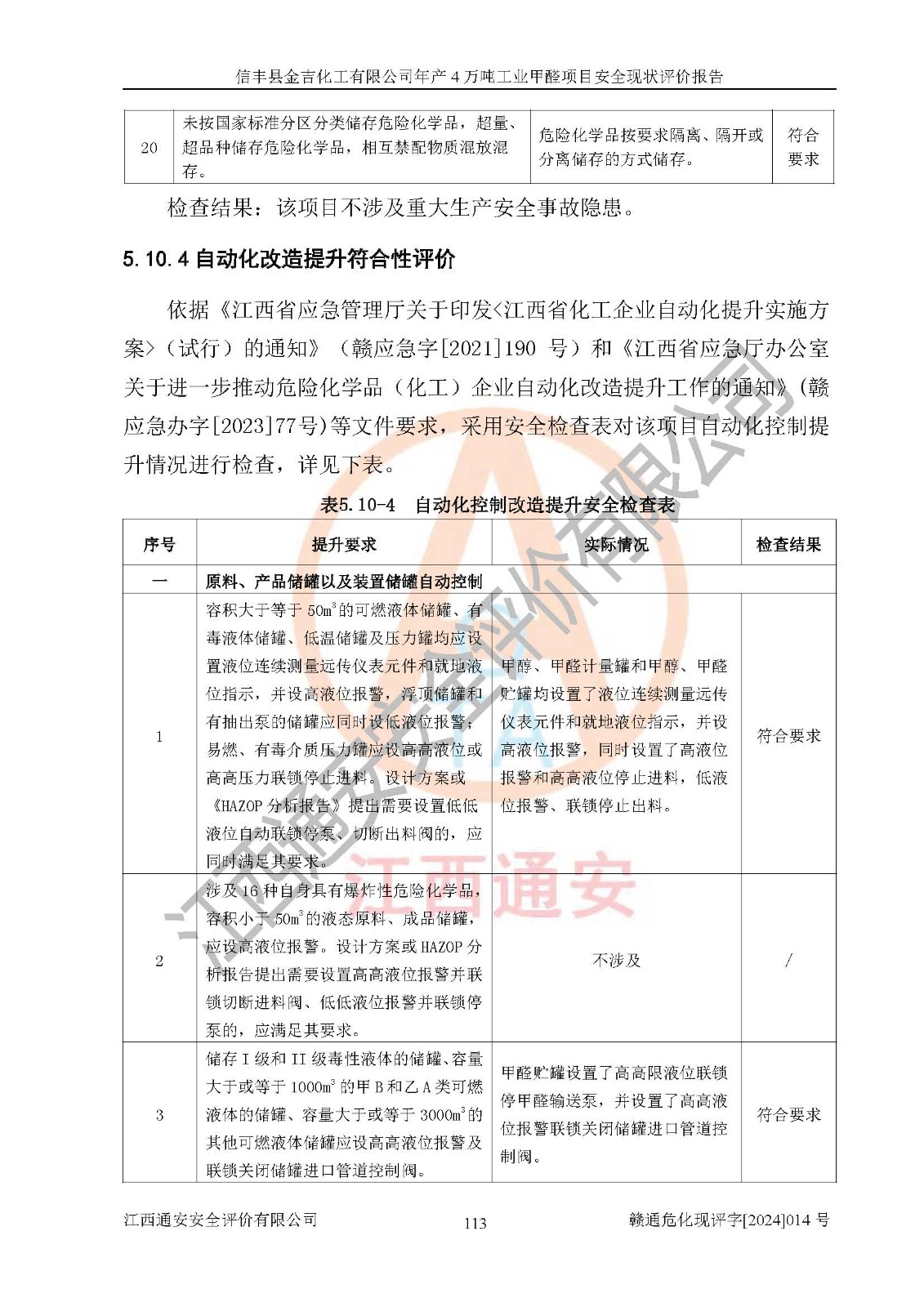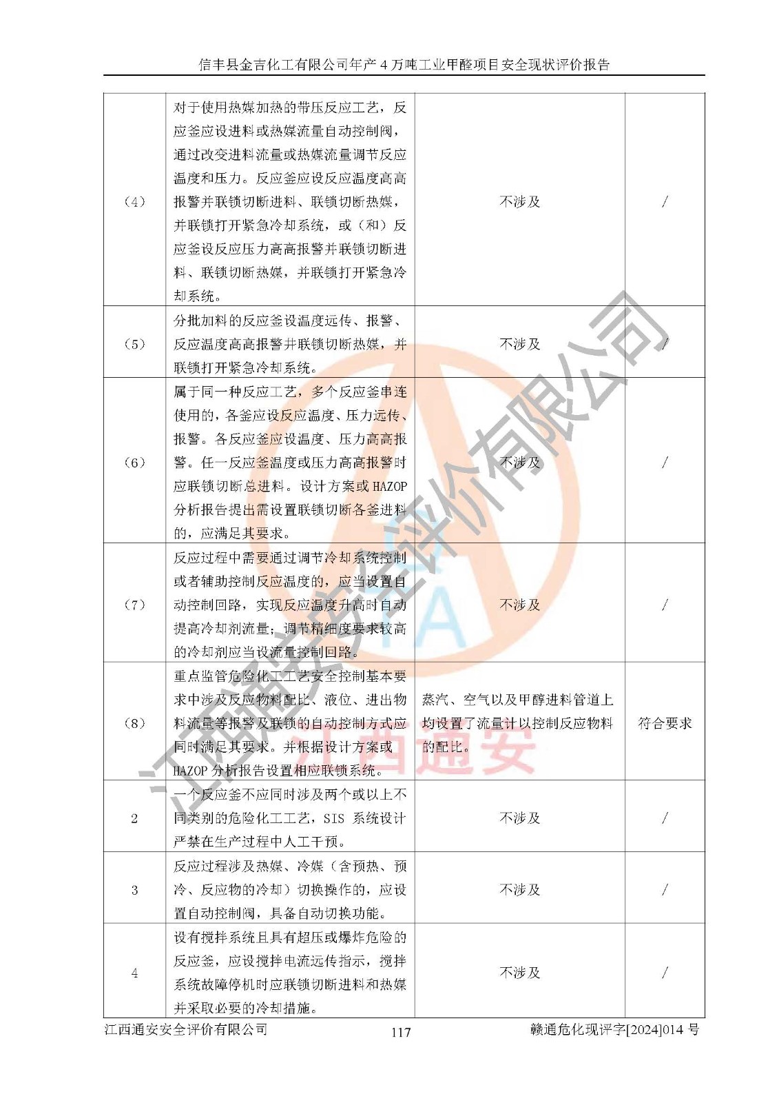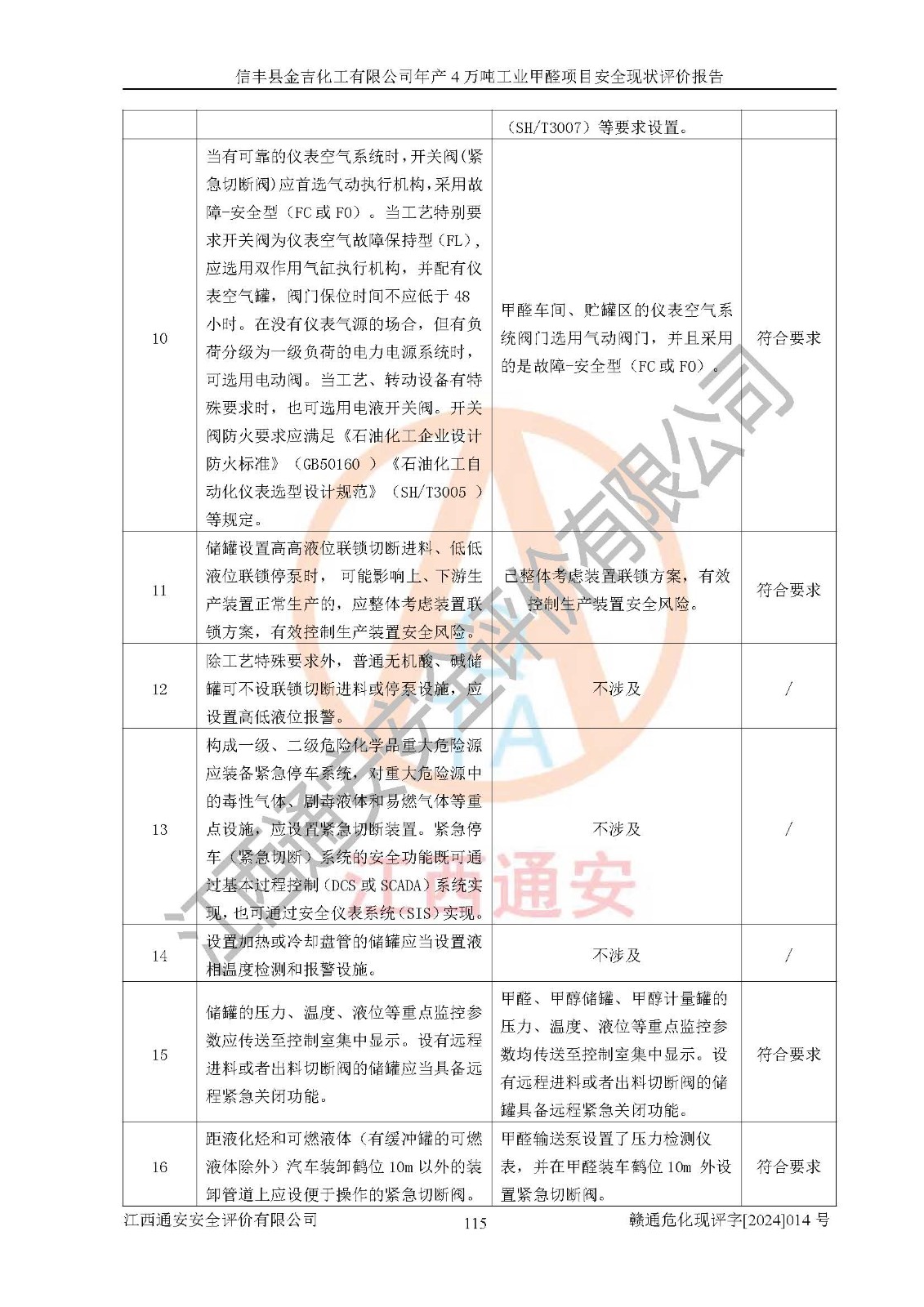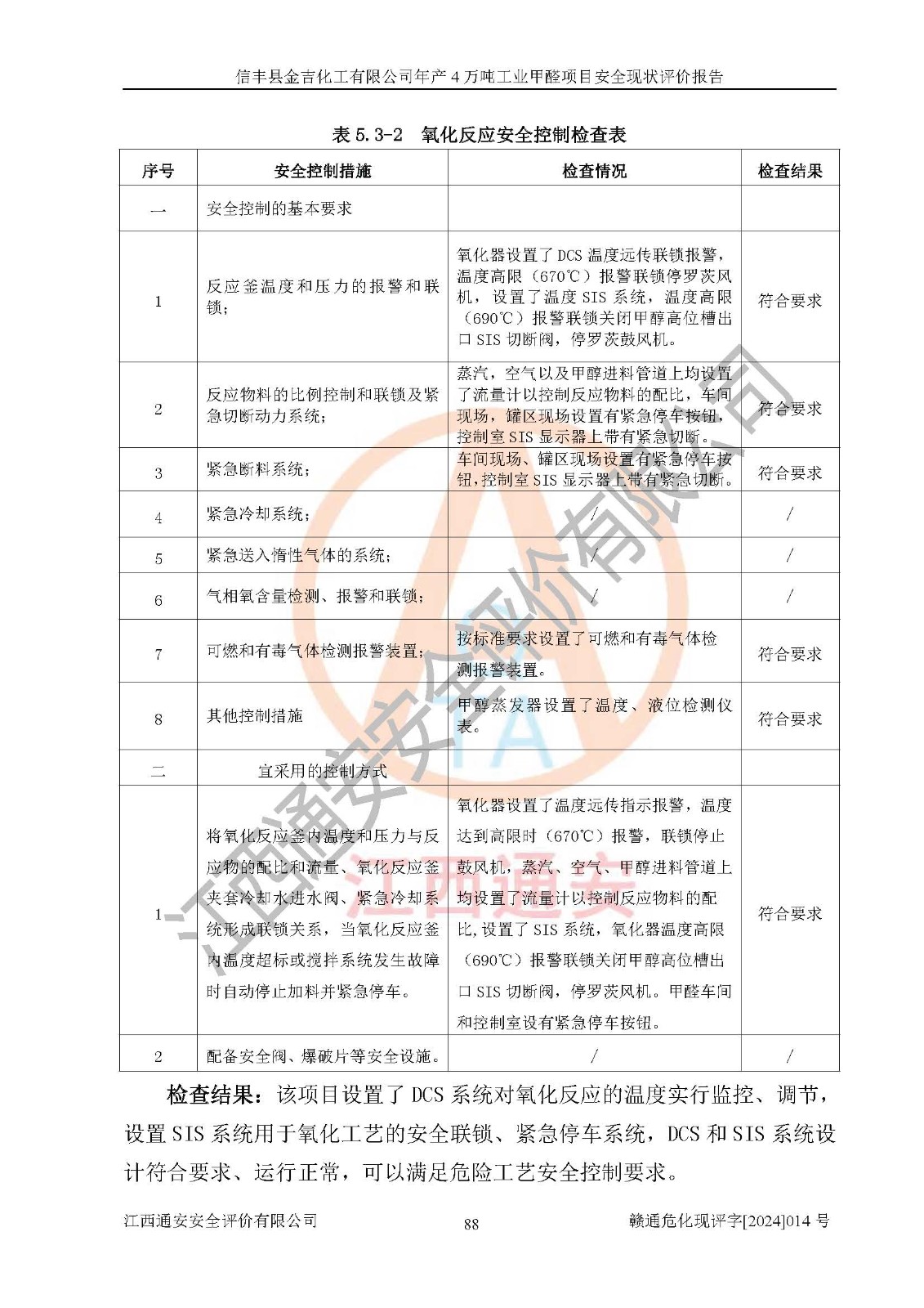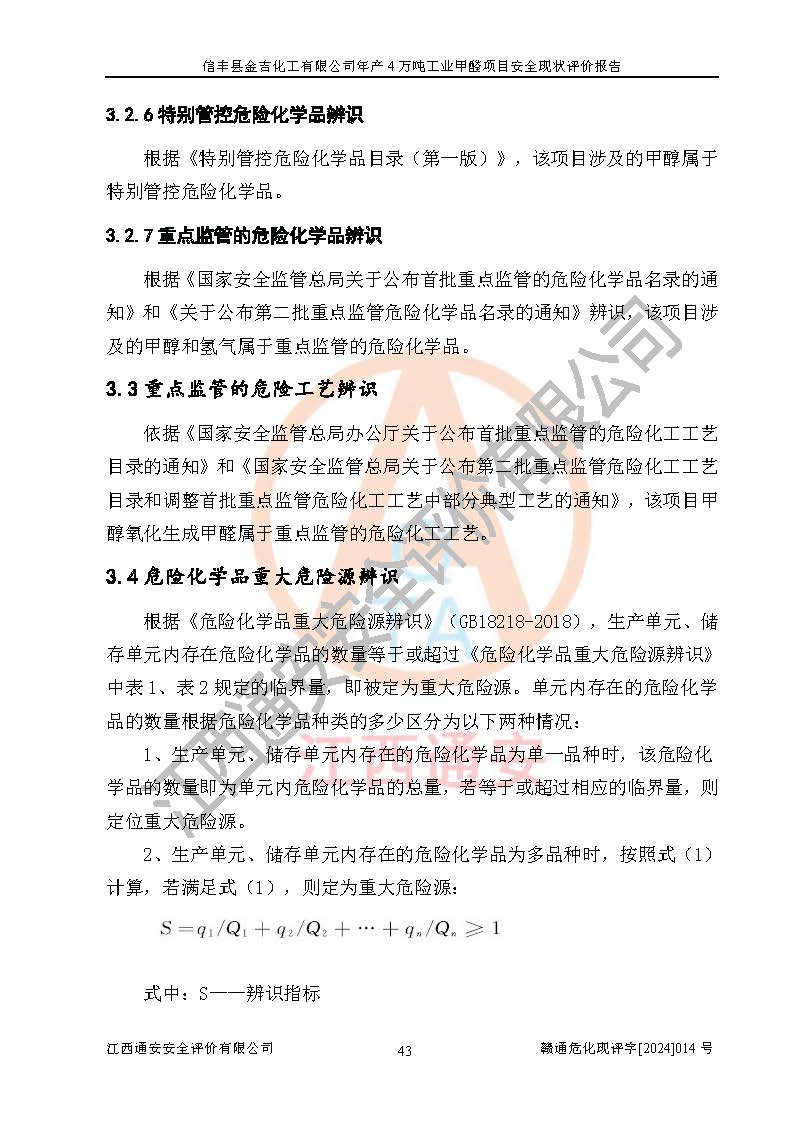 評價結(jié)論 | 信豐縣金吉化工有限公司年產(chǎn)4萬噸工業(yè)甲醛項目現(xiàn)場情況與設計圖紙一致,DCS和SIS系統(tǒng)設計符合要求、運行正常,有關(guān)從業(yè)人員資質(zhì)符合《江西省危險化學品安全專項整治三年行動實施方案》要求,安全設施及安全管理符合法律、法規(guī)、標準的要求,安全風險是受控制的,其風險程度是可以接受的,安全設施符合安全生產(chǎn)條件,能夠滿足安全生產(chǎn)的要求。 | ||||||