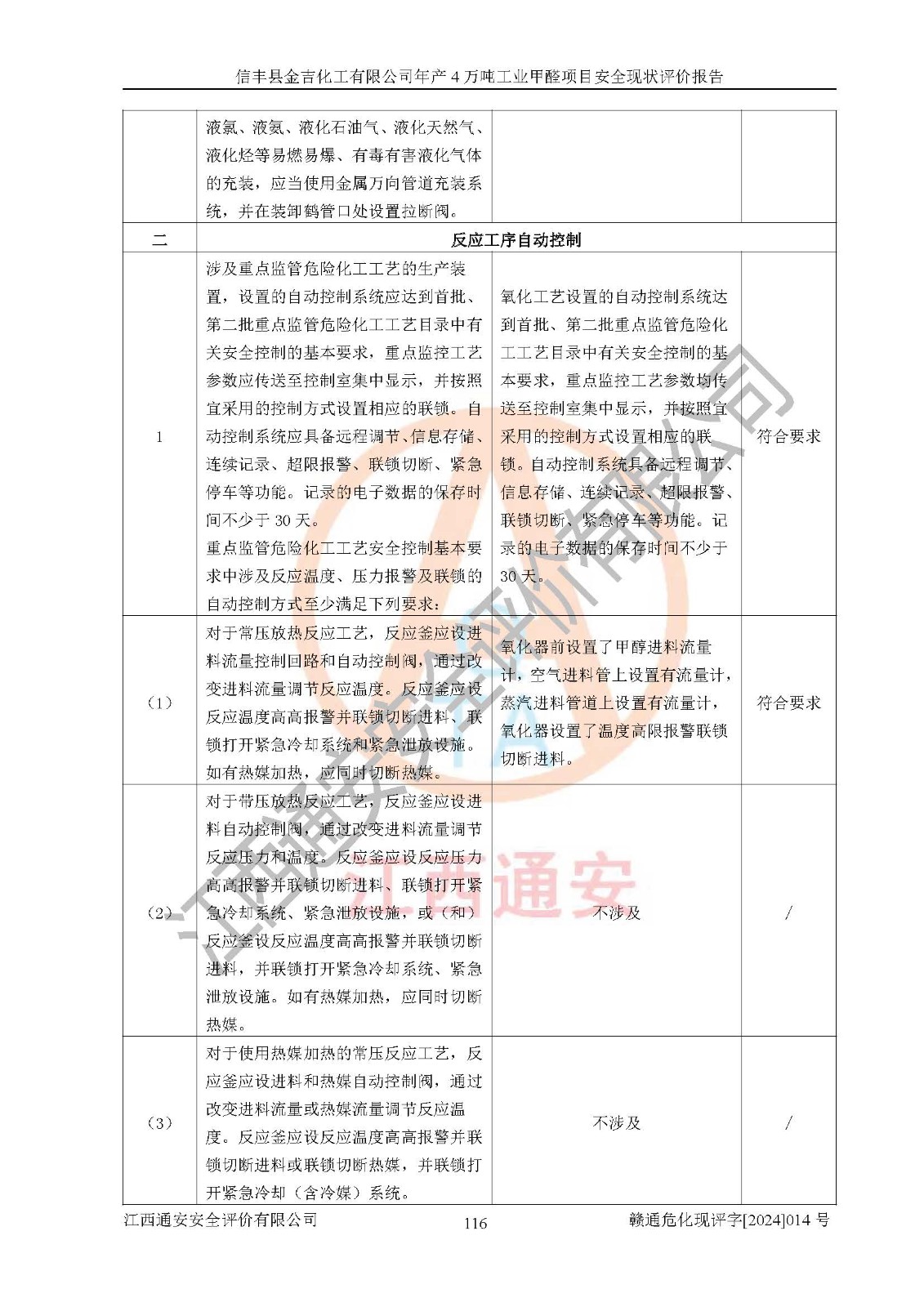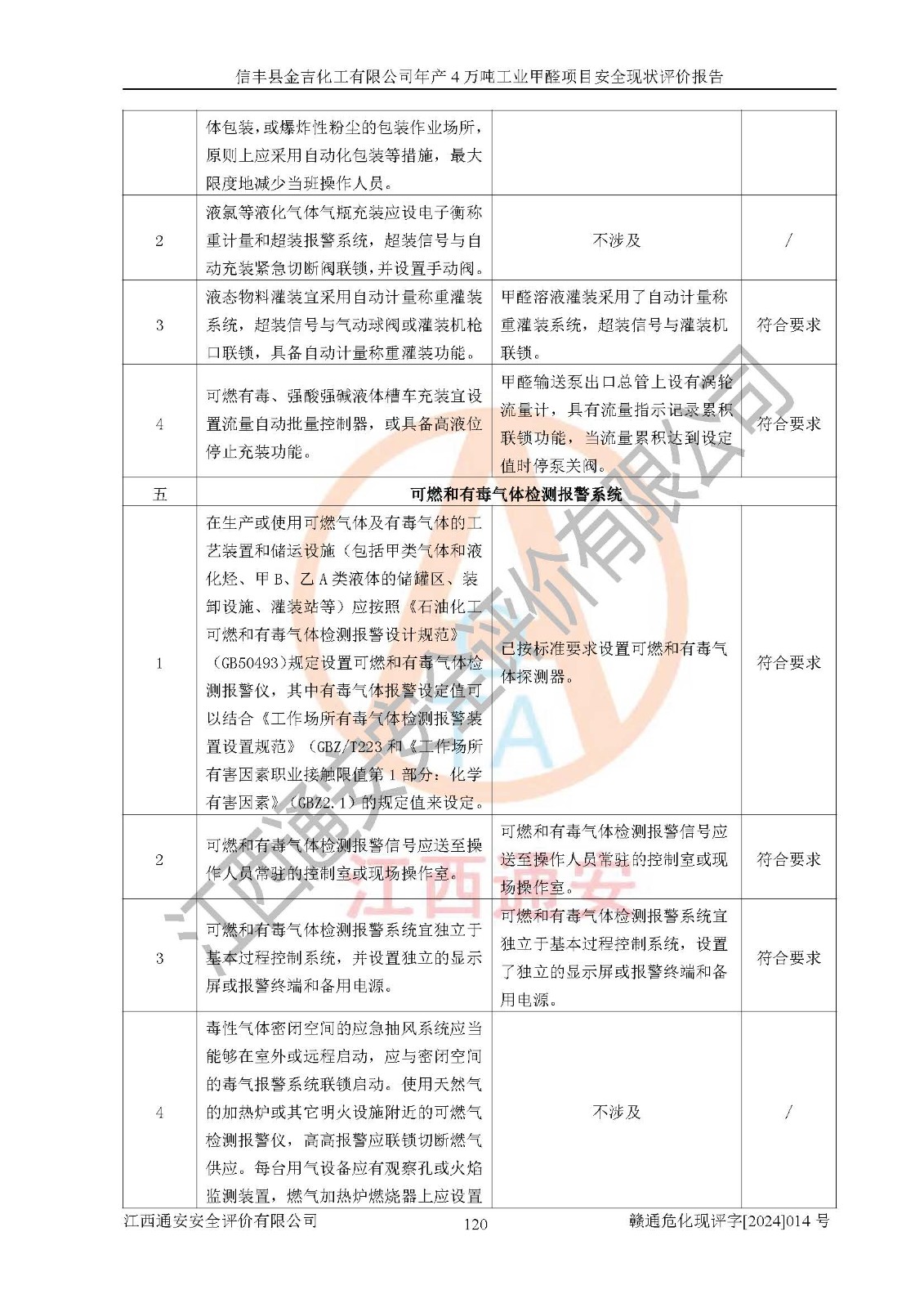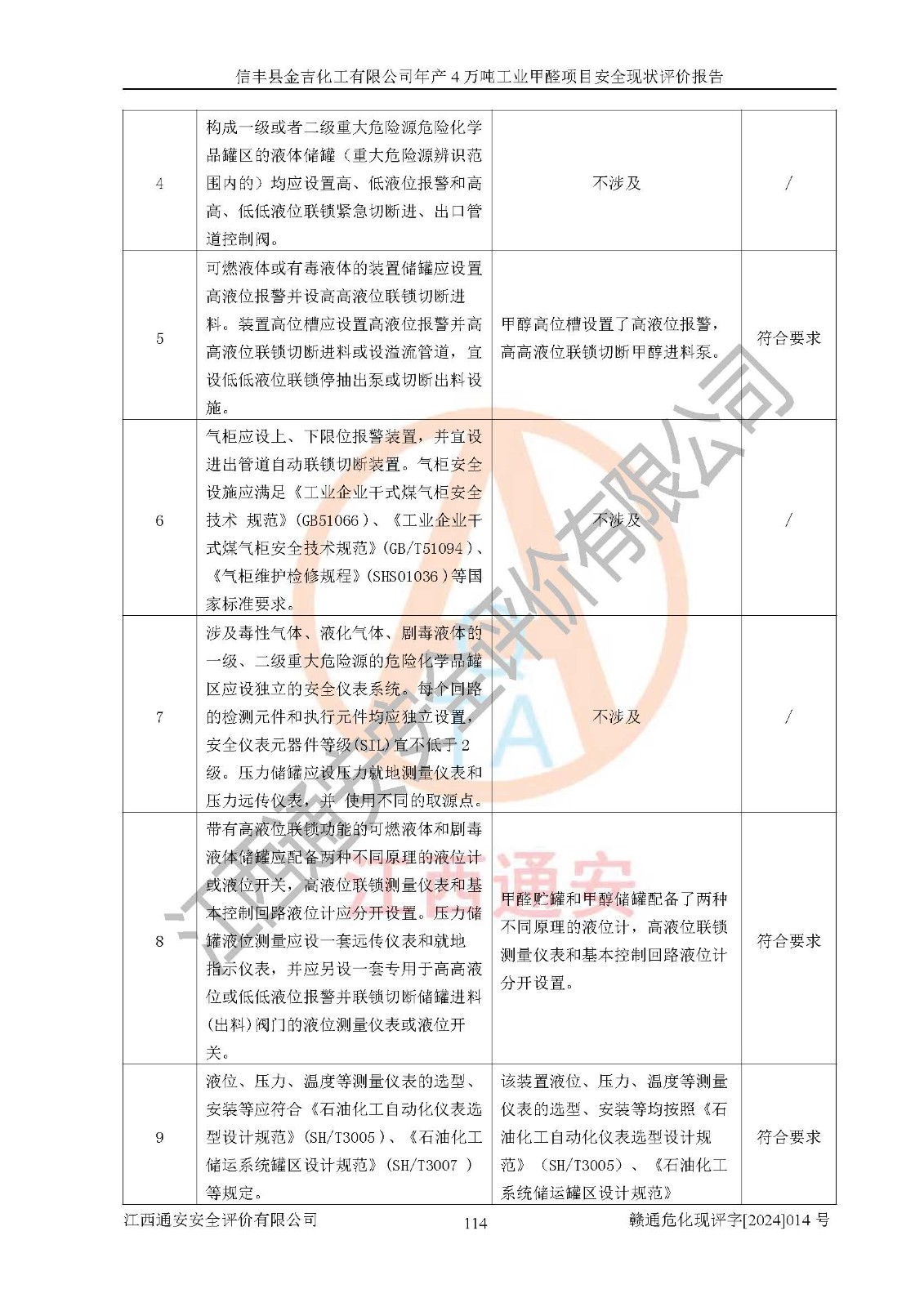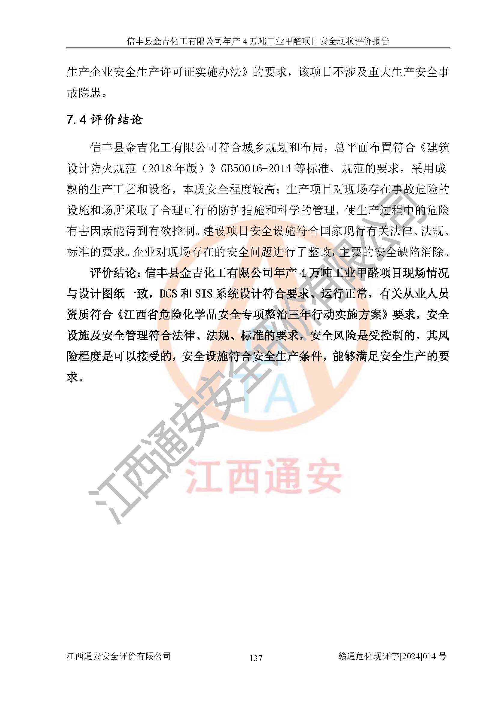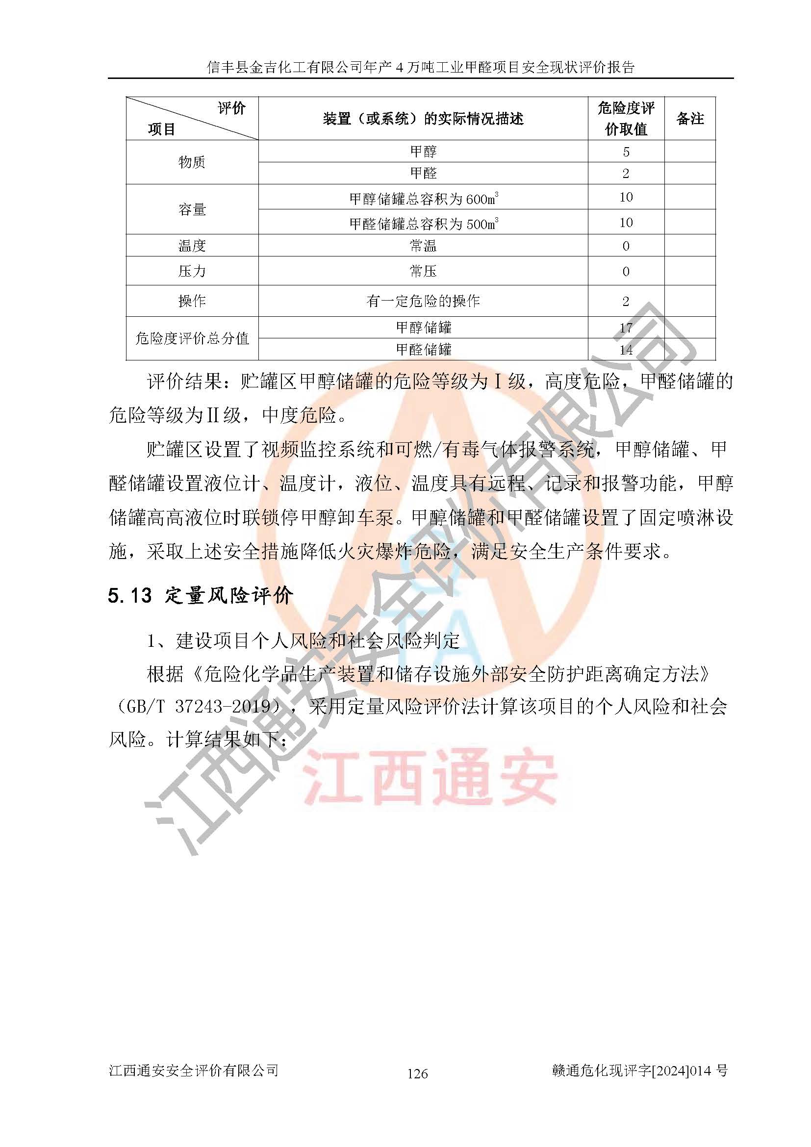 評價結(jié)論 | 信豐縣金吉化工有限公司年產(chǎn)4萬噸工業(yè)甲醛項目現(xiàn)場情況與設計圖紙一致,DCS和SIS系統(tǒng)設計符合要求、運行正常,有關(guān)從業(yè)人員資質(zhì)符合《江西省危險化學品安全專項整治三年行動實施方案》要求,安全設施及安全管理符合法律、法規(guī)、標準的要求,安全風險是受控制的,其風險程度是可以接受的,安全設施符合安全生產(chǎn)條件,能夠滿足安全生產(chǎn)的要求。 | ||||||