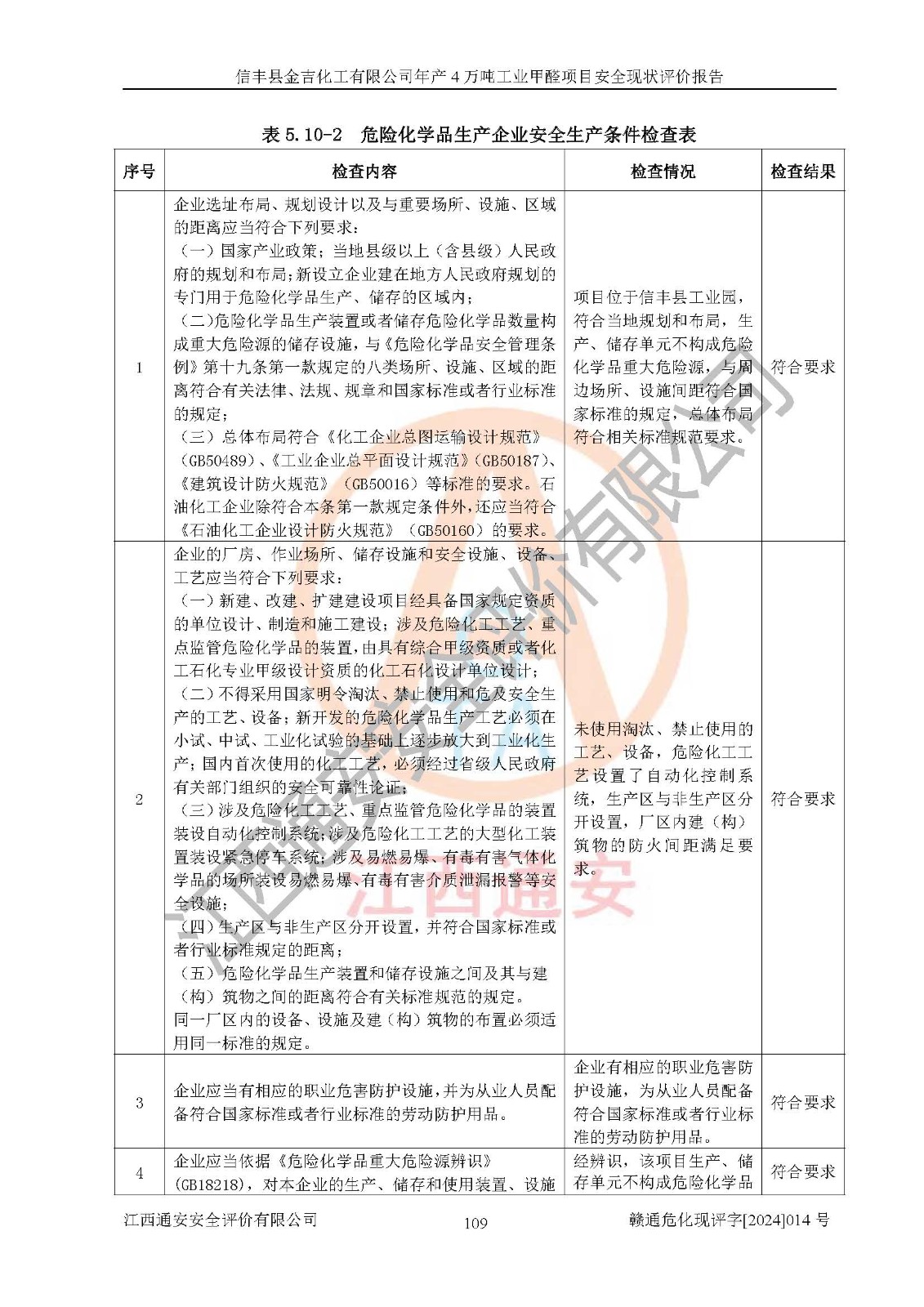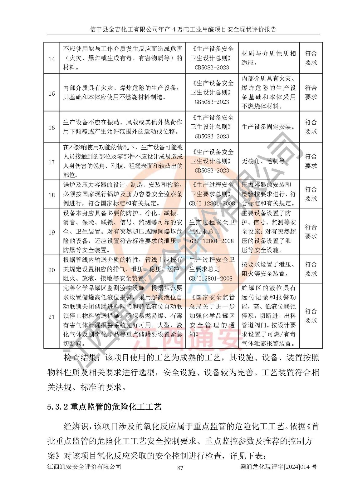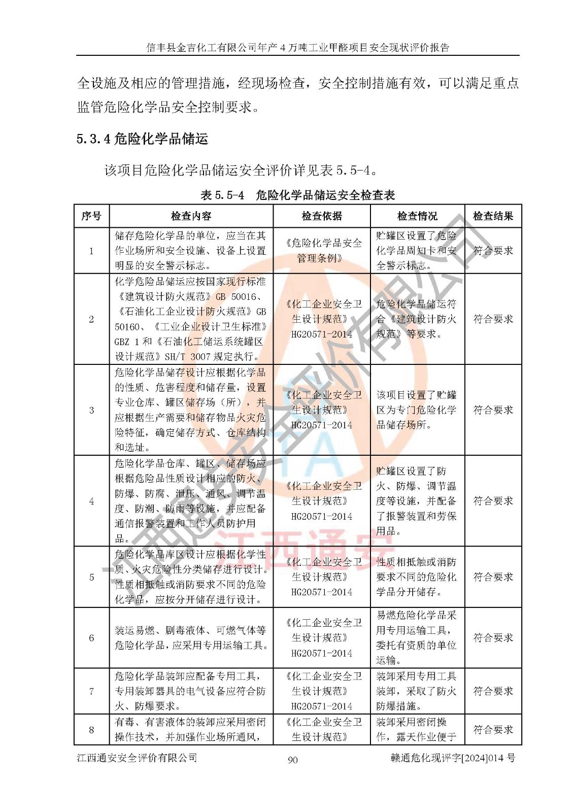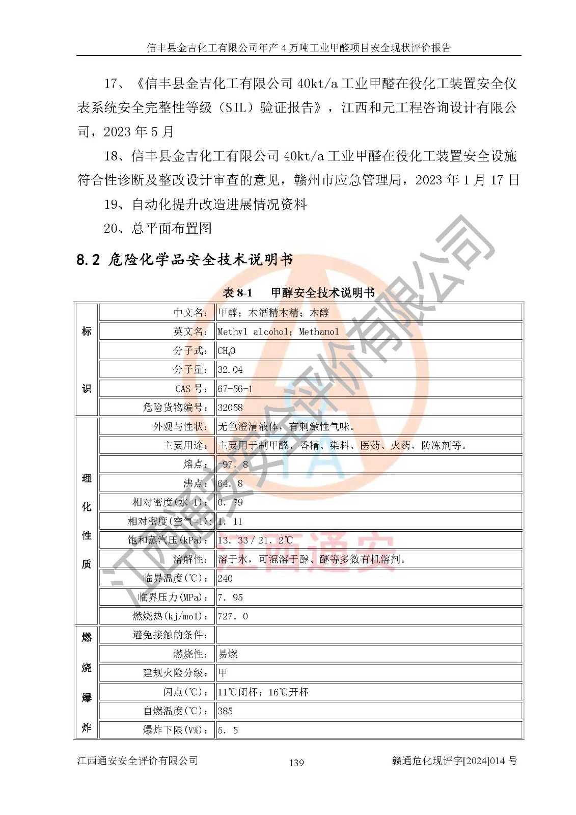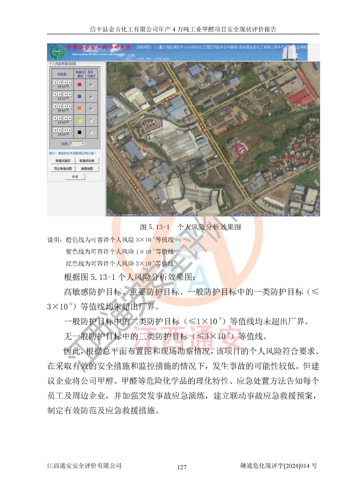 評價結(jié)論 | 信豐縣金吉化工有限公司年產(chǎn)4萬噸工業(yè)甲醛項目現(xiàn)場情況與設計圖紙一致,DCS和SIS系統(tǒng)設計符合要求、運行正常,有關(guān)從業(yè)人員資質(zhì)符合《江西省危險化學品安全專項整治三年行動實施方案》要求,安全設施及安全管理符合法律、法規(guī)、標準的要求,安全風險是受控制的,其風險程度是可以接受的,安全設施符合安全生產(chǎn)條件,能夠滿足安全生產(chǎn)的要求。 | ||||||