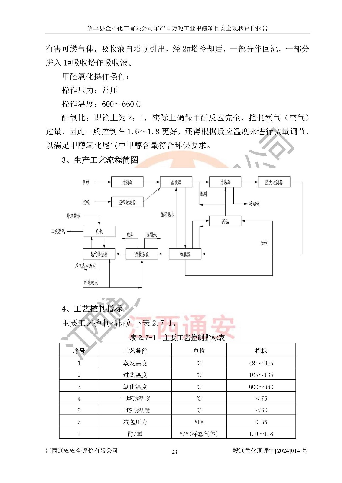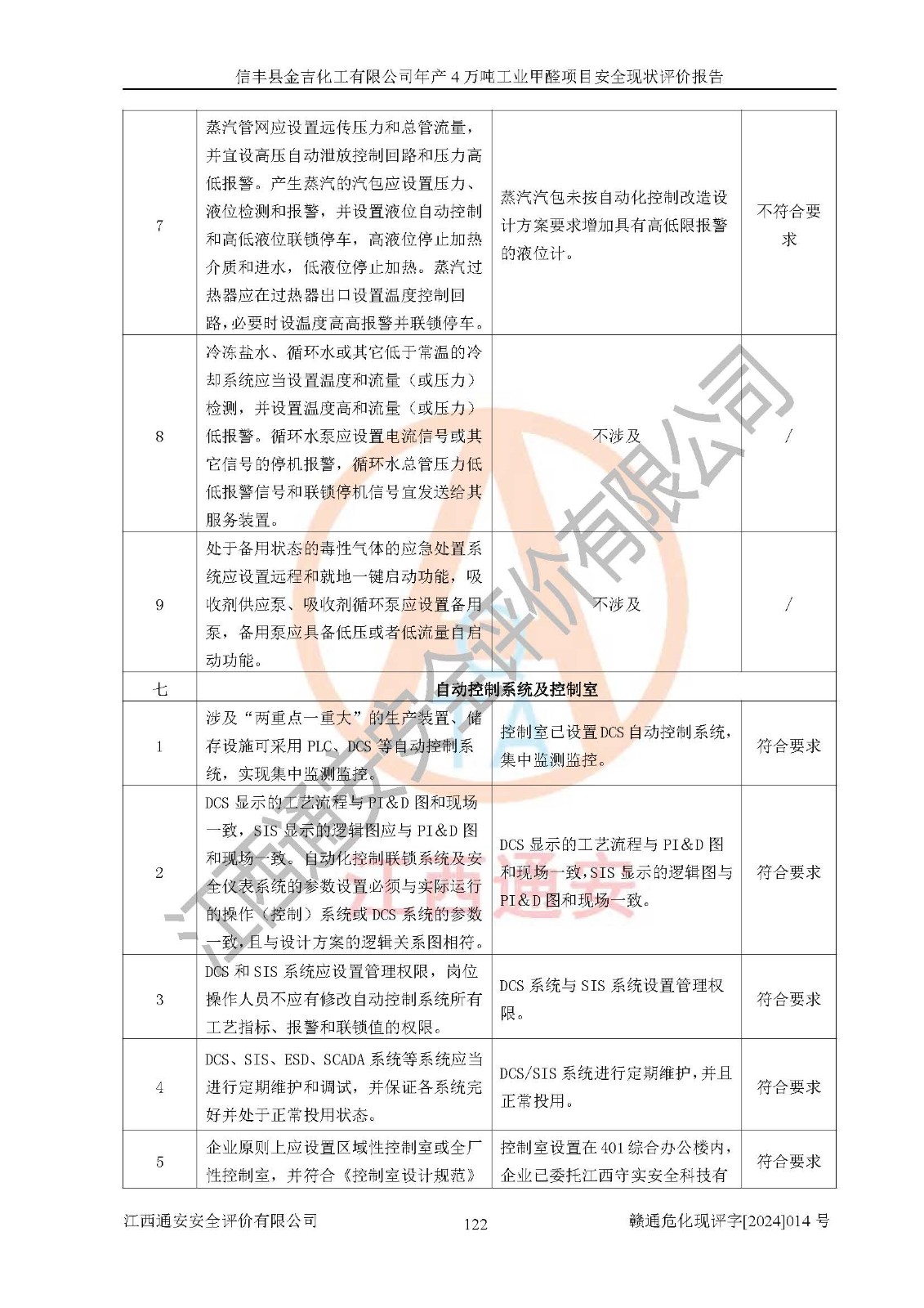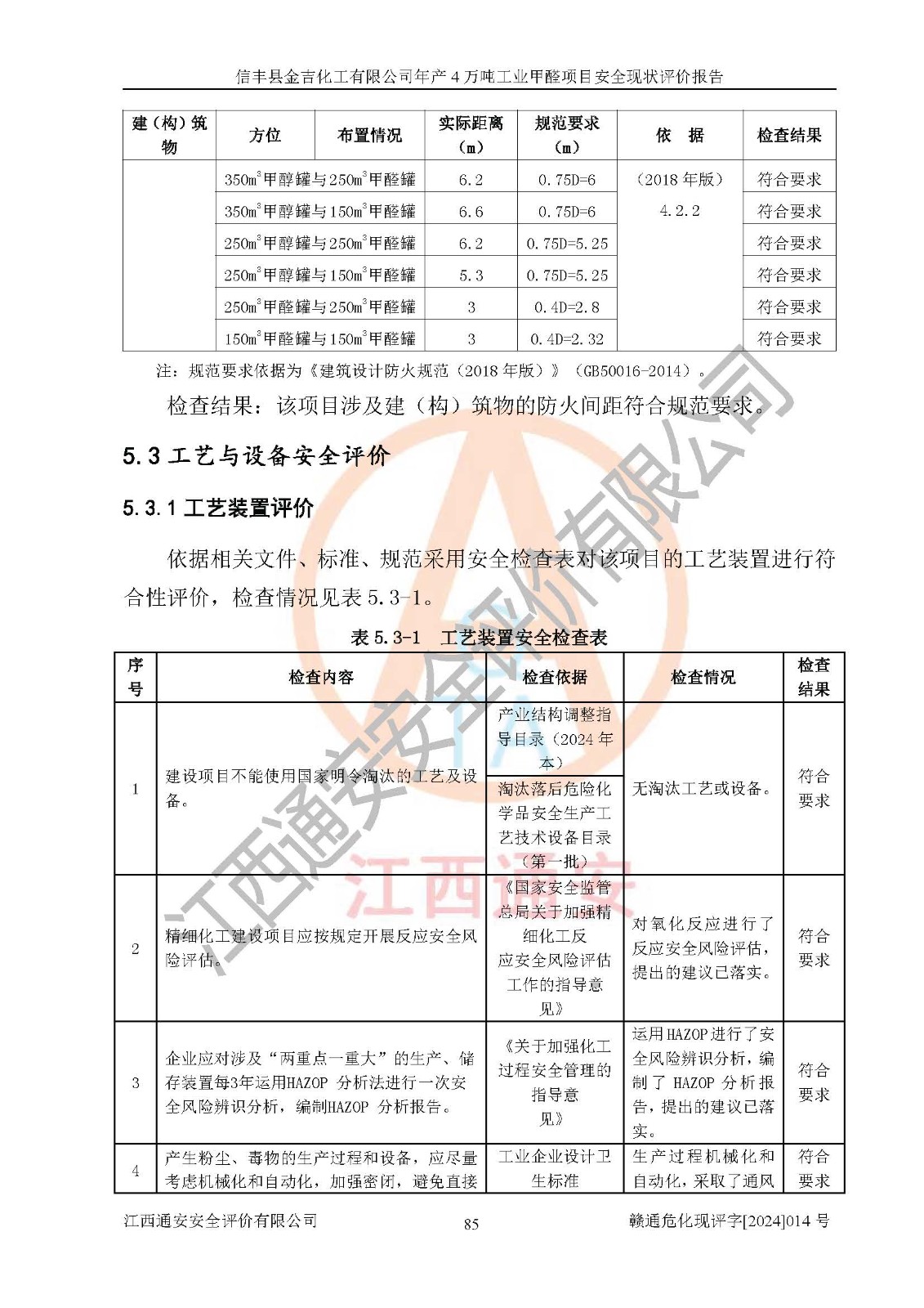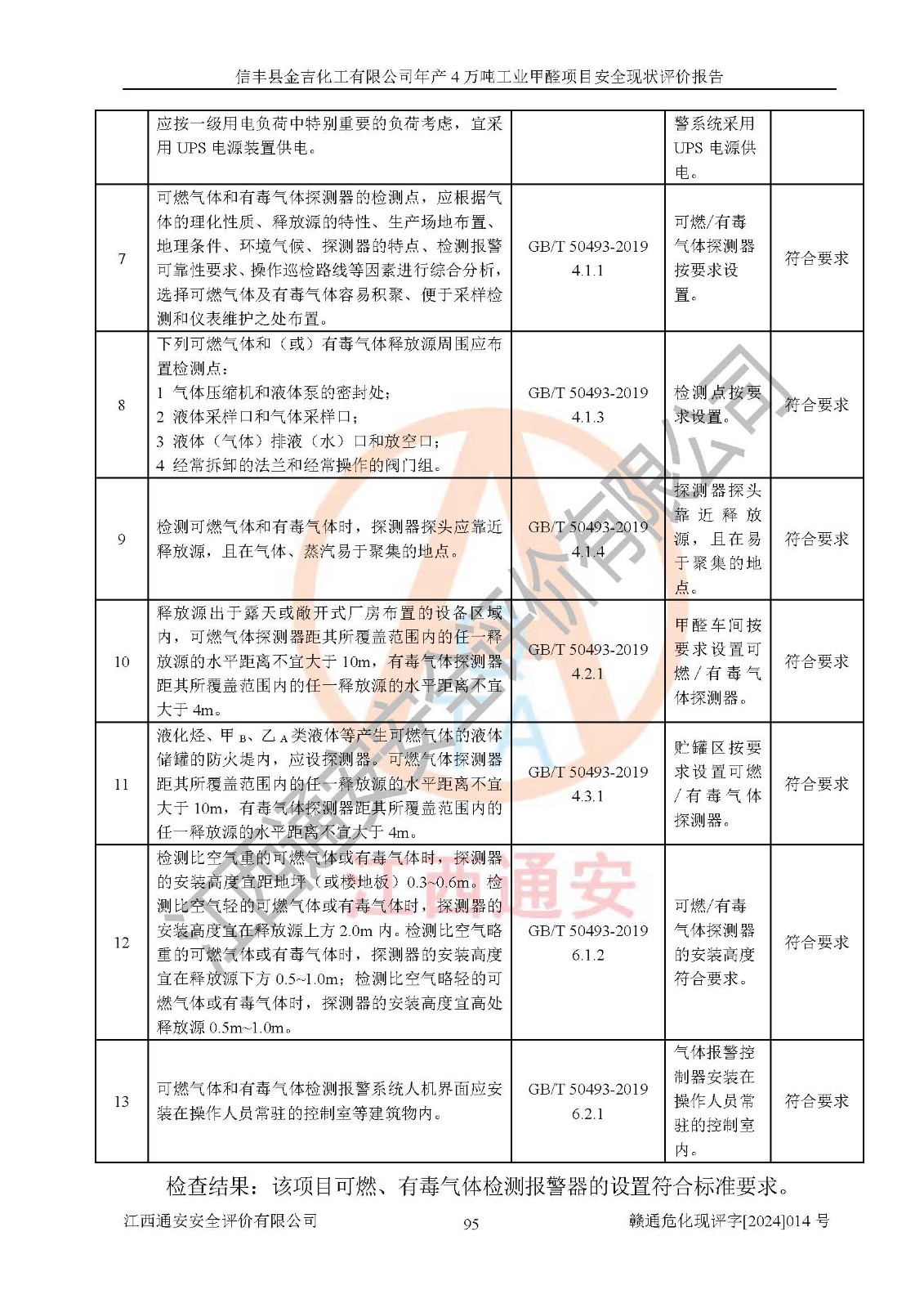 評價結(jié)論 | 信豐縣金吉化工有限公司年產(chǎn)4萬噸工業(yè)甲醛項目現(xiàn)場情況與設計圖紙一致,DCS和SIS系統(tǒng)設計符合要求、運行正常,有關(guān)從業(yè)人員資質(zhì)符合《江西省危險化學品安全專項整治三年行動實施方案》要求,安全設施及安全管理符合法律、法規(guī)、標準的要求,安全風險是受控制的,其風險程度是可以接受的,安全設施符合安全生產(chǎn)條件,能夠滿足安全生產(chǎn)的要求。 | ||||||