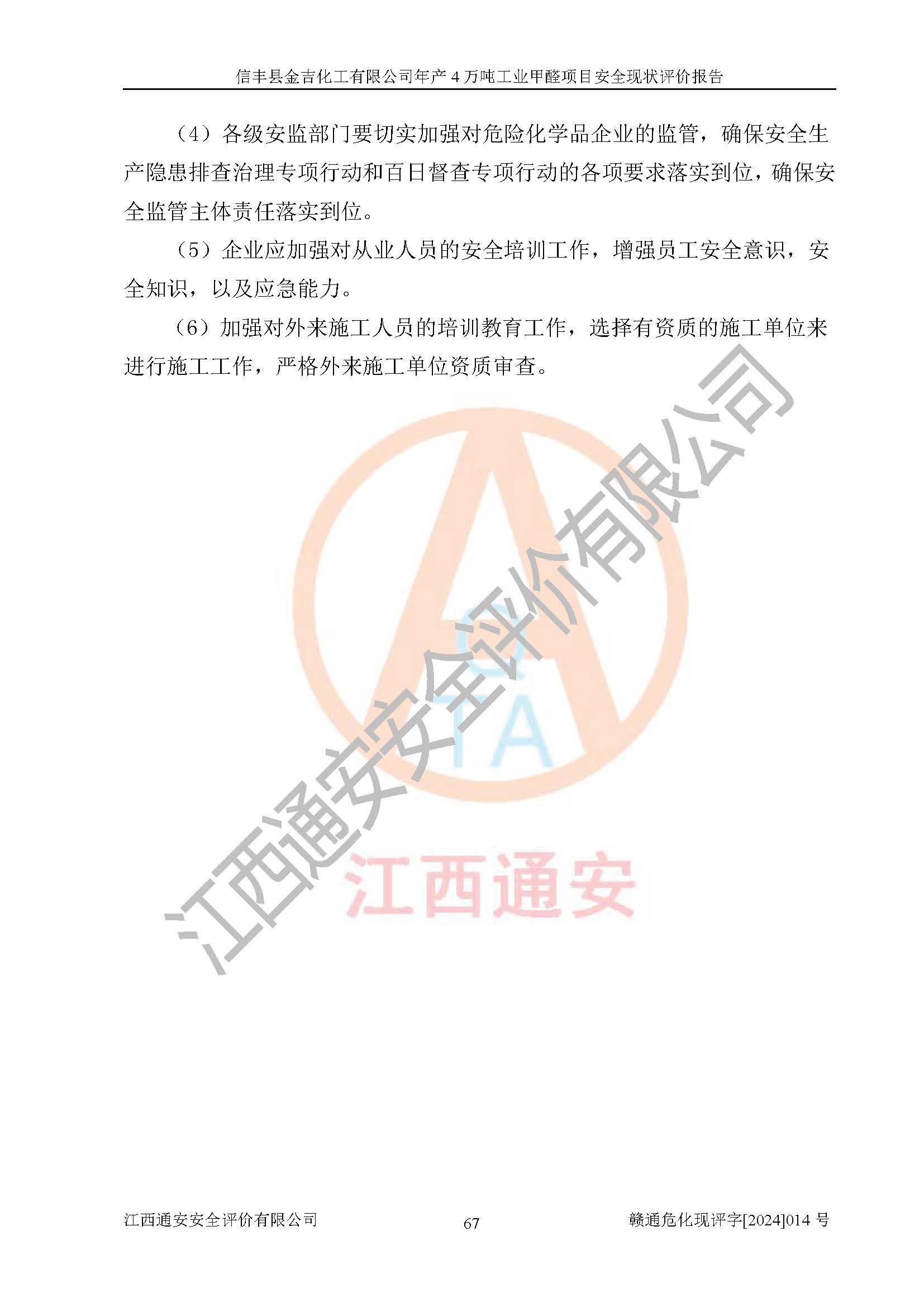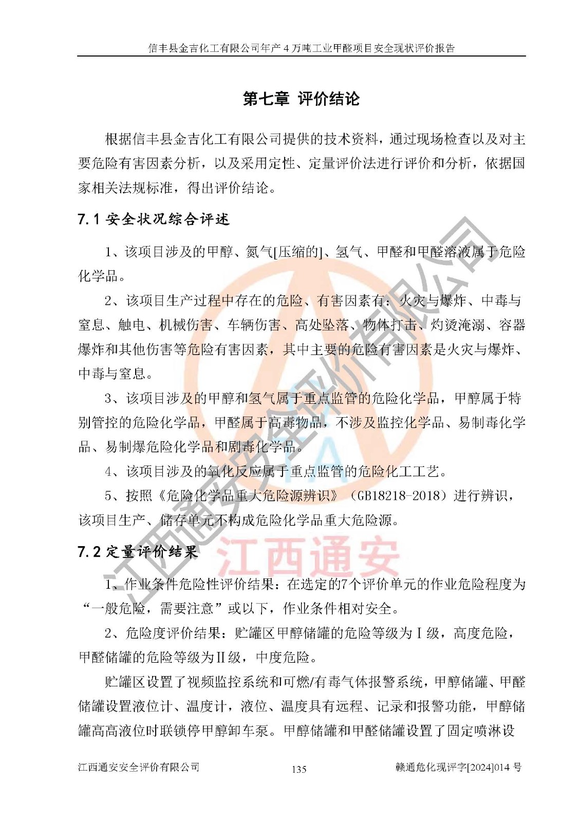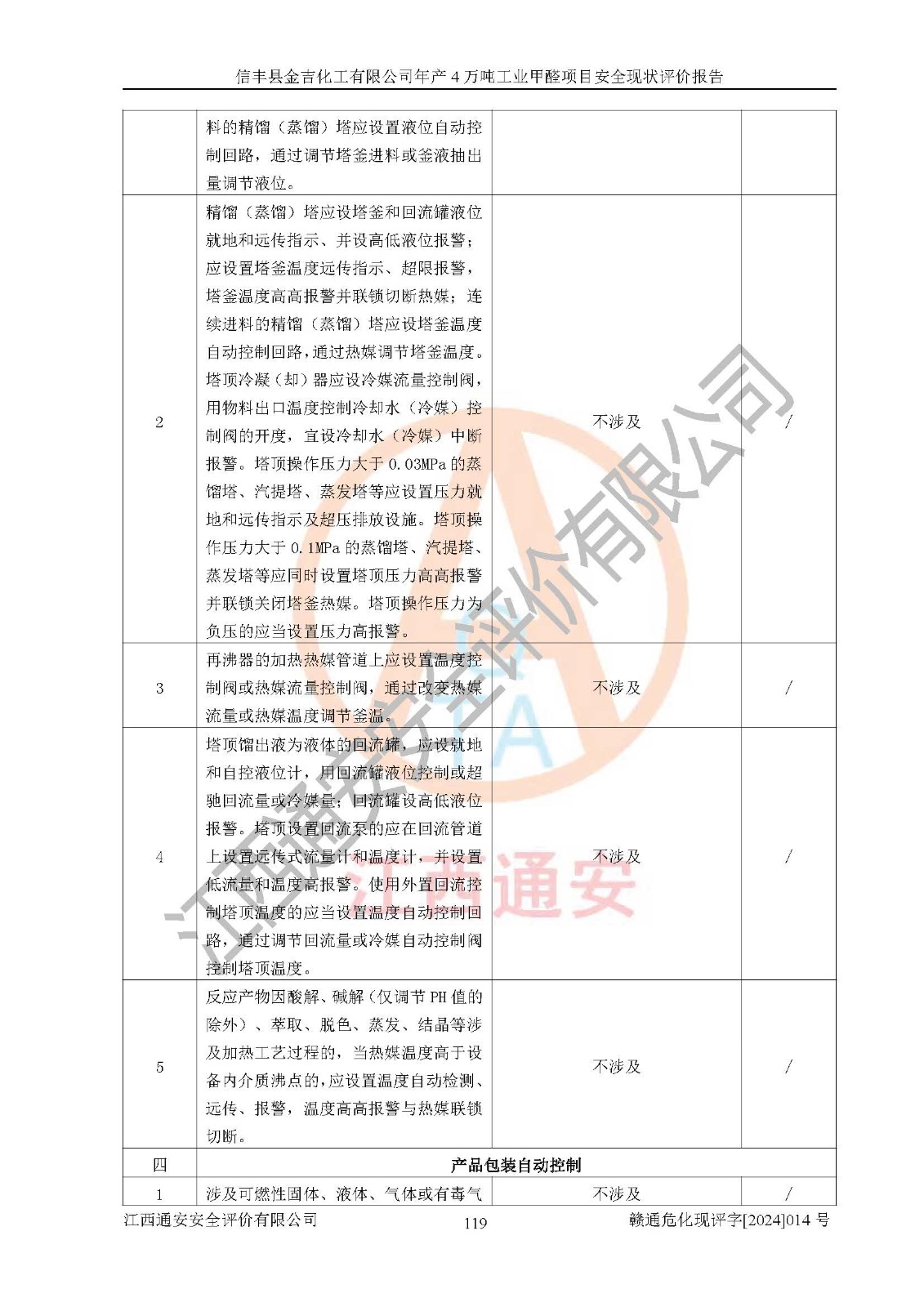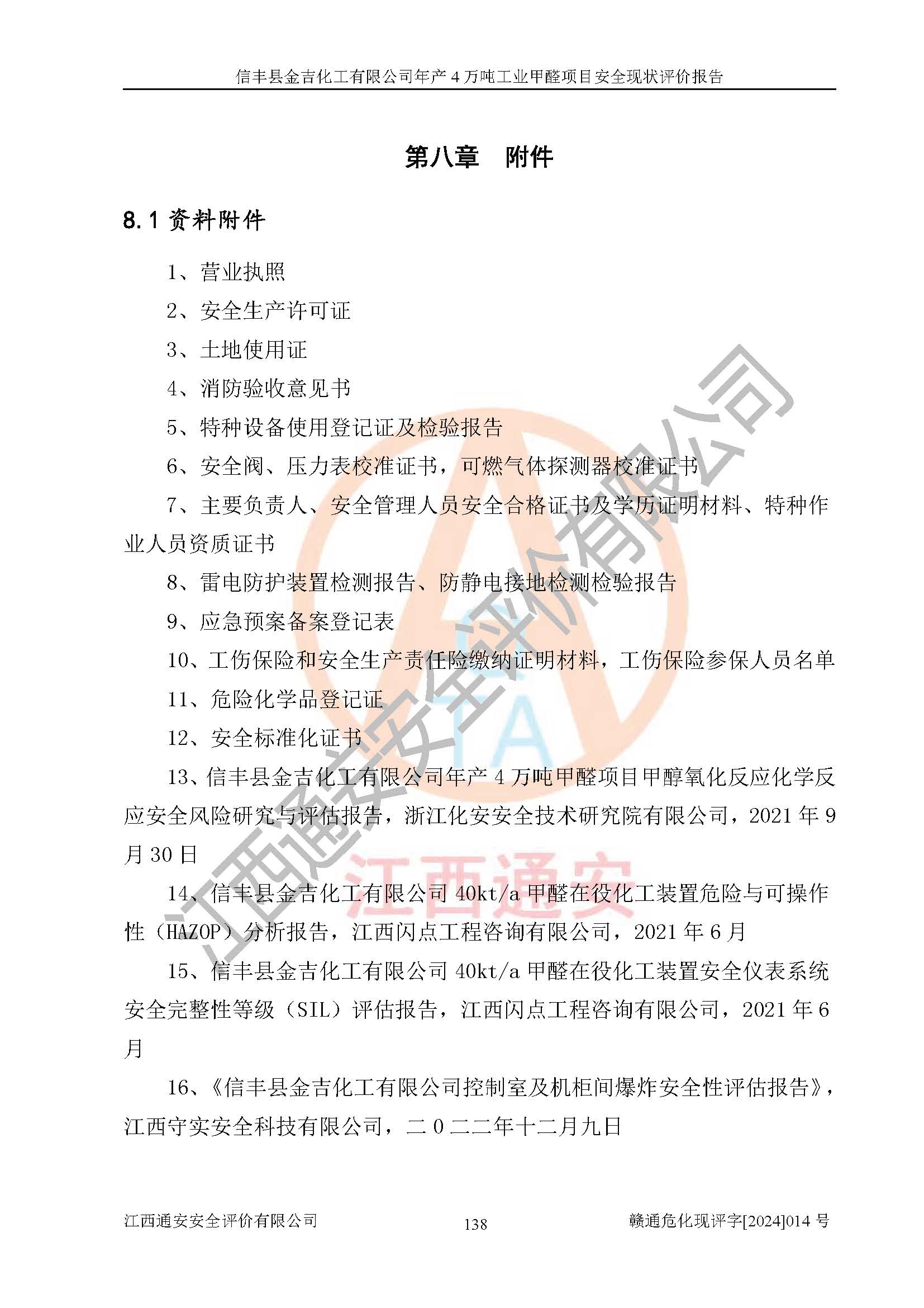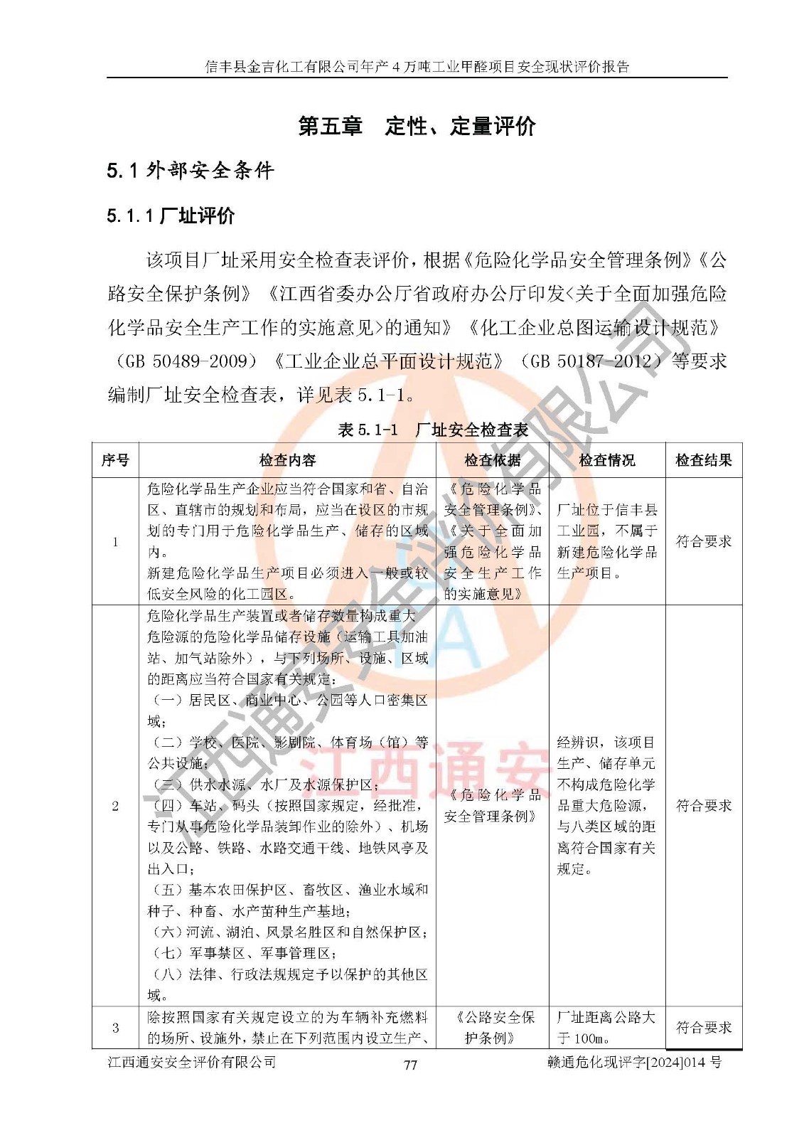 評價結(jié)論 | 信豐縣金吉化工有限公司年產(chǎn)4萬噸工業(yè)甲醛項目現(xiàn)場情況與設計圖紙一致,DCS和SIS系統(tǒng)設計符合要求、運行正常,有關(guān)從業(yè)人員資質(zhì)符合《江西省危險化學品安全專項整治三年行動實施方案》要求,安全設施及安全管理符合法律、法規(guī)、標準的要求,安全風險是受控制的,其風險程度是可以接受的,安全設施符合安全生產(chǎn)條件,能夠滿足安全生產(chǎn)的要求。 | ||||||