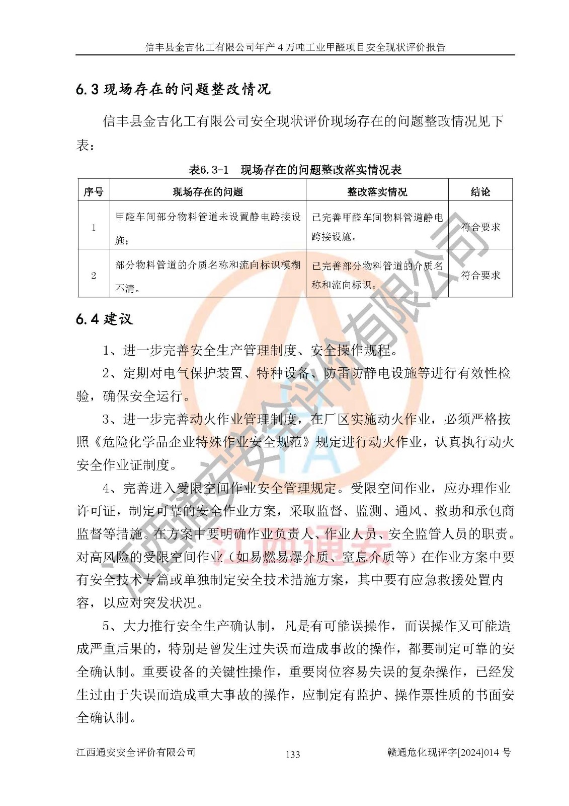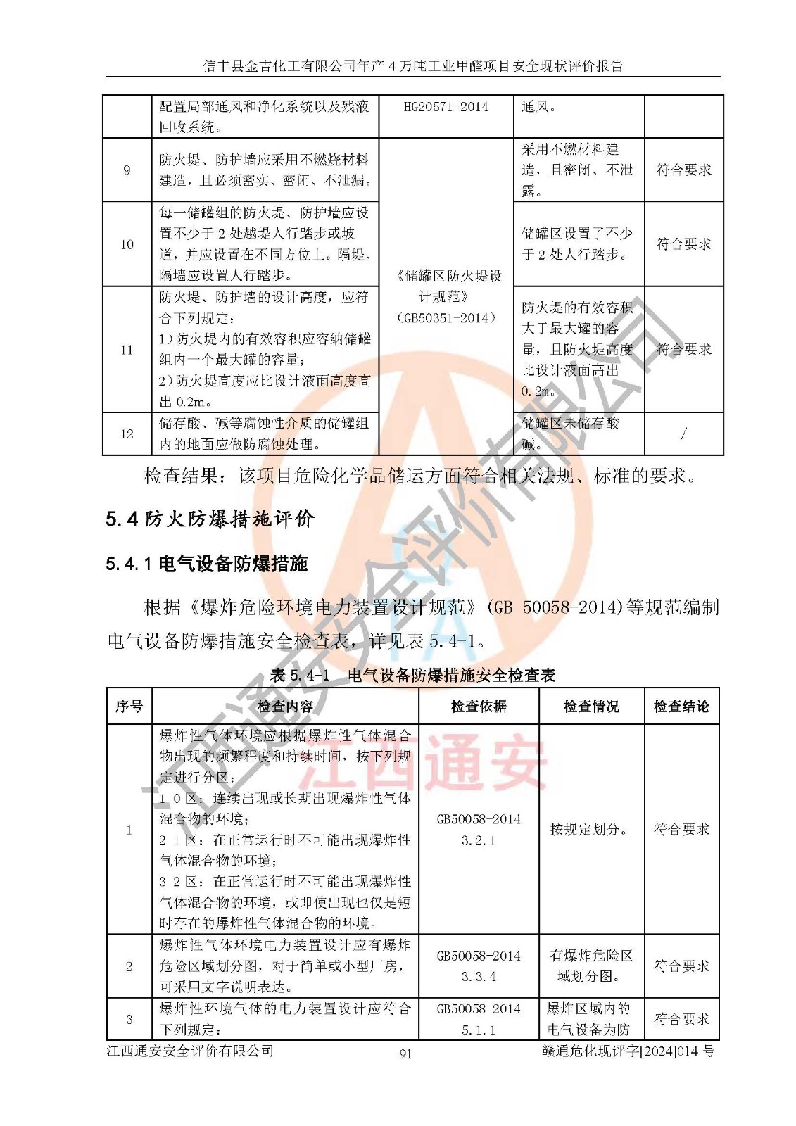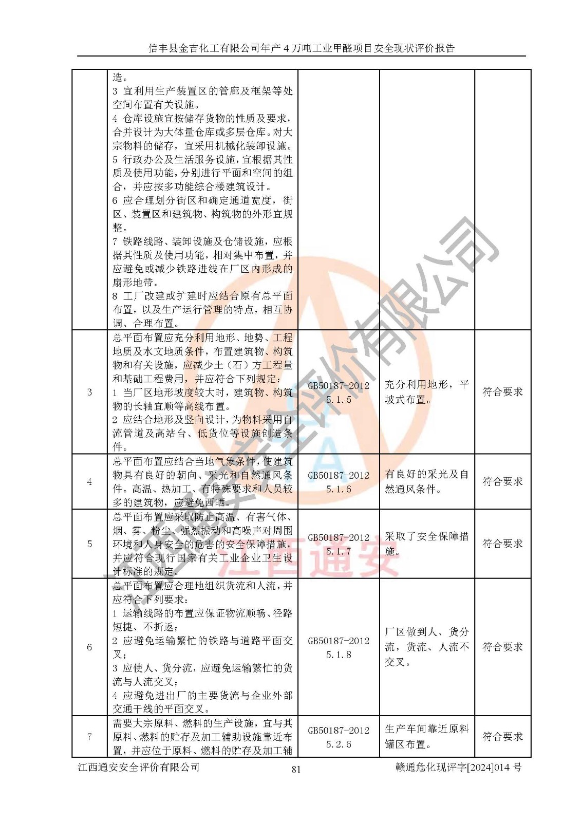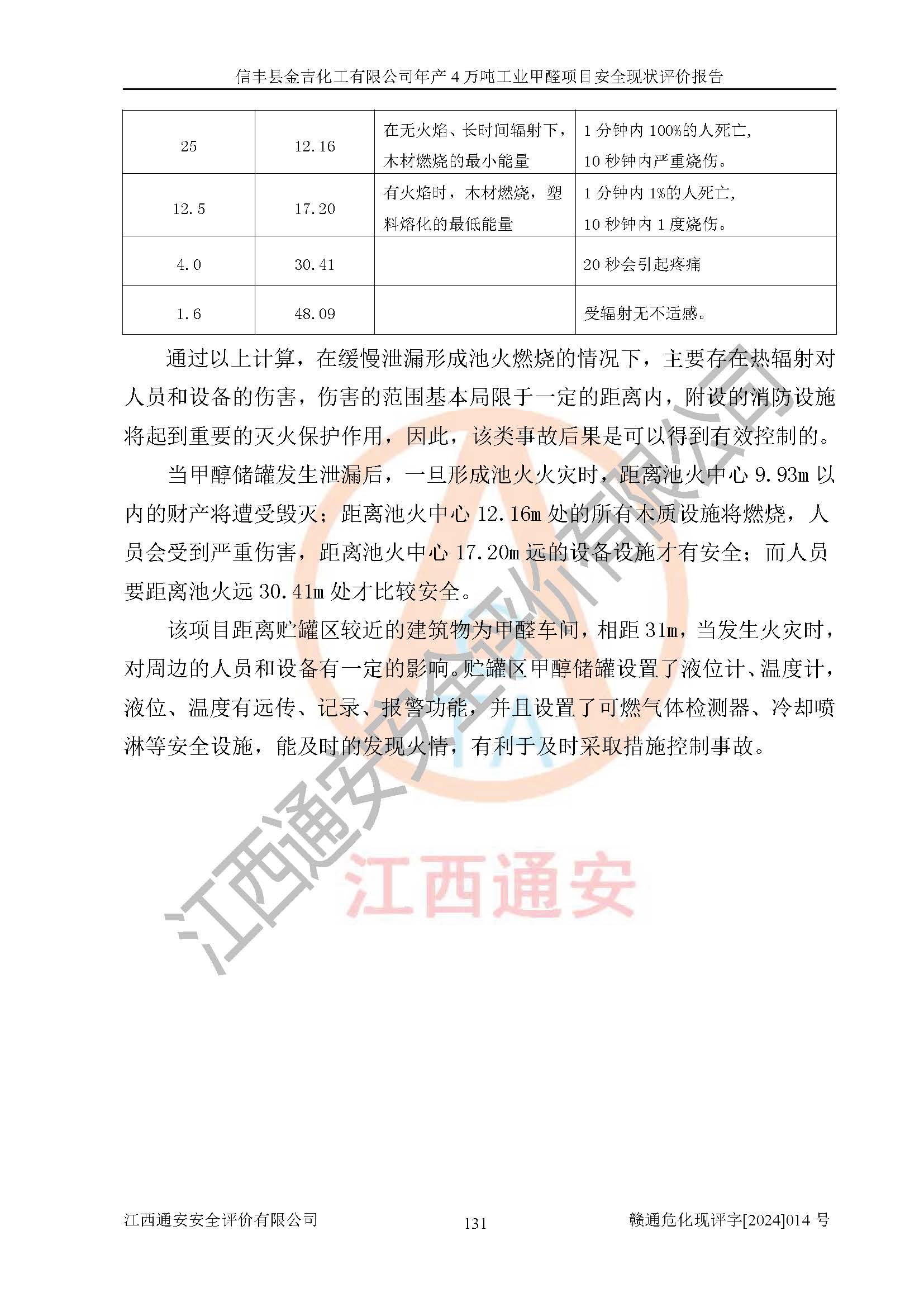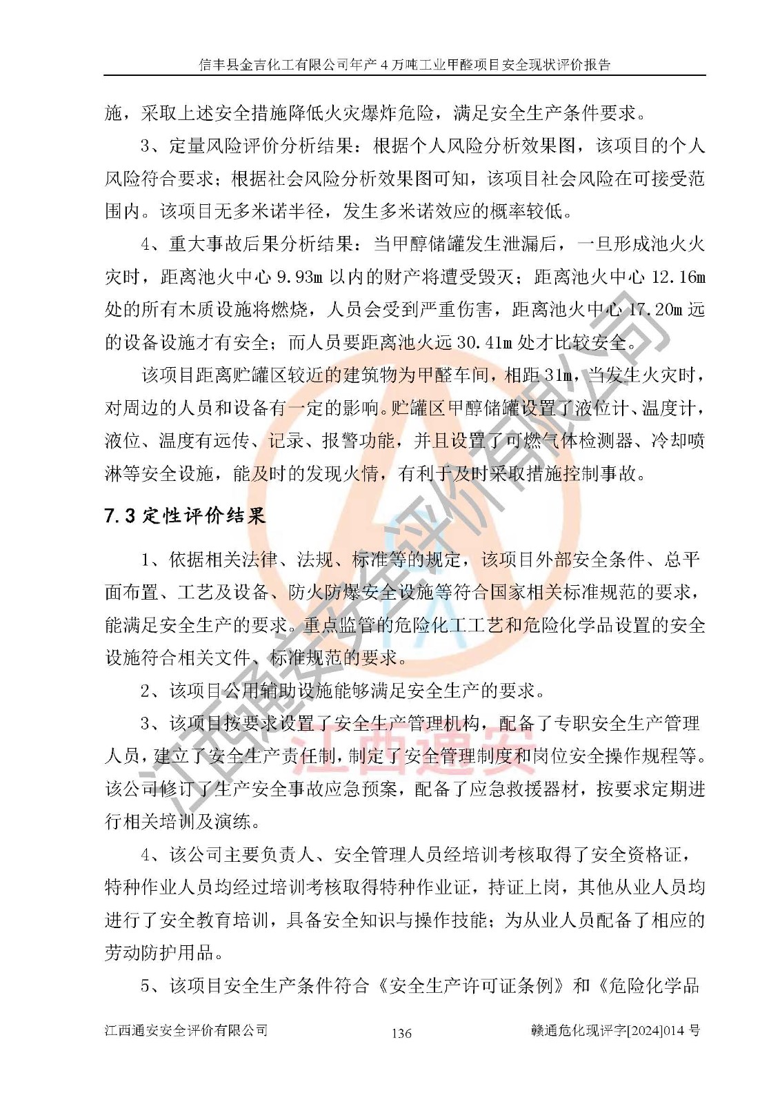 評價結(jié)論 | 信豐縣金吉化工有限公司年產(chǎn)4萬噸工業(yè)甲醛項目現(xiàn)場情況與設計圖紙一致,DCS和SIS系統(tǒng)設計符合要求、運行正常,有關(guān)從業(yè)人員資質(zhì)符合《江西省危險化學品安全專項整治三年行動實施方案》要求,安全設施及安全管理符合法律、法規(guī)、標準的要求,安全風險是受控制的,其風險程度是可以接受的,安全設施符合安全生產(chǎn)條件,能夠滿足安全生產(chǎn)的要求。 | ||||||