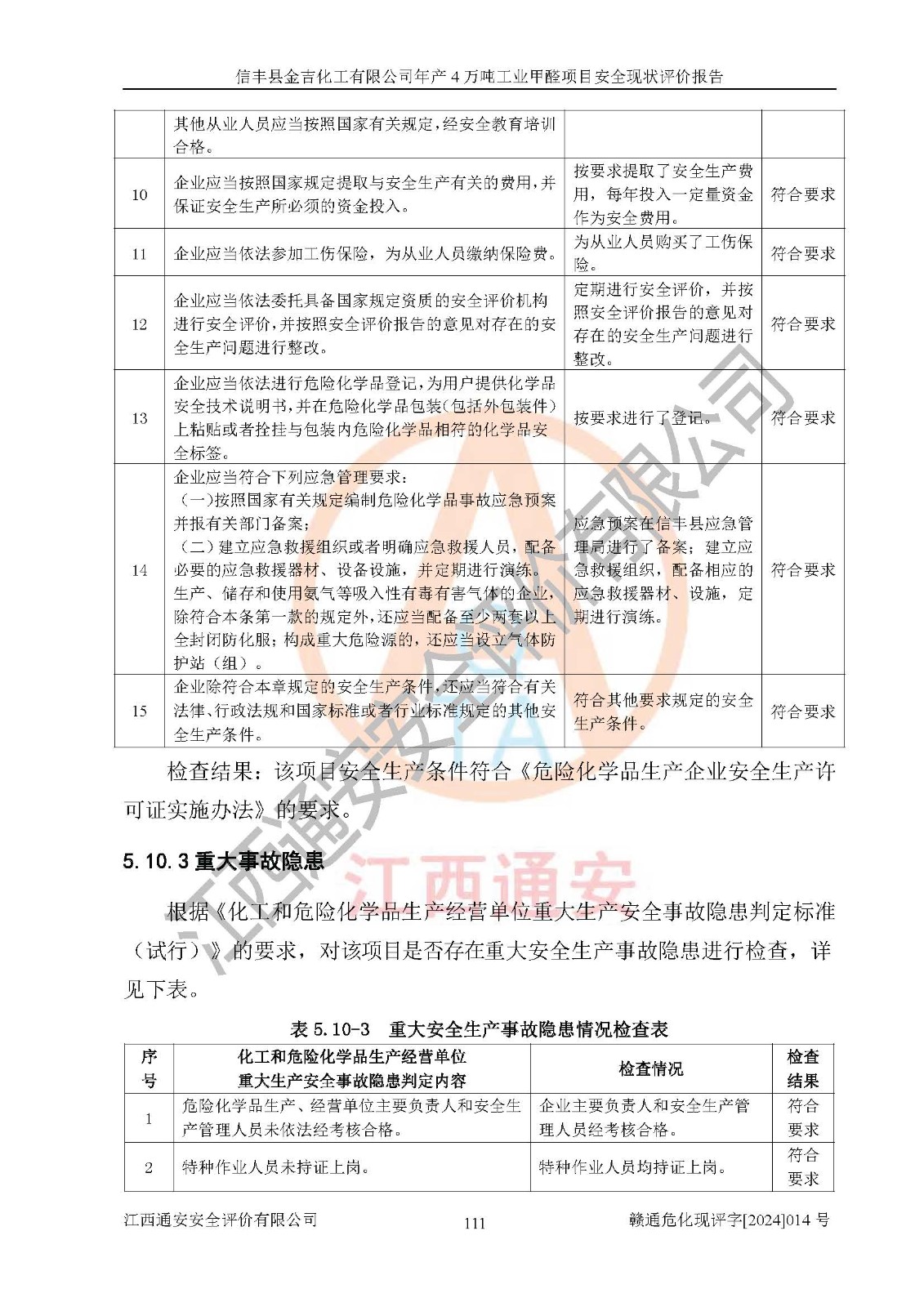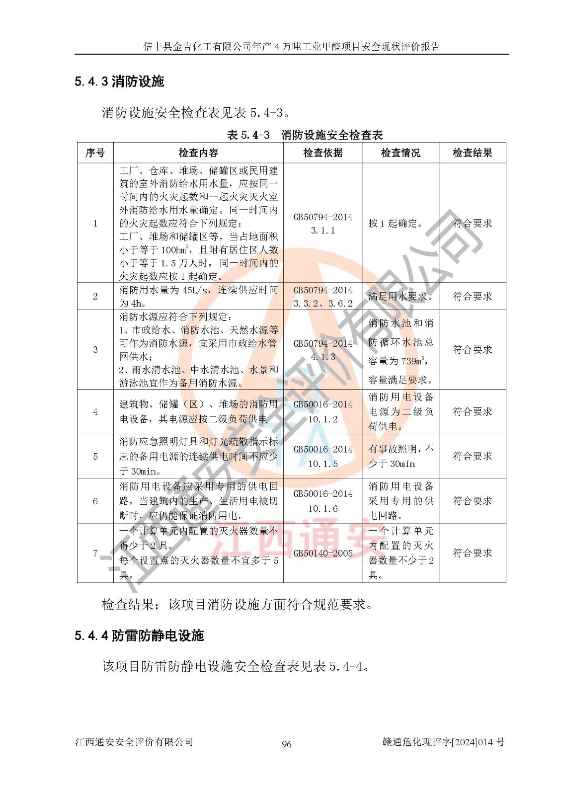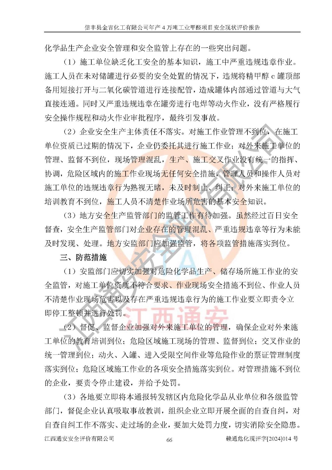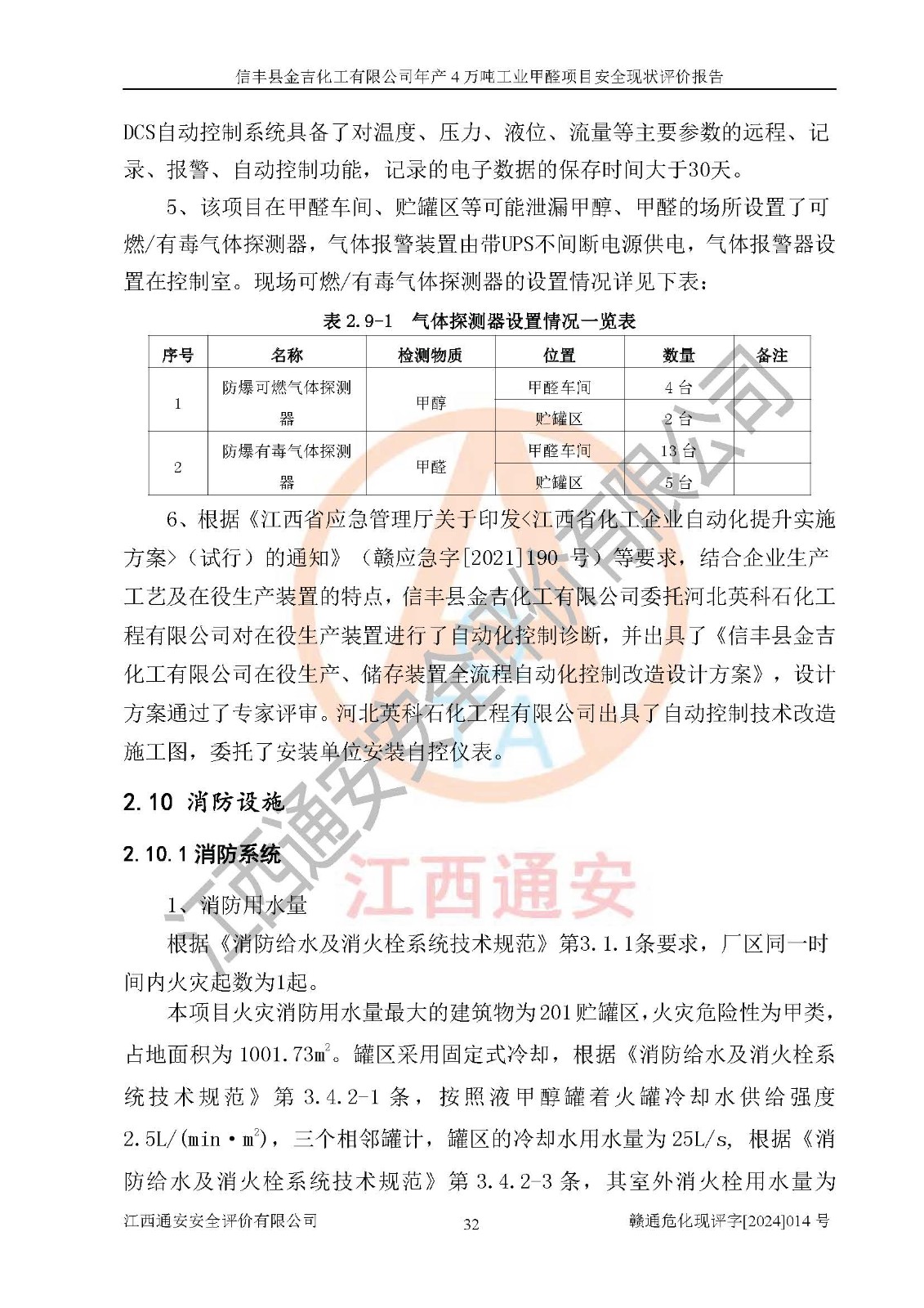評價結(jié)論 | 信豐縣金吉化工有限公司年產(chǎn)4萬噸工業(yè)甲醛項目現(xiàn)場情況與設計圖紙一致,DCS和SIS系統(tǒng)設計符合要求、運行正常,有關(guān)從業(yè)人員資質(zhì)符合《江西省危險化學品安全專項整治三年行動實施方案》要求,安全設施及安全管理符合法律、法規(guī)、標準的要求,安全風險是受控制的,其風險程度是可以接受的,安全設施符合安全生產(chǎn)條件,能夠滿足安全生產(chǎn)的要求。 | ||||||
