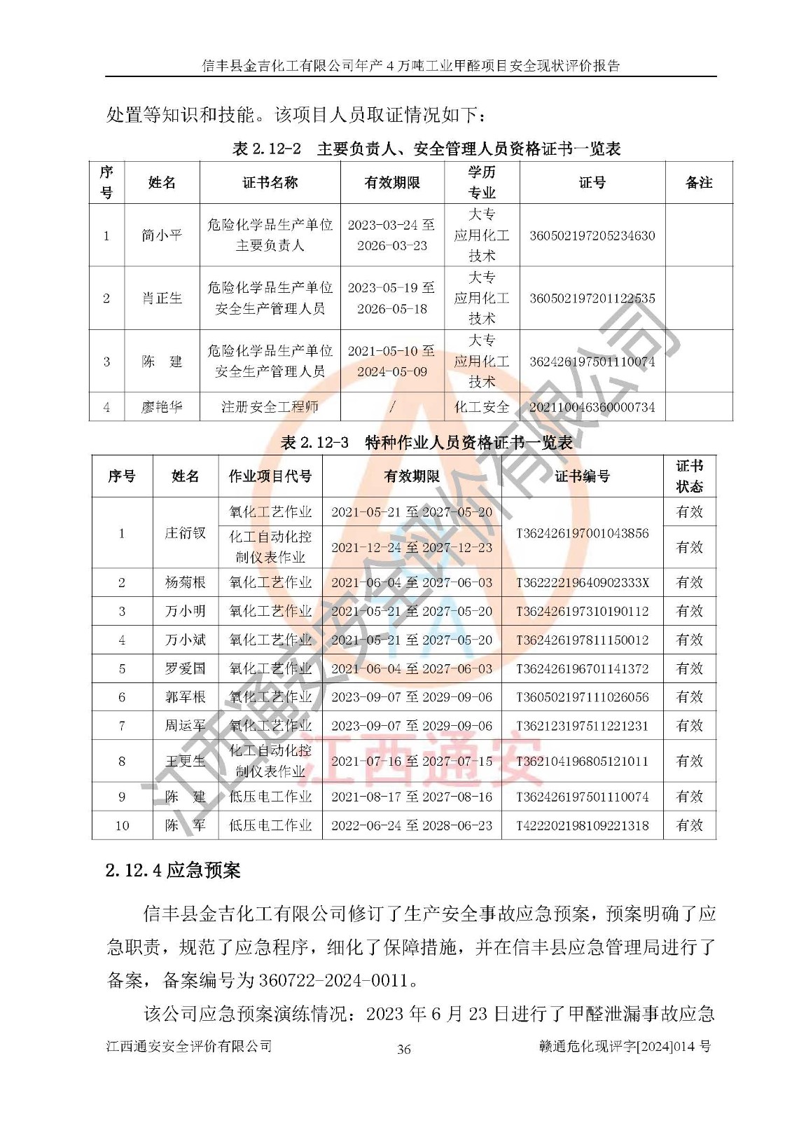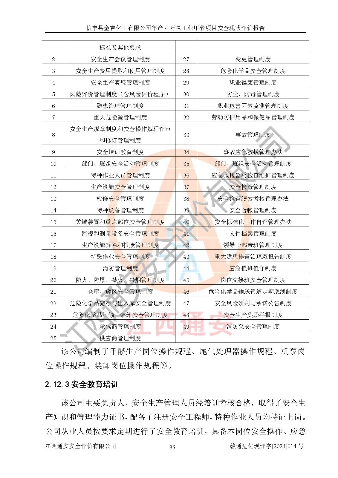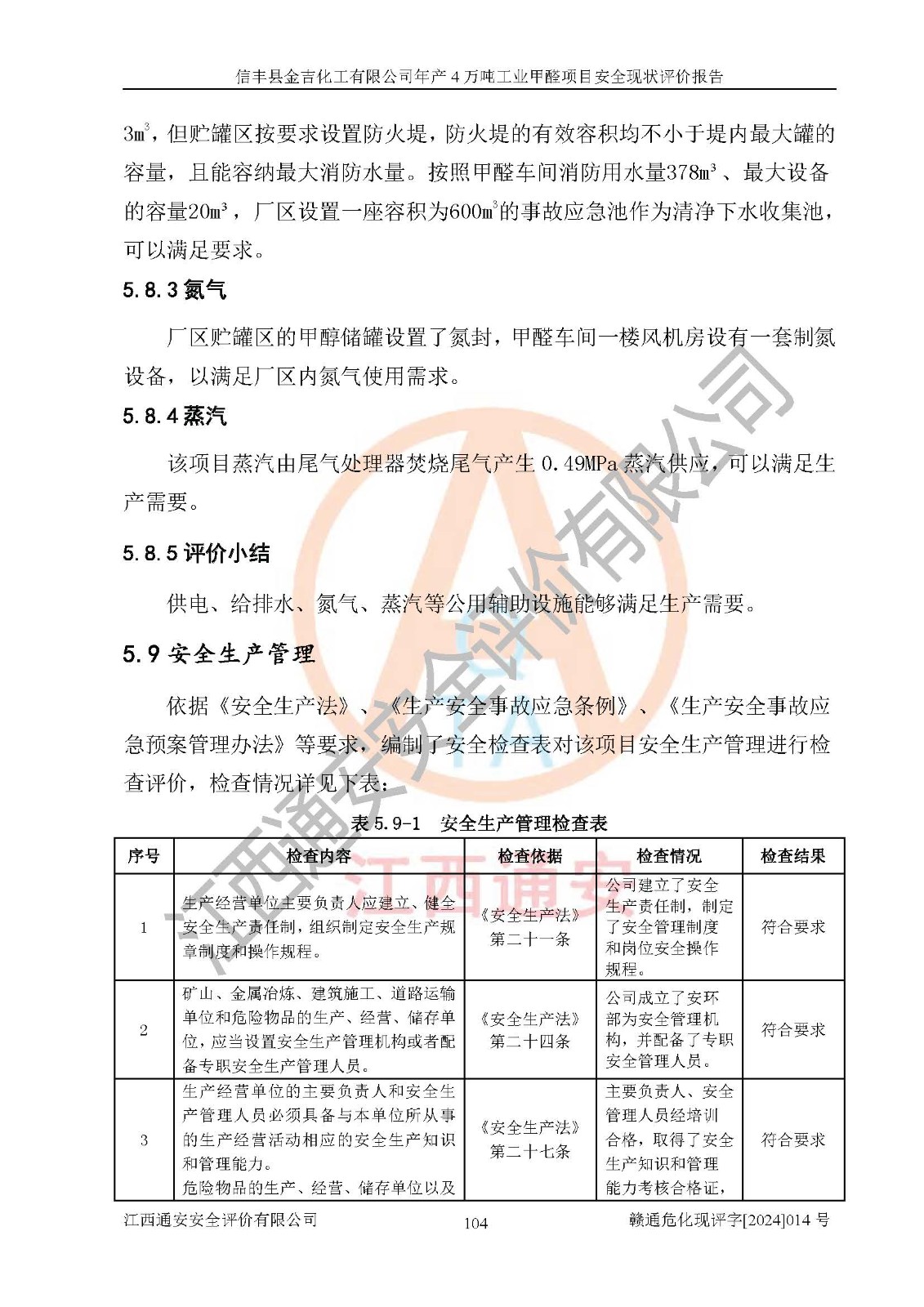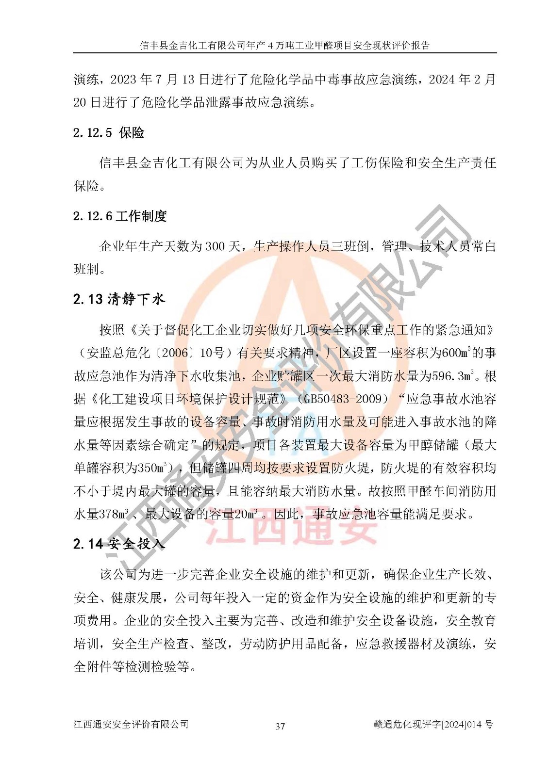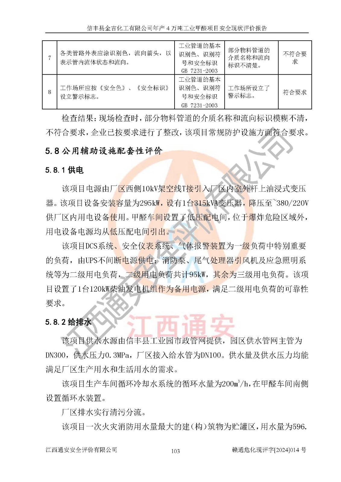 評價結(jié)論 | 信豐縣金吉化工有限公司年產(chǎn)4萬噸工業(yè)甲醛項目現(xiàn)場情況與設計圖紙一致,DCS和SIS系統(tǒng)設計符合要求、運行正常,有關(guān)從業(yè)人員資質(zhì)符合《江西省危險化學品安全專項整治三年行動實施方案》要求,安全設施及安全管理符合法律、法規(guī)、標準的要求,安全風險是受控制的,其風險程度是可以接受的,安全設施符合安全生產(chǎn)條件,能夠滿足安全生產(chǎn)的要求。 | ||||||