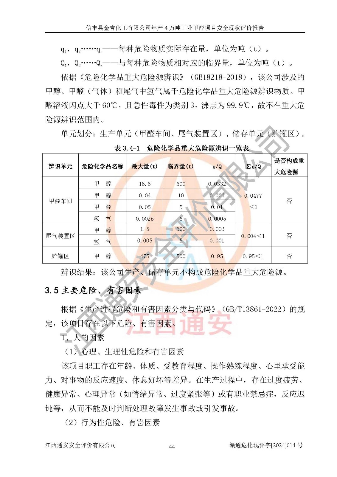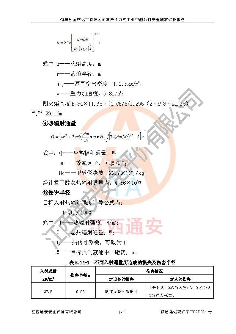 項目簡介 | 信豐縣金吉化工有限公司位于江西省贛州市信豐縣中端工業(yè)園,法定**人為簡小平,成立于2002年11月06日,注冊資本陸拾萬元整,經(jīng)營范圍為工業(yè)甲醛溶液生產(chǎn)、銷售。 信豐縣金吉化工有限公司2021年04月25日取得了《安全生產(chǎn)許可證》,許可證編號:(贛)WH安許證字[2006]0253號,許可范圍為甲醛溶液(40kt/a,37%),**期為2021年06月26日至2024年06月25日。該公司2023年4月18日取得了安全生產(chǎn)標準化證書,證書編號:贛市AQBWHⅢ[2023]28號,**期至2026年4月17日。該公司現(xiàn)有員工16人,其中安全管理人員2人。 信豐縣金吉化工有限公司年產(chǎn)4萬噸工業(yè)甲醛項目生產(chǎn)過程中涉及的原輔材料為甲醇和銀觸媒(催化劑),氮封需要使用氮氣,副反應產(chǎn)物為氫氣和甲醛,產(chǎn)品為甲醛溶液。根據(jù)《危險化學品目錄》,該項目涉及的甲醇、氮氣[壓縮的]、氫氣、甲醛和甲醛溶液屬于危險化學品。經(jīng)辨識,甲醇和氫氣屬于重點監(jiān)管的危險化學品,甲醛屬于高毒物品,甲醇屬于特別管控的危險化學品,不涉及監(jiān)控化學品、易制毒化學品、易制爆危險化學品和劇毒化學品,生產(chǎn)、儲存單元不構(gòu)成危險化學品重大危險源,涉及的氧化反應屬于重點監(jiān)管的危險化工工藝。根據(jù)《安全生產(chǎn)許可證條例》、《危險化學品安全管理條例》和《危險化學品生產(chǎn)企業(yè)安全生產(chǎn)許可實施辦法》的相關(guān)規(guī)定,該項目甲醛溶液屬于危險化學品,需要辦理危險化學品安全生產(chǎn)許可證。根據(jù)生產(chǎn)工藝特點及物料的理化特性可知,該項目生產(chǎn)過程中存在火災與爆炸、中毒與窒息、觸電、機械傷害等危險有害因素。 該公司自2021年04月25日取得安全生產(chǎn)許可證以來,生產(chǎn)運行正常,未發(fā)生一般及以上生產(chǎn)安全事故。 | ||||||