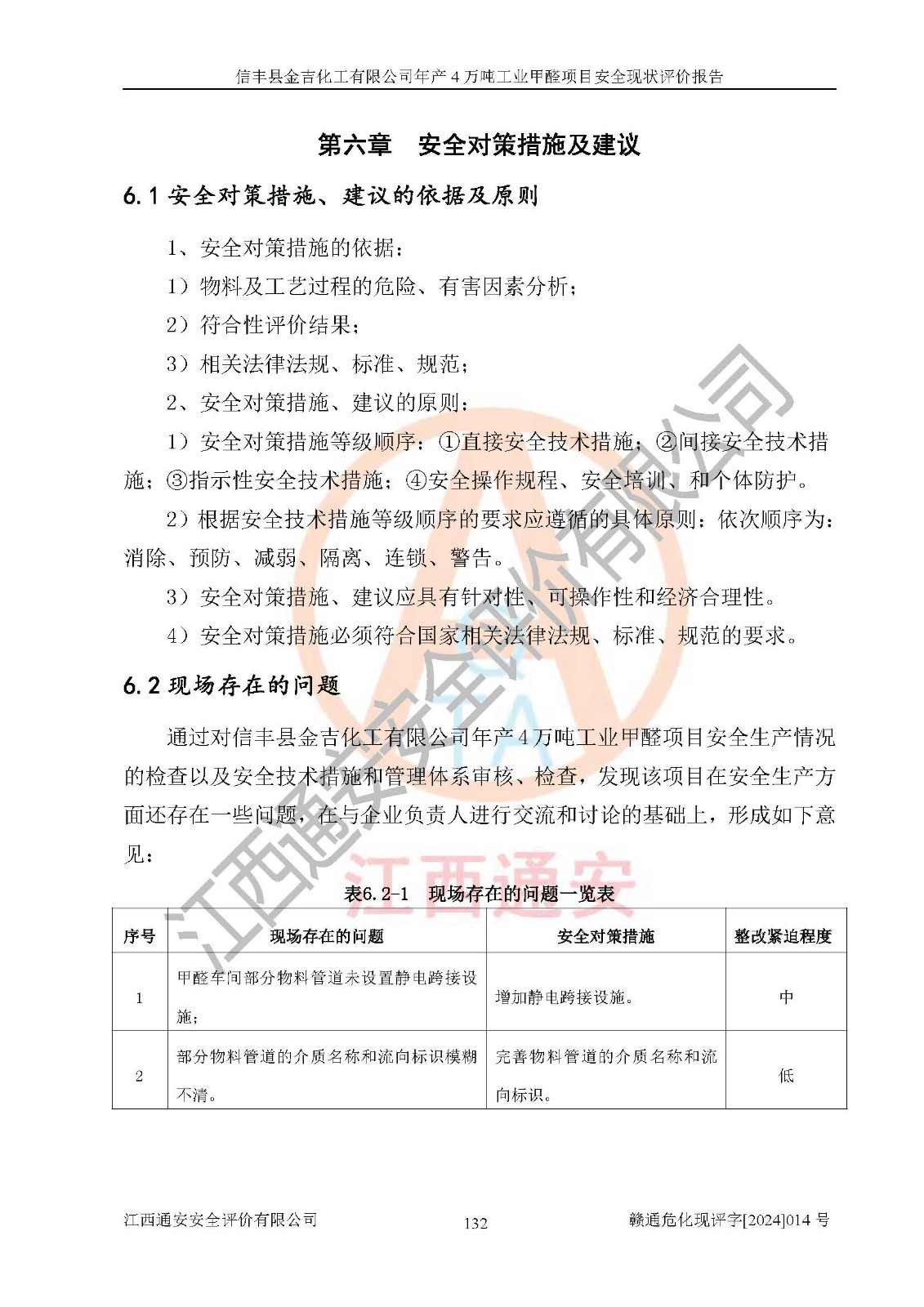 勘察現(xiàn)場發(fā)現(xiàn)的問題及安全對策措施 | 序號現(xiàn)場存在的問題安全對策措施1甲醛車間部分物料管道未設置靜電跨接設施;增加靜電跨接設施。2部分物料管道的介質(zhì)名稱和流向標識模糊不清。完善物料管道的介質(zhì)名稱和流向標識。