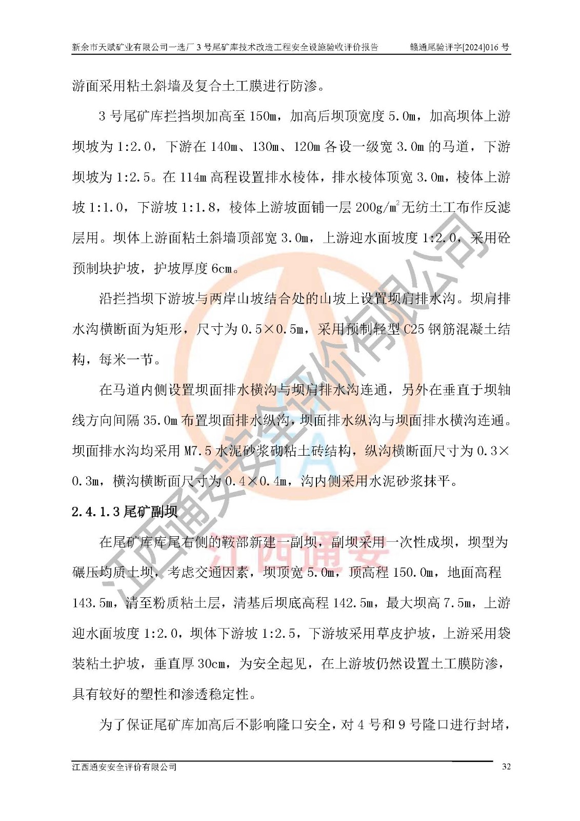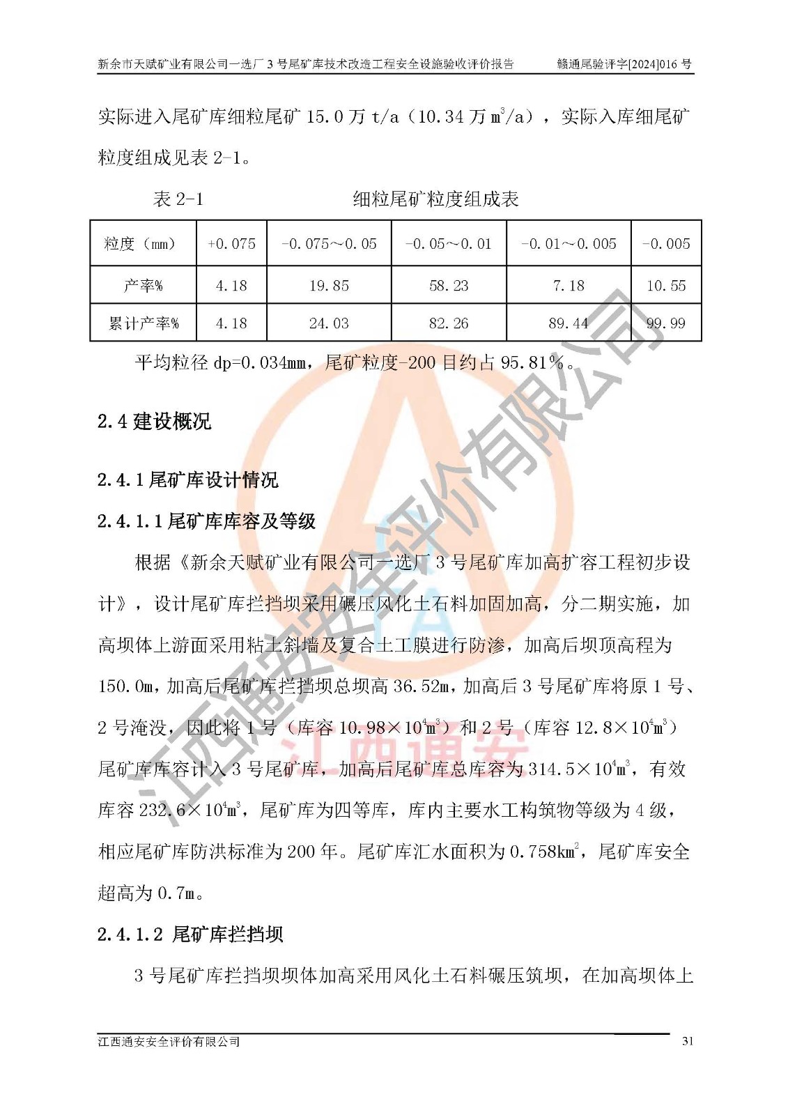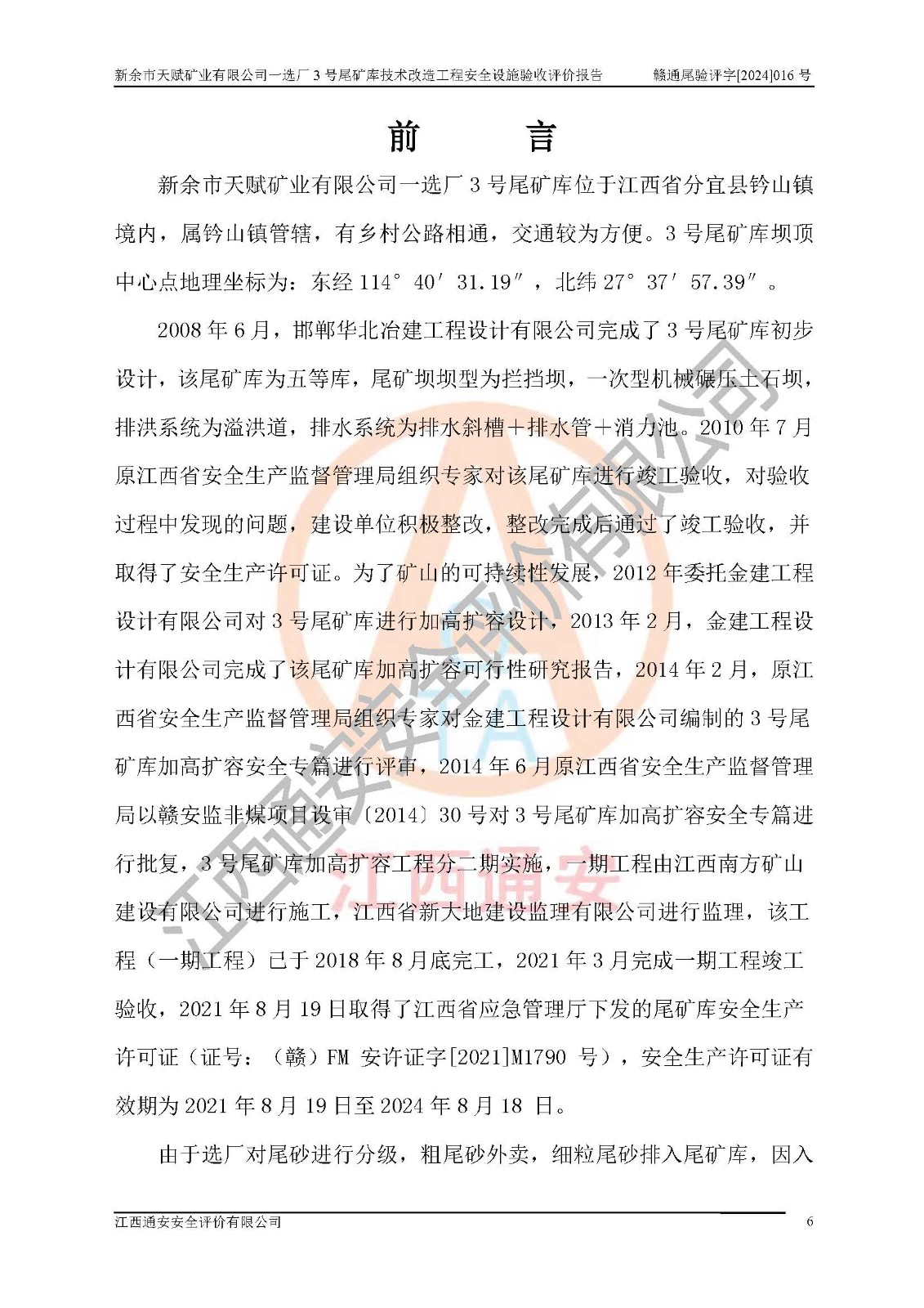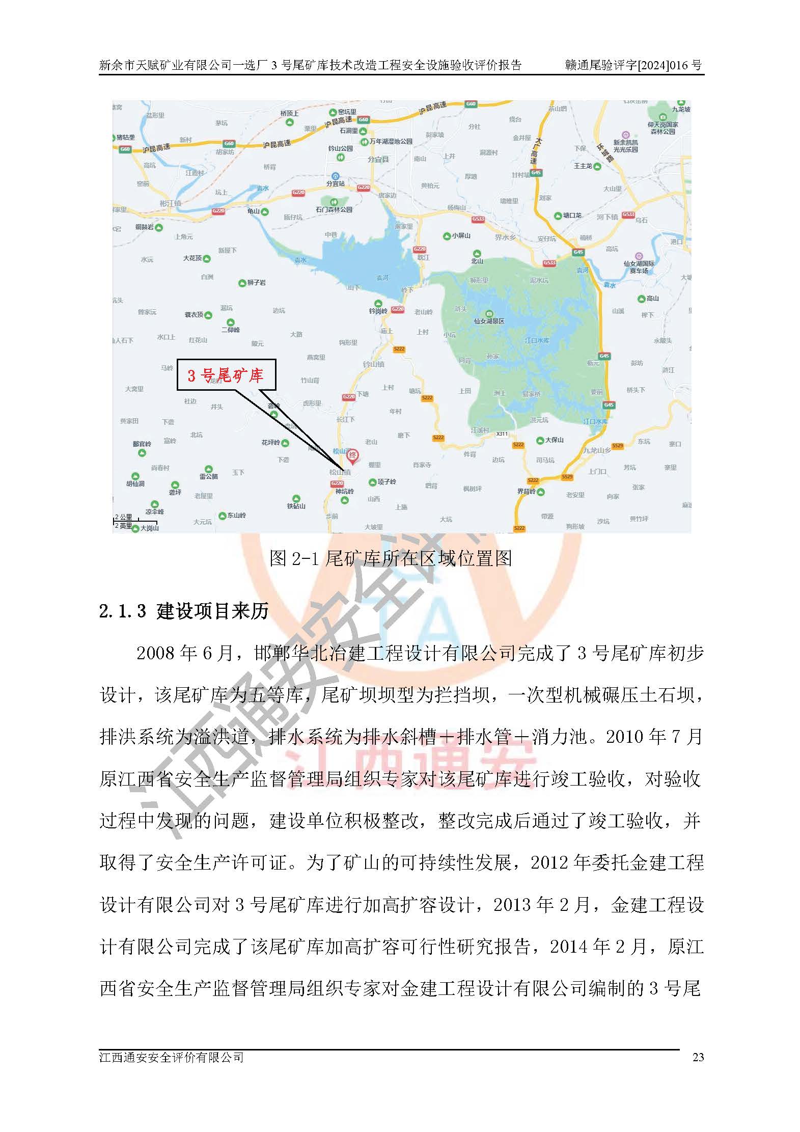 新余市天賦礦業(yè)有限公司一選廠3號(hào)尾礦庫(kù)位于江西省分宜縣鈐山鎮(zhèn)境內(nèi),屬鈐山鎮(zhèn)管轄,有鄉(xiāng)村公路相通,交通較為方便。3號(hào)尾礦庫(kù)壩頂中心點(diǎn)地理坐標(biāo)為:X=3058292,Y=38566139。 2008年6月,邯鄲華北冶建工程設(shè)計(jì)有限公司完成了3號(hào)尾礦庫(kù)初步設(shè)計(jì),該尾礦庫(kù)為五等庫(kù),尾礦壩壩型為攔擋壩,一次型機(jī)械碾壓土石壩,排洪系統(tǒng)為溢洪道,排水系統(tǒng)為排水斜槽+排水管+消力池。2010年7月原江西省安全生產(chǎn)監(jiān)督管理局組織專家對(duì)該尾礦庫(kù)進(jìn)行竣工驗(yàn)收,對(duì)驗(yàn)收過(guò)程中發(fā)現(xiàn)的問(wèn)題,建設(shè)單位積極整改,整改完成后通過(guò)了竣工驗(yàn)收,并取得了安全生產(chǎn)許可證。為了礦山的可持續(xù)性發(fā)展,2012年委托金建工程設(shè)計(jì)有限公司對(duì)3號(hào)尾礦庫(kù)進(jìn)行加高擴(kuò)容設(shè)計(jì),2013年2月,金建工程設(shè)計(jì)有限公司完成了該尾礦庫(kù)加高擴(kuò)容可行性研究報(bào)告,2014年2月,原江西省安全生產(chǎn)監(jiān)督管理局組織專家對(duì)金建工程設(shè)計(jì)有限公司編制的3號(hào)尾礦庫(kù)加高擴(kuò)容安全專篇進(jìn)行評(píng)審,2014年6月原江西省安全生產(chǎn)監(jiān)督管理局以贛安監(jiān)非煤項(xiàng)目設(shè)審〔2014〕30號(hào)對(duì)3號(hào)尾礦庫(kù)加高擴(kuò)容安全專篇進(jìn)行批復(fù),3號(hào)尾礦庫(kù)加高擴(kuò)容工程分二期實(shí)施,一期工程由江西南方礦山建設(shè)有限公司進(jìn)行施工,江西省新大地建設(shè)監(jiān)理有限公司進(jìn)行監(jiān)理,該工程(一期工程)已于2018年8月底完工,2021年3月完成一期工程竣工驗(yàn)收,2021年8月19日取得了江西省應(yīng)急管理廳下發(fā)的尾礦庫(kù)安全生產(chǎn)許可證(證號(hào):(贛)FM 安許證字[2021]M1790 號(hào)),安全生產(chǎn)許可證**期為2021年8月19日至2024年8月18 日。 由于選廠對(duì)尾砂進(jìn)行分級(jí),粗尾砂外賣,細(xì)粒尾砂排入尾礦庫(kù),因入庫(kù)尾砂粒度變細(xì),尾砂灘面坡度較緩,造成壩前干灘長(zhǎng)度不滿足設(shè)計(jì)要求,2022年6月,分宜縣應(yīng)急管理局在對(duì)尾礦庫(kù)進(jìn)行檢查時(shí),發(fā)現(xiàn)了上述問(wèn)題(詳見(jiàn)附件安全生產(chǎn)行政執(zhí)法文書(shū)),為了解決上述問(wèn)題,使尾礦庫(kù)運(yùn)行滿足設(shè)計(jì)要求,因此需要對(duì)3號(hào)尾礦庫(kù)進(jìn)行技術(shù)改造。 2022年12月金建工程設(shè)計(jì)有限公司出具了《新余市天賦礦業(yè)有限公司一選廠3號(hào)尾礦庫(kù)技術(shù)改造工程安全設(shè)施設(shè)計(jì)》,并于2023年1月12日取得《江西省應(yīng)急管理廳關(guān)于新余市天賦礦業(yè)有限公司一選廠3號(hào)尾礦庫(kù)技術(shù)改造工程安全設(shè)施設(shè)計(jì)審查的批復(fù)》(贛應(yīng)急非煤項(xiàng)目設(shè)審[2023]2號(hào))。因新余市天賦礦業(yè)有限公司綠色礦山建設(shè)原因選礦廠一直半停產(chǎn)狀態(tài),導(dǎo)致尾礦庫(kù)技術(shù)改造工程未能完成建設(shè)并沒(méi)有及時(shí)驗(yàn)收,現(xiàn)已完成了尾礦庫(kù)技術(shù)改造工程施工建設(shè)工作,尾礦庫(kù)技術(shù)改造工程2024年8月21日已完工,現(xiàn)進(jìn)入驗(yàn)收程序。 |
