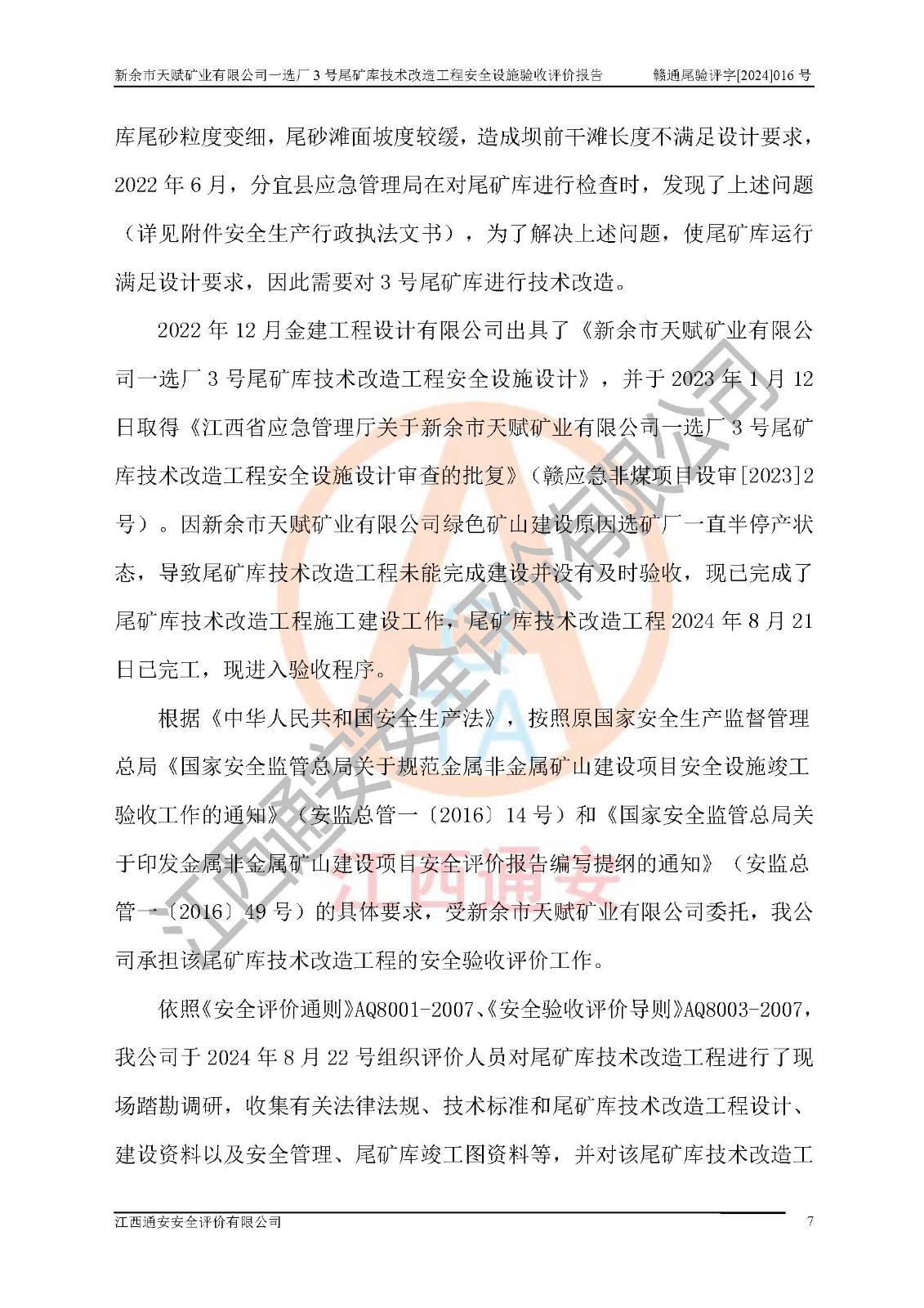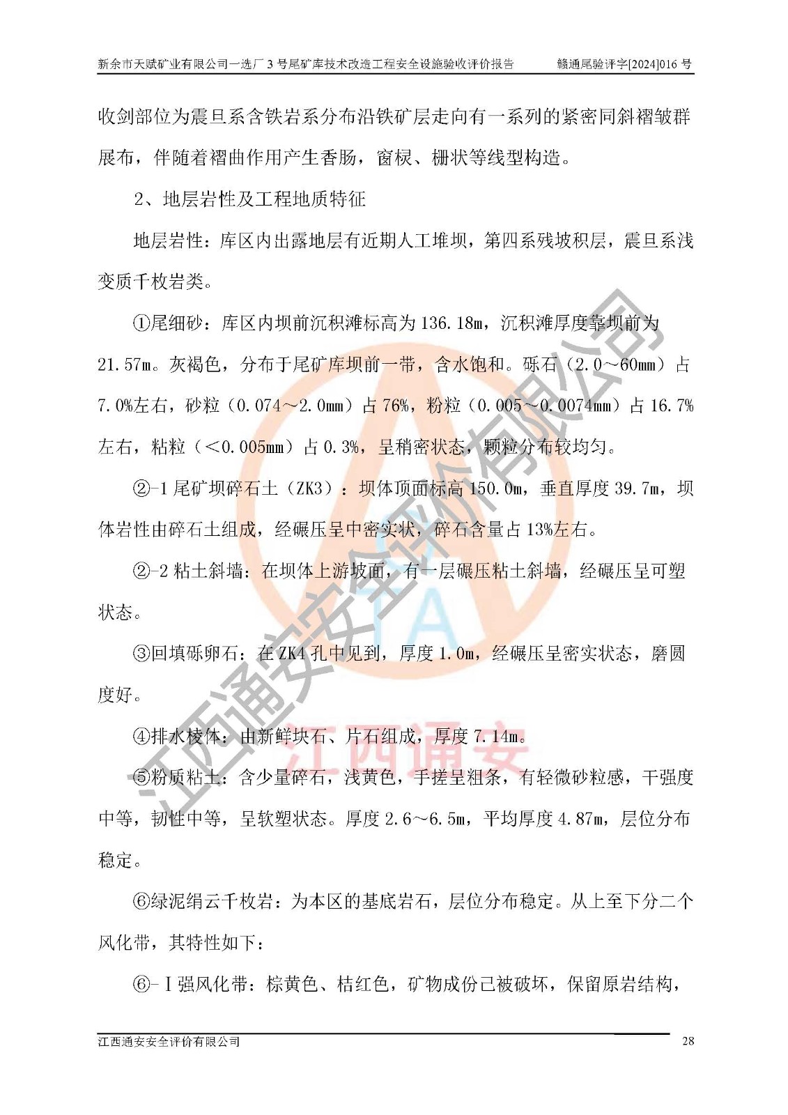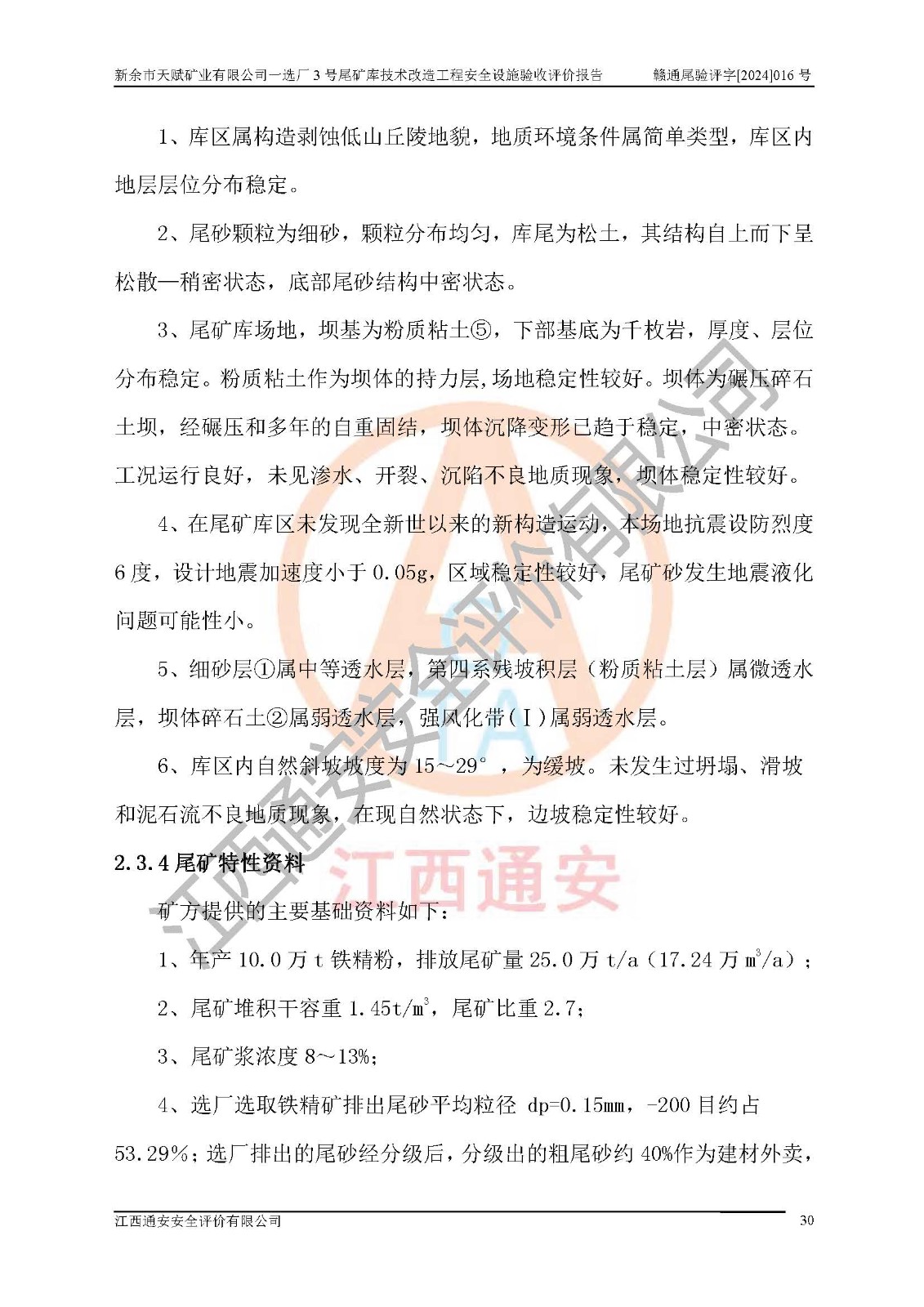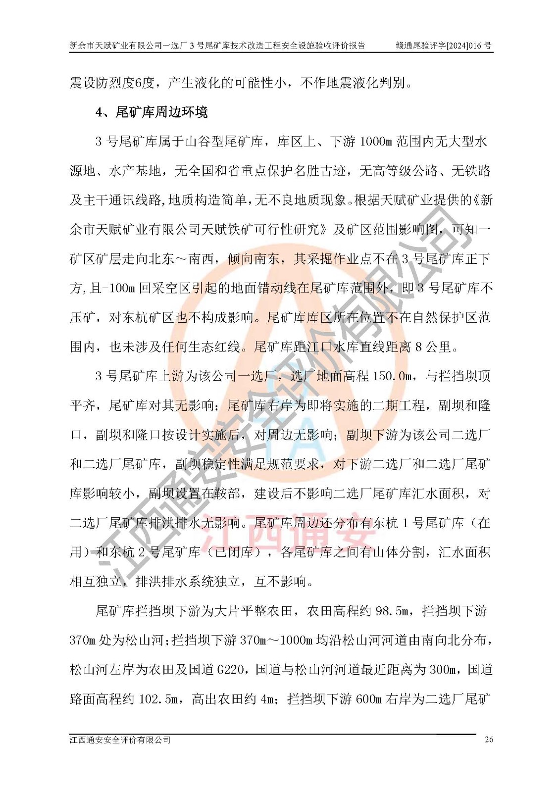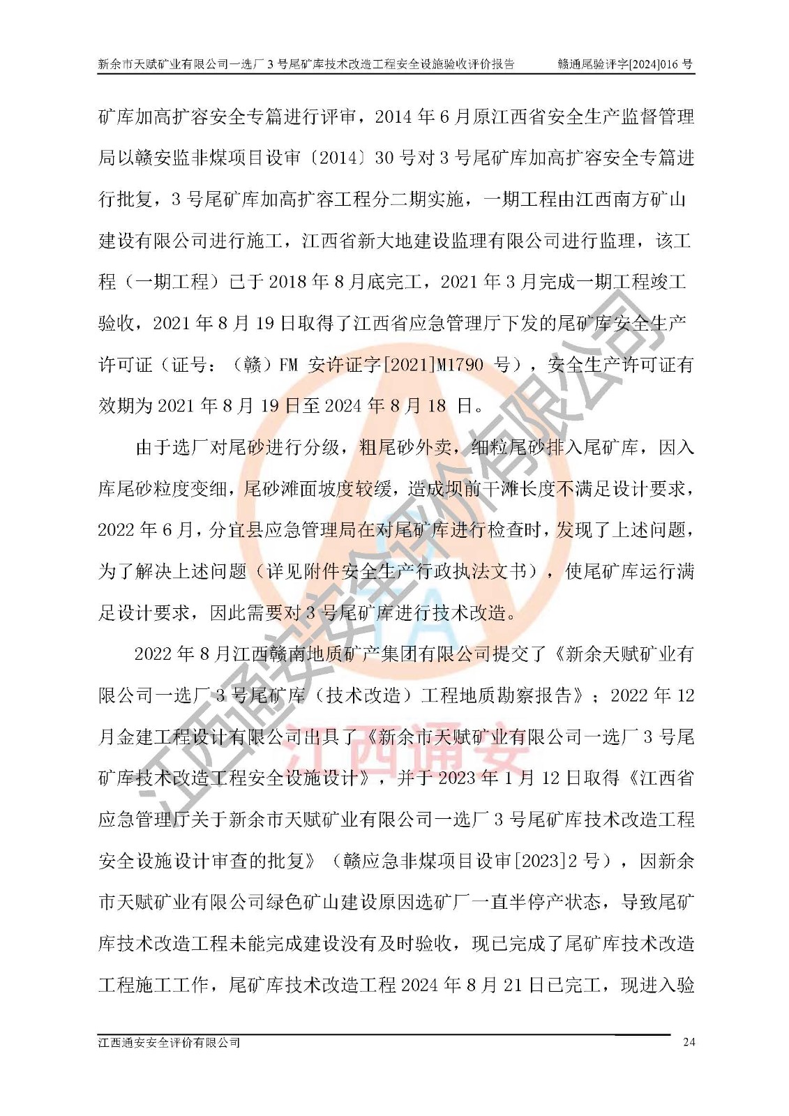 新余市天賦礦業(yè)有限公司一選廠3號(hào)尾礦庫(kù)位于江西省分宜縣鈐山鎮(zhèn)境內(nèi),屬鈐山鎮(zhèn)管轄,有鄉(xiāng)村公路相通,交通較為方便。3號(hào)尾礦庫(kù)壩頂中心點(diǎn)地理坐標(biāo)為:X=3058292,Y=38566139。 2008年6月,邯鄲華北冶建工程設(shè)計(jì)有限公司完成了3號(hào)尾礦庫(kù)初步設(shè)計(jì),該尾礦庫(kù)為五等庫(kù),尾礦壩壩型為攔擋壩,一次型機(jī)械碾壓土石壩,排洪系統(tǒng)為溢洪道,排水系統(tǒng)為排水斜槽+排水管+消力池。2010年7月原江西省安全生產(chǎn)監(jiān)督管理局組織專家對(duì)該尾礦庫(kù)進(jìn)行竣工驗(yàn)收,對(duì)驗(yàn)收過(guò)程中發(fā)現(xiàn)的問(wèn)題,建設(shè)單位積極整改,整改完成后通過(guò)了竣工驗(yàn)收,并取得了安全生產(chǎn)許可證。為了礦山的可持續(xù)性發(fā)展,2012年委托金建工程設(shè)計(jì)有限公司對(duì)3號(hào)尾礦庫(kù)進(jìn)行加高擴(kuò)容設(shè)計(jì),2013年2月,金建工程設(shè)計(jì)有限公司完成了該尾礦庫(kù)加高擴(kuò)容可行性研究報(bào)告,2014年2月,原江西省安全生產(chǎn)監(jiān)督管理局組織專家對(duì)金建工程設(shè)計(jì)有限公司編制的3號(hào)尾礦庫(kù)加高擴(kuò)容安全專篇進(jìn)行評(píng)審,2014年6月原江西省安全生產(chǎn)監(jiān)督管理局以贛安監(jiān)非煤項(xiàng)目設(shè)審〔2014〕30號(hào)對(duì)3號(hào)尾礦庫(kù)加高擴(kuò)容安全專篇進(jìn)行批復(fù),3號(hào)尾礦庫(kù)加高擴(kuò)容工程分二期實(shí)施,一期工程由江西南方礦山建設(shè)有限公司進(jìn)行施工,江西省新大地建設(shè)監(jiān)理有限公司進(jìn)行監(jiān)理,該工程(一期工程)已于2018年8月底完工,2021年3月完成一期工程竣工驗(yàn)收,2021年8月19日取得了江西省應(yīng)急管理廳下發(fā)的尾礦庫(kù)安全生產(chǎn)許可證(證號(hào):(贛)FM 安許證字[2021]M1790 號(hào)),安全生產(chǎn)許可證**期為2021年8月19日至2024年8月18 日。 由于選廠對(duì)尾砂進(jìn)行分級(jí),粗尾砂外賣,細(xì)粒尾砂排入尾礦庫(kù),因入庫(kù)尾砂粒度變細(xì),尾砂灘面坡度較緩,造成壩前干灘長(zhǎng)度不滿足設(shè)計(jì)要求,2022年6月,分宜縣應(yīng)急管理局在對(duì)尾礦庫(kù)進(jìn)行檢查時(shí),發(fā)現(xiàn)了上述問(wèn)題(詳見(jiàn)附件安全生產(chǎn)行政執(zhí)法文書(shū)),為了解決上述問(wèn)題,使尾礦庫(kù)運(yùn)行滿足設(shè)計(jì)要求,因此需要對(duì)3號(hào)尾礦庫(kù)進(jìn)行技術(shù)改造。 2022年12月金建工程設(shè)計(jì)有限公司出具了《新余市天賦礦業(yè)有限公司一選廠3號(hào)尾礦庫(kù)技術(shù)改造工程安全設(shè)施設(shè)計(jì)》,并于2023年1月12日取得《江西省應(yīng)急管理廳關(guān)于新余市天賦礦業(yè)有限公司一選廠3號(hào)尾礦庫(kù)技術(shù)改造工程安全設(shè)施設(shè)計(jì)審查的批復(fù)》(贛應(yīng)急非煤項(xiàng)目設(shè)審[2023]2號(hào))。因新余市天賦礦業(yè)有限公司綠色礦山建設(shè)原因選礦廠一直半停產(chǎn)狀態(tài),導(dǎo)致尾礦庫(kù)技術(shù)改造工程未能完成建設(shè)并沒(méi)有及時(shí)驗(yàn)收,現(xiàn)已完成了尾礦庫(kù)技術(shù)改造工程施工建設(shè)工作,尾礦庫(kù)技術(shù)改造工程2024年8月21日已完工,現(xiàn)進(jìn)入驗(yàn)收程序。 |