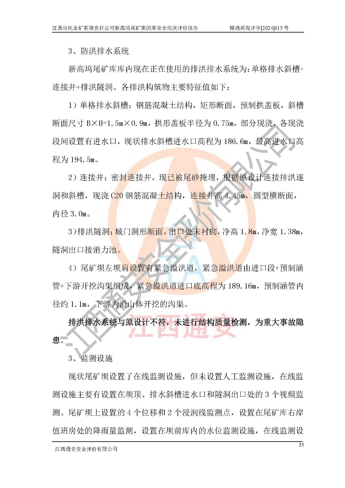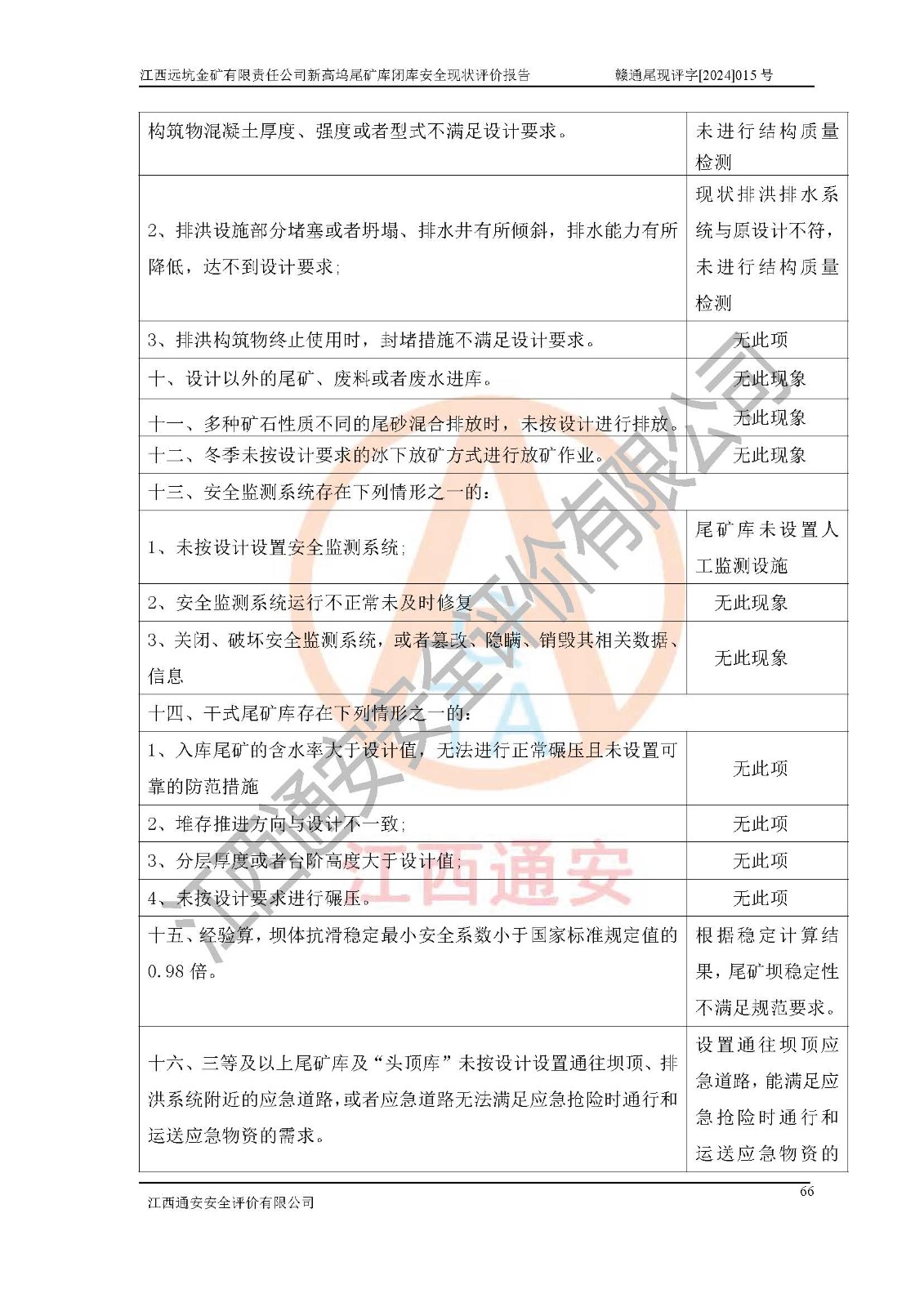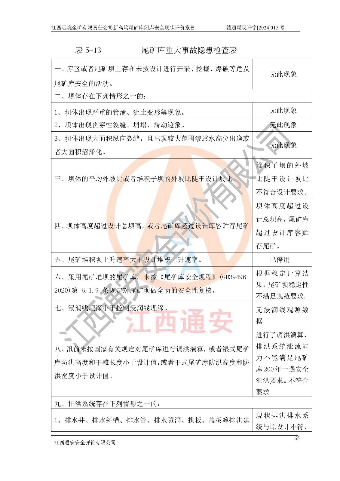 評價結(jié)論 | 江西遠坑金礦有限責(zé)任公司新高塢尾礦庫尾礦壩穩(wěn)定性不滿足規(guī)范要求,防洪排水系統(tǒng)與原設(shè)計不符,未進行結(jié)構(gòu)質(zhì)量檢測,排洪系統(tǒng)排洪能力不能滿足現(xiàn)狀尾礦庫為四等庫200年一遇洪峰流量要求,壩體***過設(shè)計總壩高,尾礦庫*過設(shè)計庫容貯存尾礦,未設(shè)置人工監(jiān)測設(shè)施;堆積子壩的外坡比陡于設(shè)計坡比,尾礦庫未配備專職安全生產(chǎn)管理人員、特種作業(yè)人員及專業(yè)技術(shù)人員等,根據(jù)**礦山安全監(jiān)察局礦安〔2022〕88號文《金屬非金屬礦山重大事故隱患判定標(biāo)準(zhǔn)》、**礦山安全監(jiān)察局礦安〔2024〕41號文《金屬非金屬礦山重大事故隱患判定標(biāo)準(zhǔn)補充情形》,尾礦庫存在重大事故隱患。江西遠坑金礦有限責(zé)任公司新高塢尾礦庫應(yīng)盡快完成所有閉庫程序,閉庫設(shè)計應(yīng)按正常運行標(biāo)準(zhǔn)進行閉庫整治設(shè)計,保障尾礦庫防洪能力和尾礦壩穩(wěn)定性滿足規(guī)程要求,維持尾礦庫閉庫后長期安全穩(wěn)定。 | |||
