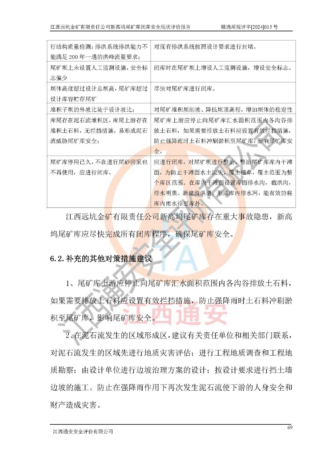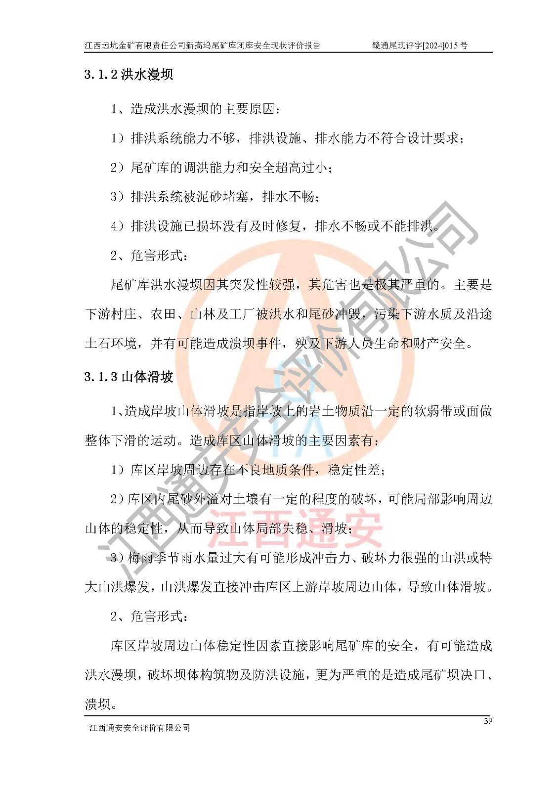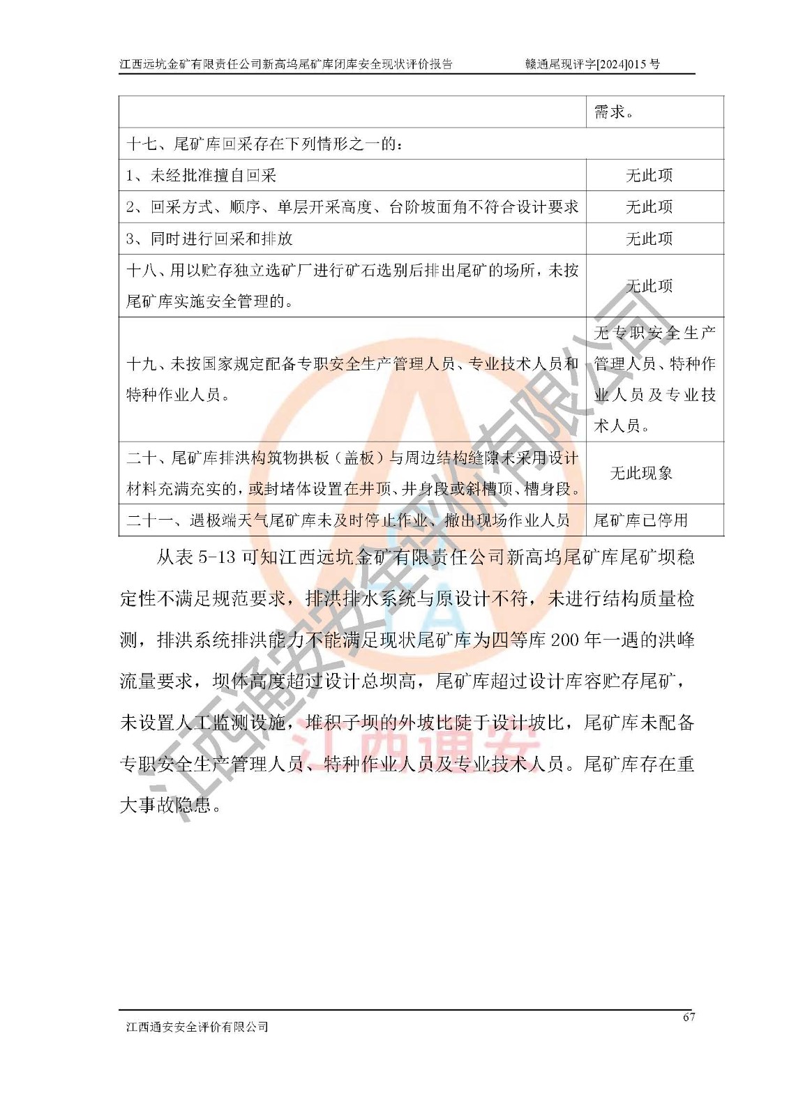 評價結(jié)論 | 江西遠坑金礦有限責(zé)任公司新高塢尾礦庫尾礦壩穩(wěn)定性不滿足規(guī)范要求,防洪排水系統(tǒng)與原設(shè)計不符,未進行結(jié)構(gòu)質(zhì)量檢測,排洪系統(tǒng)排洪能力不能滿足現(xiàn)狀尾礦庫為四等庫200年一遇洪峰流量要求,壩體***過設(shè)計總壩高,尾礦庫*過設(shè)計庫容貯存尾礦,未設(shè)置人工監(jiān)測設(shè)施;堆積子壩的外坡比陡于設(shè)計坡比,尾礦庫未配備專職安全生產(chǎn)管理人員、特種作業(yè)人員及專業(yè)技術(shù)人員等,根據(jù)**礦山安全監(jiān)察局礦安〔2022〕88號文《金屬非金屬礦山重大事故隱患判定標(biāo)準(zhǔn)》、**礦山安全監(jiān)察局礦安〔2024〕41號文《金屬非金屬礦山重大事故隱患判定標(biāo)準(zhǔn)補充情形》,尾礦庫存在重大事故隱患。江西遠坑金礦有限責(zé)任公司新高塢尾礦庫應(yīng)盡快完成所有閉庫程序,閉庫設(shè)計應(yīng)按正常運行標(biāo)準(zhǔn)進行閉庫整治設(shè)計,保障尾礦庫防洪能力和尾礦壩穩(wěn)定性滿足規(guī)程要求,維持尾礦庫閉庫后長期安全穩(wěn)定。 | |||