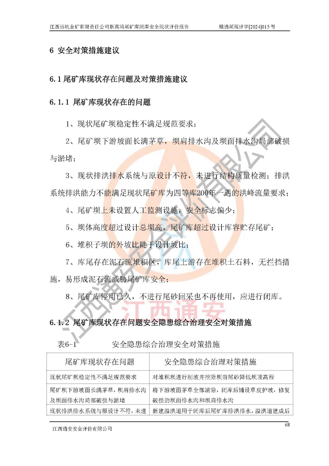 勘察現(xiàn)場發(fā)現(xiàn)的問題及安全對策措施 | 存在的問題:1、現(xiàn)狀尾礦壩穩(wěn)定性不滿足規(guī)范要求;2、尾礦壩下游坡面長滿茅草,壩肩排水溝及壩面排水溝局部破損與淤堵;3、現(xiàn)狀排洪排水系統(tǒng)與原設(shè)計不符,未進行結(jié)構(gòu)質(zhì)量檢測;排洪系統(tǒng)排洪能力不能滿足現(xiàn)狀尾礦庫為四等庫200年一遇的洪峰流量要求;4、尾礦壩上未設(shè)置人工監(jiān)測設(shè)施,安全標(biāo)志偏少;5、壩體***過設(shè)計總壩高,尾礦庫*過設(shè)計庫容貯存尾礦;6、堆積子壩的外坡比陡于設(shè)計坡比;7、庫尾存在泥石流堆積區(qū),庫尾上游存在堆積土石料,無攔擋措施,易形成泥石流威脅尾礦庫安全;8、尾礦庫停用已久,不進行尾砂回采也不再使用,應(yīng)進行閉庫。 整改措施:1、對堆積壩進行削坡并挖除壩前尾砂降低壩頂高程;2、將下游坡面茅草**清除,閉庫后鋪設(shè)草皮護坡,修復(fù)破損的壩面排水溝和壩肩排水溝;3、新建溢洪道用于閉庫后尾礦庫排洪排水,溢洪道建成后對現(xiàn)有排洪系統(tǒng)按照設(shè)計要求進行封堵;4、閉庫時在尾礦壩上增設(shè)人工監(jiān)測設(shè)施,增設(shè)安全標(biāo)志;5、盡快對尾礦庫進行閉庫;6、對尾礦堆積壩削坡、降低壩頂高程,增加壩體的穩(wěn)定性;7、尾礦庫上游應(yīng)停止向尾礦庫匯水面積范圍內(nèi)各溝谷排放土石料,如果需要排放土石料應(yīng)設(shè)置**攔擋措施,防止強降雨時土石料沖刷淤積至尾礦庫,影響尾礦庫安全;8、應(yīng)進行閉庫,對尾礦壩進行整治,整治尾礦庫庫內(nèi)干灘面,為防止干灘面水土流失,覆土植草,覆土范圍為整個庫區(qū)范圍。在庫內(nèi)干灘面設(shè)置庫面排水溝,截洪溝,排水明渠、新建溢洪道,形成庫內(nèi)排水網(wǎng),能**的將庫內(nèi)雨水排至庫外。 | |||