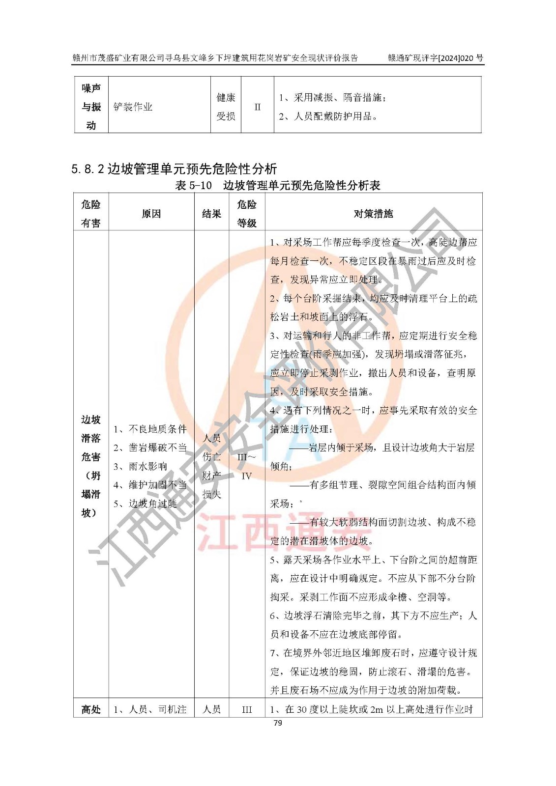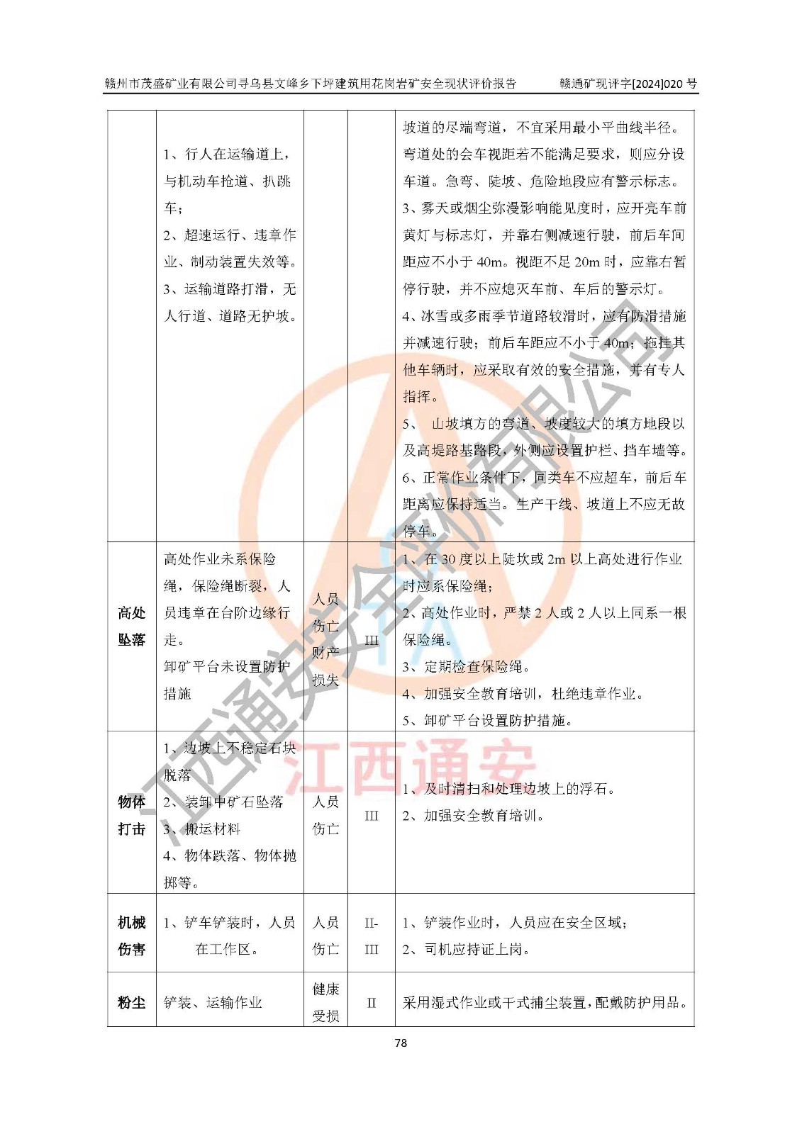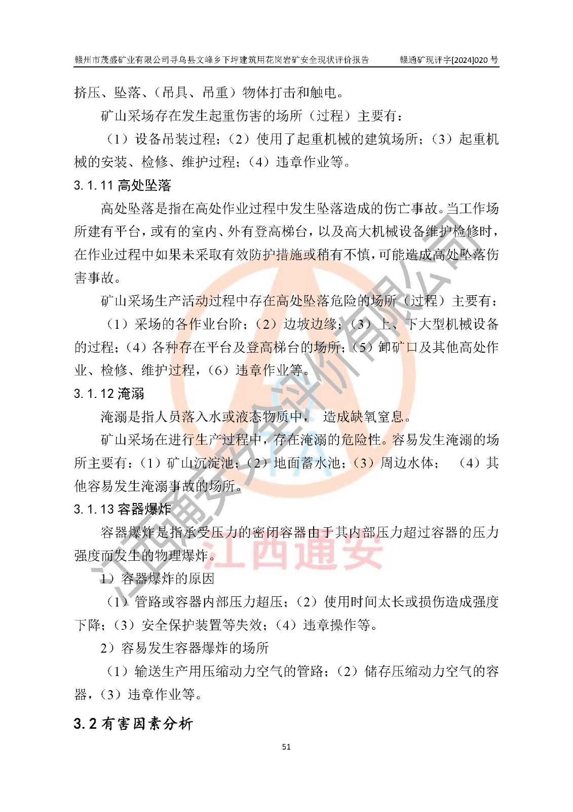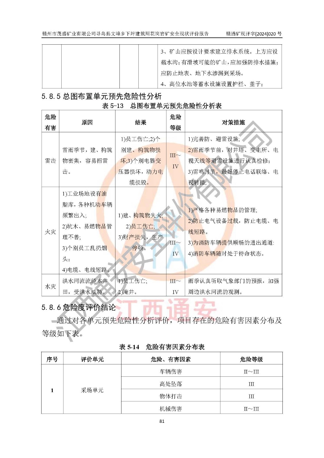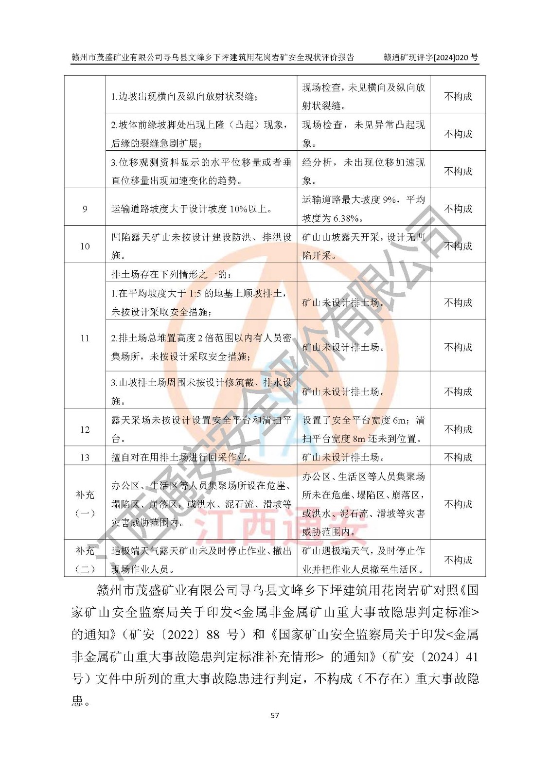 其它 | 1、該評(píng)價(jià)項(xiàng)目中存在的主要危險(xiǎn)因素:火藥爆炸、爆破傷害、容器爆炸、觸電與雷電、坍塌、機(jī)械傷害、**傷害、火災(zāi)、高處墜落、物體打擊、滑坡、泥石流、淹溺、中毒和窒息等危險(xiǎn)有害因素。 2、該評(píng)價(jià)項(xiàng)目中存在的有害因素包括:粉塵、噪聲與振動(dòng)、不良作業(yè)環(huán)境,如高溫、雷擊對(duì)礦山人員的傷害和其他不利的環(huán)境因素等。 3、該評(píng)價(jià)項(xiàng)目為非金屬露天礦山,無瓦斯和自燃發(fā)火危險(xiǎn),礦區(qū)范圍內(nèi)及周邊無較大水系,礦區(qū)水文地質(zhì)條件簡(jiǎn)單。該評(píng)價(jià)項(xiàng)目只是對(duì)建筑用花崗巖進(jìn)行露天開采,不使用有毒有害危險(xiǎn)化學(xué)品藥劑,該評(píng)價(jià)項(xiàng)目涉及的危險(xiǎn)物品主要為民用爆破器材,根據(jù)業(yè)主介紹,爆破器材采用配送制。該評(píng)價(jià)項(xiàng)目使用的壓力容器為空壓機(jī)儲(chǔ)氣罐,其工作介質(zhì)為空氣,屬**性、非易燃介質(zhì)。綜合上述分析,本評(píng)價(jià)項(xiàng)目不存在重大危險(xiǎn)源。 上述主要危險(xiǎn)、有害因素在采取本報(bào)告第六章中提出的安全對(duì)策措施及建議后,能得到**控制。該項(xiàng)目從安全生產(chǎn)角度符合**有關(guān)安全生產(chǎn)法律、法規(guī)、規(guī)章和技術(shù)標(biāo)準(zhǔn)的要求。 | ||||