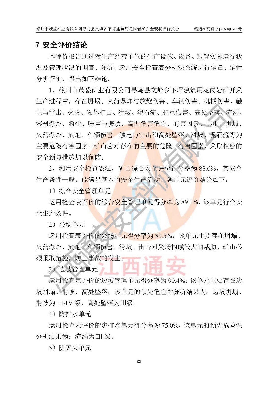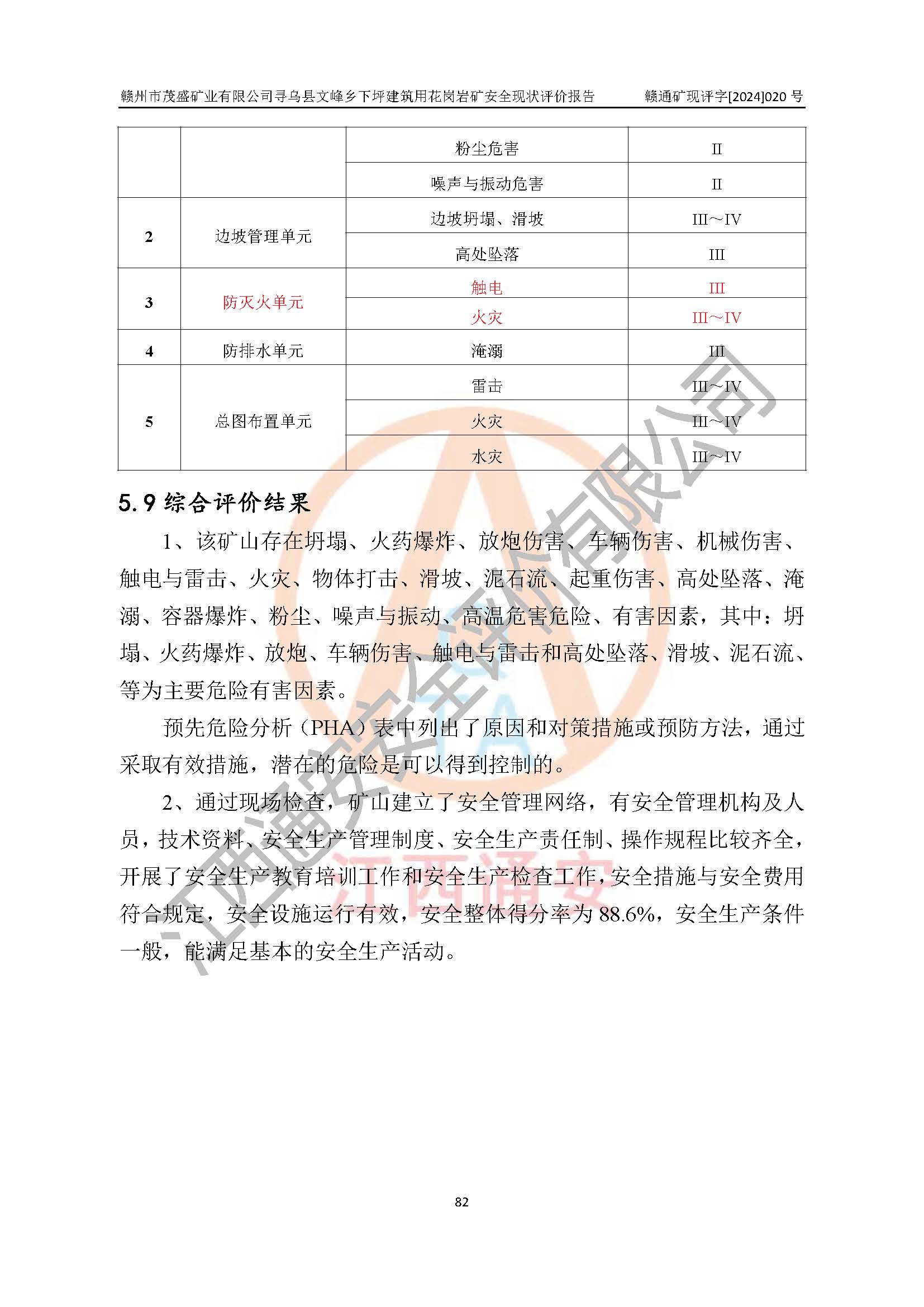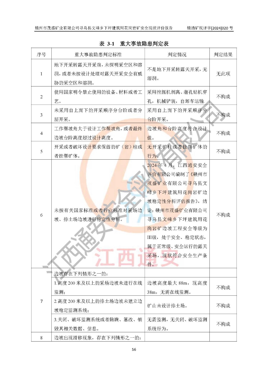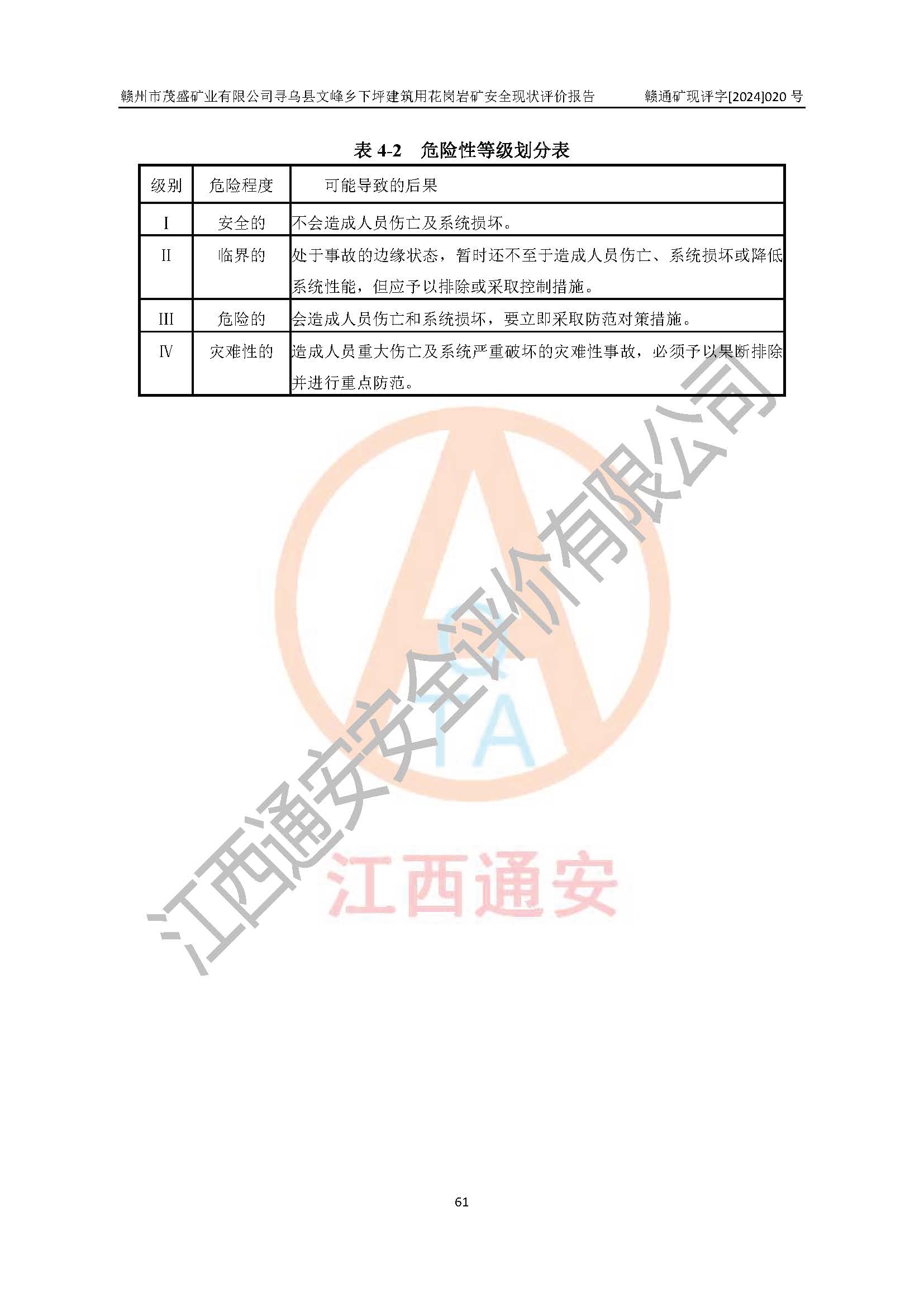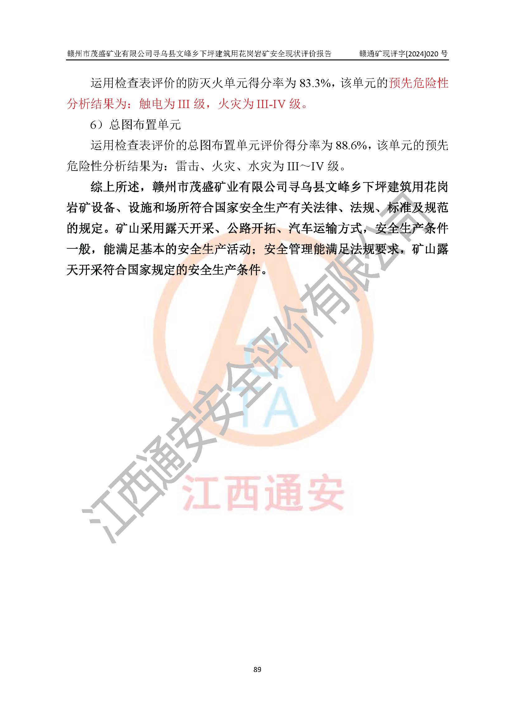 其它 | 1、該評(píng)價(jià)項(xiàng)目中存在的主要危險(xiǎn)因素:火藥爆炸、爆破傷害、容器爆炸、觸電與雷電、坍塌、機(jī)械傷害、**傷害、火災(zāi)、高處墜落、物體打擊、滑坡、泥石流、淹溺、中毒和窒息等危險(xiǎn)有害因素。 2、該評(píng)價(jià)項(xiàng)目中存在的有害因素包括:粉塵、噪聲與振動(dòng)、不良作業(yè)環(huán)境,如高溫、雷擊對(duì)礦山人員的傷害和其他不利的環(huán)境因素等。 3、該評(píng)價(jià)項(xiàng)目為非金屬露天礦山,無瓦斯和自燃發(fā)火危險(xiǎn),礦區(qū)范圍內(nèi)及周邊無較大水系,礦區(qū)水文地質(zhì)條件簡(jiǎn)單。該評(píng)價(jià)項(xiàng)目只是對(duì)建筑用花崗巖進(jìn)行露天開采,不使用有毒有害危險(xiǎn)化學(xué)品藥劑,該評(píng)價(jià)項(xiàng)目涉及的危險(xiǎn)物品主要為民用爆破器材,根據(jù)業(yè)主介紹,爆破器材采用配送制。該評(píng)價(jià)項(xiàng)目使用的壓力容器為空壓機(jī)儲(chǔ)氣罐,其工作介質(zhì)為空氣,屬**性、非易燃介質(zhì)。綜合上述分析,本評(píng)價(jià)項(xiàng)目不存在重大危險(xiǎn)源。 上述主要危險(xiǎn)、有害因素在采取本報(bào)告第六章中提出的安全對(duì)策措施及建議后,能得到**控制。該項(xiàng)目從安全生產(chǎn)角度符合**有關(guān)安全生產(chǎn)法律、法規(guī)、規(guī)章和技術(shù)標(biāo)準(zhǔn)的要求。 | ||||
