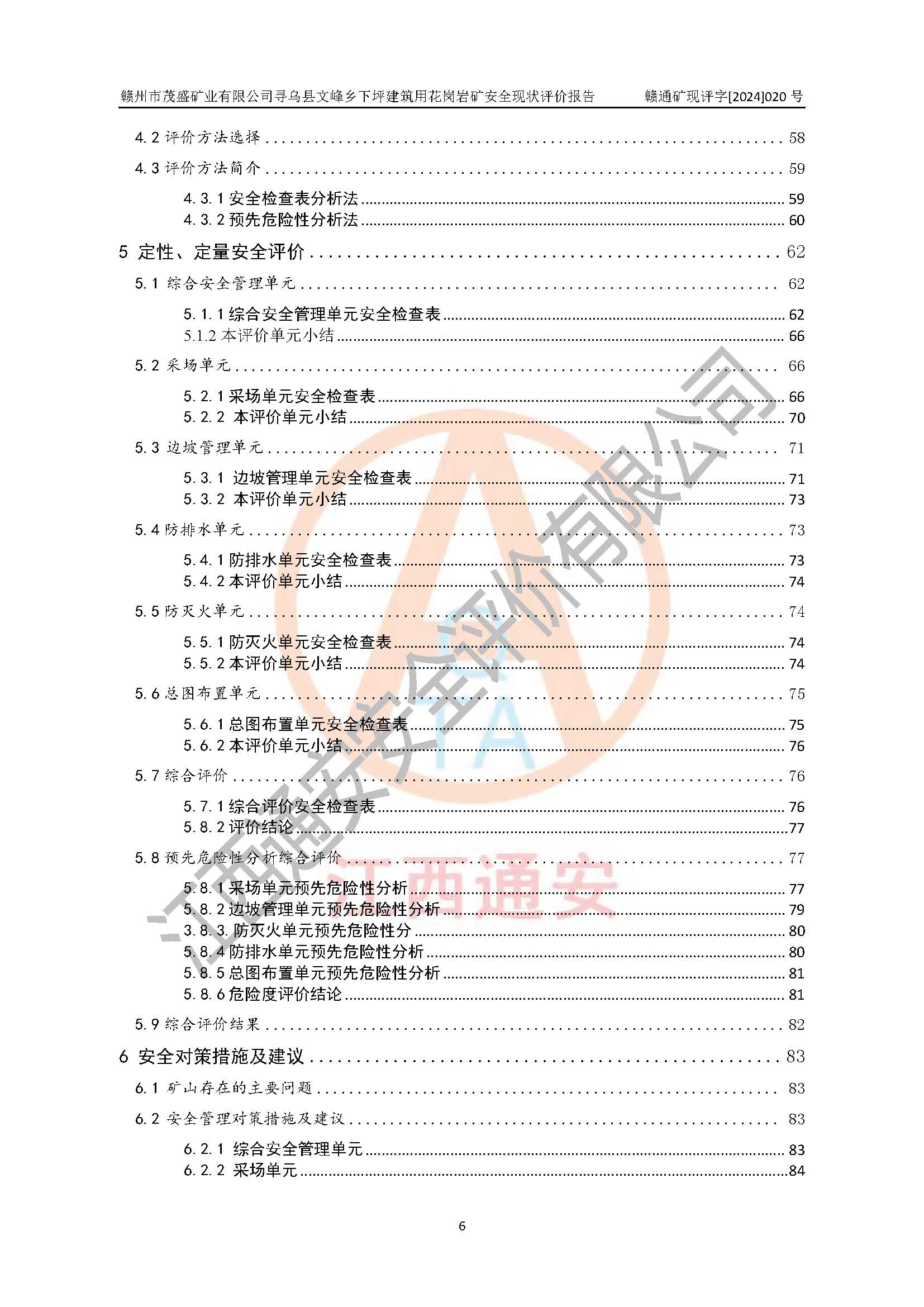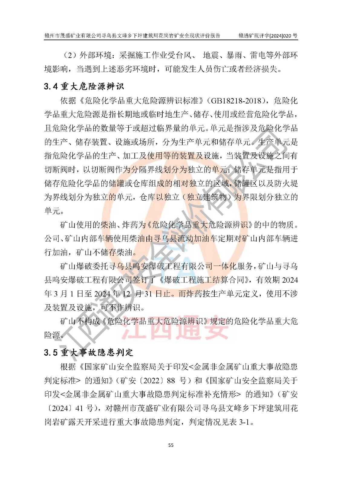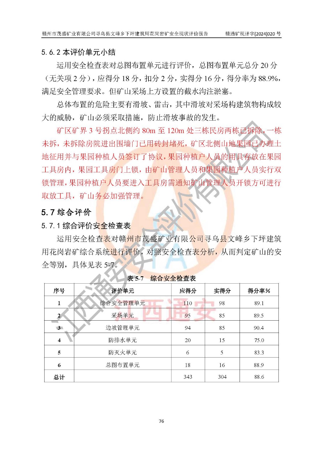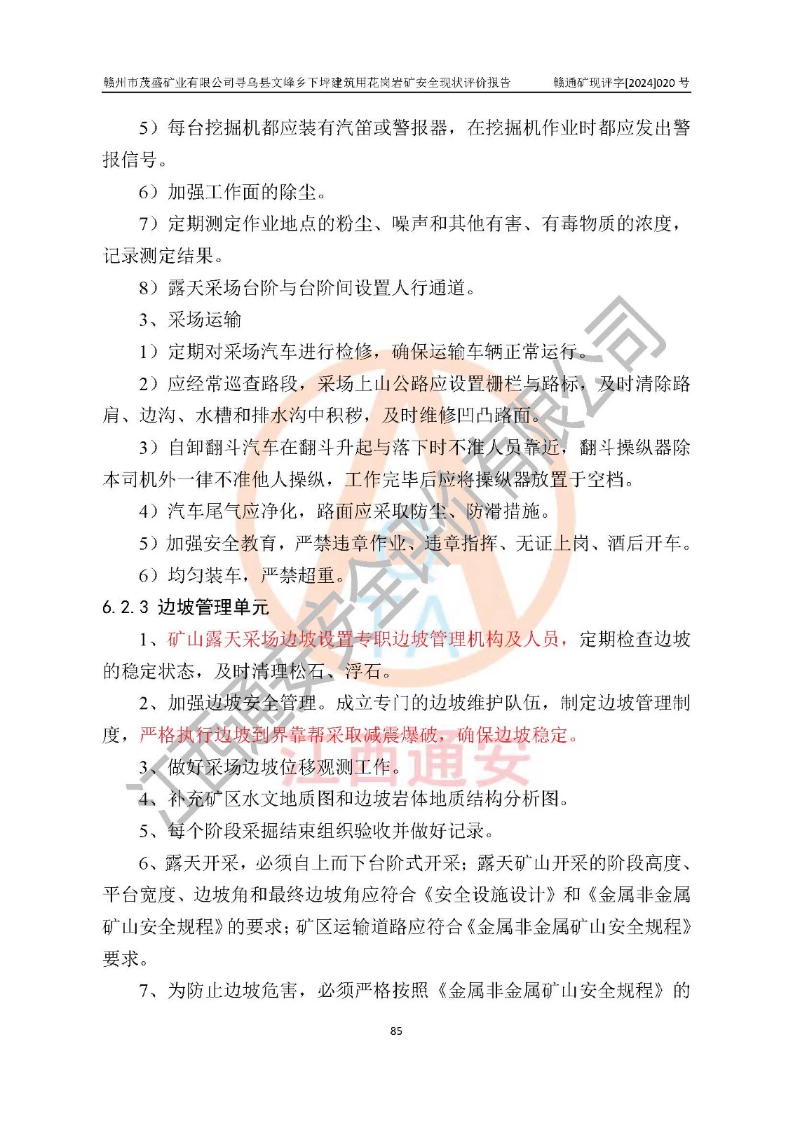 其它 | 1、該評(píng)價(jià)項(xiàng)目中存在的主要危險(xiǎn)因素:火藥爆炸、爆破傷害、容器爆炸、觸電與雷電、坍塌、機(jī)械傷害、**傷害、火災(zāi)、高處墜落、物體打擊、滑坡、泥石流、淹溺、中毒和窒息等危險(xiǎn)有害因素。 2、該評(píng)價(jià)項(xiàng)目中存在的有害因素包括:粉塵、噪聲與振動(dòng)、不良作業(yè)環(huán)境,如高溫、雷擊對(duì)礦山人員的傷害和其他不利的環(huán)境因素等。 3、該評(píng)價(jià)項(xiàng)目為非金屬露天礦山,無瓦斯和自燃發(fā)火危險(xiǎn),礦區(qū)范圍內(nèi)及周邊無較大水系,礦區(qū)水文地質(zhì)條件簡(jiǎn)單。該評(píng)價(jià)項(xiàng)目只是對(duì)建筑用花崗巖進(jìn)行露天開采,不使用有毒有害危險(xiǎn)化學(xué)品藥劑,該評(píng)價(jià)項(xiàng)目涉及的危險(xiǎn)物品主要為民用爆破器材,根據(jù)業(yè)主介紹,爆破器材采用配送制。該評(píng)價(jià)項(xiàng)目使用的壓力容器為空壓機(jī)儲(chǔ)氣罐,其工作介質(zhì)為空氣,屬**性、非易燃介質(zhì)。綜合上述分析,本評(píng)價(jià)項(xiàng)目不存在重大危險(xiǎn)源。 上述主要危險(xiǎn)、有害因素在采取本報(bào)告第六章中提出的安全對(duì)策措施及建議后,能得到**控制。該項(xiàng)目從安全生產(chǎn)角度符合**有關(guān)安全生產(chǎn)法律、法規(guī)、規(guī)章和技術(shù)標(biāo)準(zhǔn)的要求。 | ||||