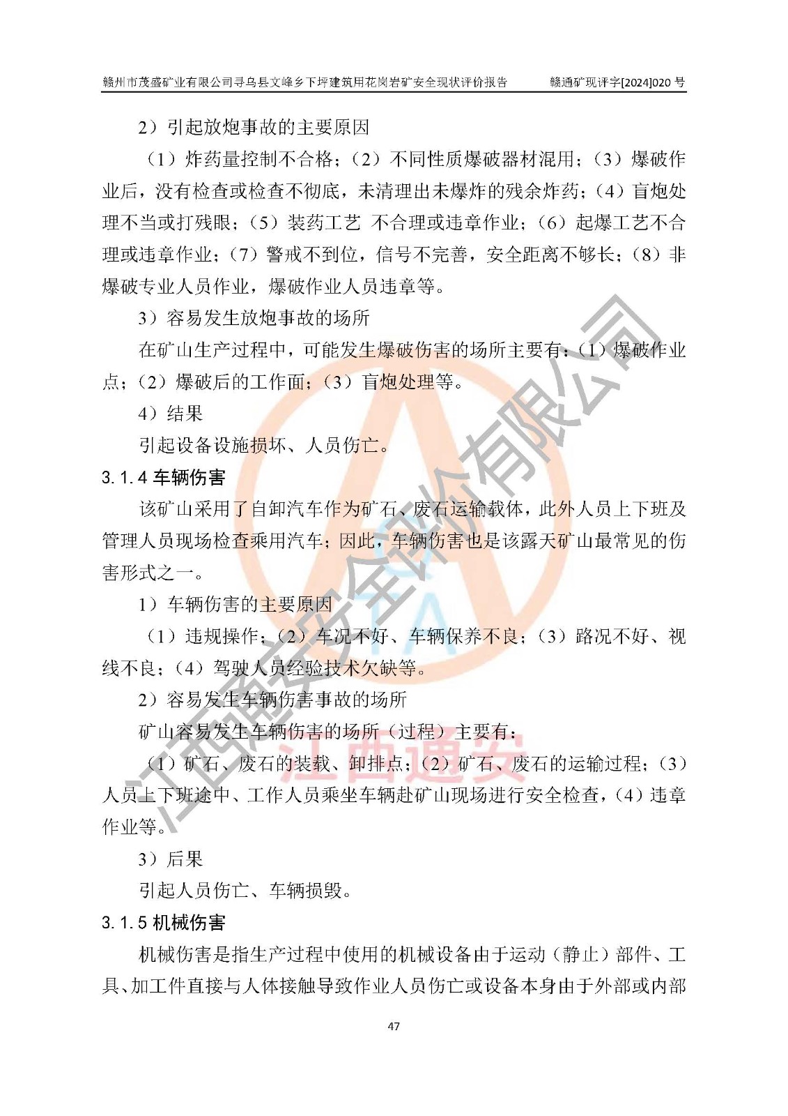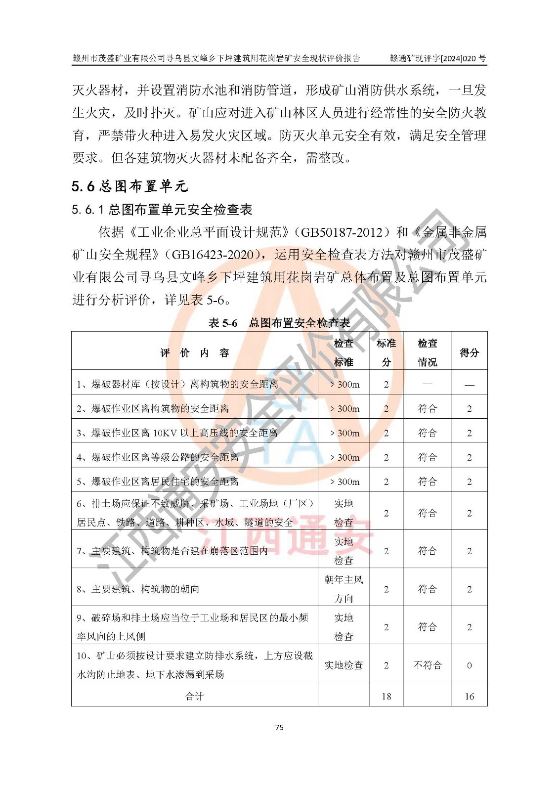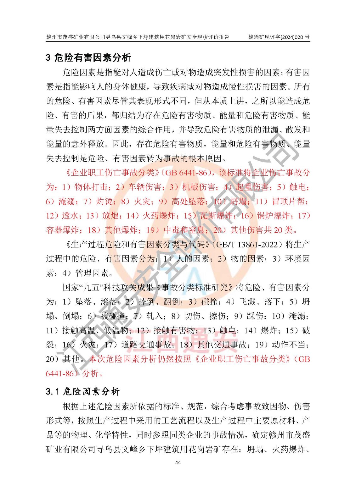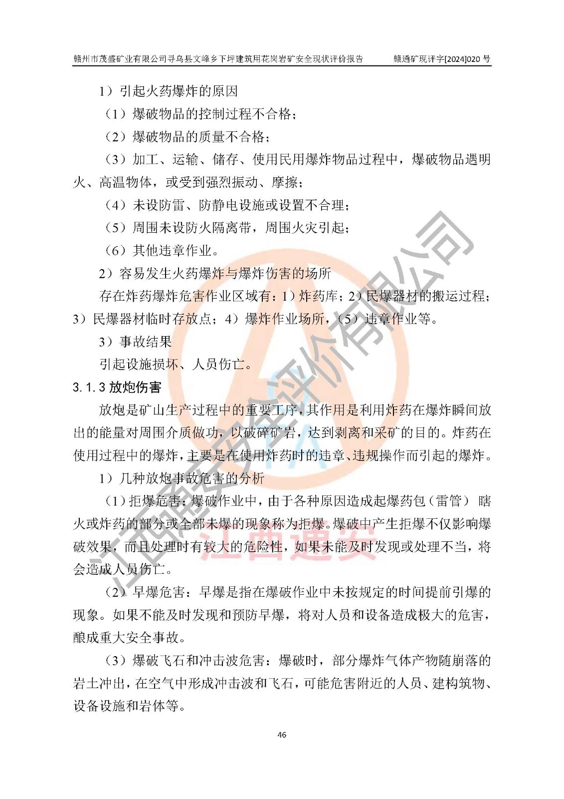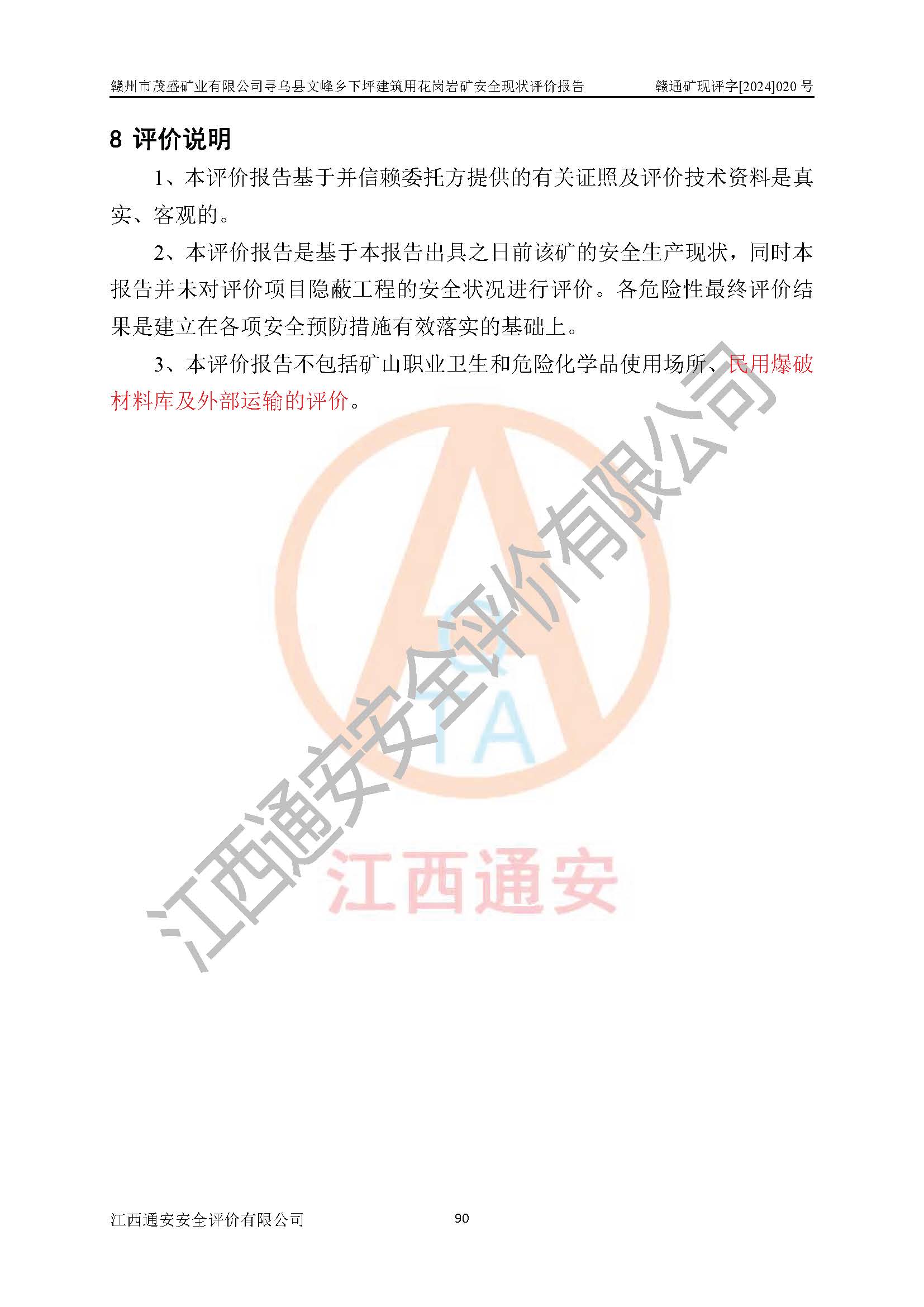 其它 | 1、該評(píng)價(jià)項(xiàng)目中存在的主要危險(xiǎn)因素:火藥爆炸、爆破傷害、容器爆炸、觸電與雷電、坍塌、機(jī)械傷害、**傷害、火災(zāi)、高處墜落、物體打擊、滑坡、泥石流、淹溺、中毒和窒息等危險(xiǎn)有害因素。 2、該評(píng)價(jià)項(xiàng)目中存在的有害因素包括:粉塵、噪聲與振動(dòng)、不良作業(yè)環(huán)境,如高溫、雷擊對(duì)礦山人員的傷害和其他不利的環(huán)境因素等。 3、該評(píng)價(jià)項(xiàng)目為非金屬露天礦山,無瓦斯和自燃發(fā)火危險(xiǎn),礦區(qū)范圍內(nèi)及周邊無較大水系,礦區(qū)水文地質(zhì)條件簡(jiǎn)單。該評(píng)價(jià)項(xiàng)目只是對(duì)建筑用花崗巖進(jìn)行露天開采,不使用有毒有害危險(xiǎn)化學(xué)品藥劑,該評(píng)價(jià)項(xiàng)目涉及的危險(xiǎn)物品主要為民用爆破器材,根據(jù)業(yè)主介紹,爆破器材采用配送制。該評(píng)價(jià)項(xiàng)目使用的壓力容器為空壓機(jī)儲(chǔ)氣罐,其工作介質(zhì)為空氣,屬**性、非易燃介質(zhì)。綜合上述分析,本評(píng)價(jià)項(xiàng)目不存在重大危險(xiǎn)源。 上述主要危險(xiǎn)、有害因素在采取本報(bào)告第六章中提出的安全對(duì)策措施及建議后,能得到**控制。該項(xiàng)目從安全生產(chǎn)角度符合**有關(guān)安全生產(chǎn)法律、法規(guī)、規(guī)章和技術(shù)標(biāo)準(zhǔn)的要求。 | ||||