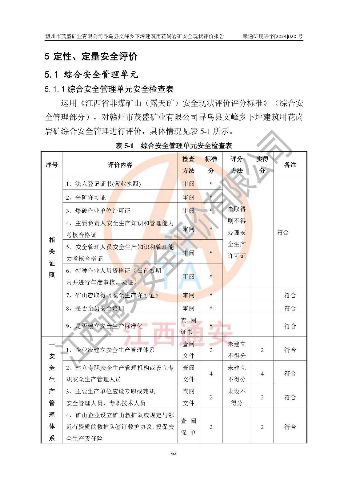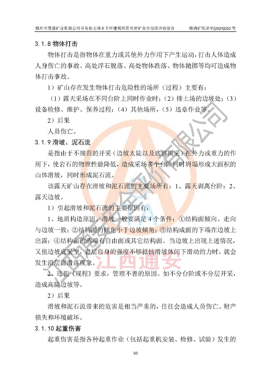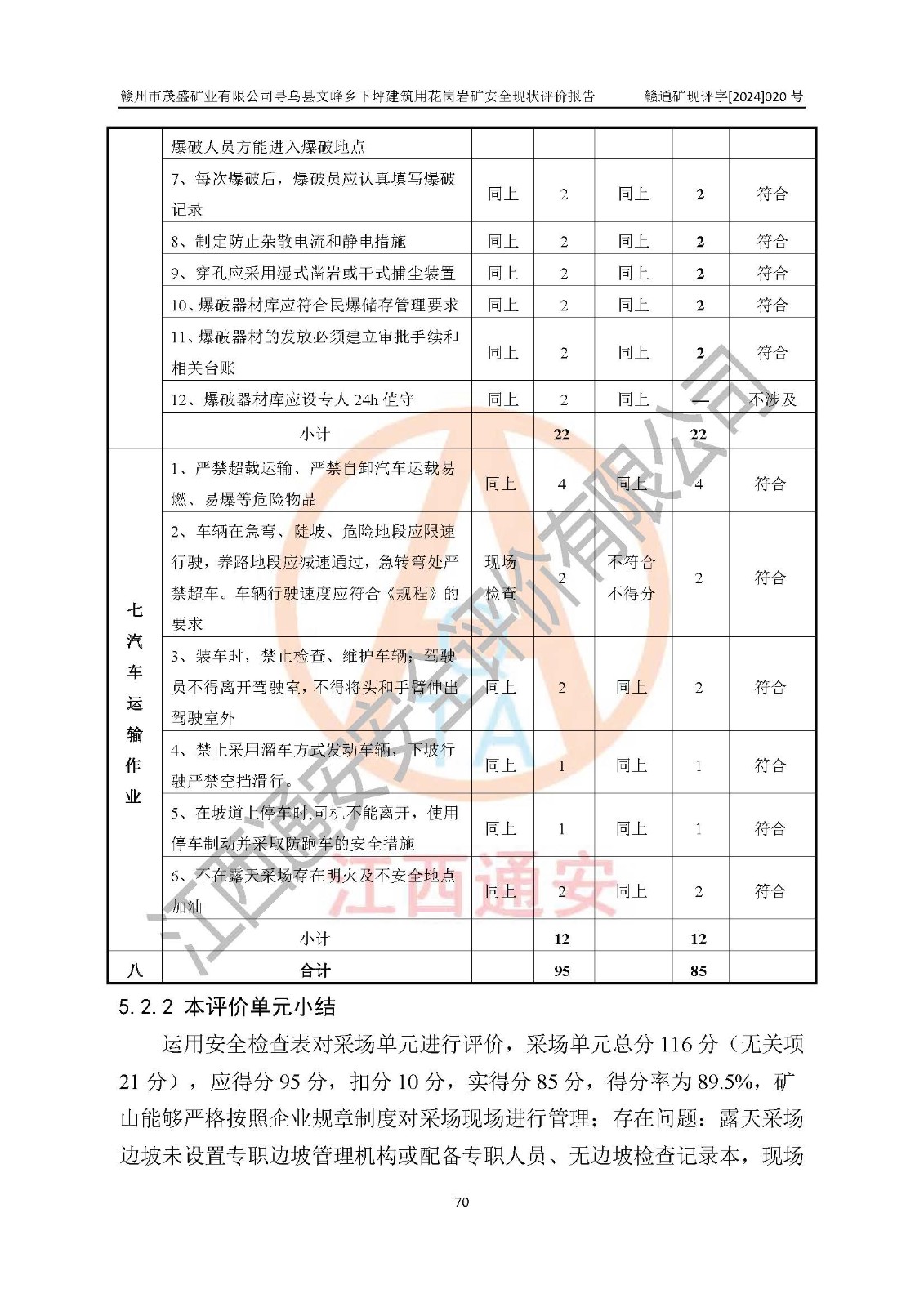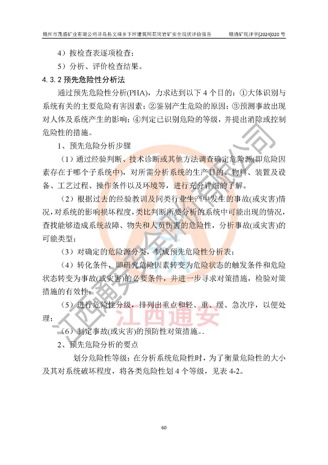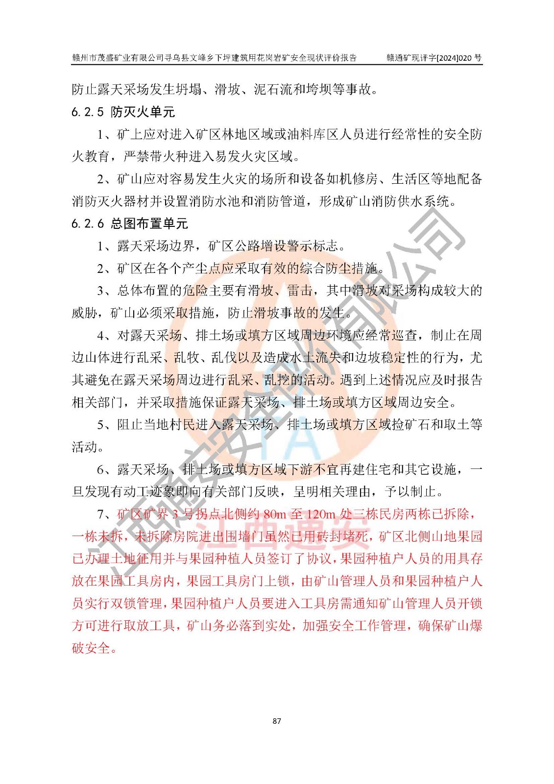 其它 | 1、該評(píng)價(jià)項(xiàng)目中存在的主要危險(xiǎn)因素:火藥爆炸、爆破傷害、容器爆炸、觸電與雷電、坍塌、機(jī)械傷害、**傷害、火災(zāi)、高處墜落、物體打擊、滑坡、泥石流、淹溺、中毒和窒息等危險(xiǎn)有害因素。 2、該評(píng)價(jià)項(xiàng)目中存在的有害因素包括:粉塵、噪聲與振動(dòng)、不良作業(yè)環(huán)境,如高溫、雷擊對(duì)礦山人員的傷害和其他不利的環(huán)境因素等。 3、該評(píng)價(jià)項(xiàng)目為非金屬露天礦山,無瓦斯和自燃發(fā)火危險(xiǎn),礦區(qū)范圍內(nèi)及周邊無較大水系,礦區(qū)水文地質(zhì)條件簡(jiǎn)單。該評(píng)價(jià)項(xiàng)目只是對(duì)建筑用花崗巖進(jìn)行露天開采,不使用有毒有害危險(xiǎn)化學(xué)品藥劑,該評(píng)價(jià)項(xiàng)目涉及的危險(xiǎn)物品主要為民用爆破器材,根據(jù)業(yè)主介紹,爆破器材采用配送制。該評(píng)價(jià)項(xiàng)目使用的壓力容器為空壓機(jī)儲(chǔ)氣罐,其工作介質(zhì)為空氣,屬**性、非易燃介質(zhì)。綜合上述分析,本評(píng)價(jià)項(xiàng)目不存在重大危險(xiǎn)源。 上述主要危險(xiǎn)、有害因素在采取本報(bào)告第六章中提出的安全對(duì)策措施及建議后,能得到**控制。該項(xiàng)目從安全生產(chǎn)角度符合**有關(guān)安全生產(chǎn)法律、法規(guī)、規(guī)章和技術(shù)標(biāo)準(zhǔn)的要求。 | ||||